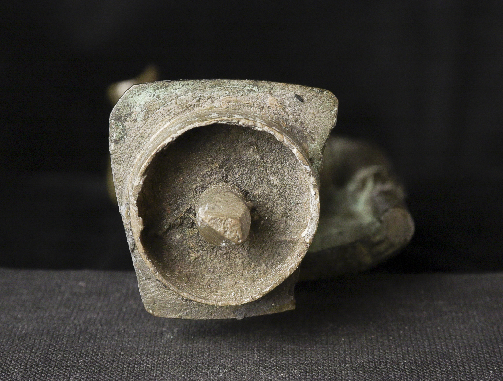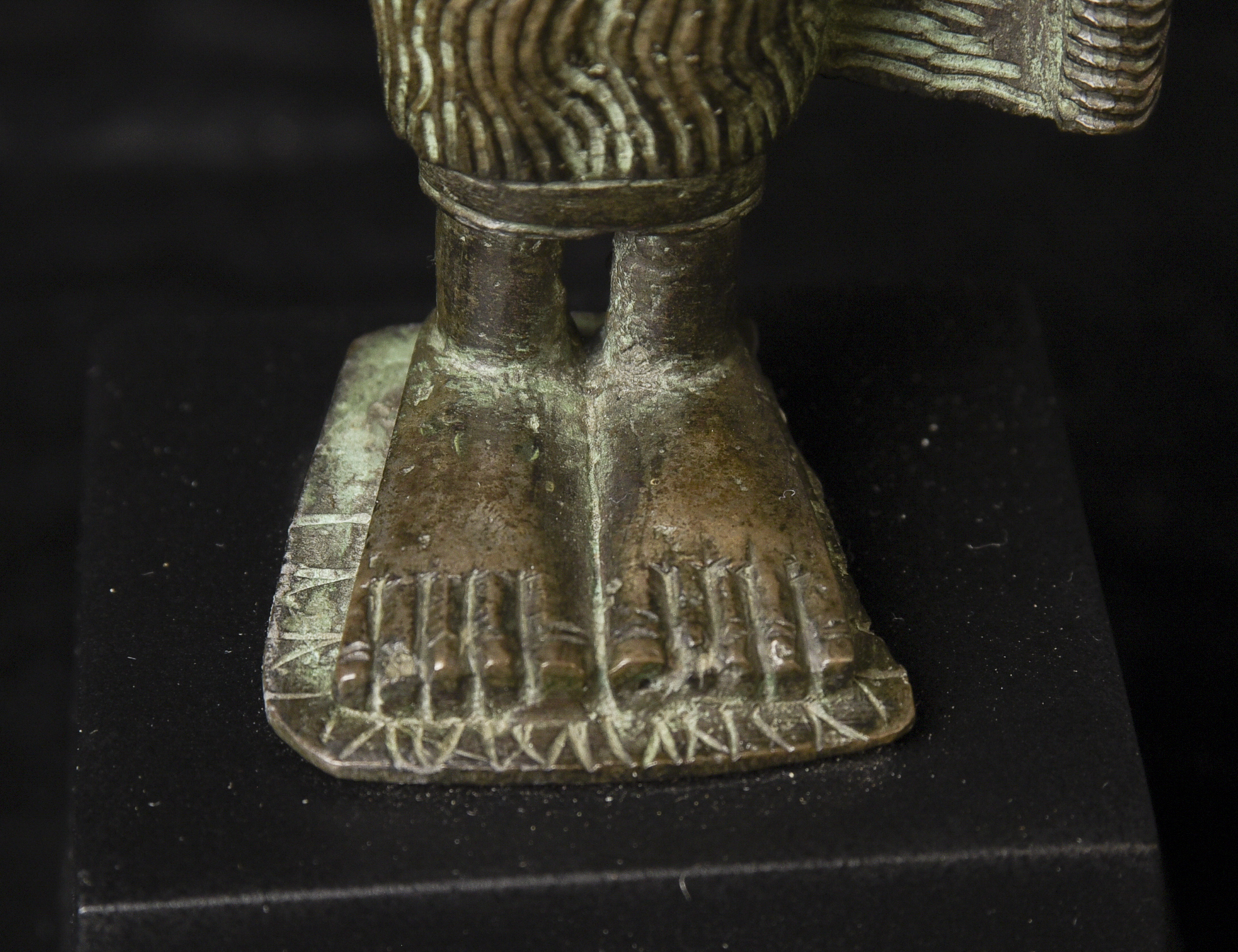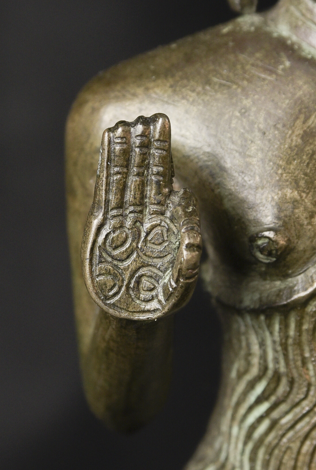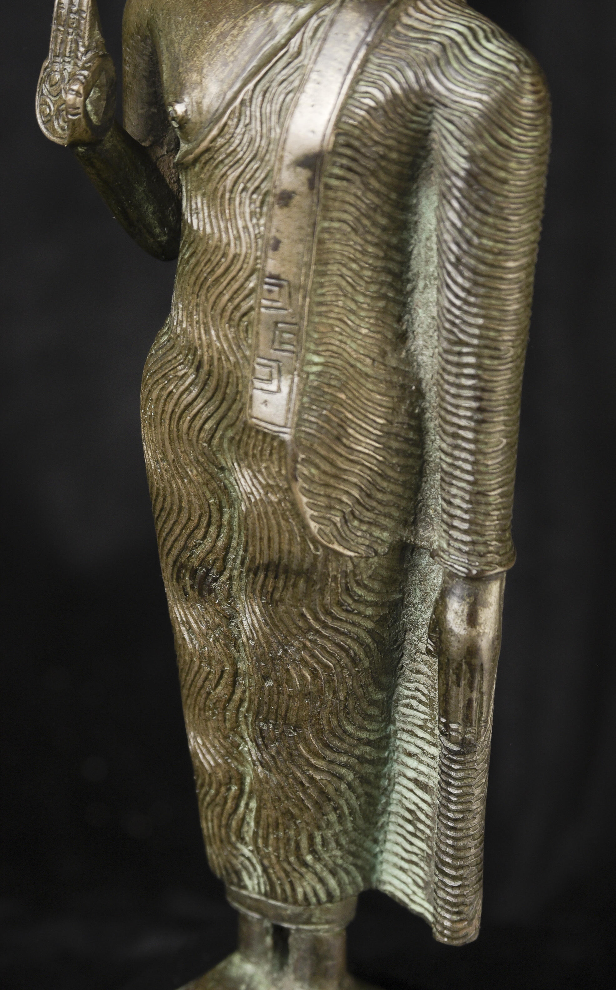 18thC Sri Lanka Solid-cast bronze Buddha. On its custom base. Lankan Buddhas are very hard to find this well modeled, cast, and finished. The Buddha fits into the base and can be jiggled to stand evenly, but could use a piece of cloth or something else wrapped around the part that goes into the base to make it snug and to stand evenly. Excellent shape, except the missing finial and original base. . The face is outstanding, look at the photos . (8"H x 2.5"W x 1.5"D ) - 3.16lbs. Base (3.25"W x 2"H ) - 1.06lbs