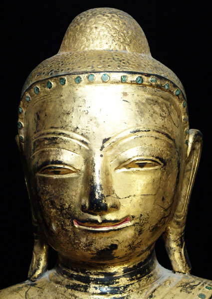 Large 19thC Lacquer Burmese Mandalay Buddha in exceptional condition. This uncommon type is extremely light weight and is made up primarily of a shell made of a combination of lacquer and ash. It has a thin wood bottom. They are uncommon (authentic ones- there are many on Ebay and elsewhere on the net- I’ve almost never seen one which is authentic) because they are so fragile, and so many have broke over the years- originally this was a common form. Typically this type has damage and repairs, but this one is out of an old US estate and has been in America for a long time. The base looks to have some repainting, and there is some minor repair to the underside of the base He is an excellent size at 18 inches tall by 12.5 inches wide by 7 inches deep. His condition is very good for this extremely fragile type of Buddha. If you are looking for a Buddha of this style, it will be hard to find one of this size and condition for remotely close to this price. He is a delightful and very distinctive face. There are some green bits in the sash of his robe. These tend to be more expensive than their wood counterparts.