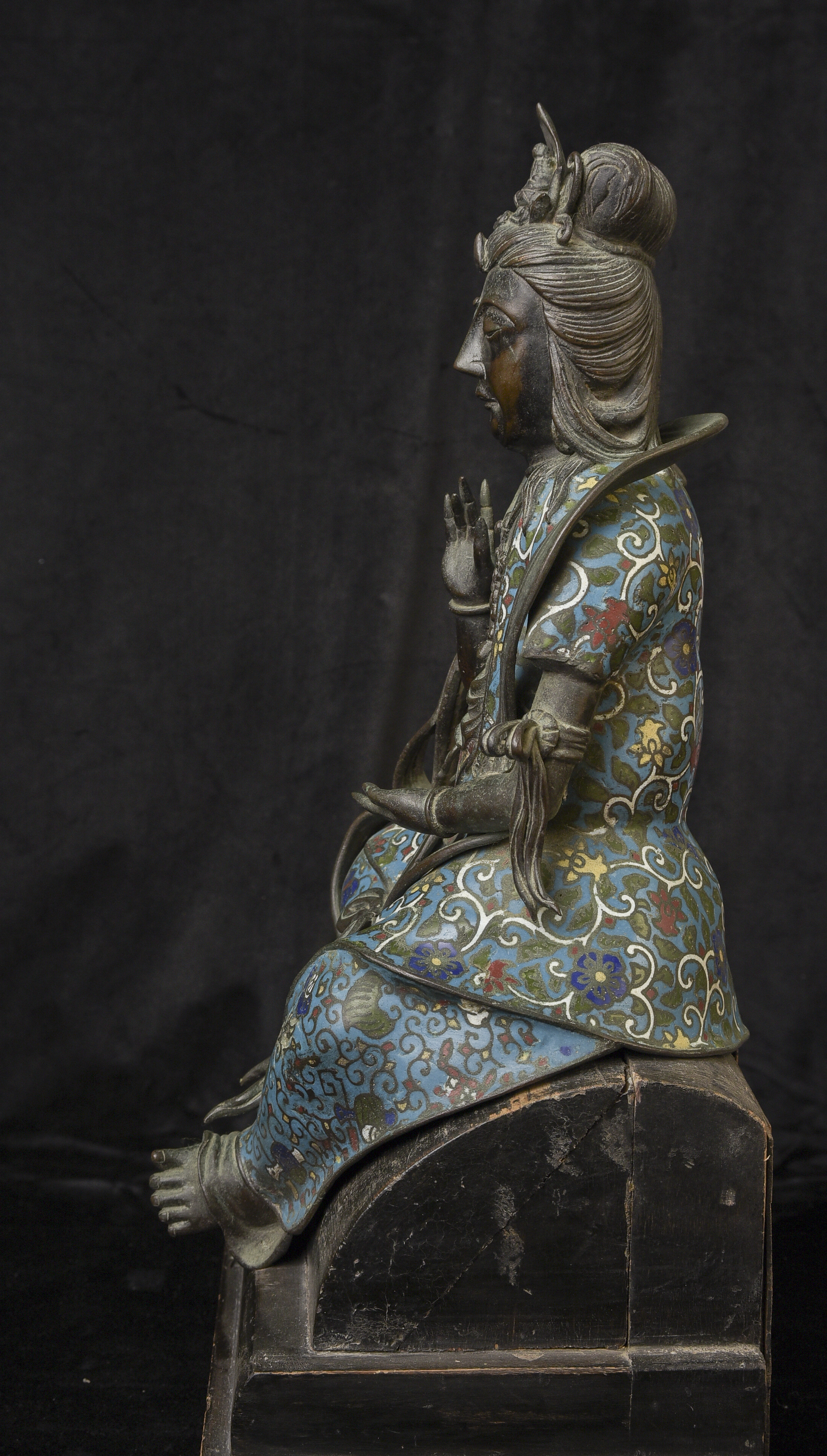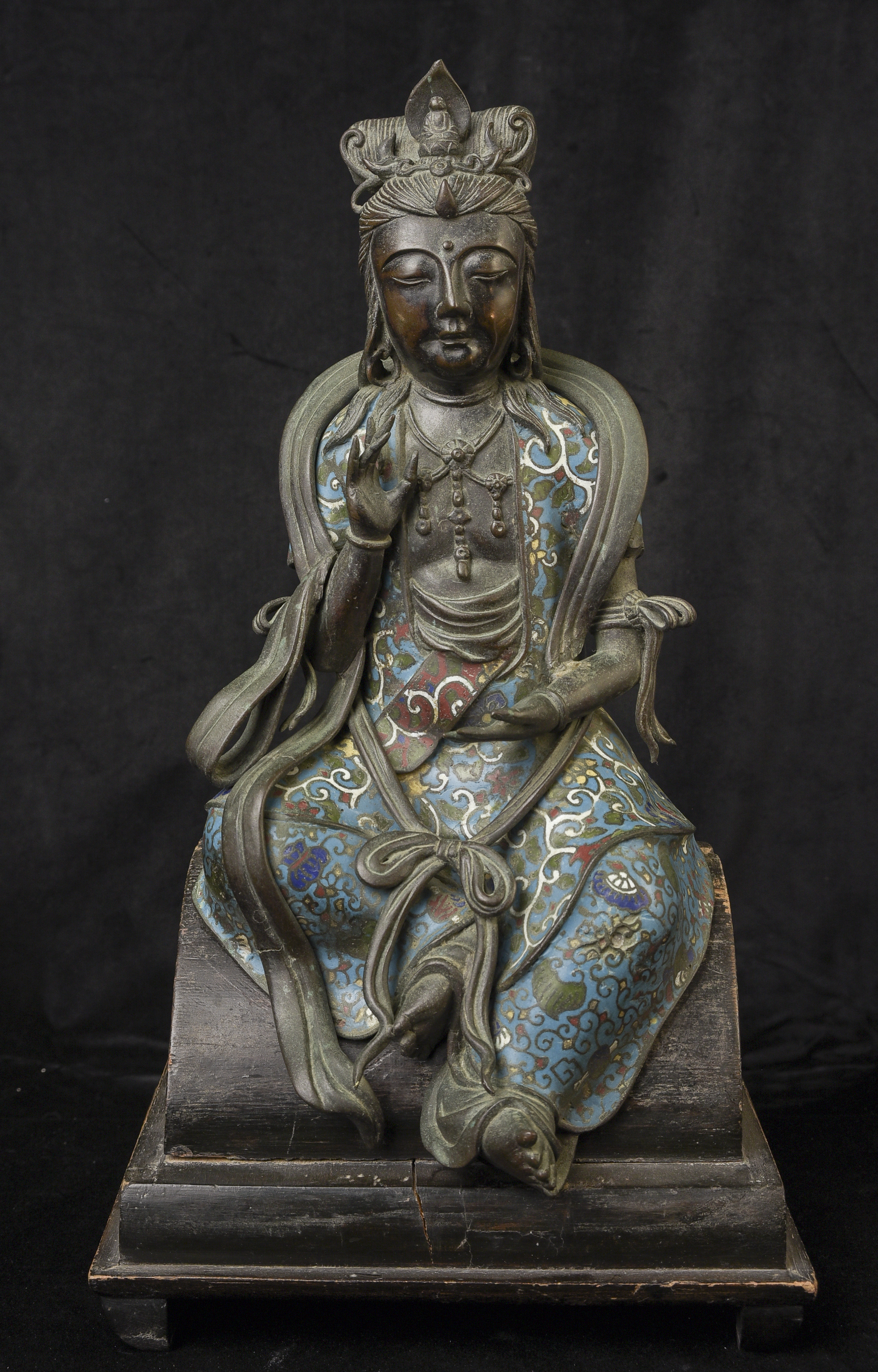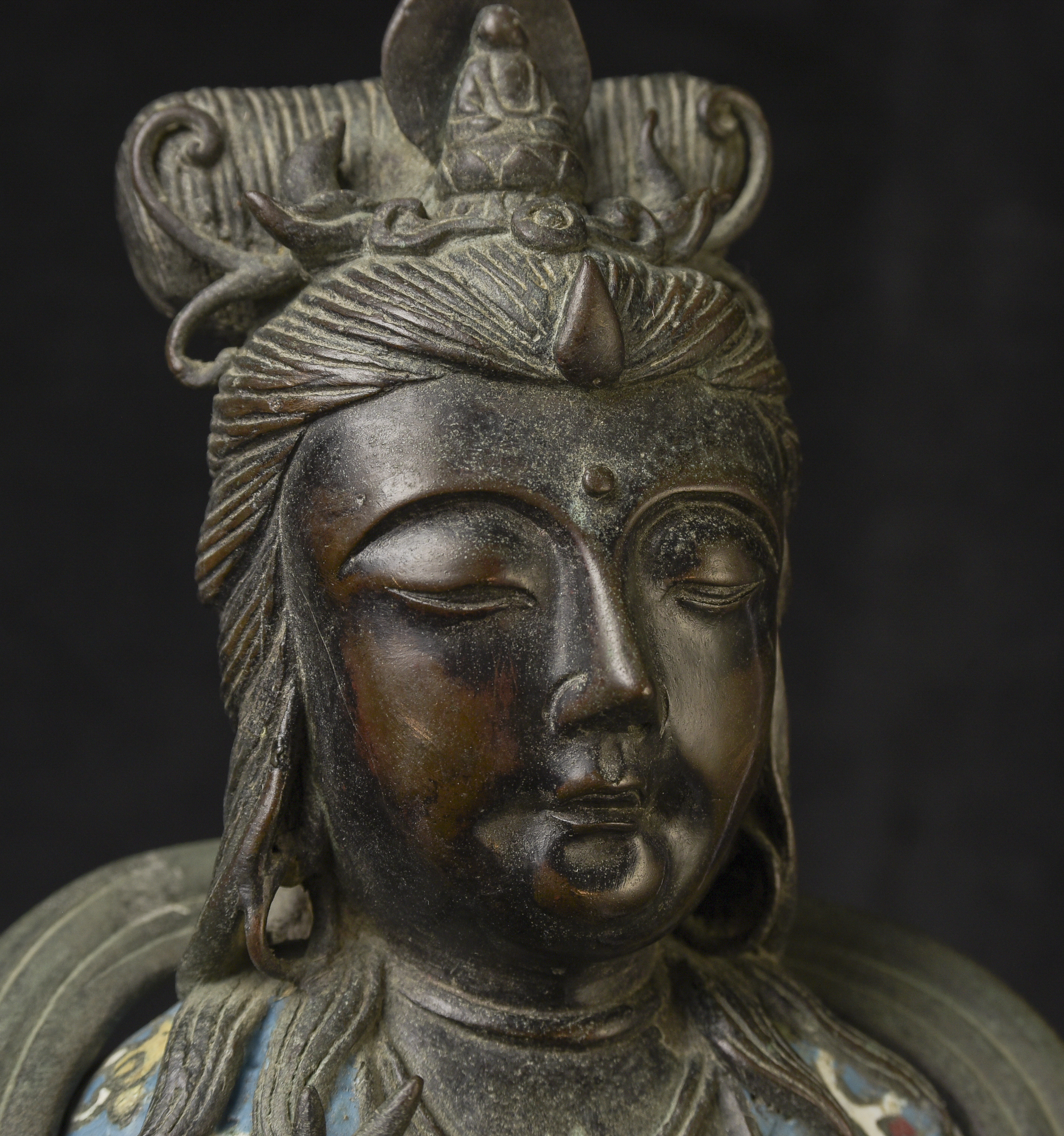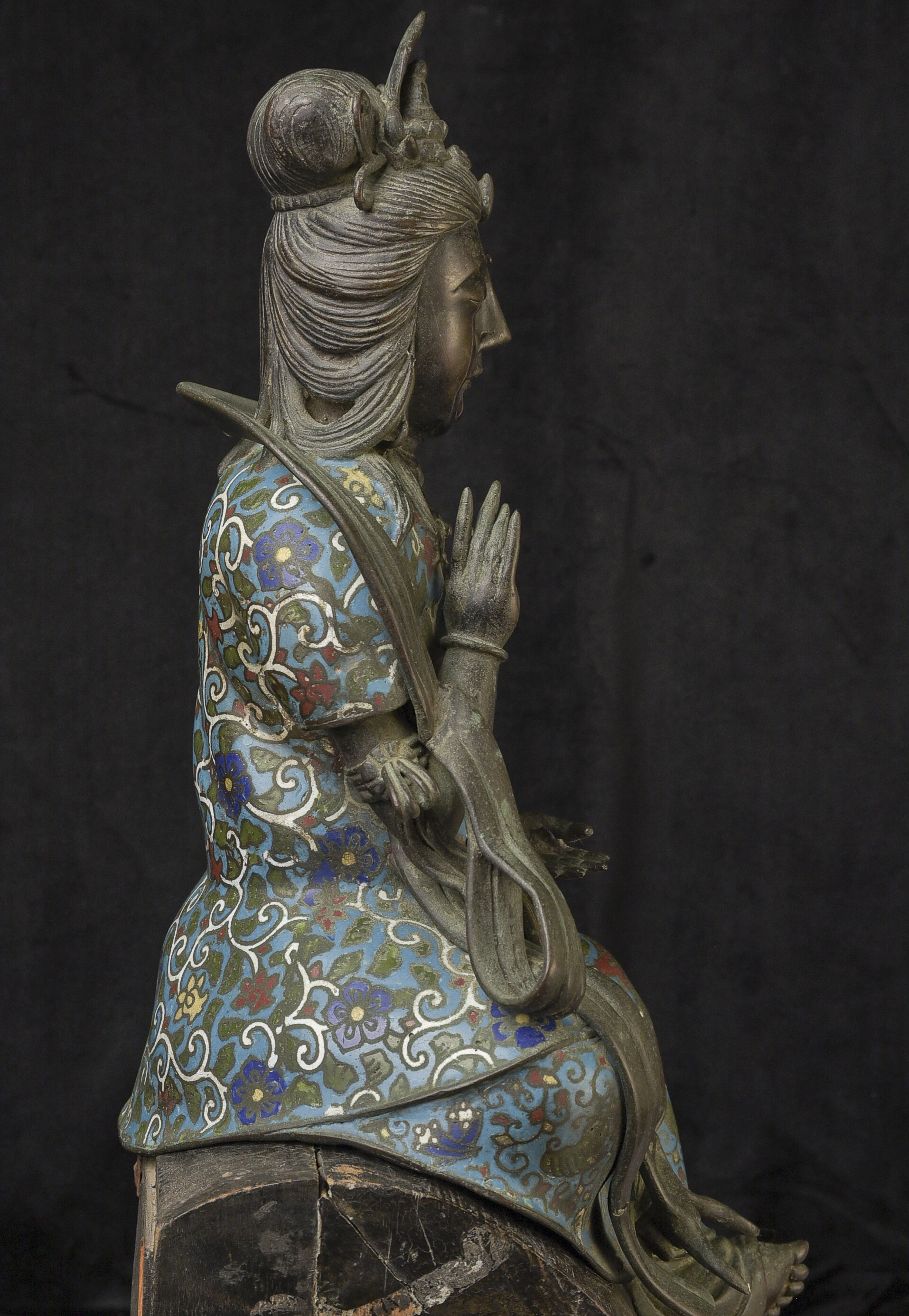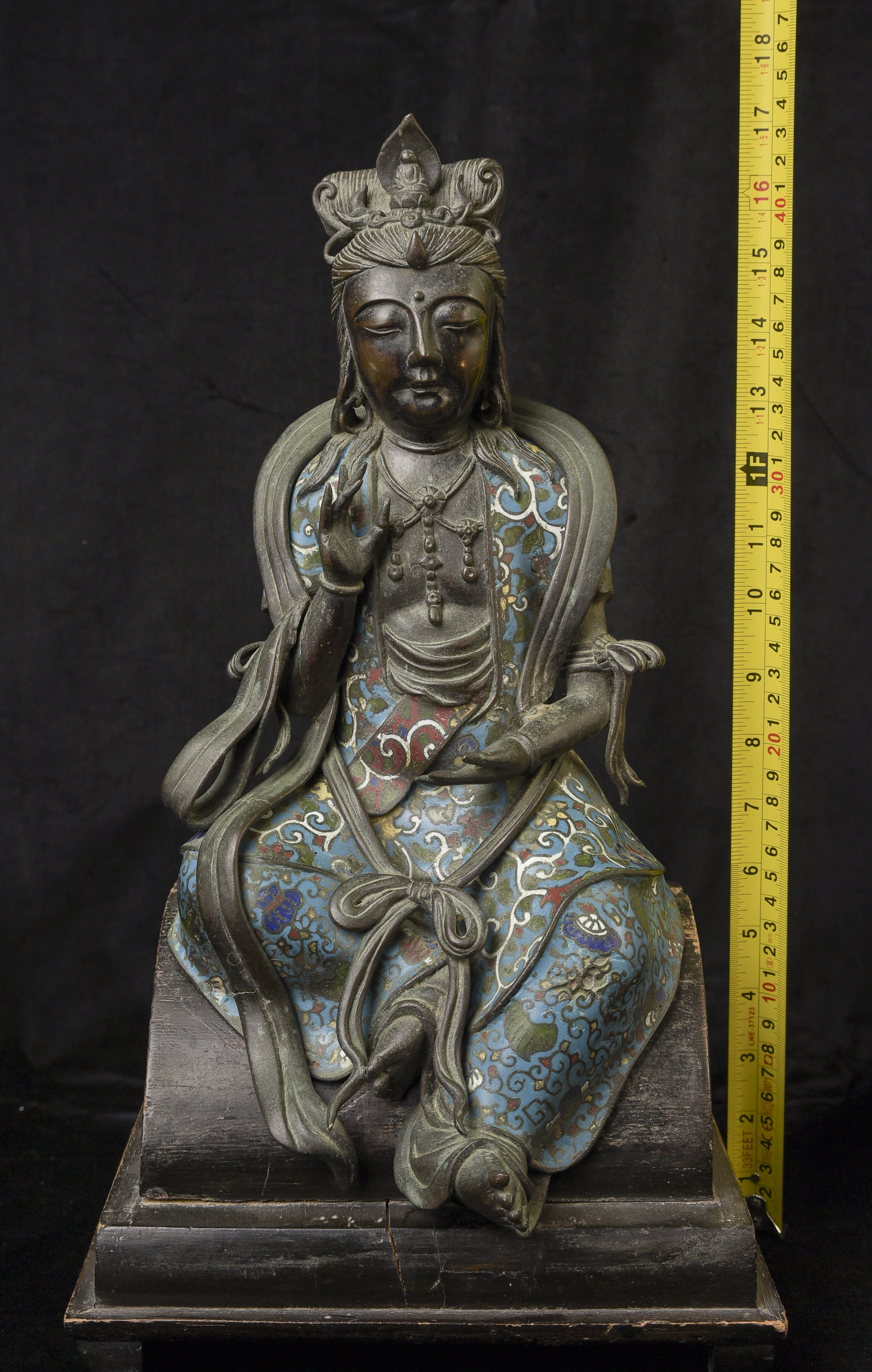 This is a very unusual Chinese 18/19th Century Cloisonne Quan-yin on the original (or early) stand. Most Chinese cloisonne figures you see are later in date, lighter in weight, and much less detailed in the parts that are cast in bronze. The colors in the cloisonne are also earlier, more muted than those seen on the late 19th/early 20th century examples usually seen in the marketplace. Some expectable minor losses to the cloisonn as seen in the photos. Cloisonne is very difficult to do and to remain in place over time on figures as they have so many sharp curves, so it is amazing that this piece is in such good condition given its age. There is also some splitting in the metal ribbons and significant loss and damage to the base. I was going to have a new base made, but the old one, even in its current state, adds a whole other dimension to the presentation. Expect that bits of the base may come loose in shipping and that the base works fine, but does have significant flaws to it. The face is beautiful, the hair-do is complex and captivating, and the overall piece is one that can easily become the centerpiece of any room. ( 14.25"H x 7"W x 7.5"D ) - 10.66lbs - (Base 9.5" x 6.5" x 5.5")