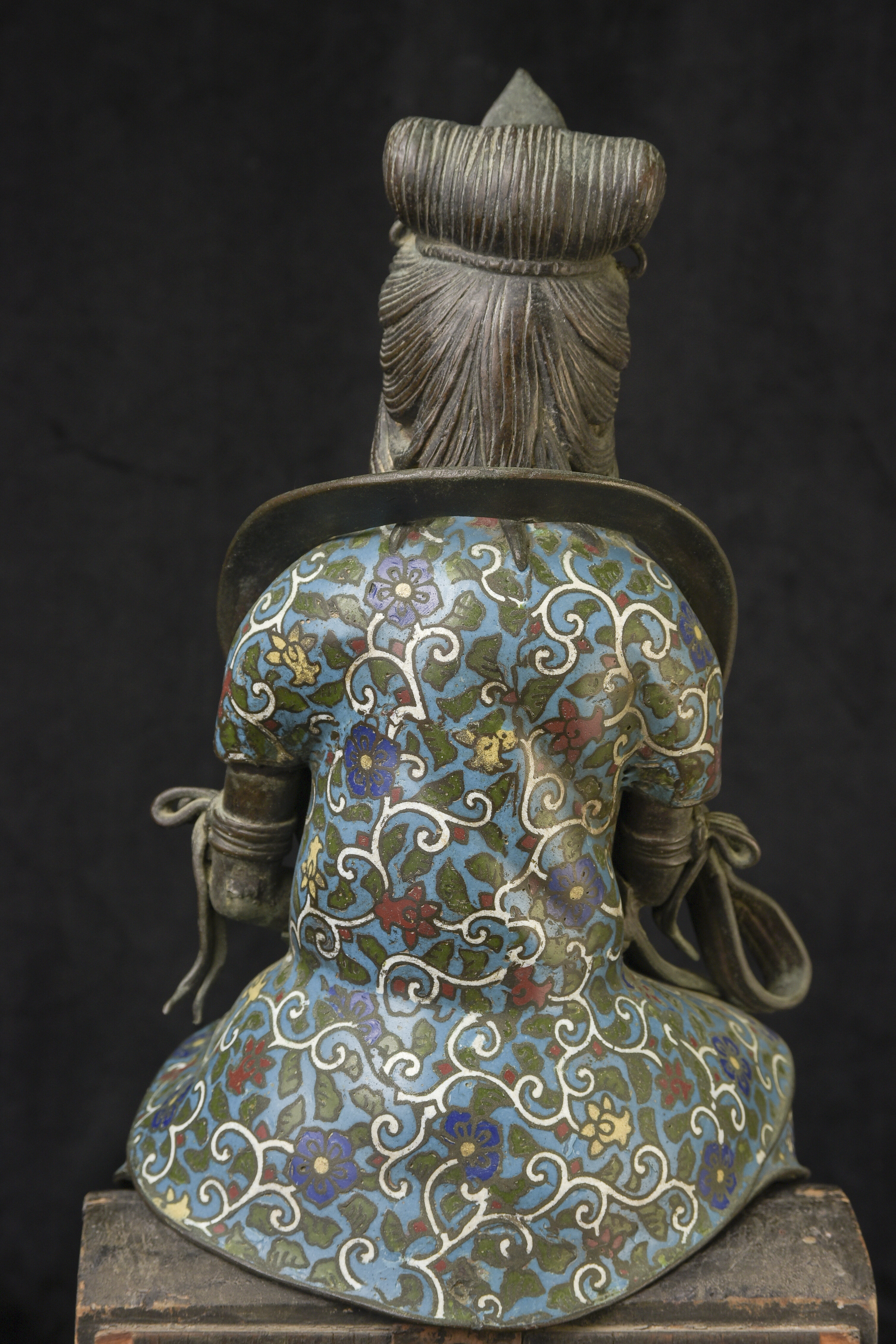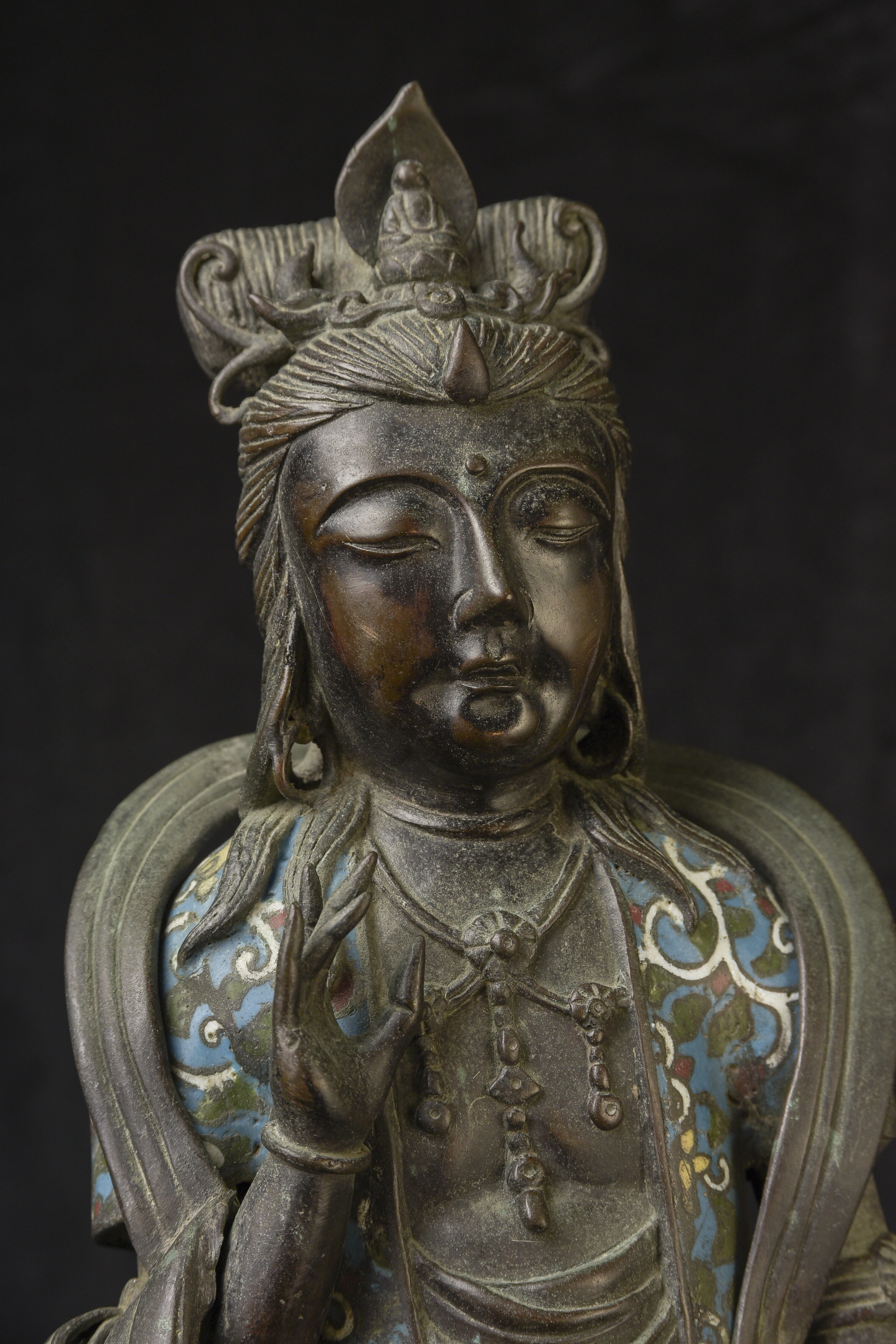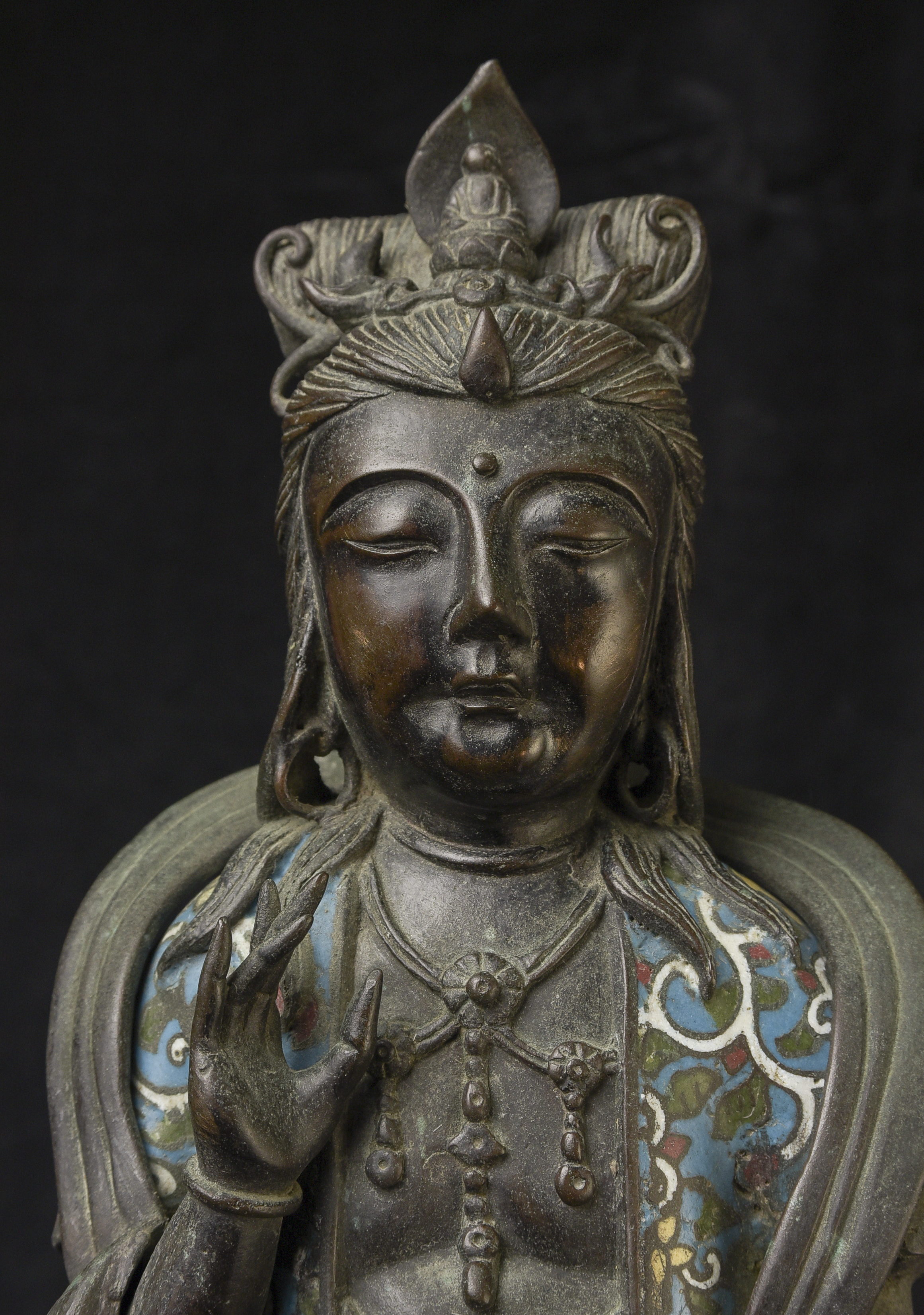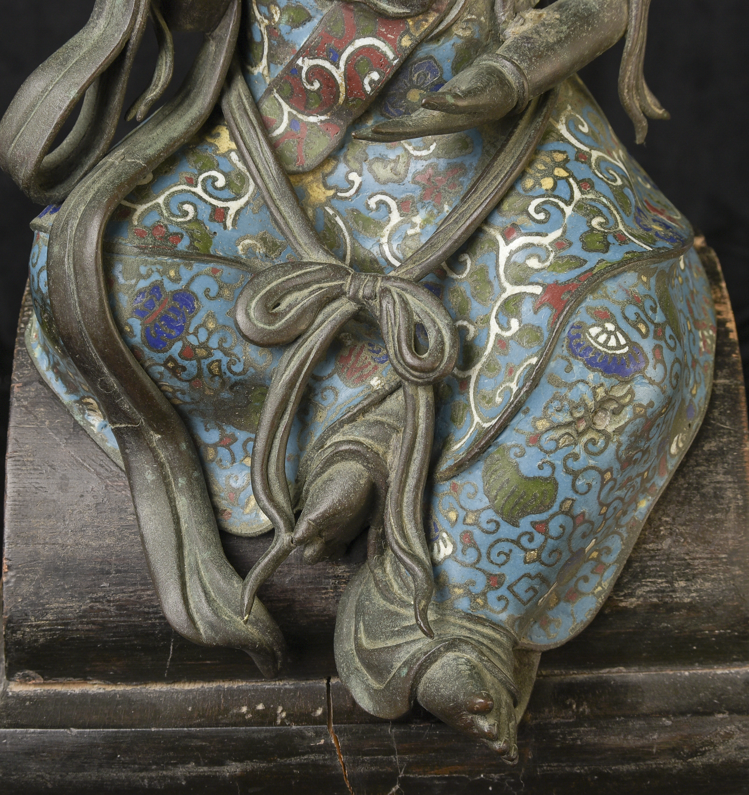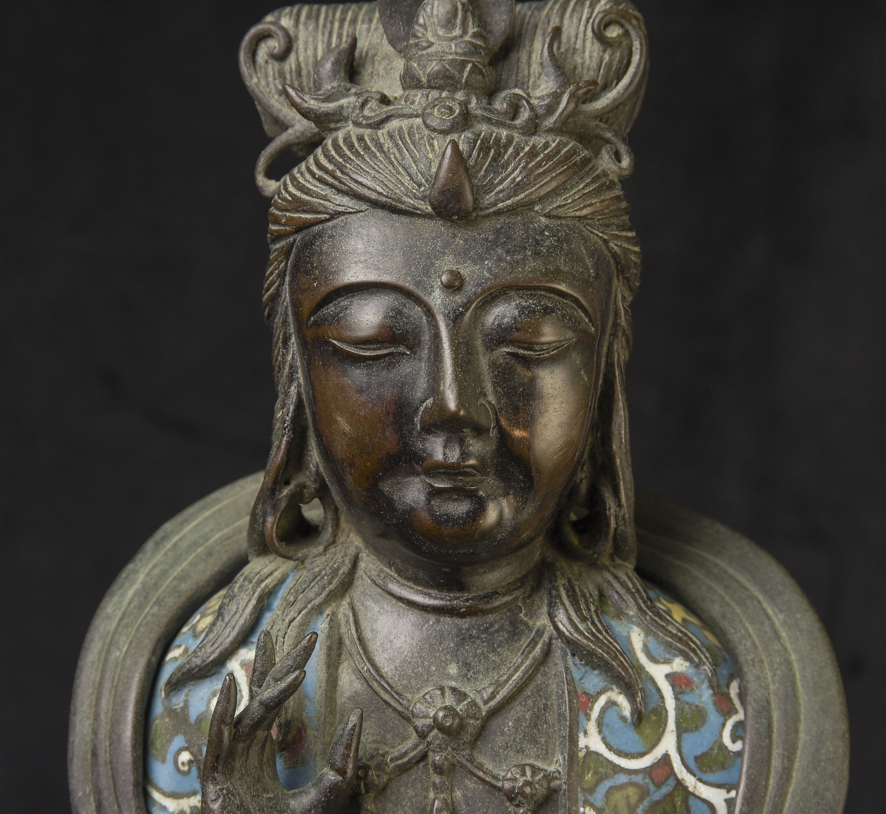 This is a very unusual Chinese 18/19th Century Cloisonne Quan-yin on the original (or early) stand. Most Chinese cloisonne figures you see are later in date, lighter in weight, and much less detailed in the parts that are cast in bronze. The colors in the cloisonne are also earlier, more muted than those seen on the late 19th/early 20th century examples usually seen in the marketplace. Some expectable minor losses to the cloisonn as seen in the photos. Cloisonne is very difficult to do and to remain in place over time on figures as they have so many sharp curves, so it is amazing that this piece is in such good condition given its age. There is also some splitting in the metal ribbons and significant loss and damage to the base. I was going to have a new base made, but the old one, even in its current state, adds a whole other dimension to the presentation. Expect that bits of the base may come loose in shipping and that the base works fine, but does have significant flaws to it. The face is beautiful, the hair-do is complex and captivating, and the overall piece is one that can easily become the centerpiece of any room. ( 14.25"H x 7"W x 7.5"D ) - 10.66lbs - (Base 9.5" x 6.5" x 5.5")