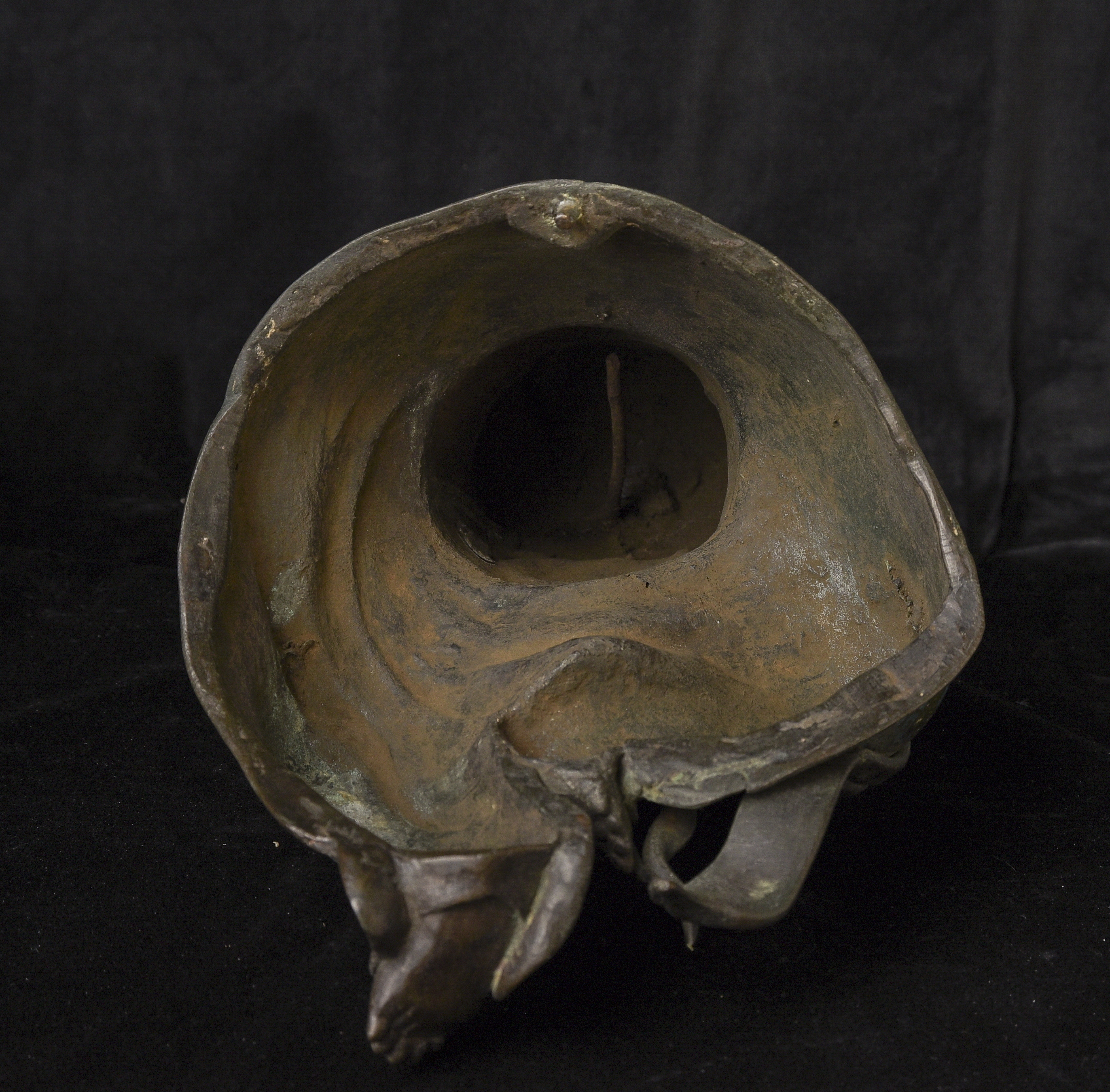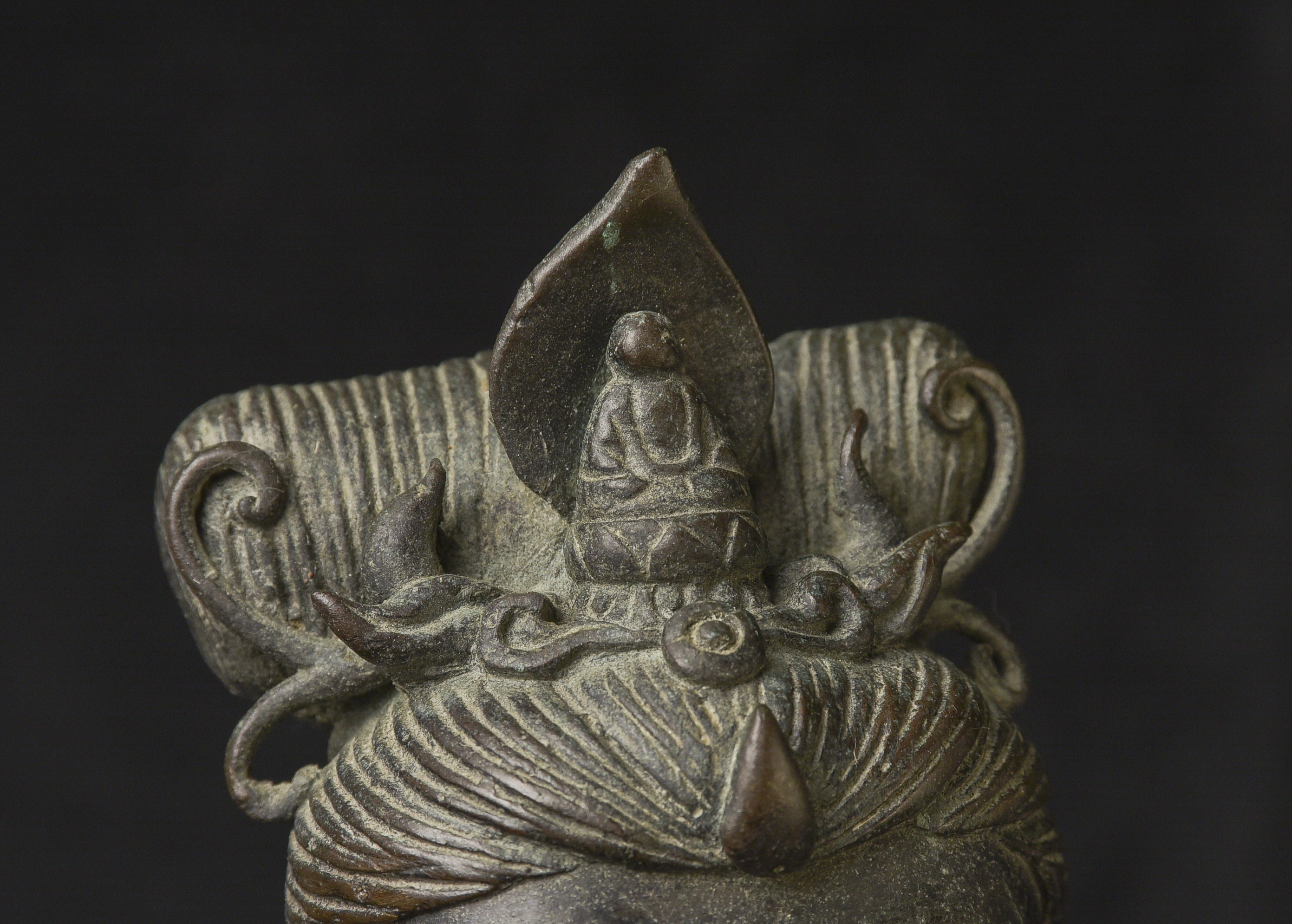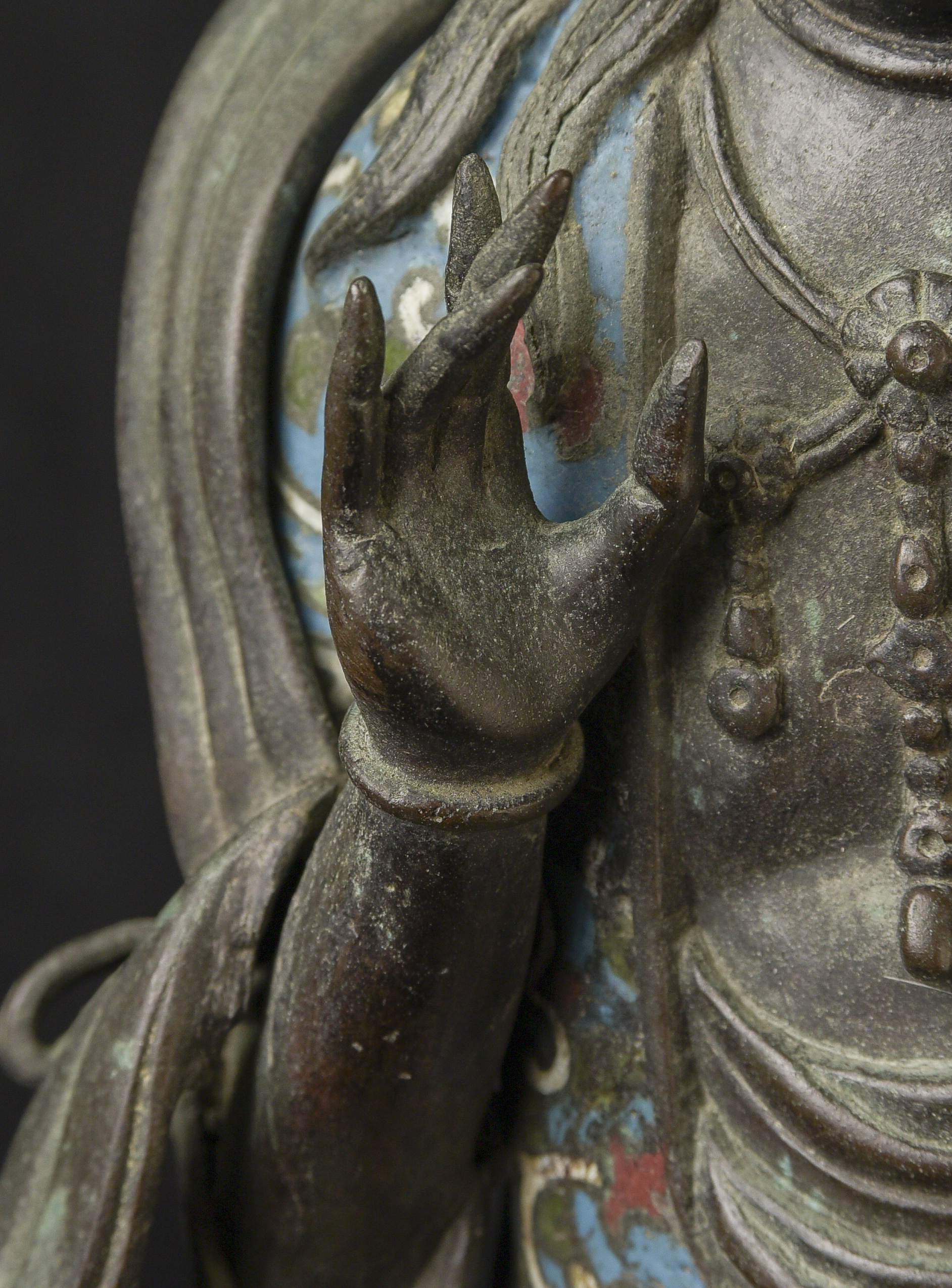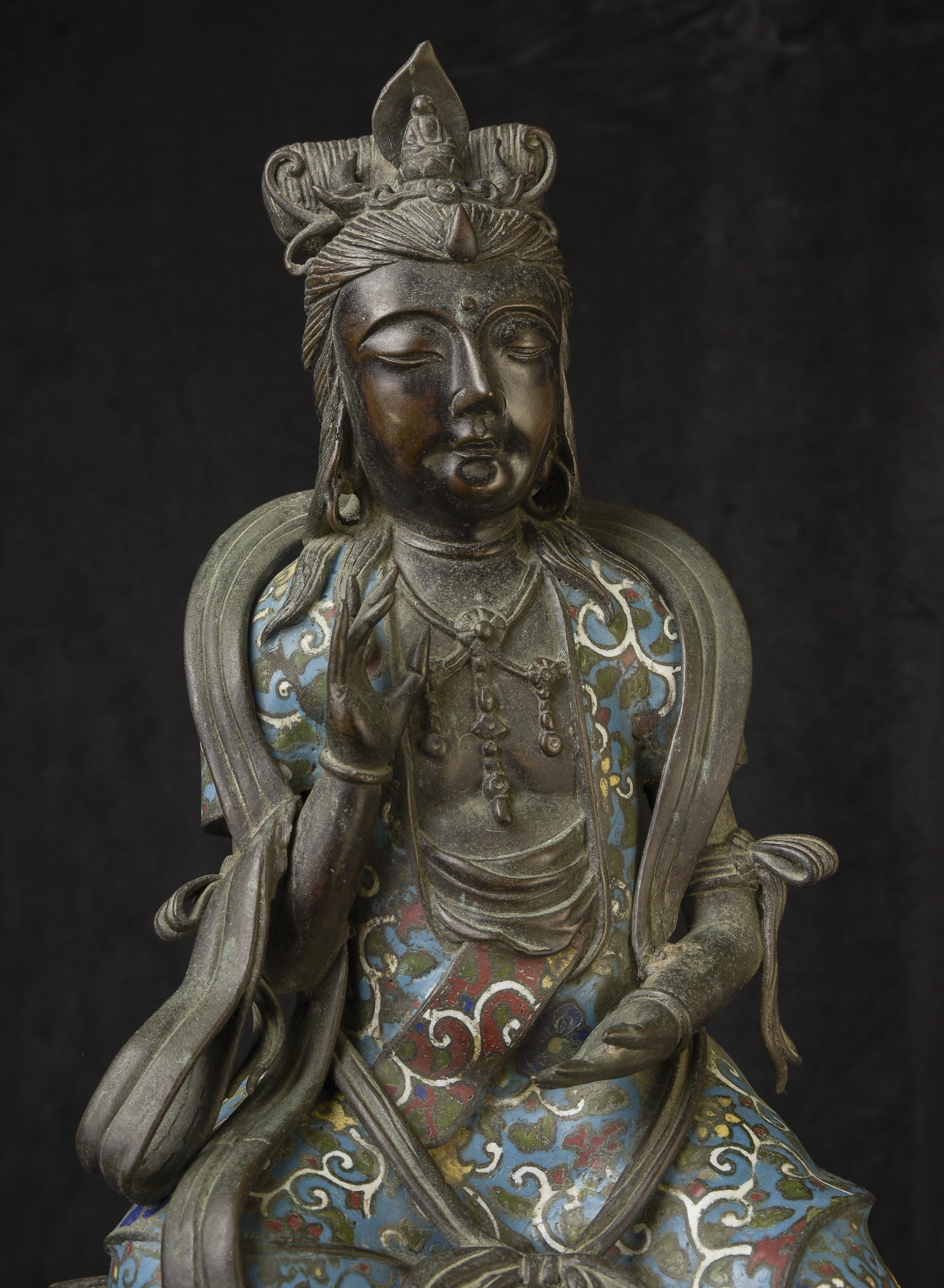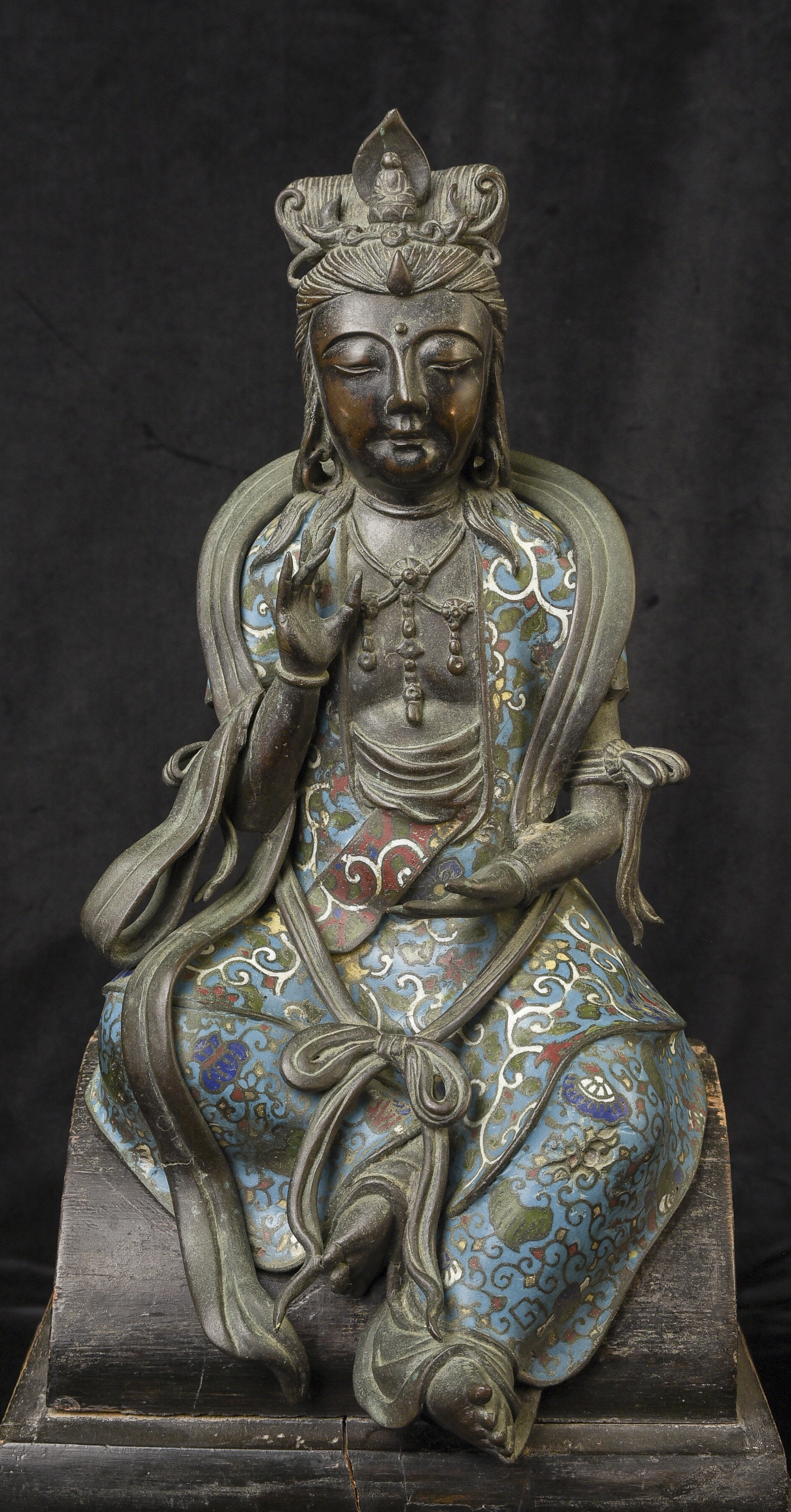 This is a very unusual Chinese 18/19th Century Cloisonne Quan-yin on the original (or early) stand. Most Chinese cloisonne figures you see are later in date, lighter in weight, and much less detailed in the parts that are cast in bronze. The colors in the cloisonne are also earlier, more muted than those seen on the late 19th/early 20th century examples usually seen in the marketplace. Some expectable minor losses to the cloisonn as seen in the photos. Cloisonne is very difficult to do and to remain in place over time on figures as they have so many sharp curves, so it is amazing that this piece is in such good condition given its age. There is also some splitting in the metal ribbons and significant loss and damage to the base. I was going to have a new base made, but the old one, even in its current state, adds a whole other dimension to the presentation. Expect that bits of the base may come loose in shipping and that the base works fine, but does have significant flaws to it. The face is beautiful, the hair-do is complex and captivating, and the overall piece is one that can easily become the centerpiece of any room. ( 14.25"H x 7"W x 7.5"D ) - 10.66lbs - (Base 9.5" x 6.5" x 5.5")