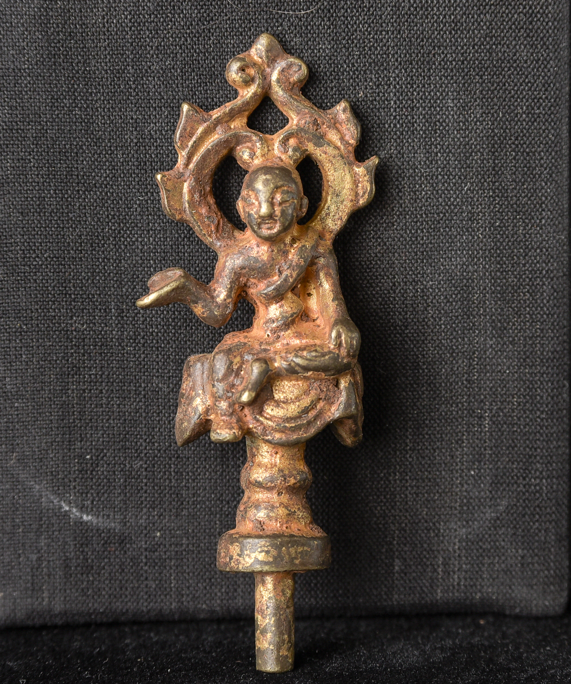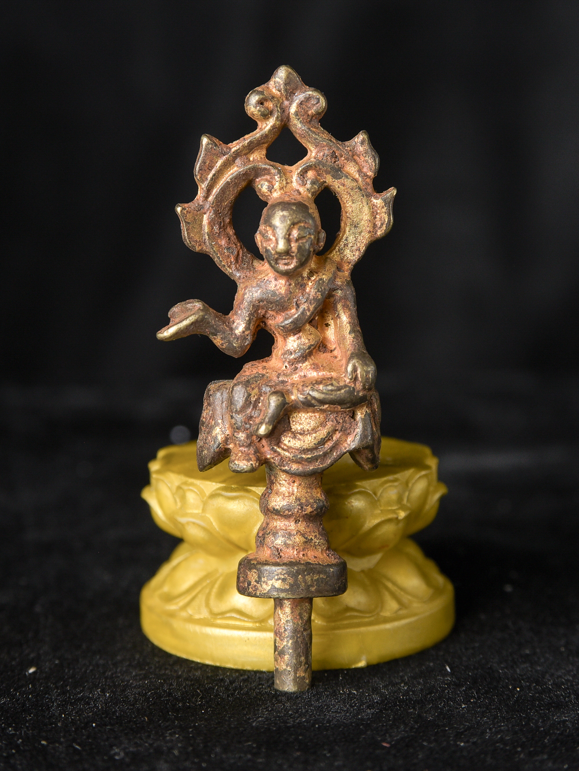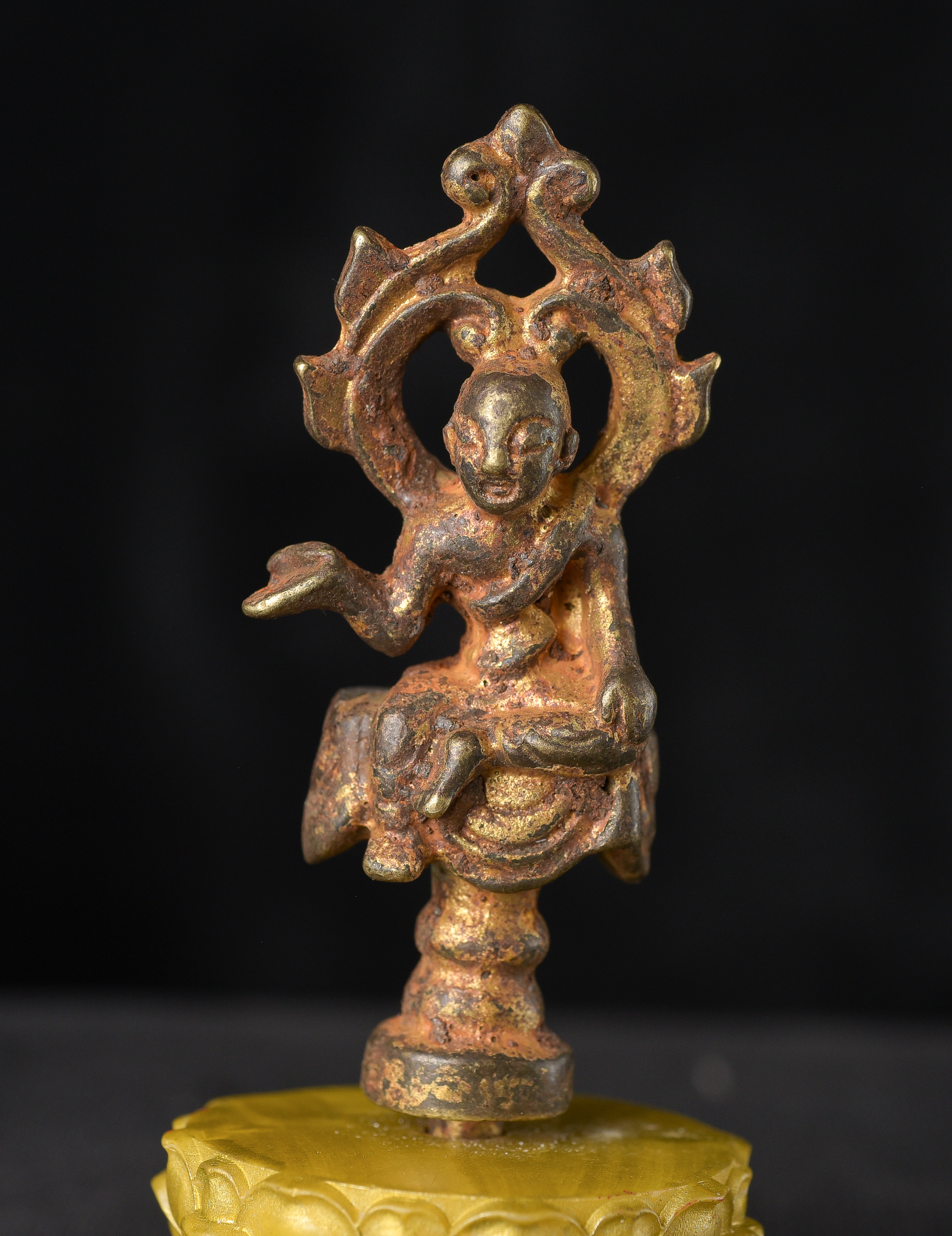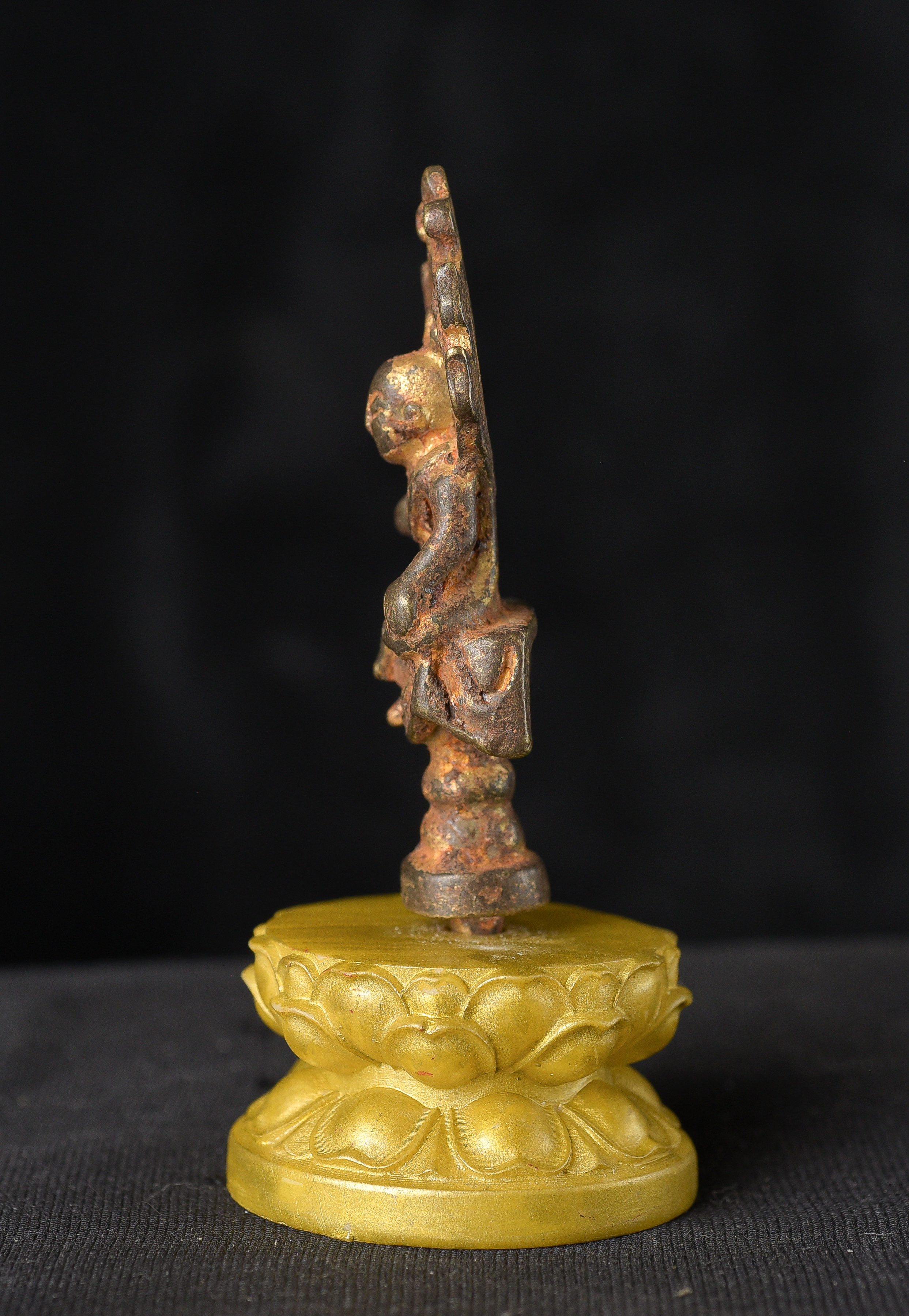 Tang bronze Quanyin or Buddha with remains of rich gilding. Nice example with excellent detail. It looks to be a lovely early example with a face that shows good detail. This type often has the face worn. (3.5"H x 1.5"W x 1.5"D ) - 85g.