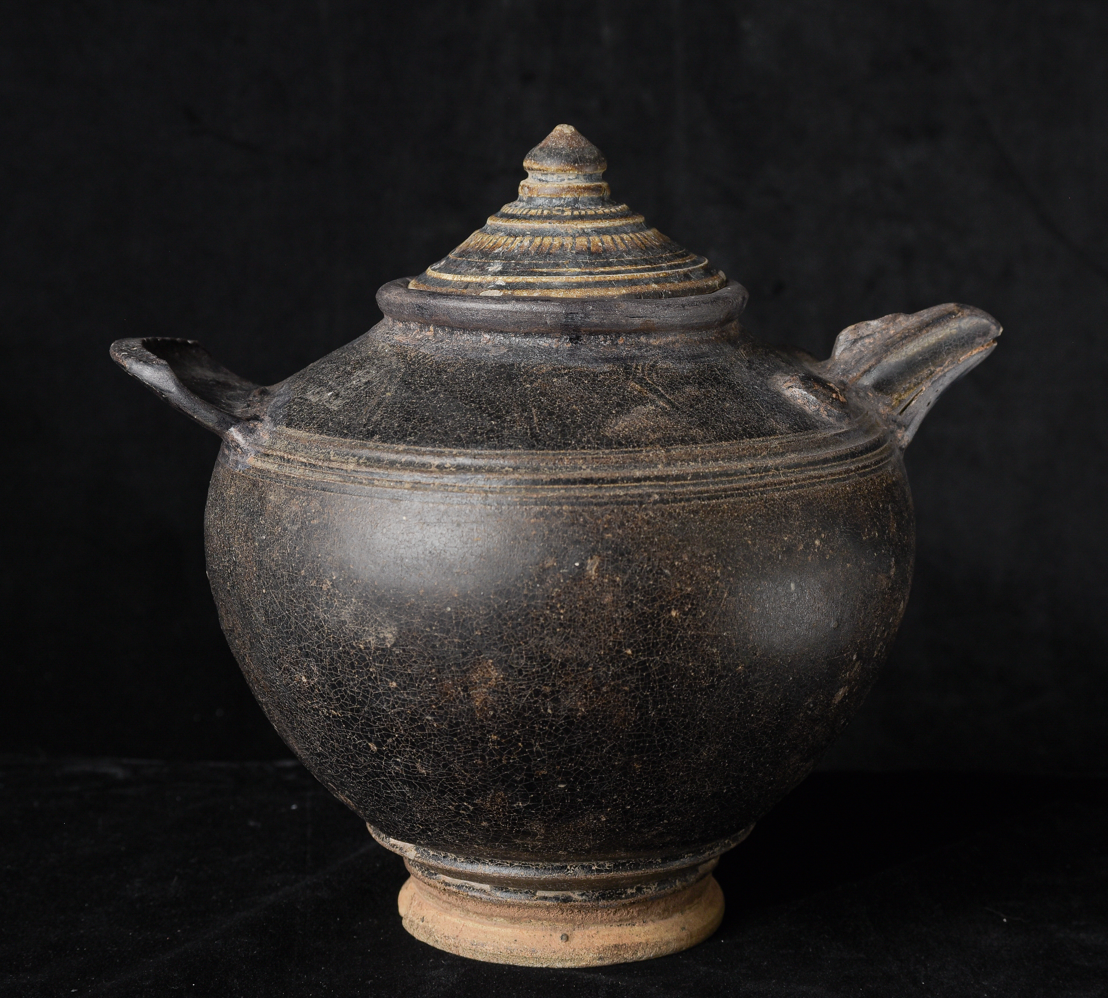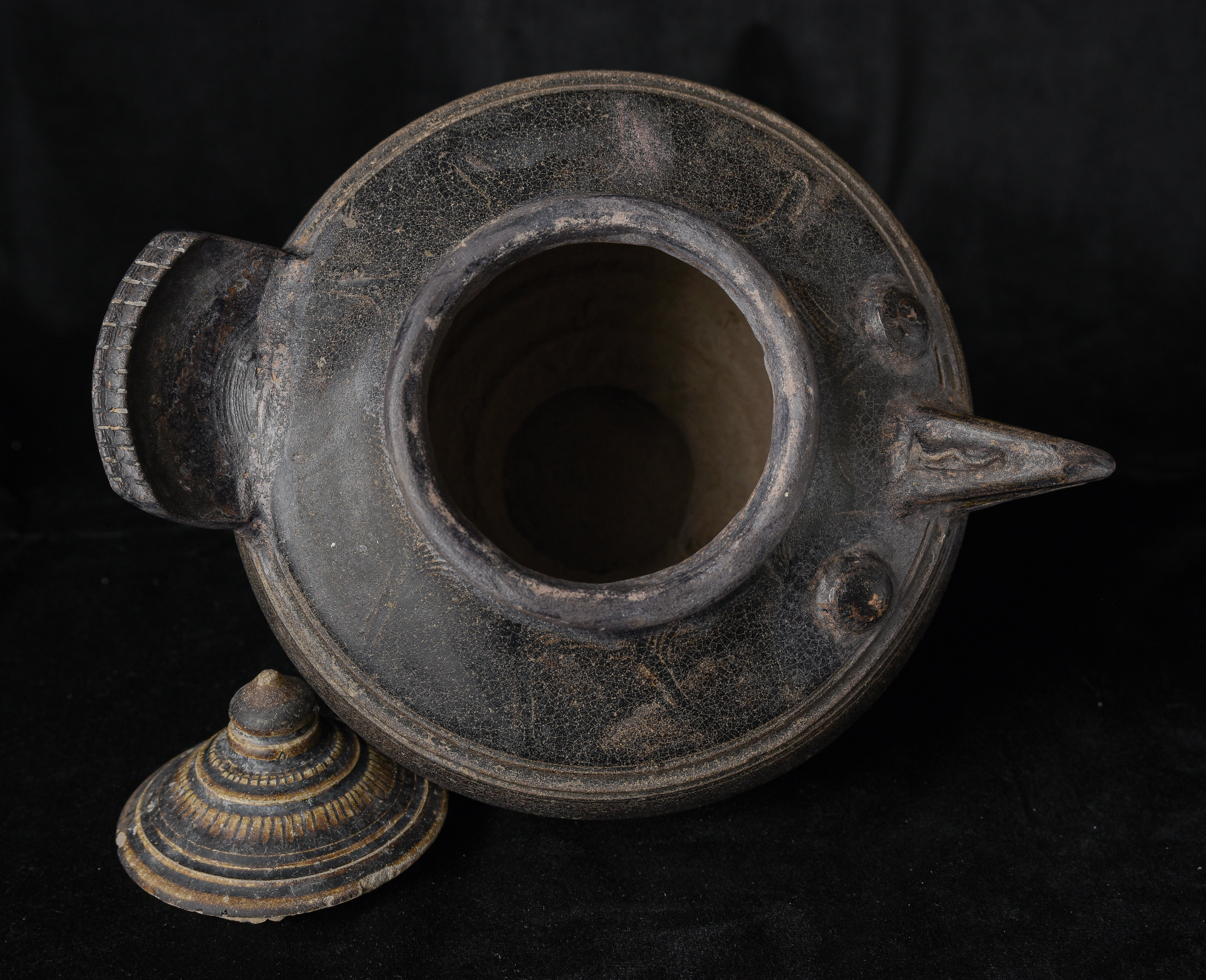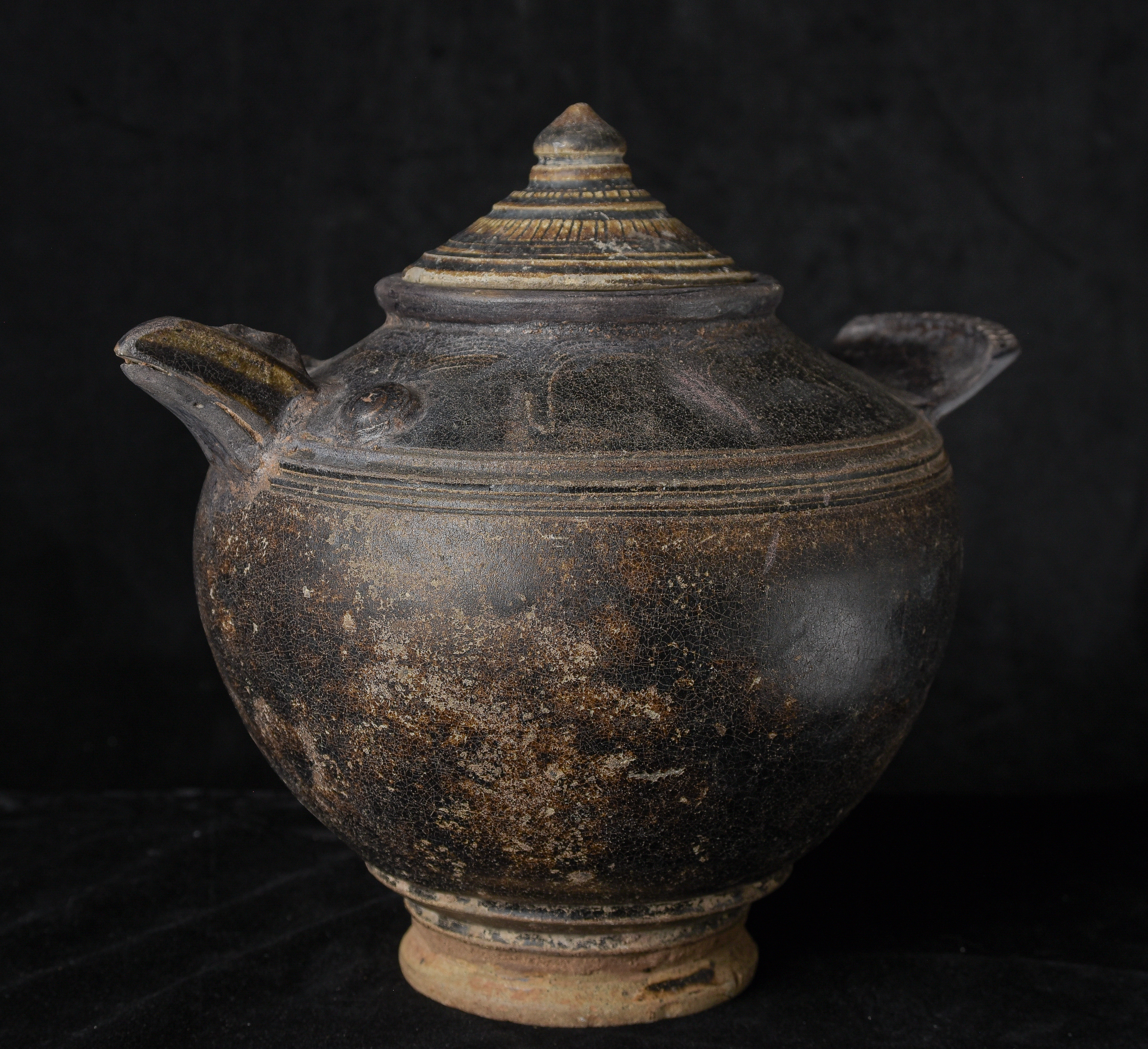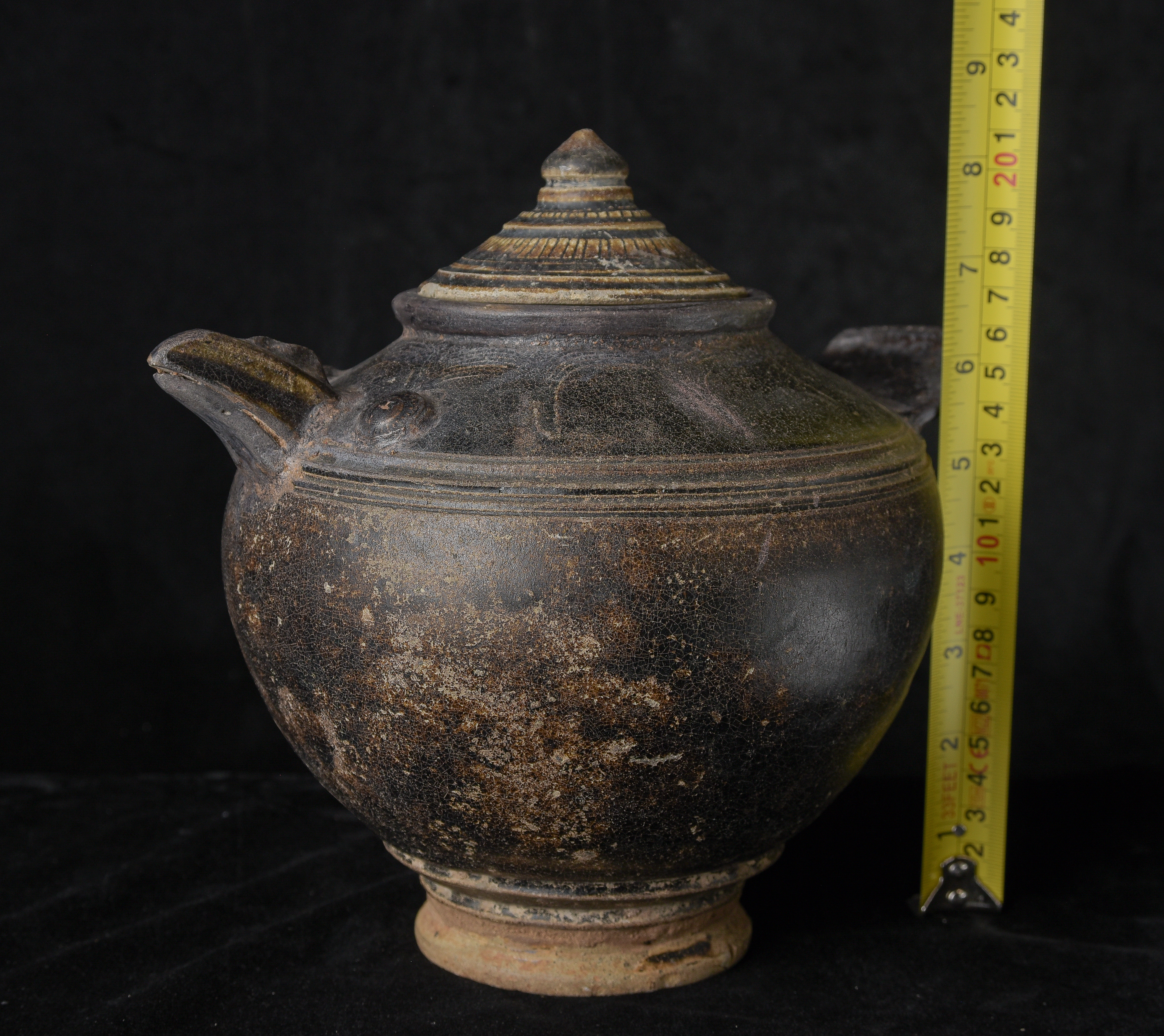 Pre-15th century Cambodian bird form pot with typical brown glaze. This is a particularly large example of its type. Chips to the rim of the top (appears to be the matched original), usual wear, and degrading of l glaze due to time and exposure to the environment. ( 8.5"H x 9"W x 7"D ) - 3.5lbs