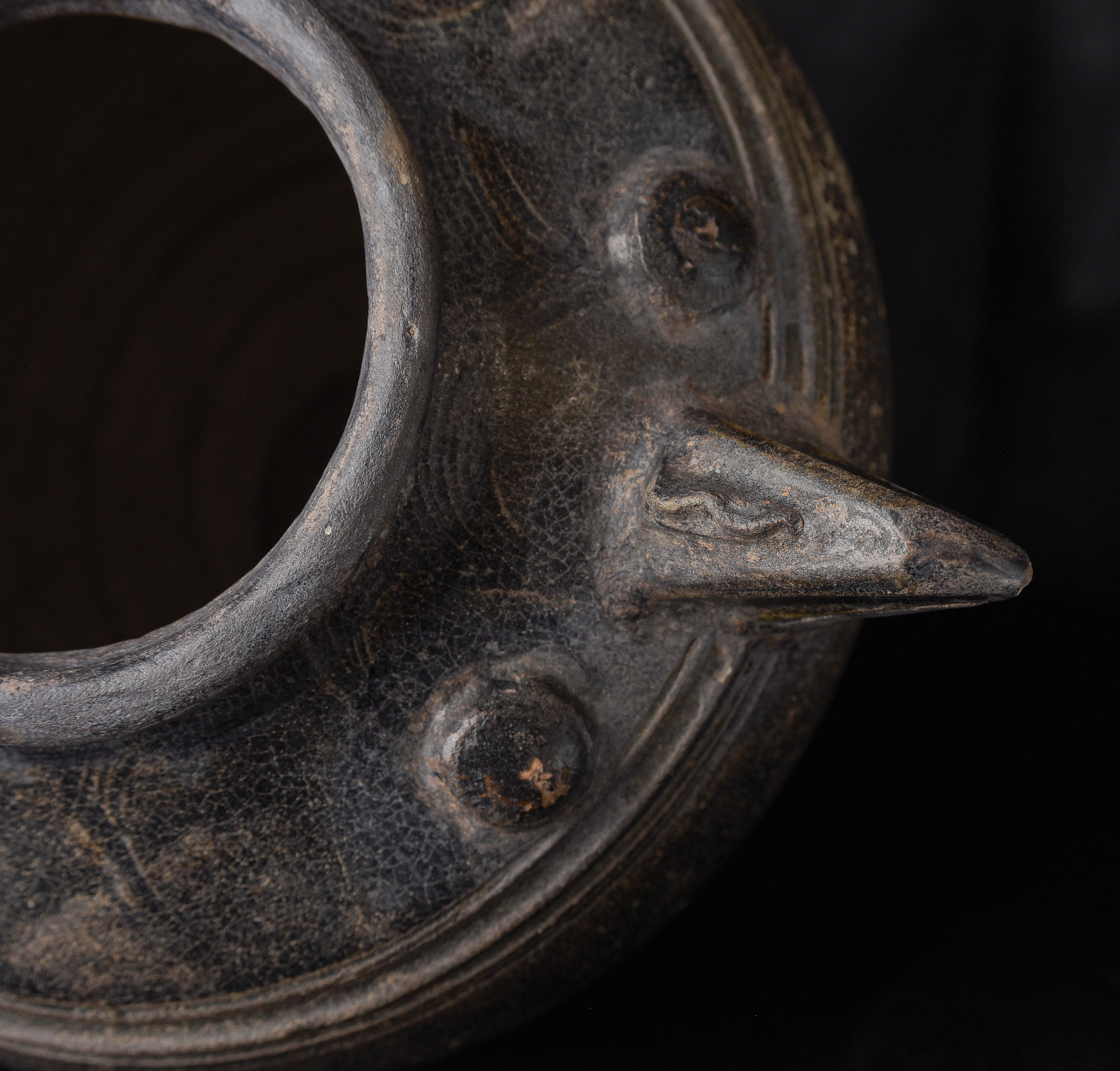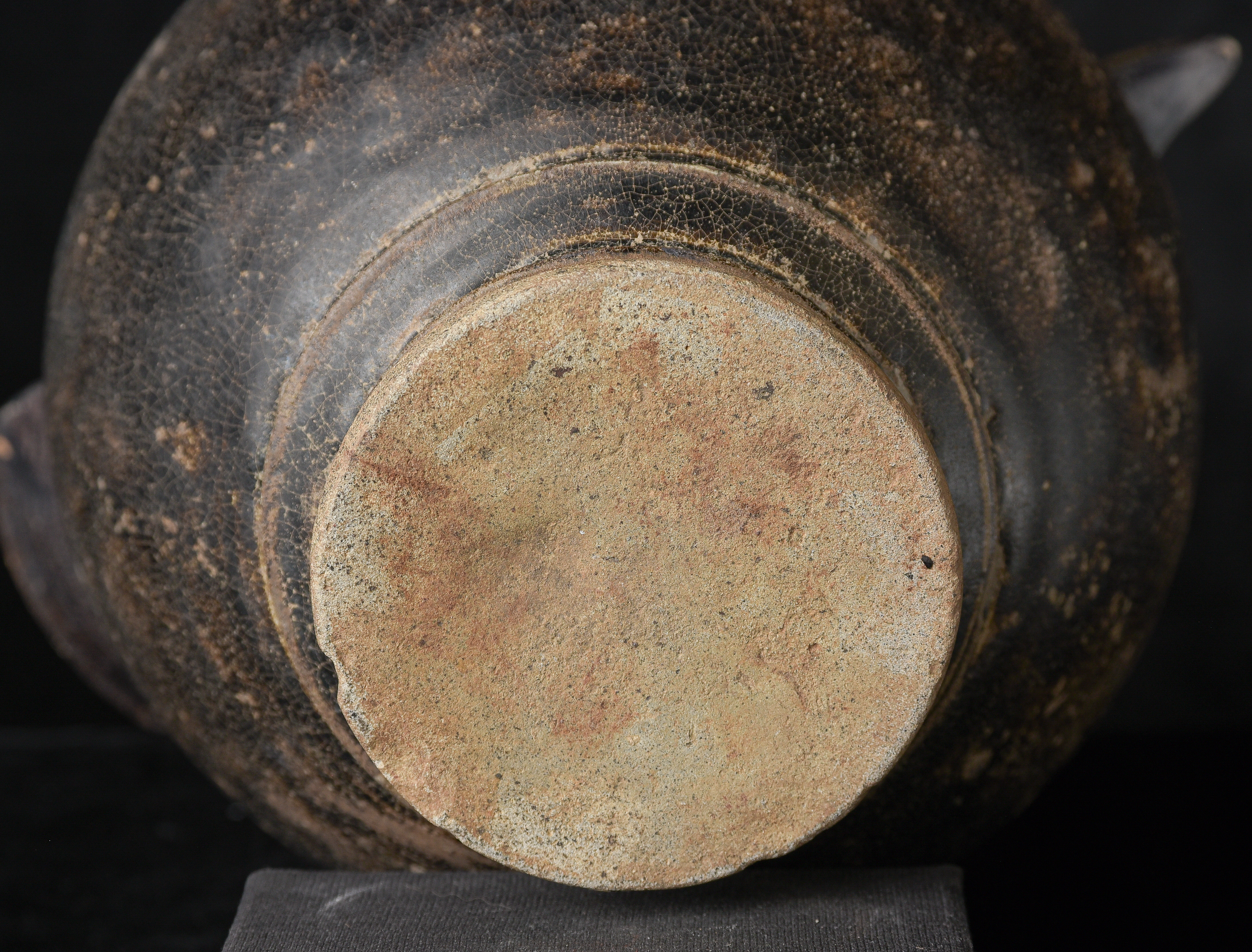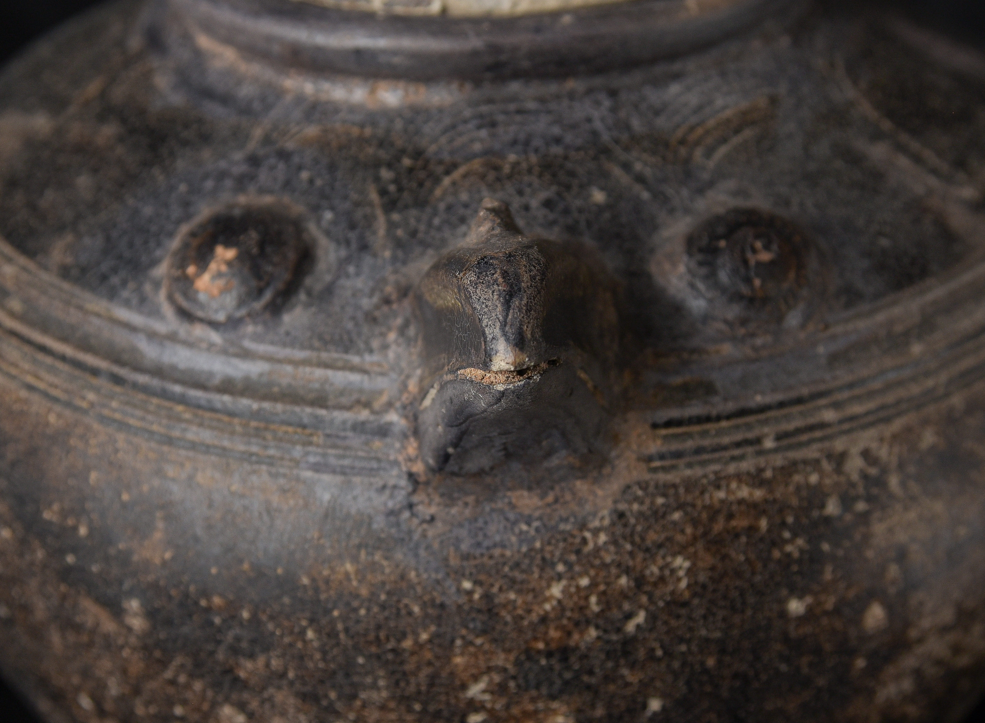 Pre-15th century Cambodian bird form pot with typical brown glaze. This is a particularly large example of its type. Chips to the rim of the top (appears to be the matched original), usual wear, and degrading of l glaze due to time and exposure to the environment. ( 8.5"H x 9"W x 7"D ) - 3.5lbs