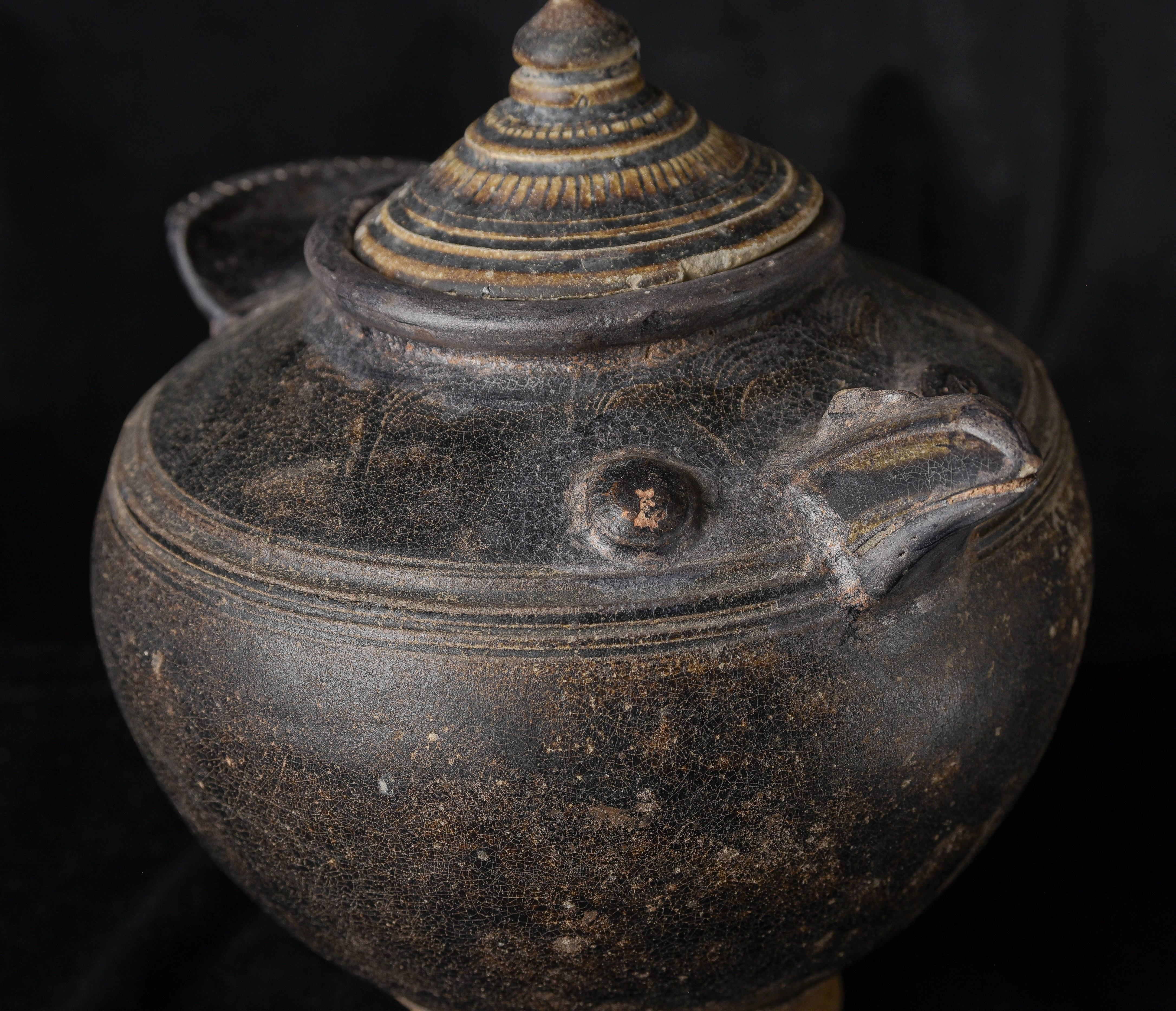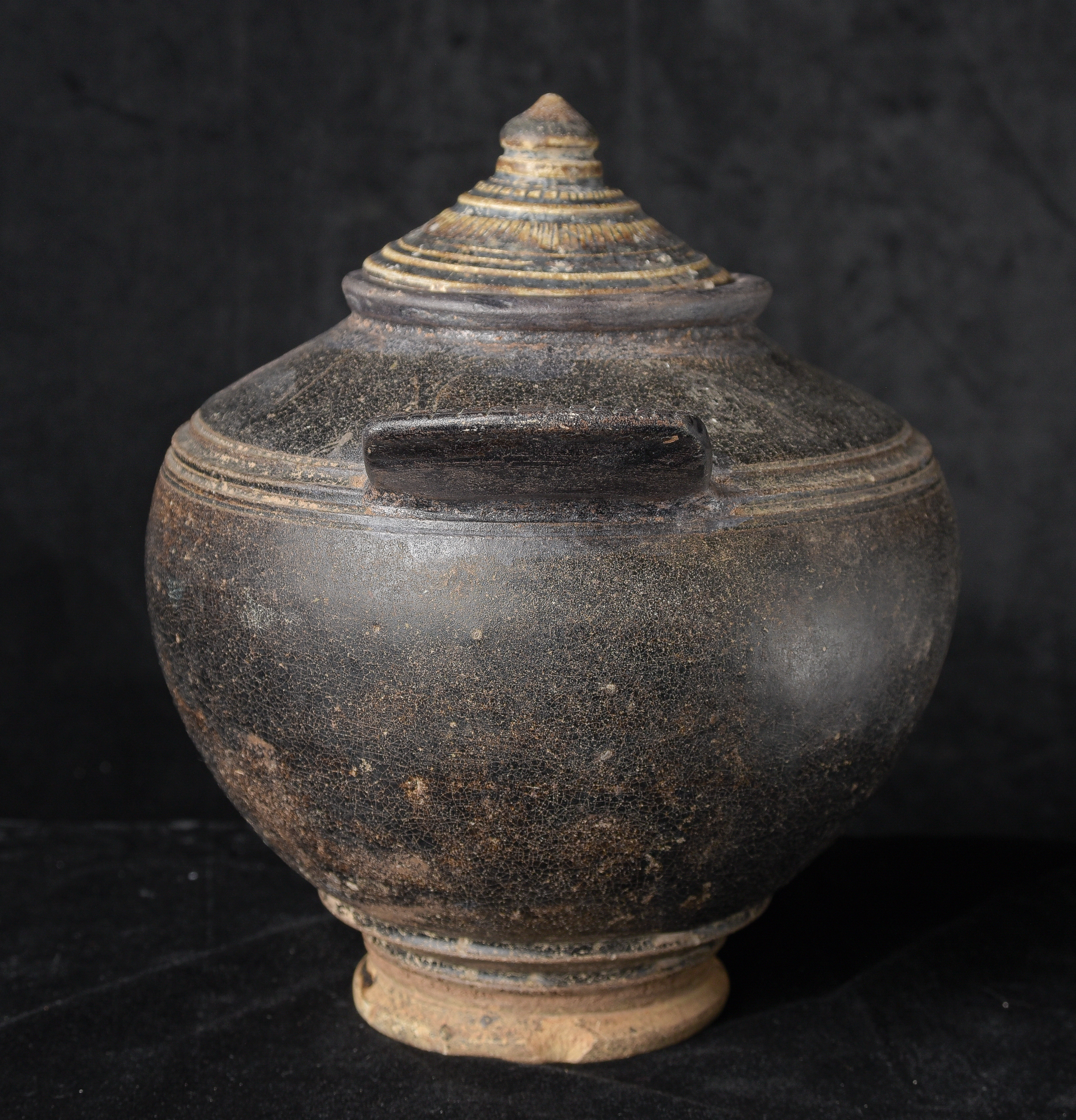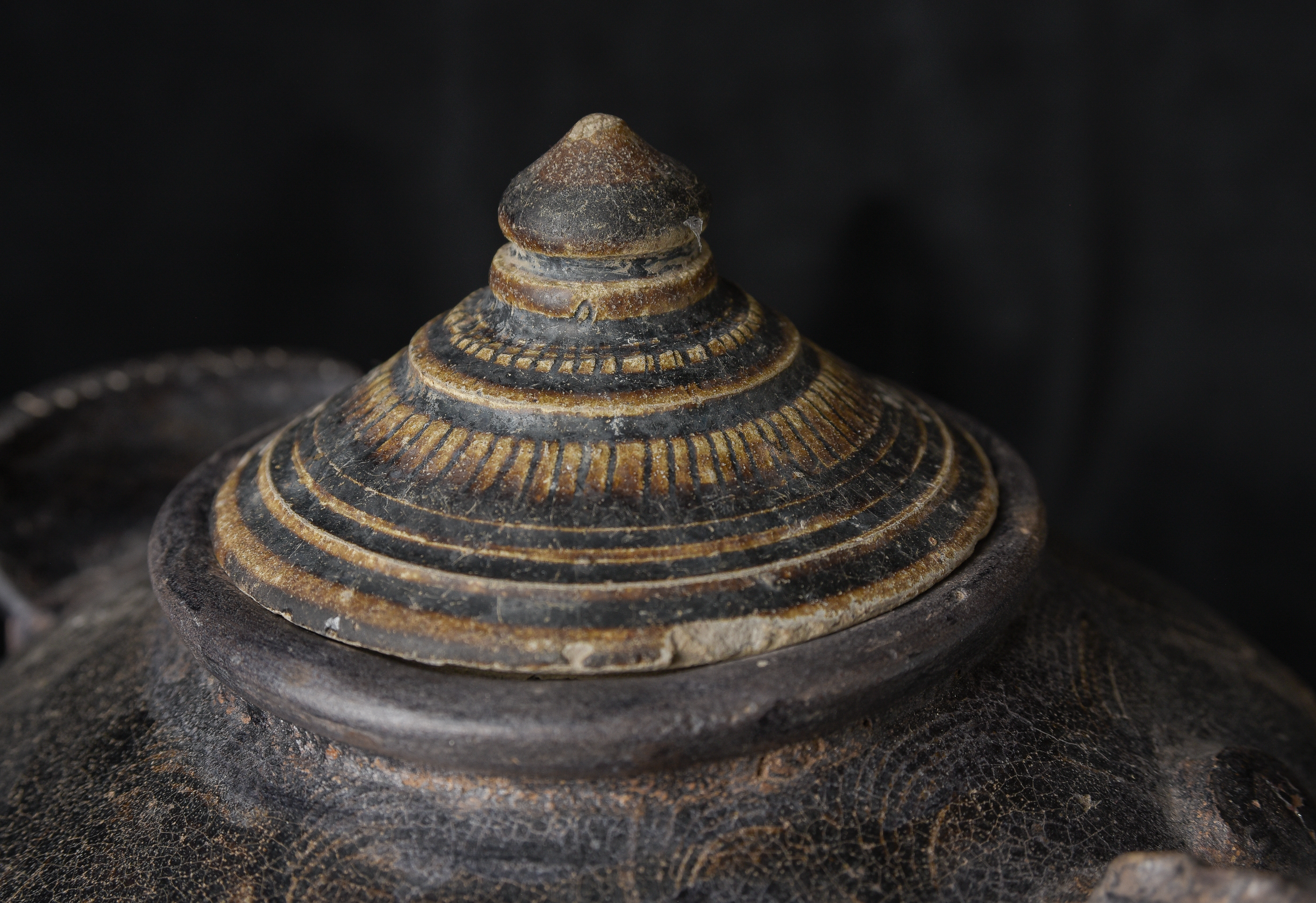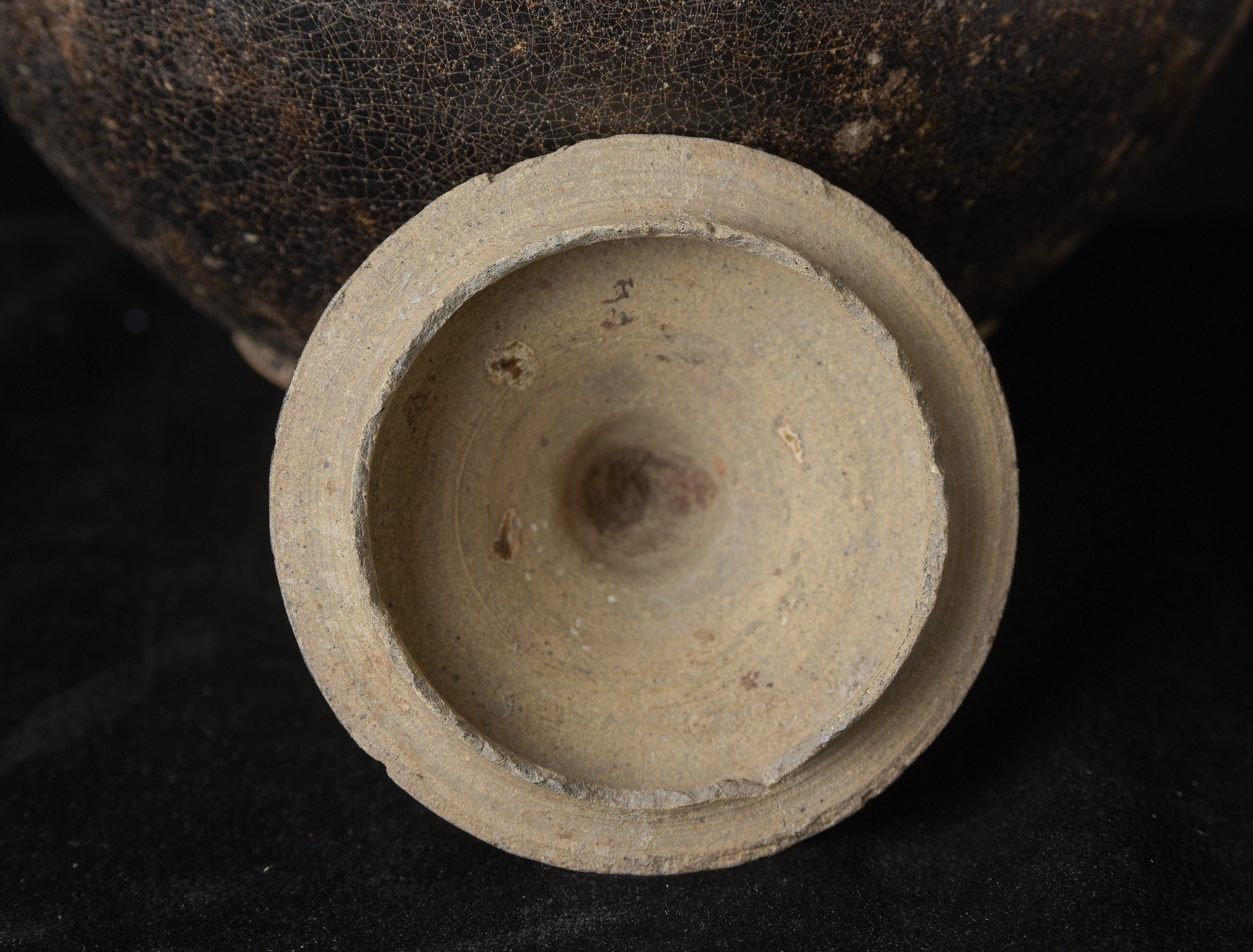 Pre-15th century Cambodian bird form pot with typical brown glaze. This is a particularly large example of its type. Chips to the rim of the top (appears to be the matched original), usual wear, and degrading of l glaze due to time and exposure to the environment. ( 8.5"H x 9"W x 7"D ) - 3.5lbs