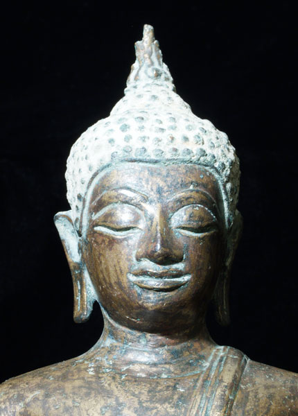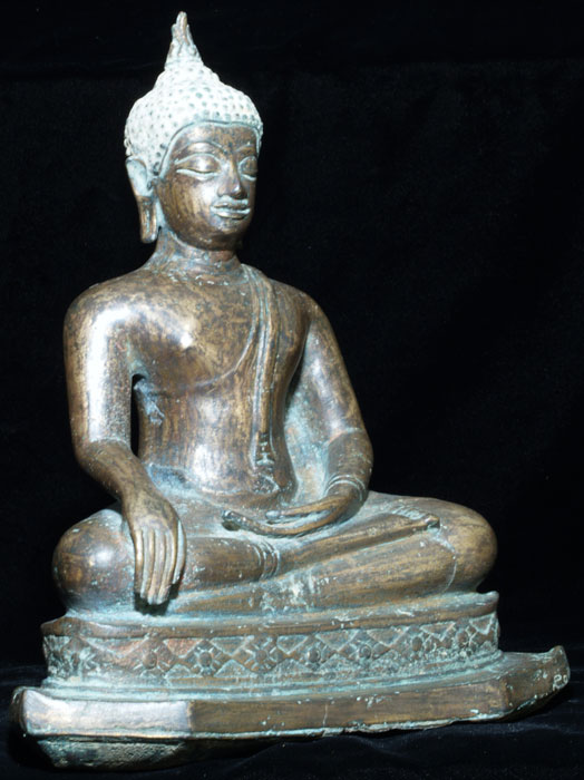 Very special Buddha- a late Utong style (Utong “C”) 15th century classic Thai Buddha, with strong influence from late Sukothai (Kampenphet) style. This piece goes beyond even these two classic styles by adding an extraordinarily beautiful, and as far as I can find, unique, raised design around the base. In Thailand today both high quality Utong and Kamphen Phet Buddhas are some of the most sought after and valuable of all Buddha styles, as many Thais consider these some of their greatest art. The aspects which make it. The late Utong elements include the band between the hair and the face, the shape of the base (with the corners gently turned up), the shape of the head and the eyebrows, and the overall look of the face(you can see the very last whisper of Khmer influence from the Khmer domination of Thailand in the 11th to the 13th centuries in the face- after this, it completely disappears from Thai Buddhas) . The Kamphen Phet elements include the shape of the body (strong and thick, yet long limbed), the finial, the sash, and something about the face which is hard to describe. Both Utong and Kamphen Phet helped contribute to the next major period of Thai art- the Ayuthaya period. Another thing which is extremely significant about this Buddha is the alloy, which looks to contain some good amount of precious metals such as gold and silver- it is a wonderful extremely heavy alloy with a honey color which I occasionally encounter- it has a special luster and feel, and is almost always used for very high quality pieces. (You can tell I like this piece) 9.5 inches tall by 8 inches wide at the base. Weight a full 7.5 bounds with most of the clay core scooped out (the statue is mostly solid cast). There was originally a lower base which would have made him sit about 13 inches tall. I’ve seen other early pieces of special alloys have part (or all) of their bases removed to make other special Buddhas.