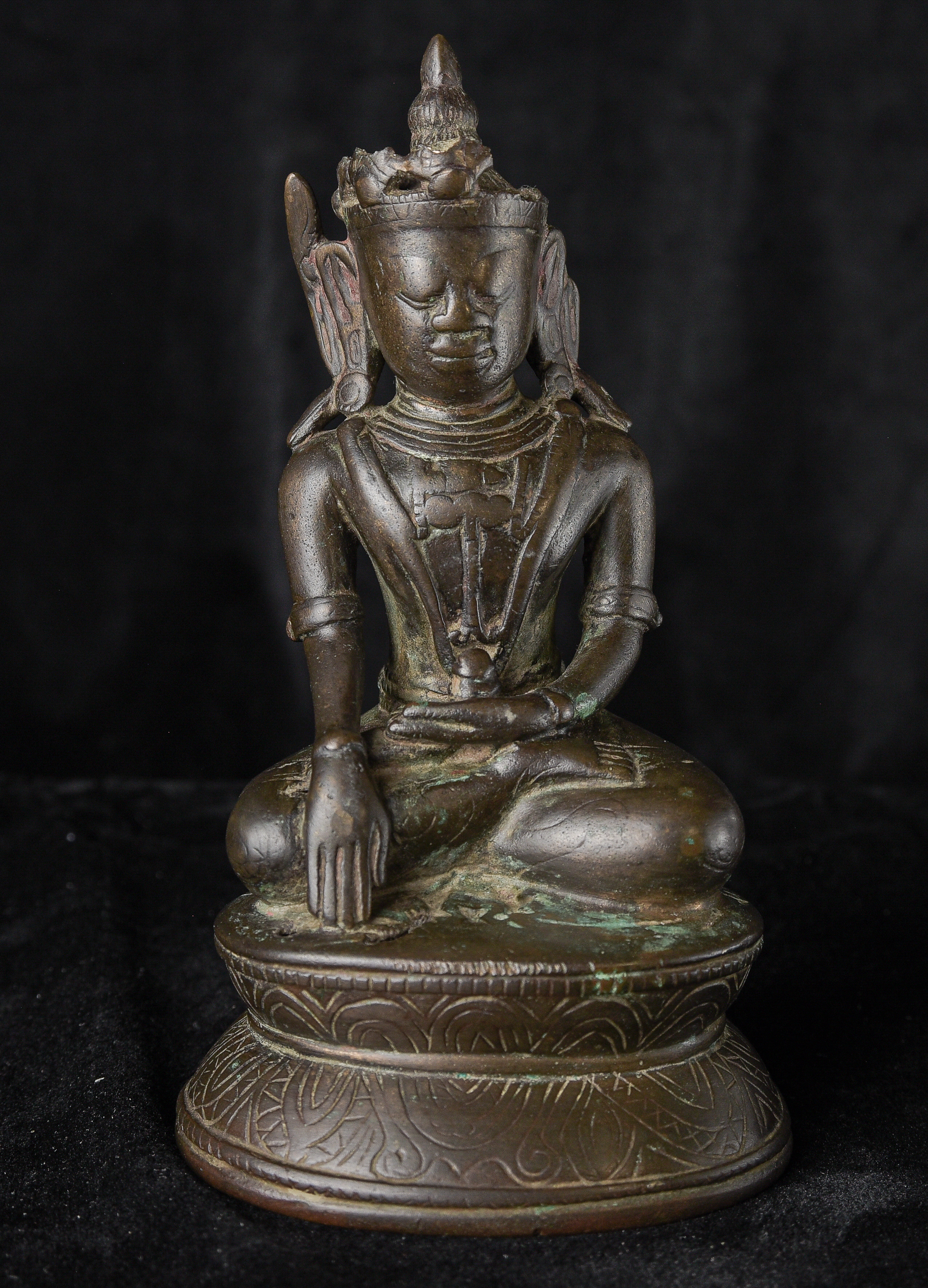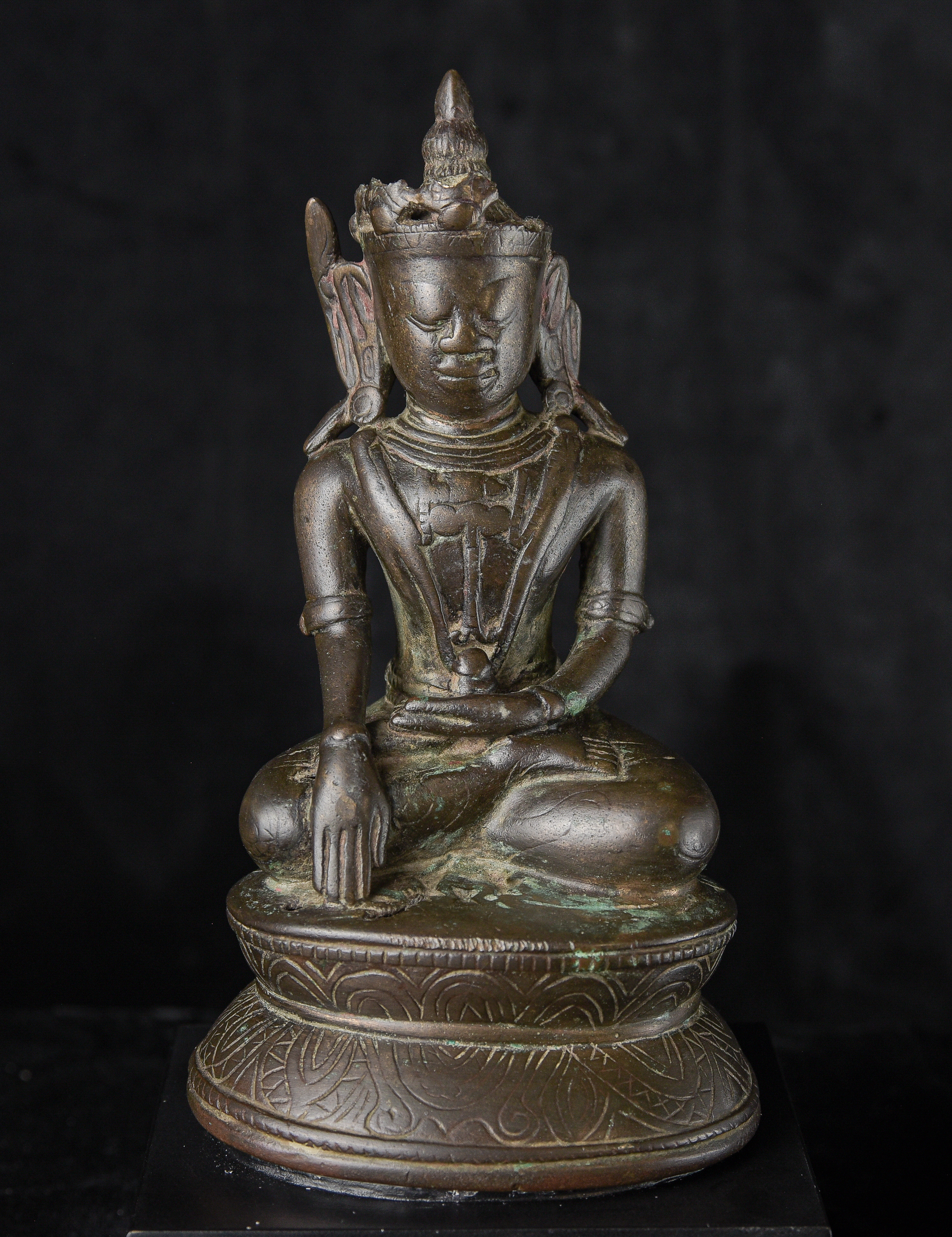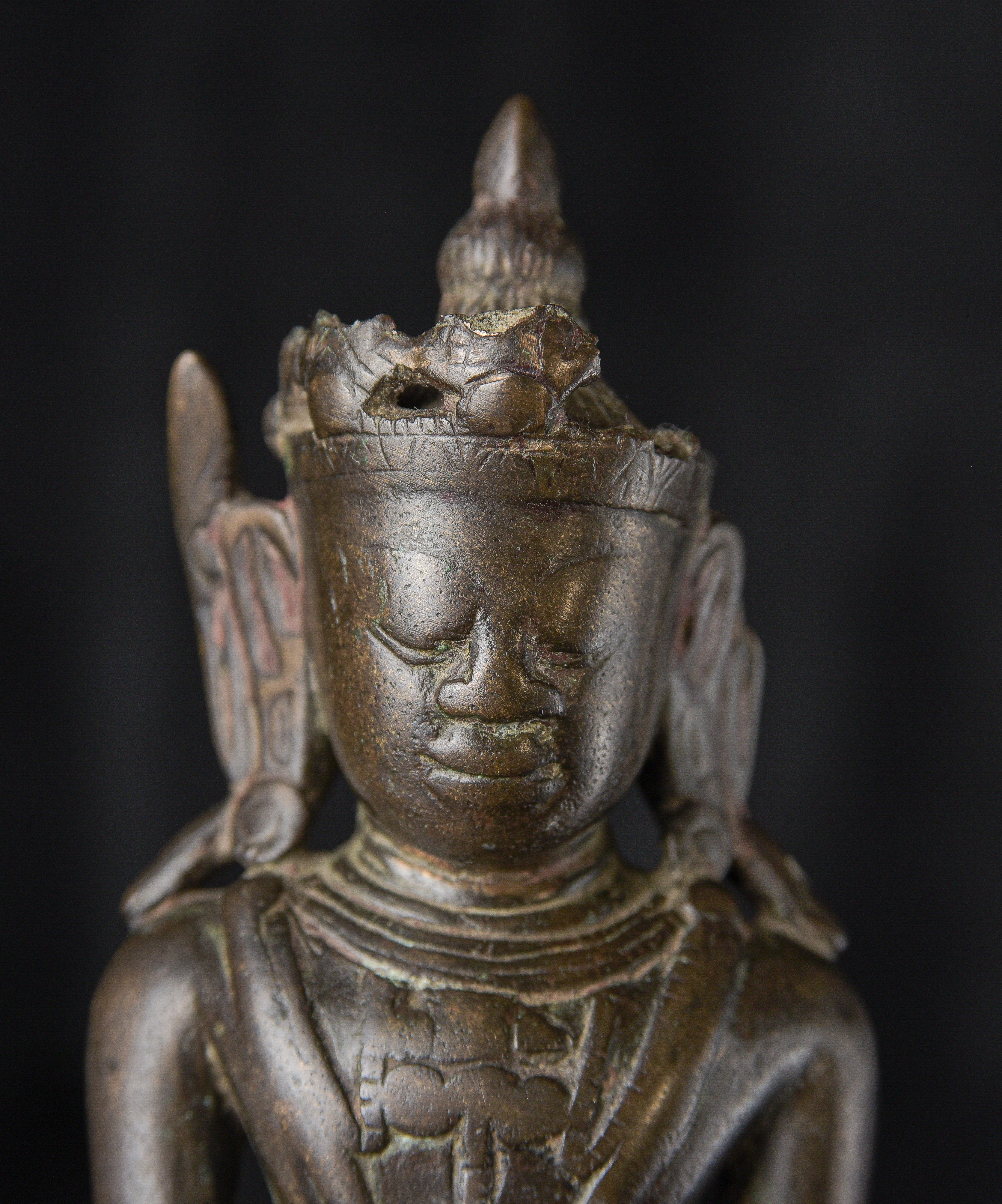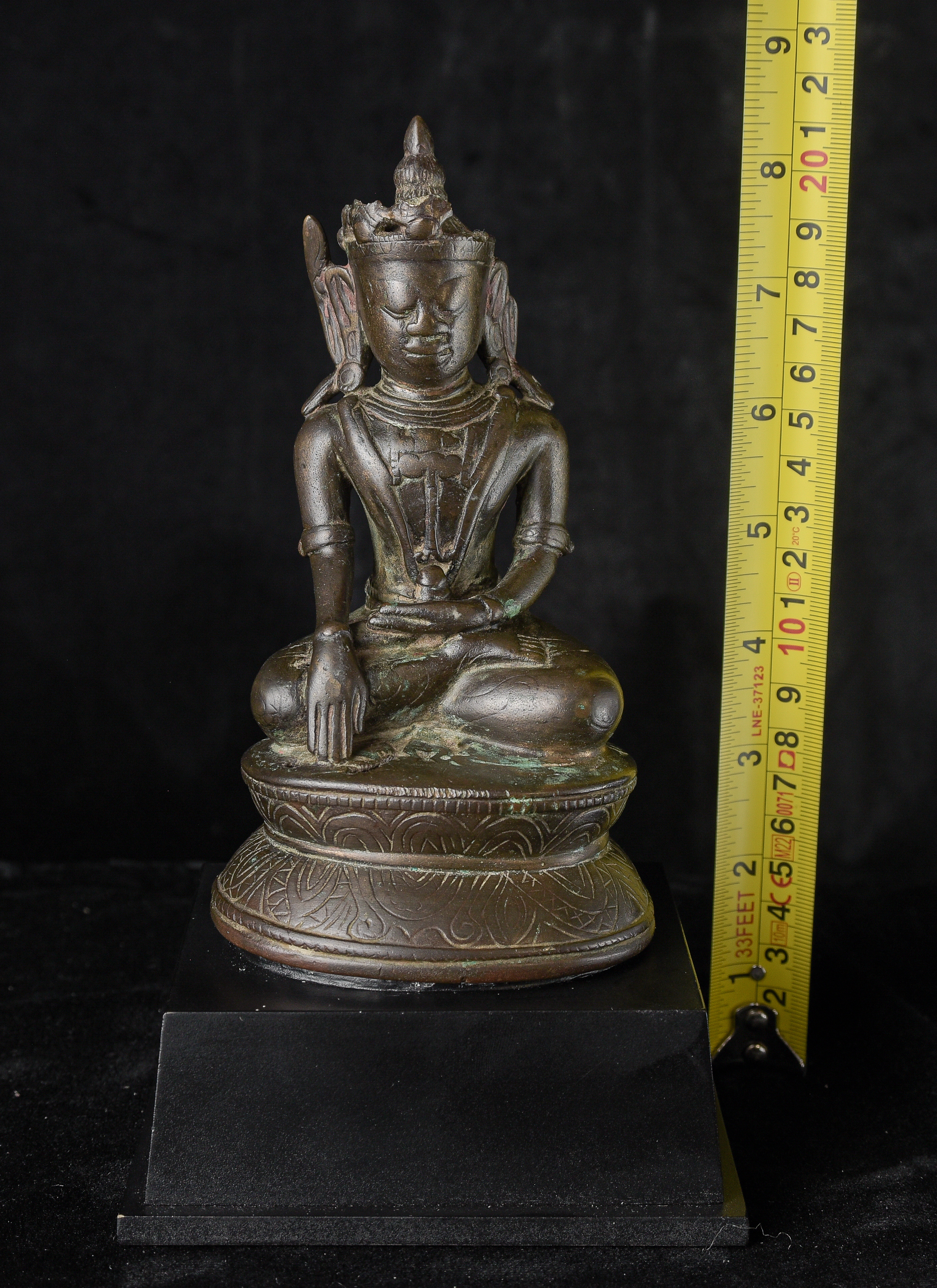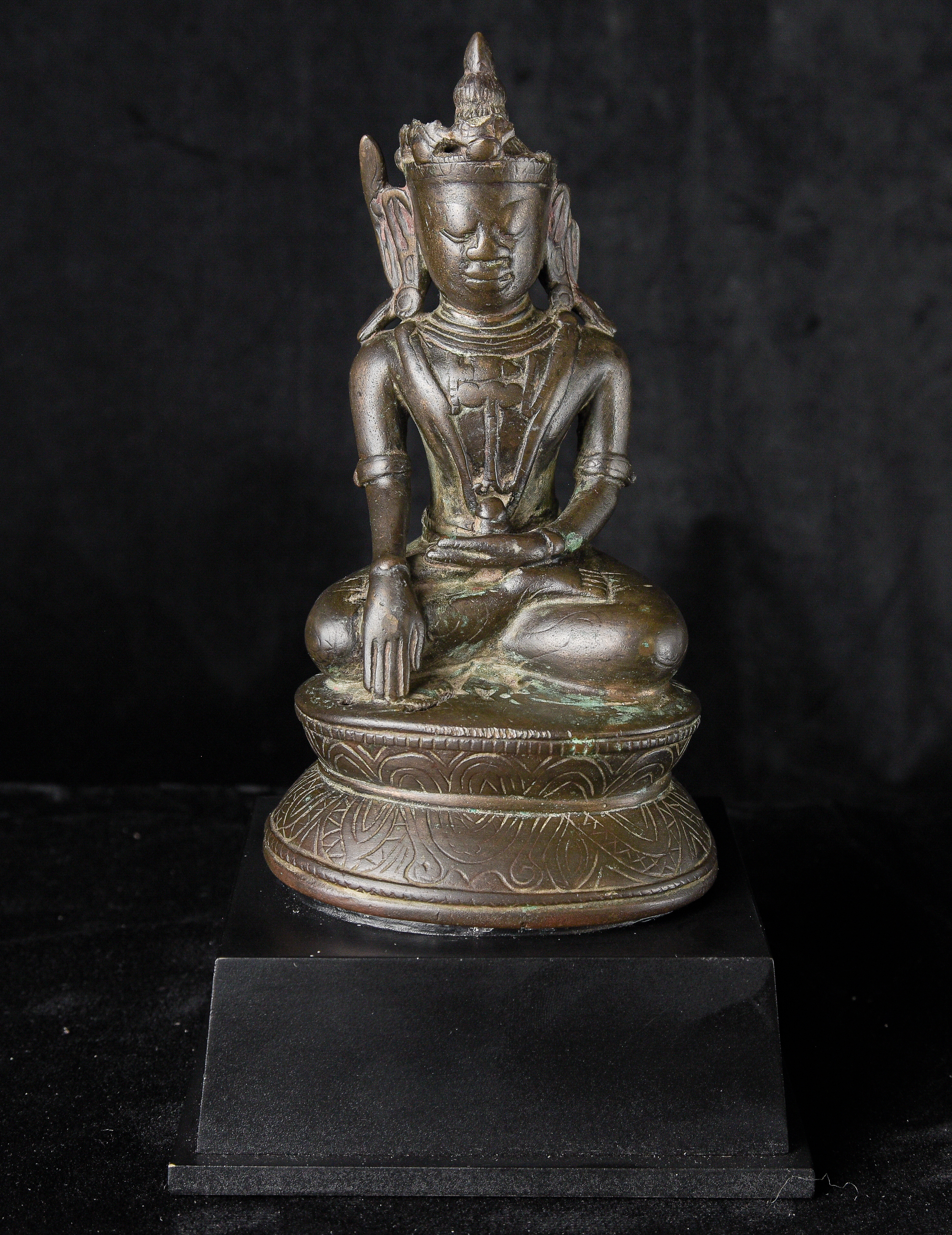 13/14thC Burmese Post Pagan/Early Ava /Arakan Buddha. Well cast, with a beautiful face- especially for this rare type, of which very few were made. A real collector's piece, especially in this quality. Missing part of crown on one side. It had the expected wear for a 700+ year old piece- otherwise it is in great shape. ( 6.75" H x 3.5"W x 3"D ) - 1.79lbs. - Base: ( 4.75"W x 1.75"H ). Mudeum worthy.