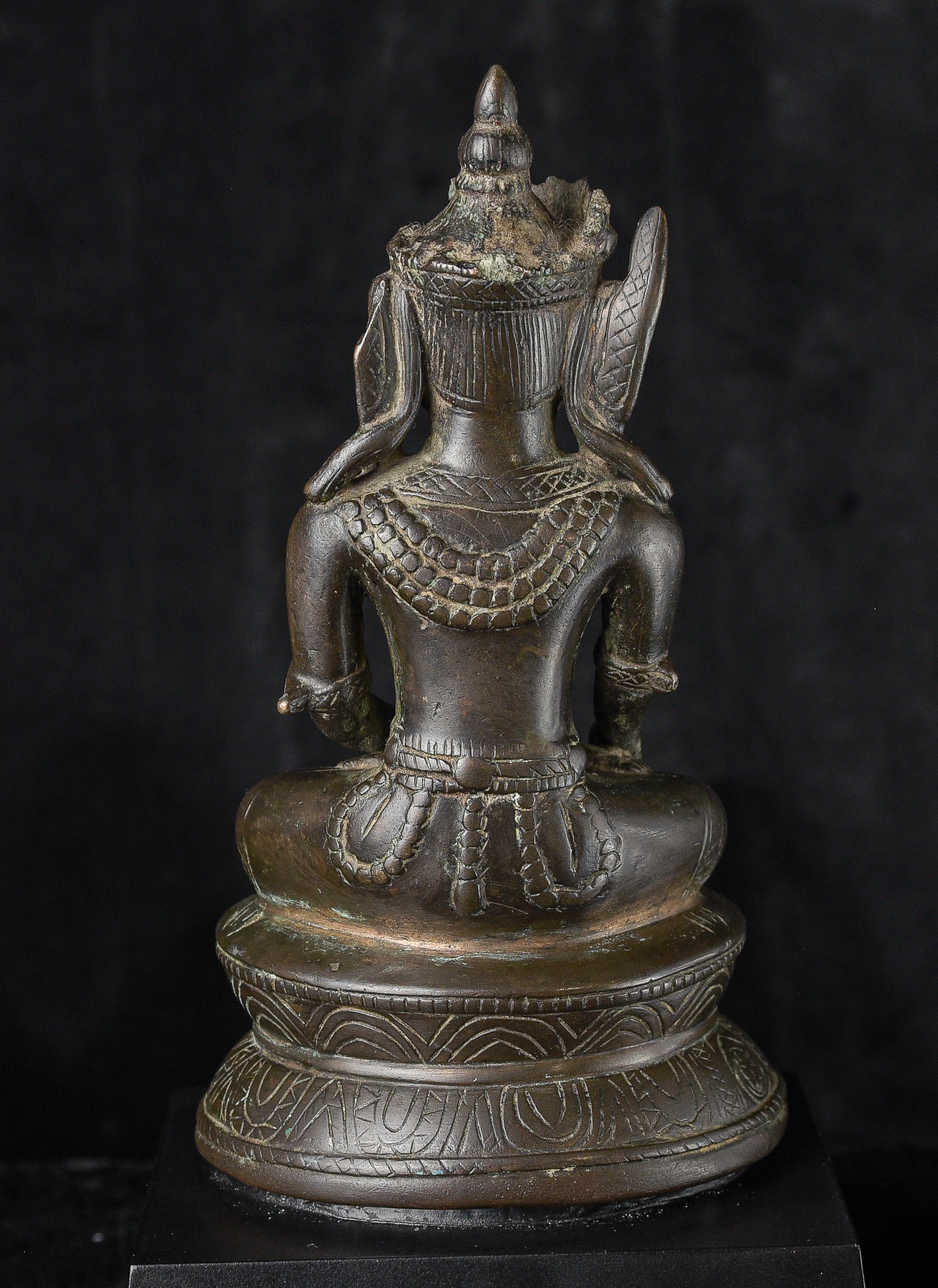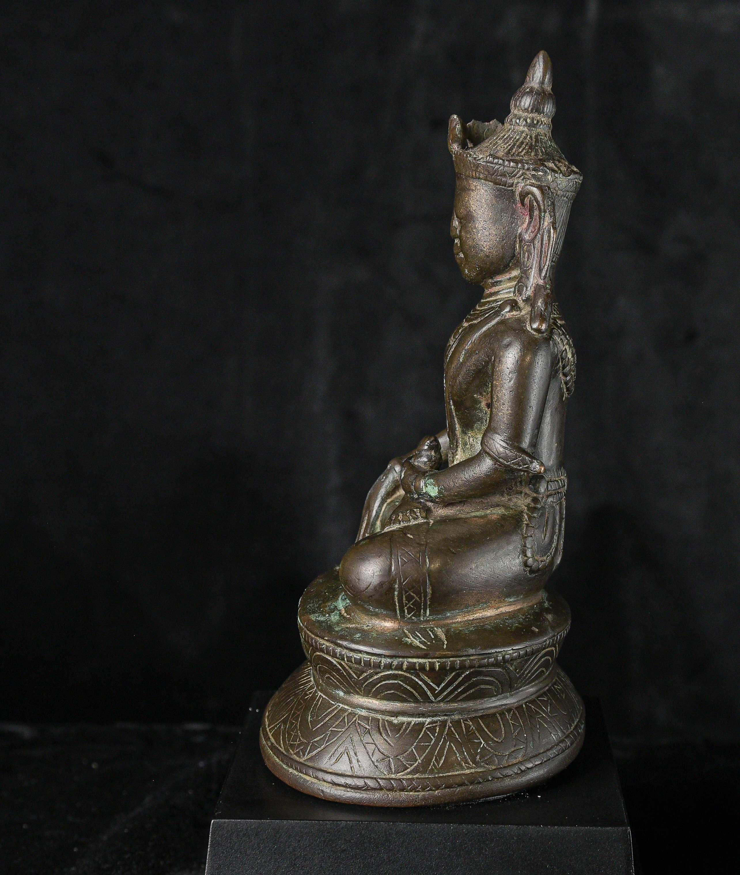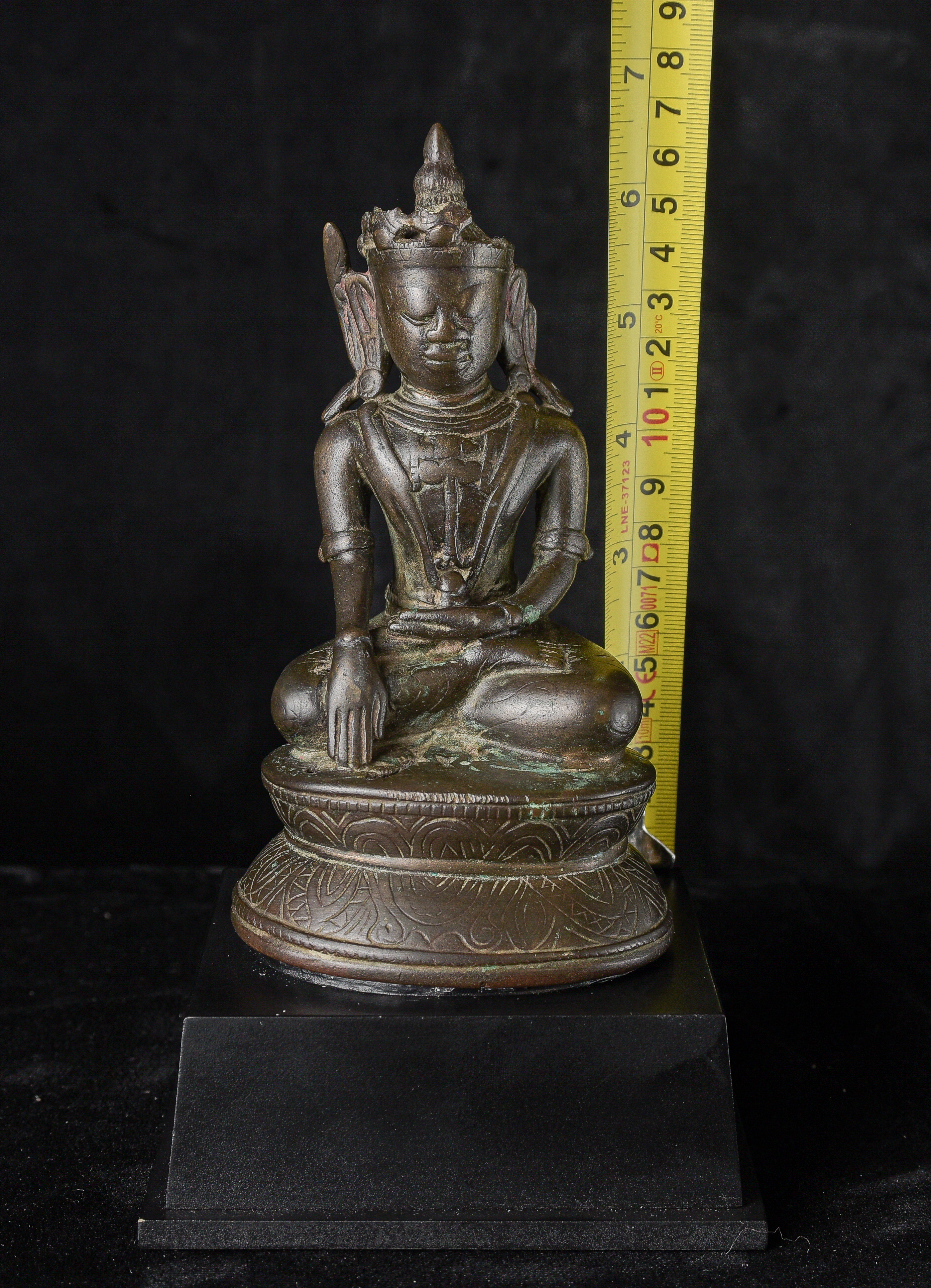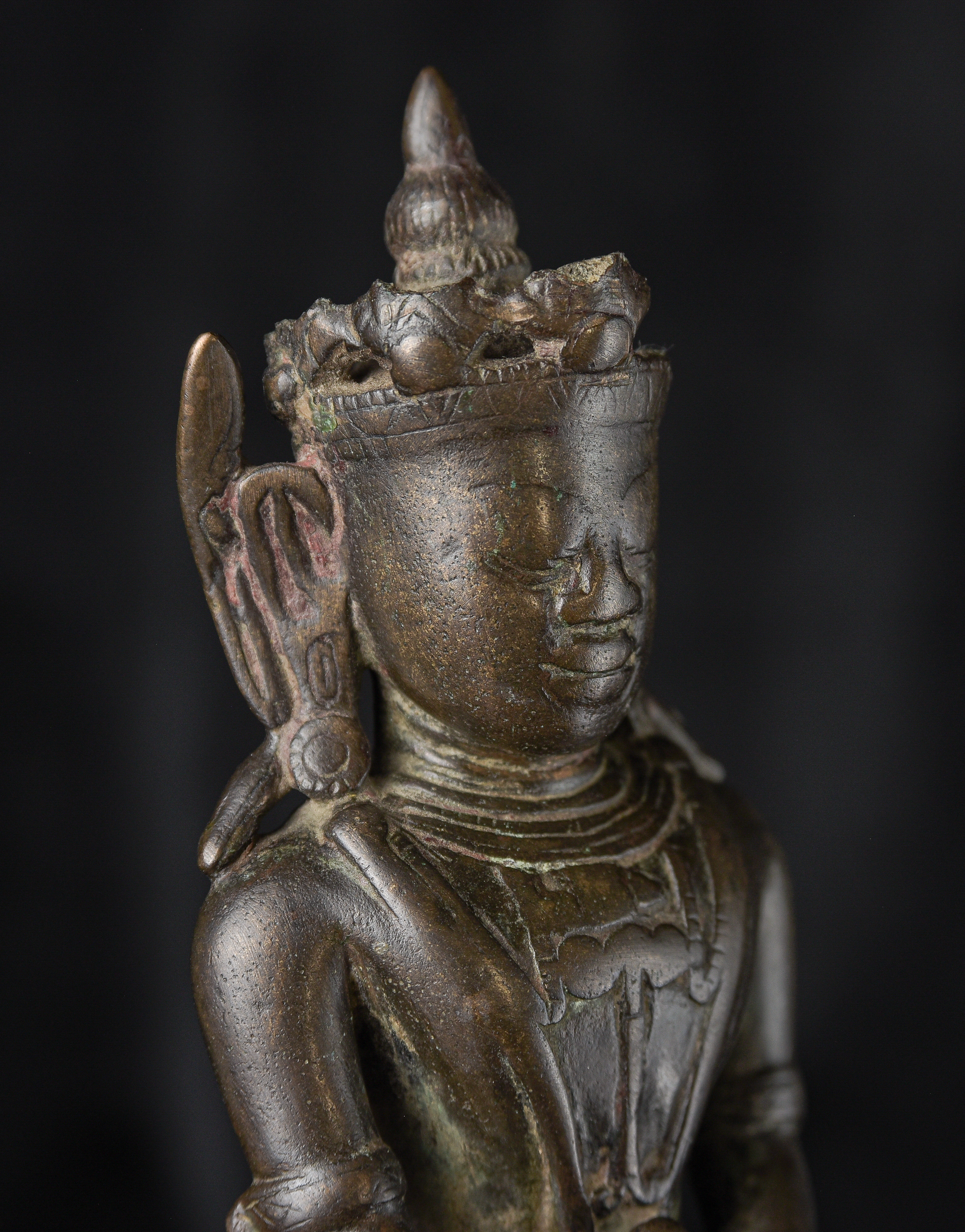 13/14thC Burmese Post Pagan/Early Ava /Arakan Buddha. Well cast, with a beautiful face- especially for this rare type, of which very few were made. A real collector's piece, especially in this quality. Missing part of crown on one side. It had the expected wear for a 700+ year old piece- otherwise it is in great shape. ( 6.75" H x 3.5"W x 3"D ) - 1.79lbs. - Base: ( 4.75"W x 1.75"H ). Mudeum worthy.