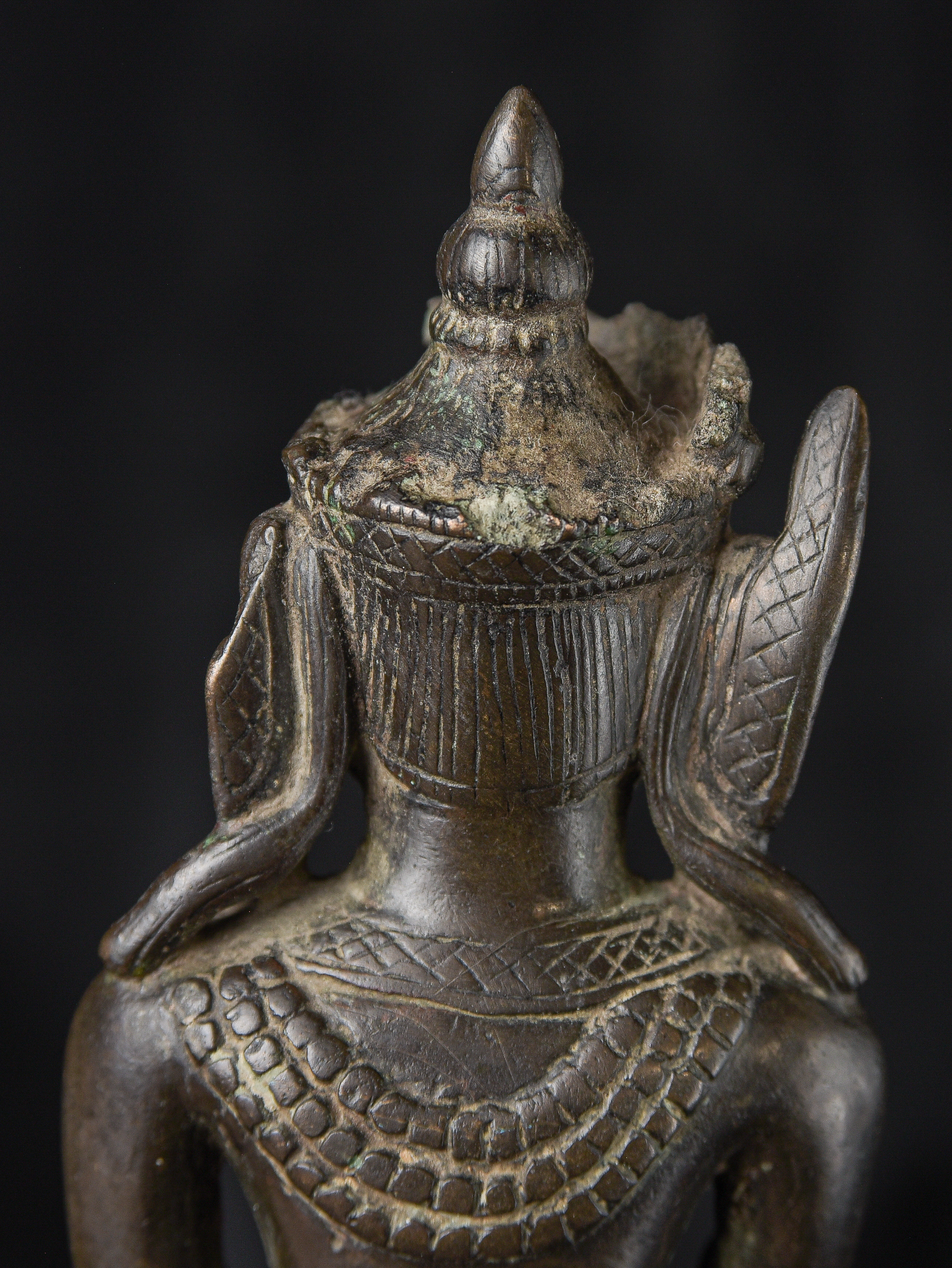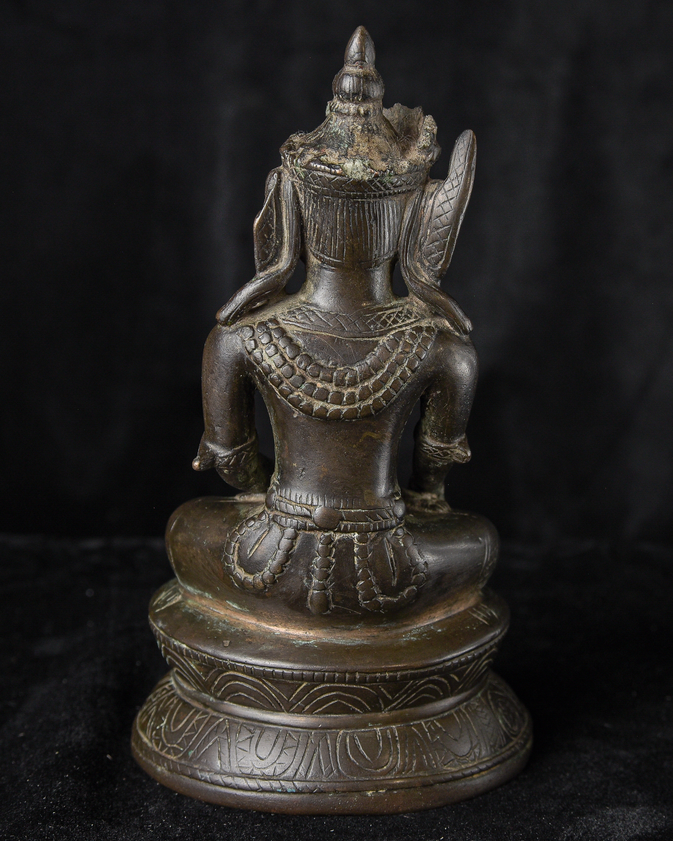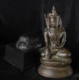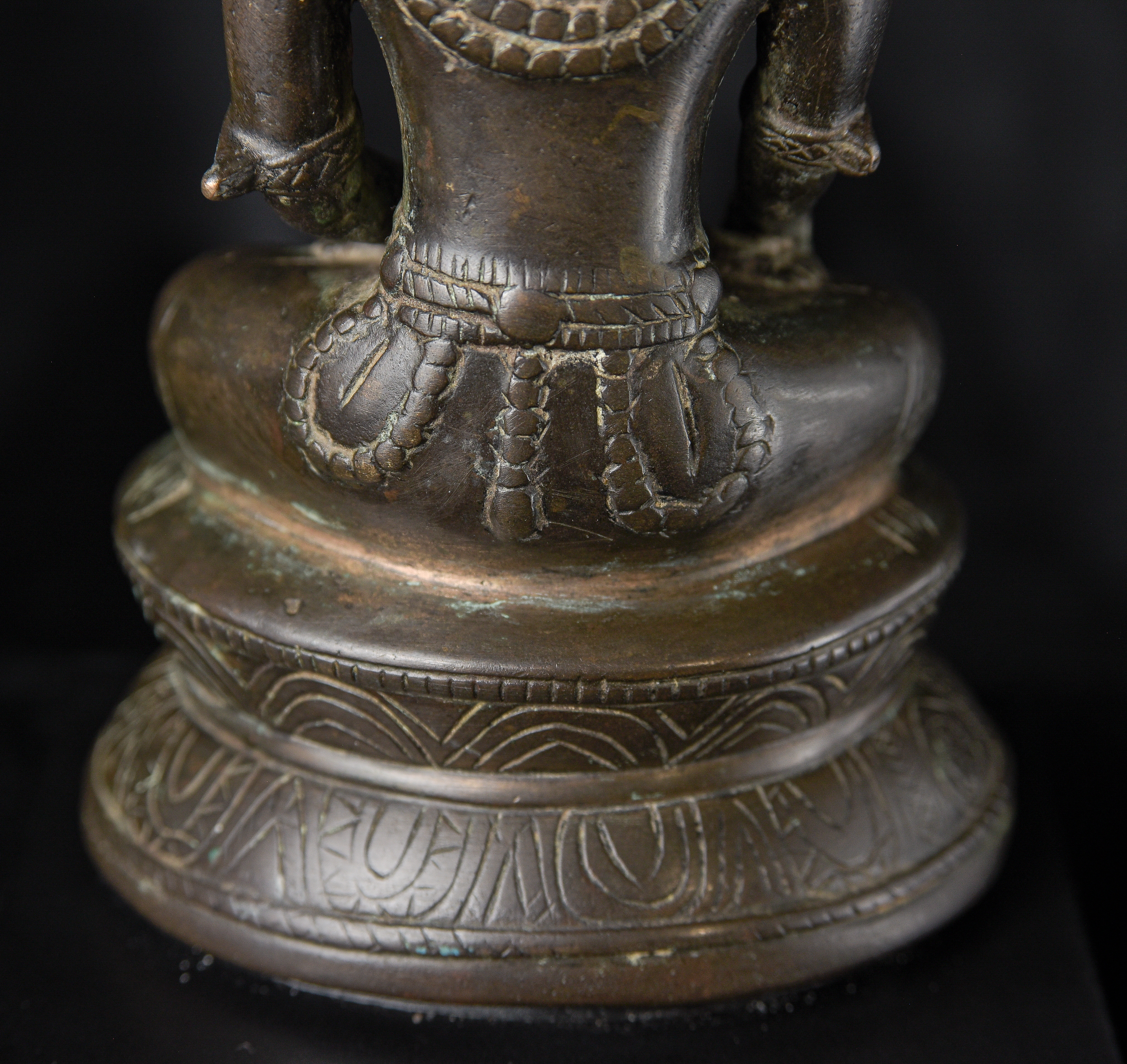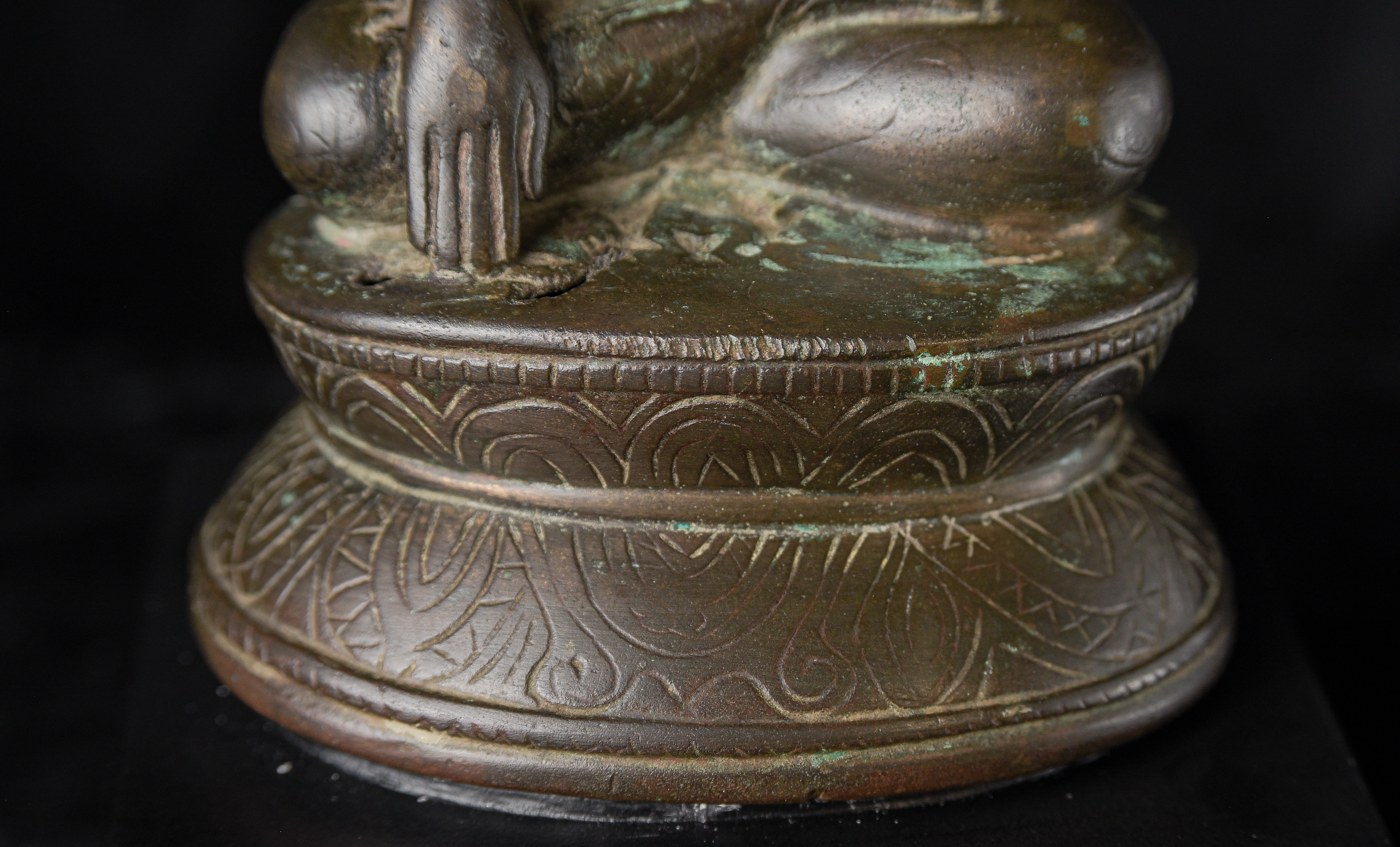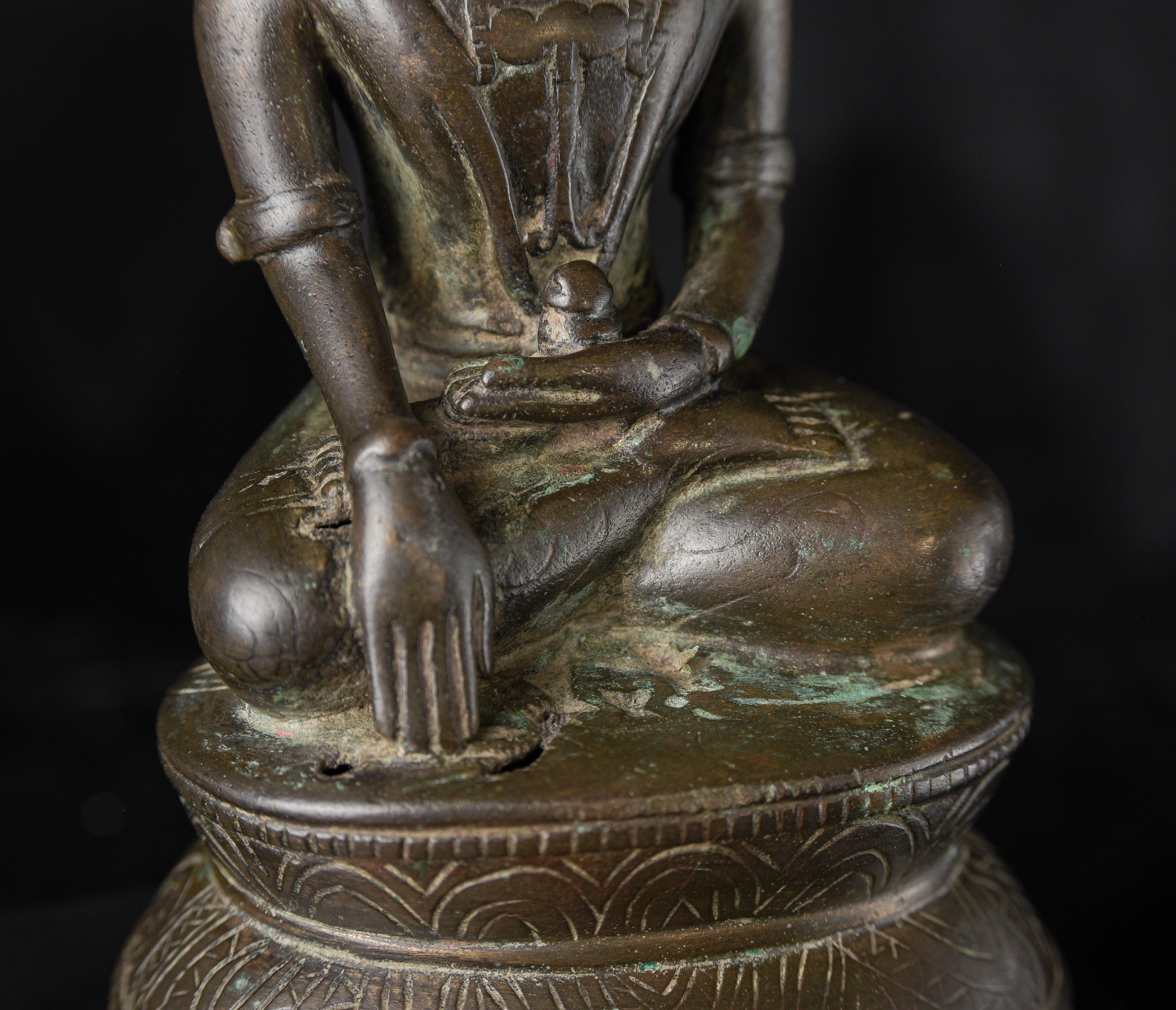 13/14thC Burmese Post Pagan/Early Ava /Arakan Buddha. Well cast, with a beautiful face- especially for this rare type, of which very few were made. A real collector's piece, especially in this quality. Missing part of crown on one side. It had the expected wear for a 700+ year old piece- otherwise it is in great shape. ( 6.75" H x 3.5"W x 3"D ) - 1.79lbs. - Base: ( 4.75"W x 1.75"H ). Mudeum worthy.