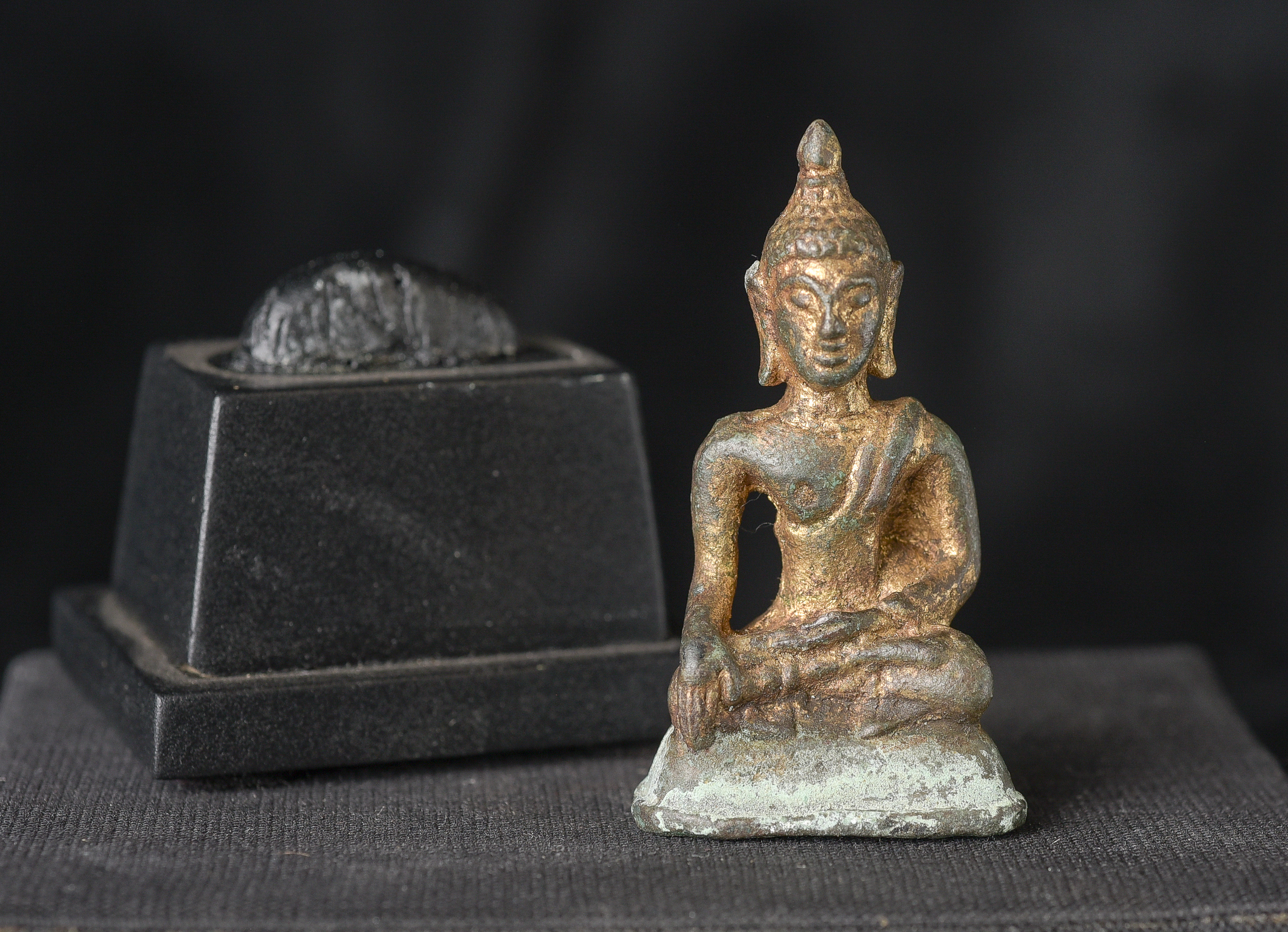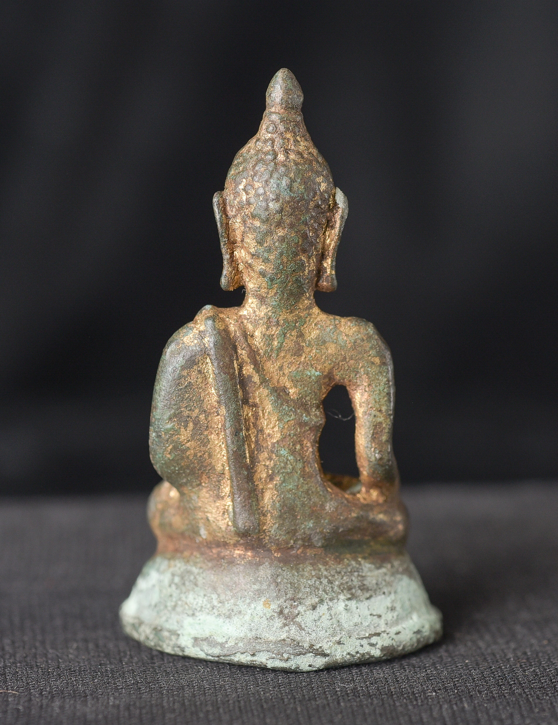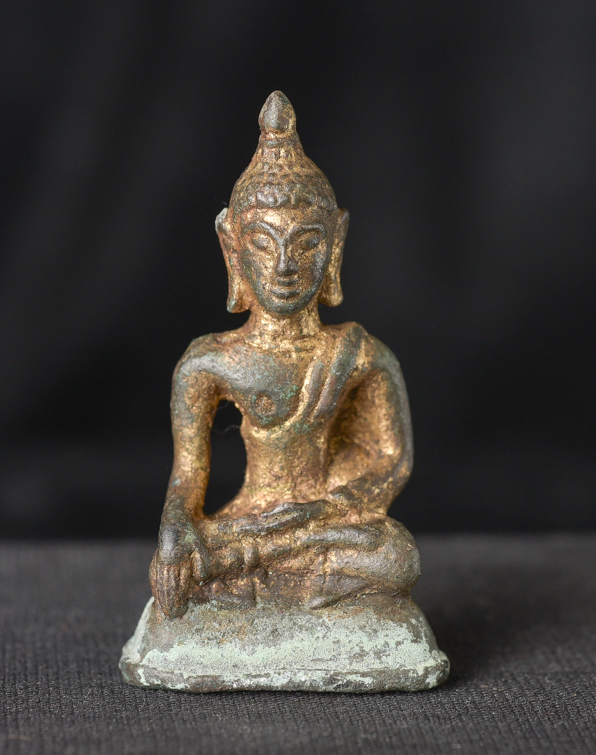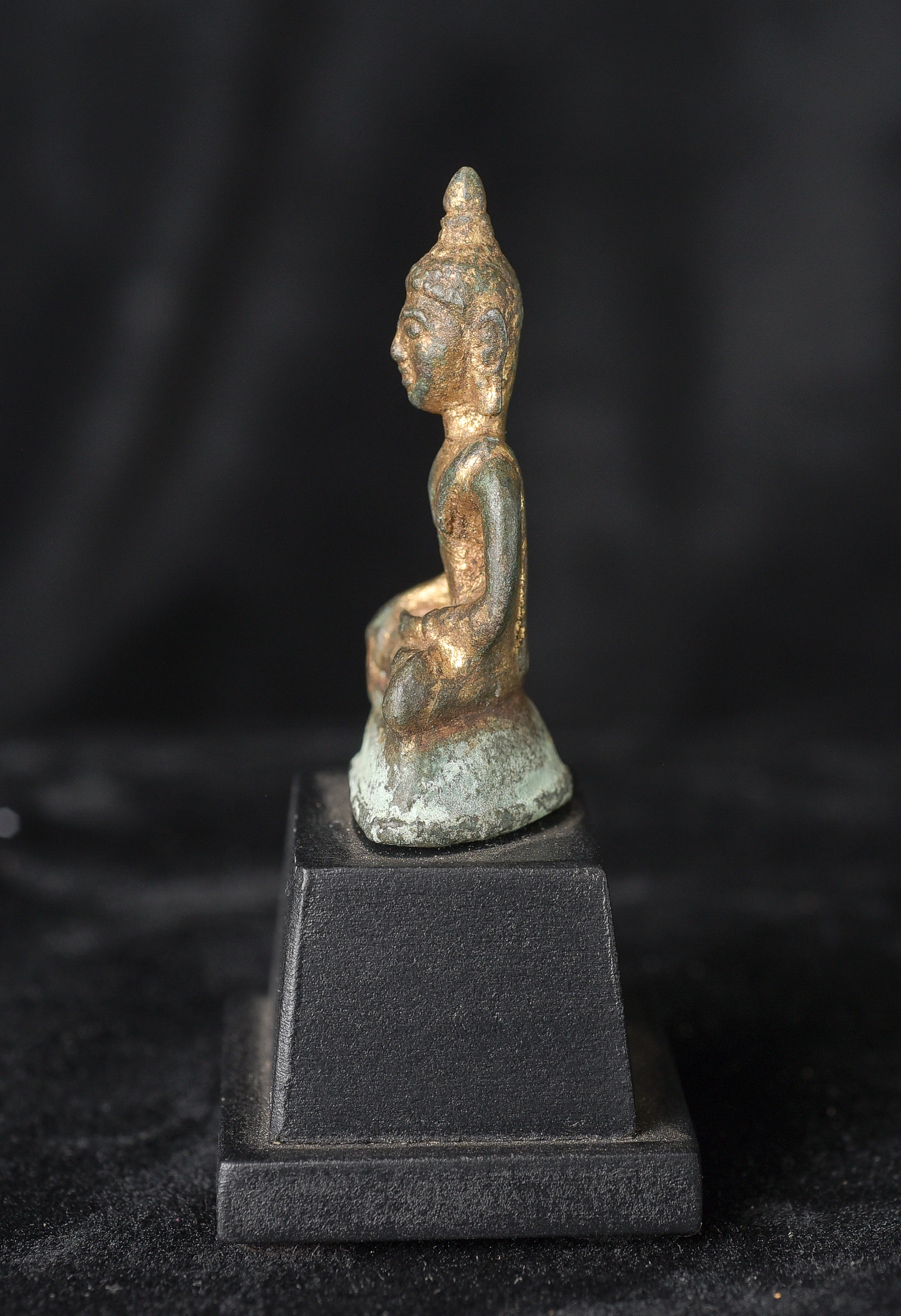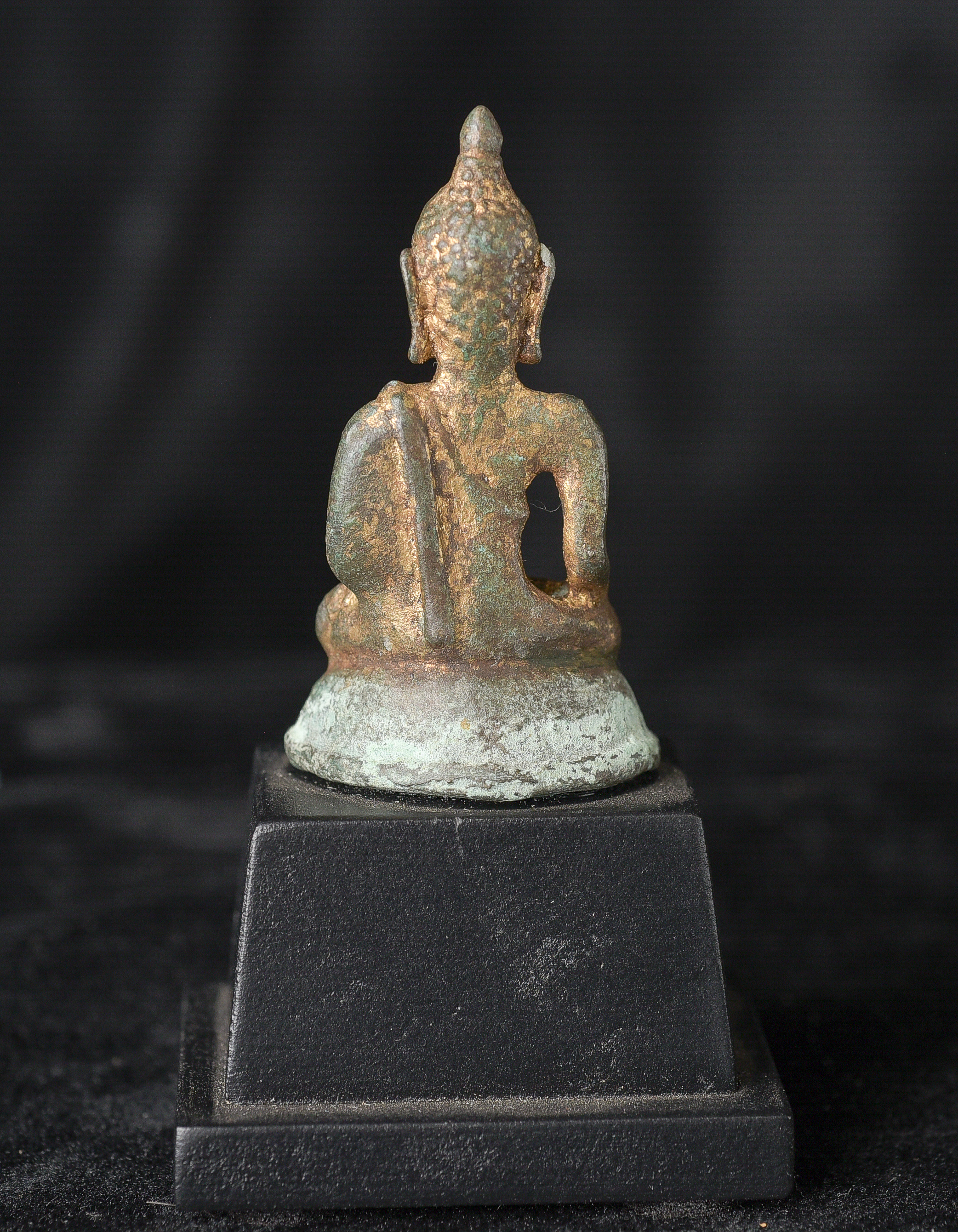Miniature Thai bronze Buddha. Appears to have very good age-likely 16/17thC or earlier. Very sweet at this rarely found size (I collected miniatures for 30 years and have been putting them up recently). 2 1/8" high, 3.25 inches on custom stand.