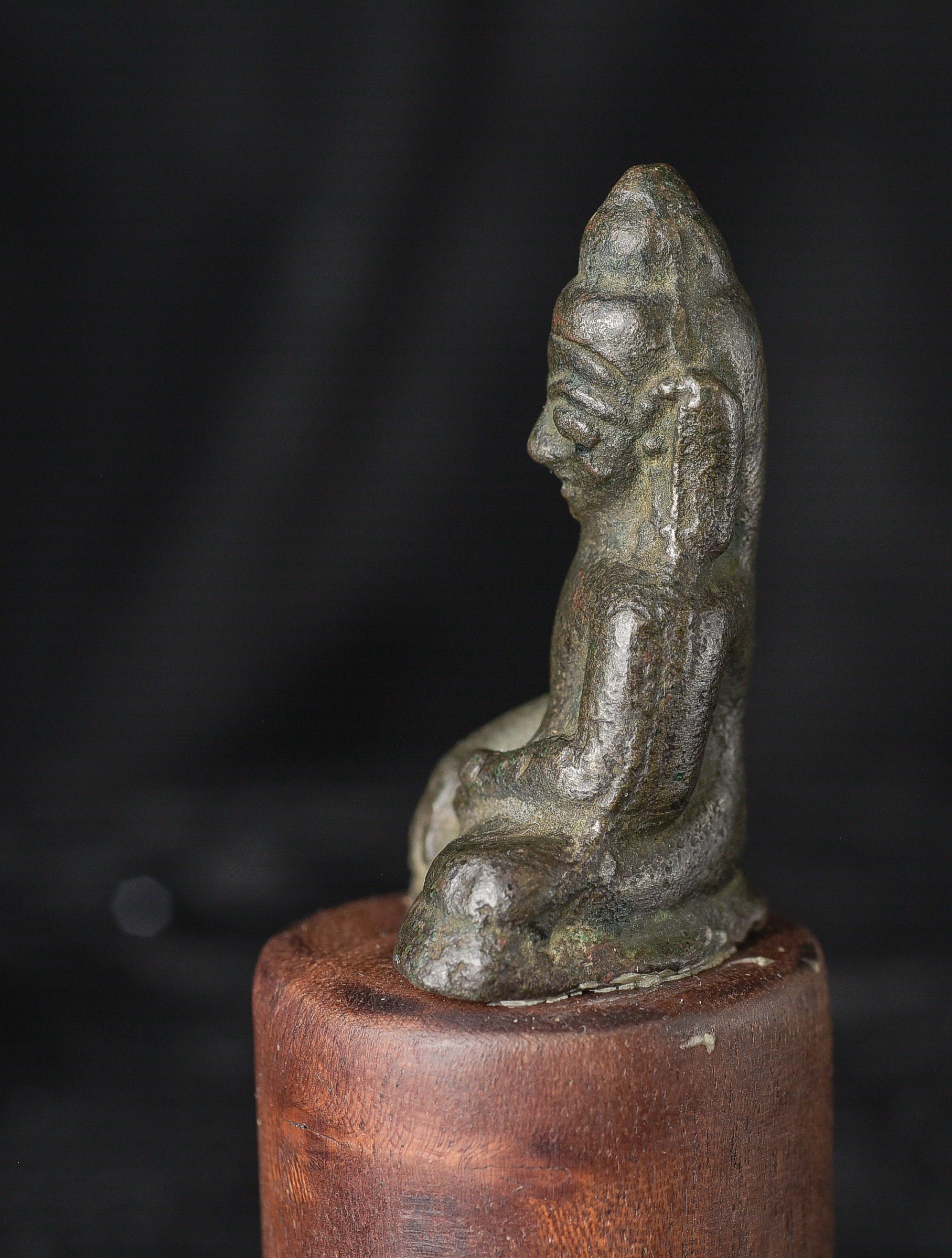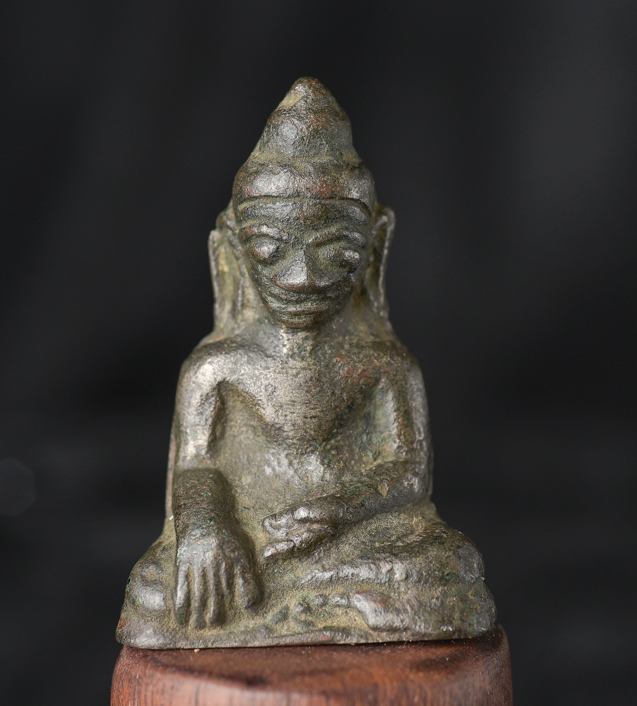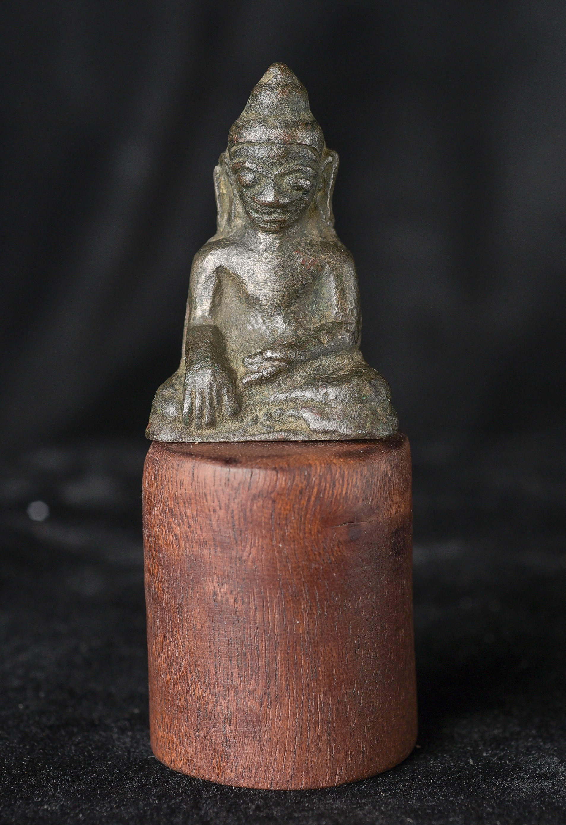 EARLY Burmese Mon Style Buddha. Probably has good silver content in the alloy. This type is rare in any size, especially with high silver in the mix. Buddha is 1.75" tall. Total height, including base, is 3.25".
