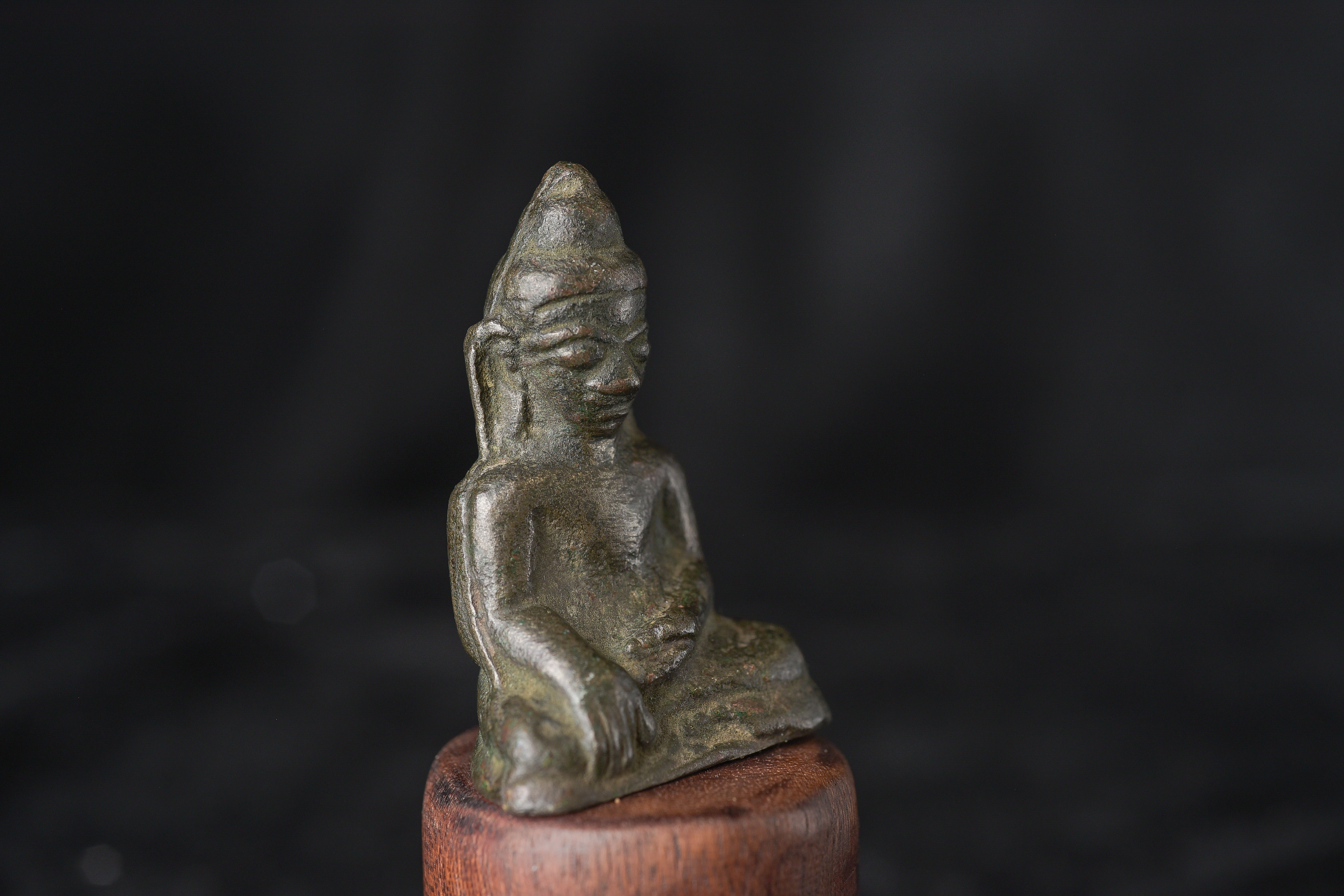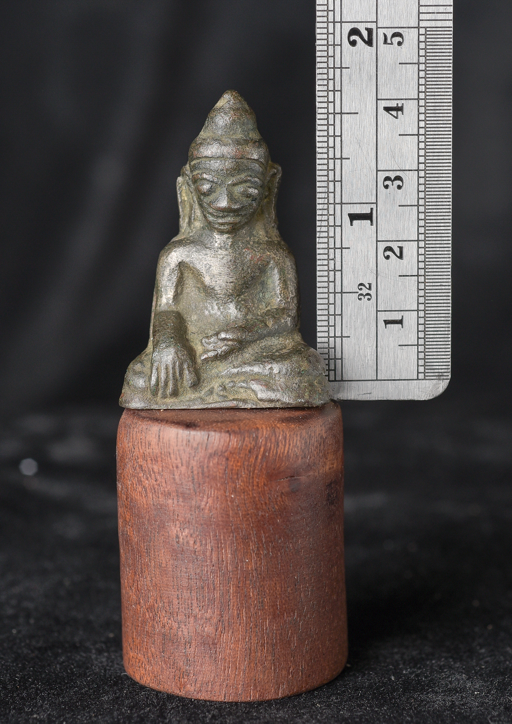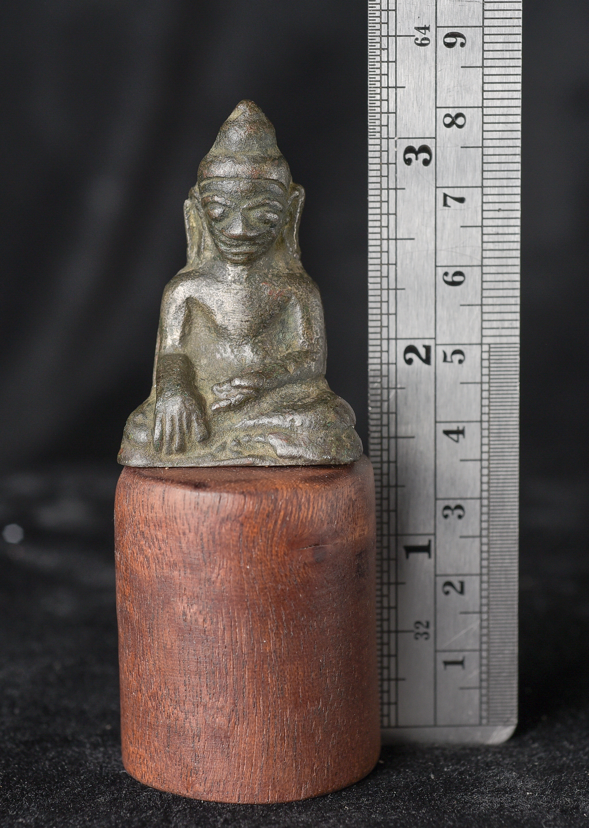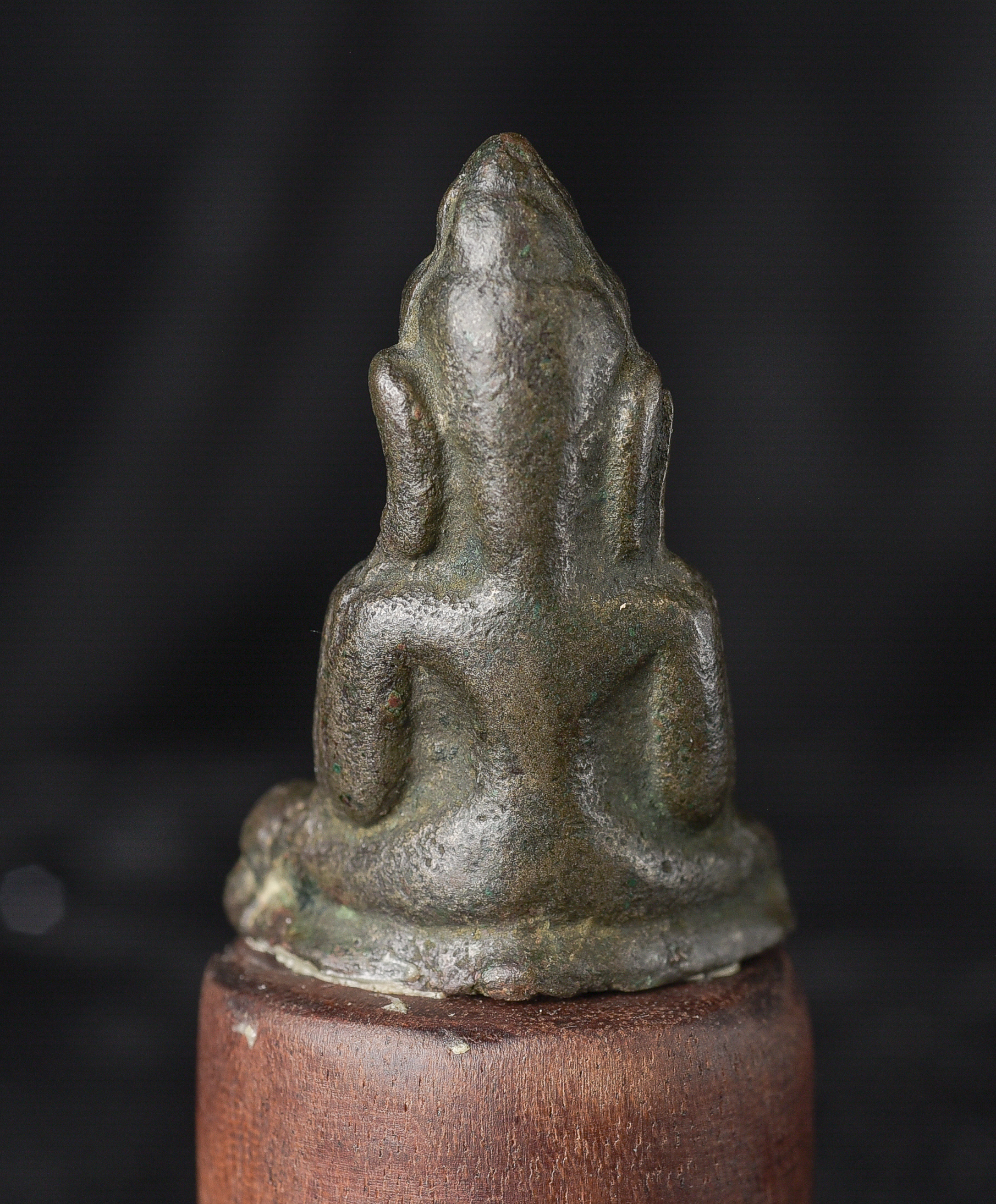 EARLY Burmese Mon Style Buddha. Probably has good silver content in the alloy. This type is rare in any size, especially with high silver in the mix. Buddha is 1.75" tall. Total height, including base, is 3.25".