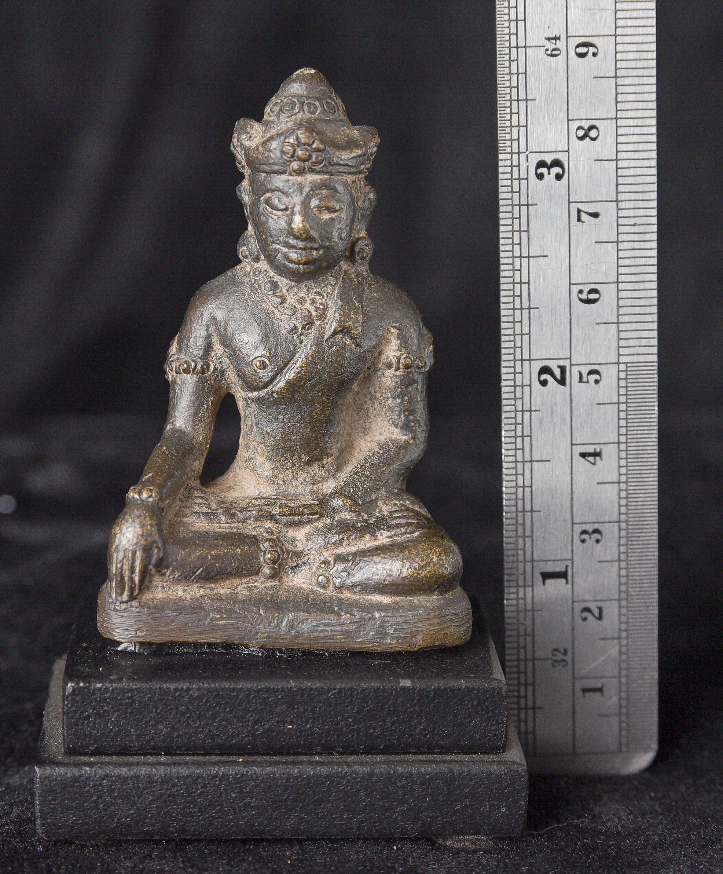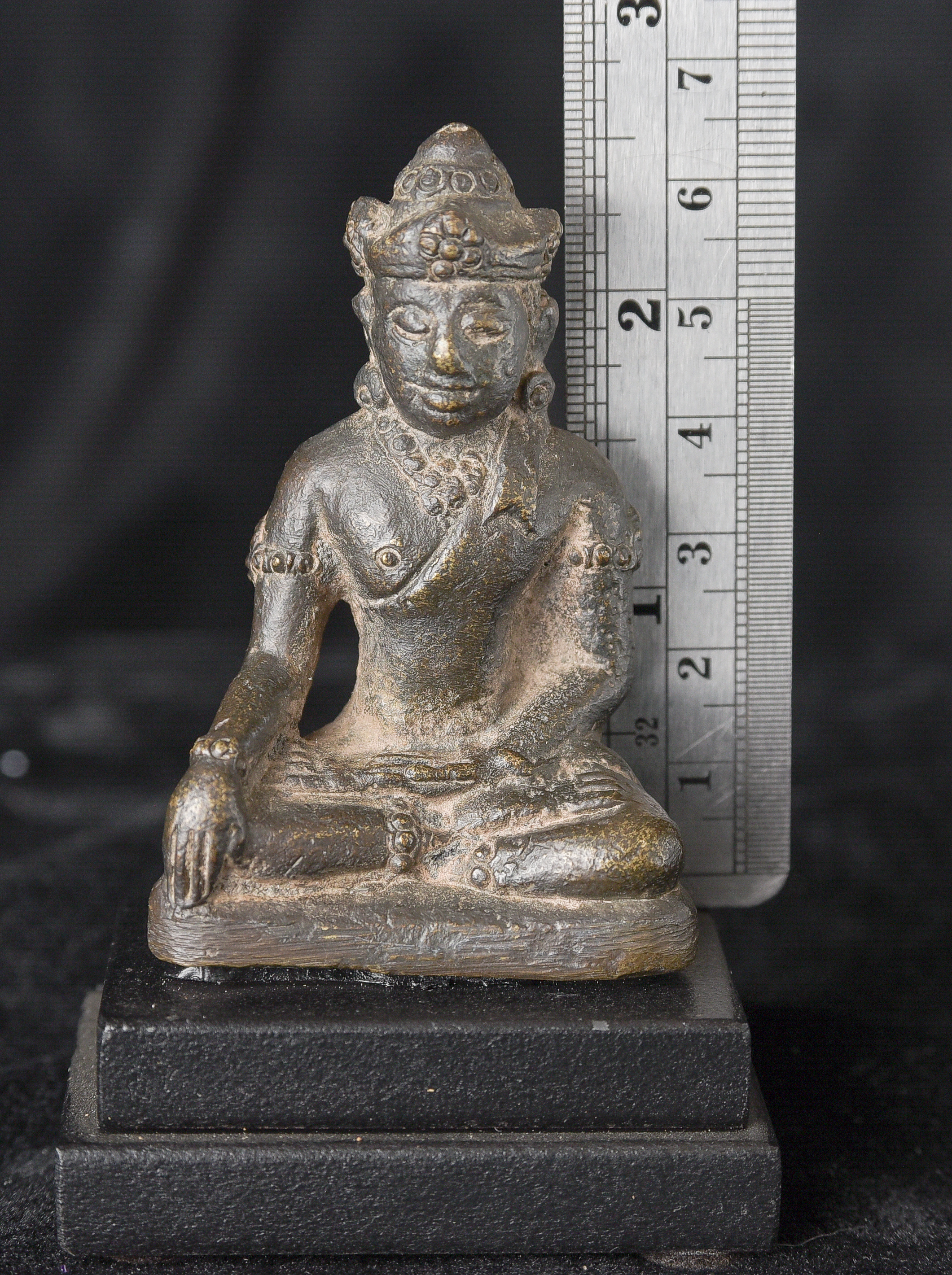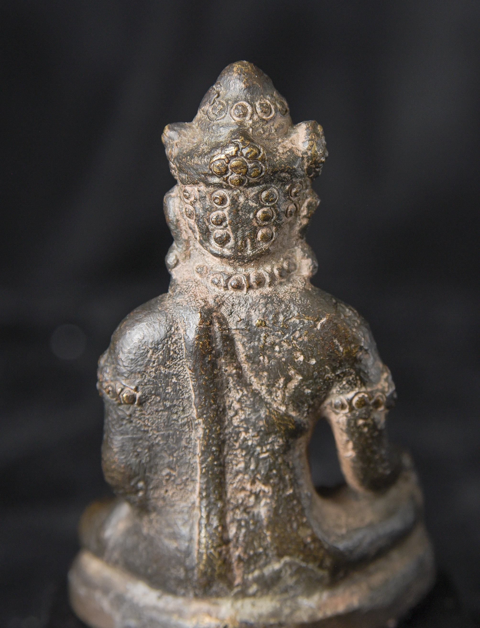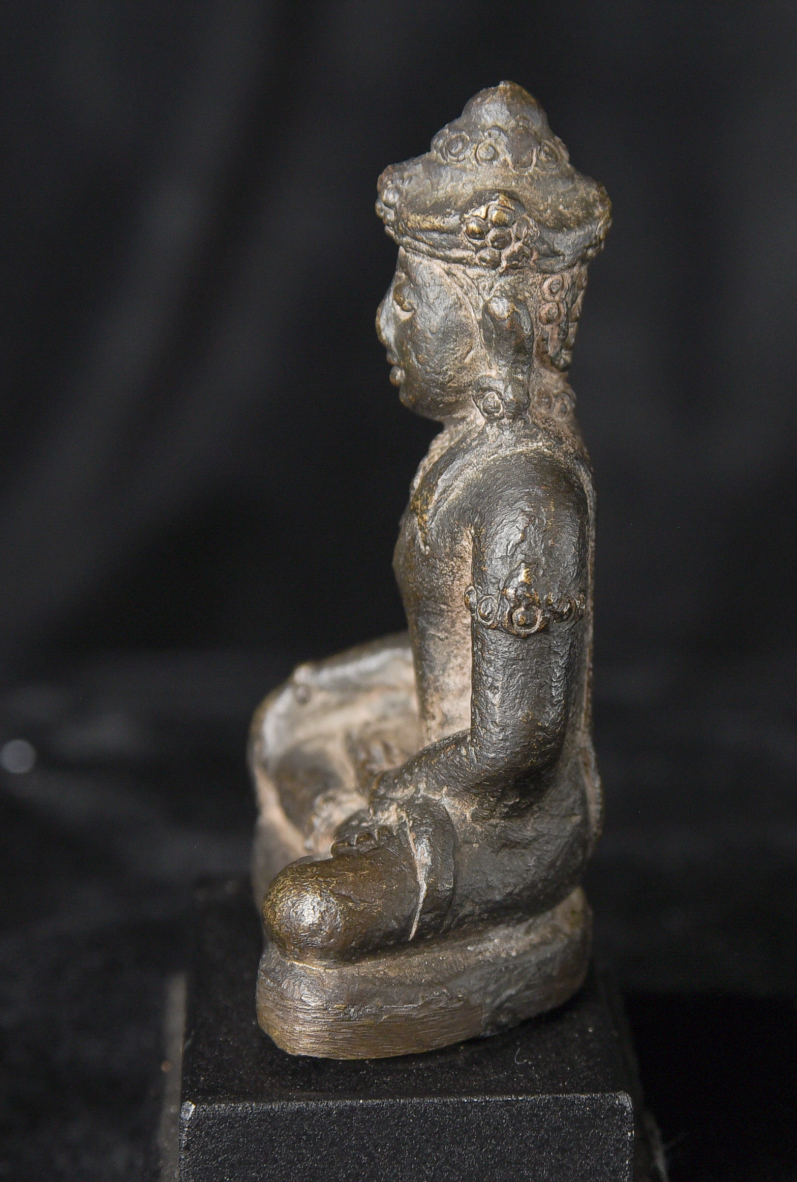 This is an uncommon and very lovely "Buddha in Royal Attire" from Northern Thailand. It is well sculpted, with a great patina, and a fantastic face. Sits only 2-5/8 inches tall, but looks great no matter how large you blow up the photos. The height on the custom stand is 3-3/8 inches. It was previously cemented into a different base and had to be chipped and filed to get it out. As a result, the bottom 1/4 inch of the base has a different look to the surface.