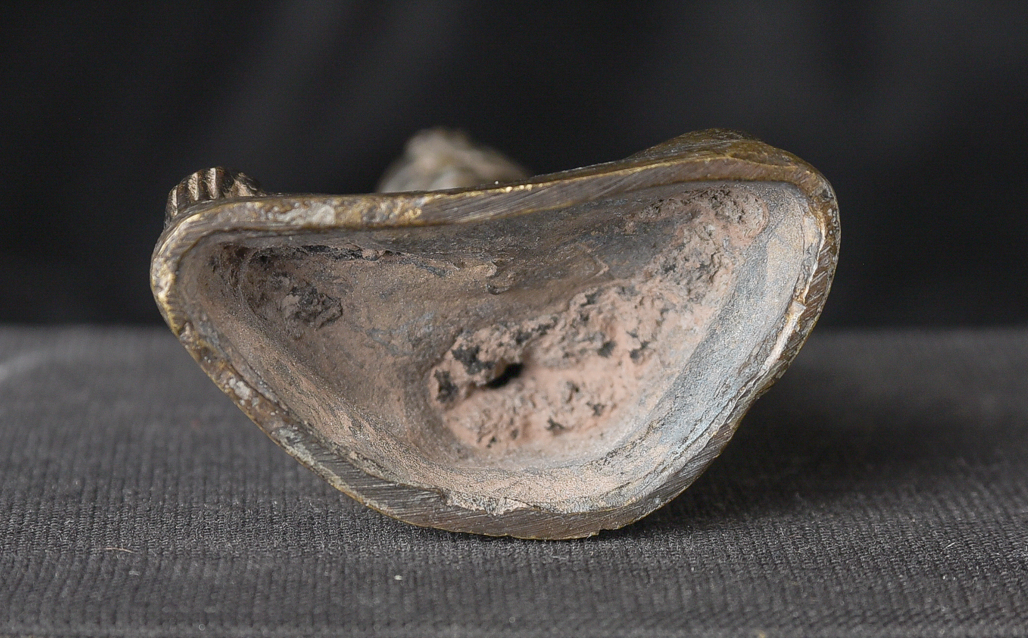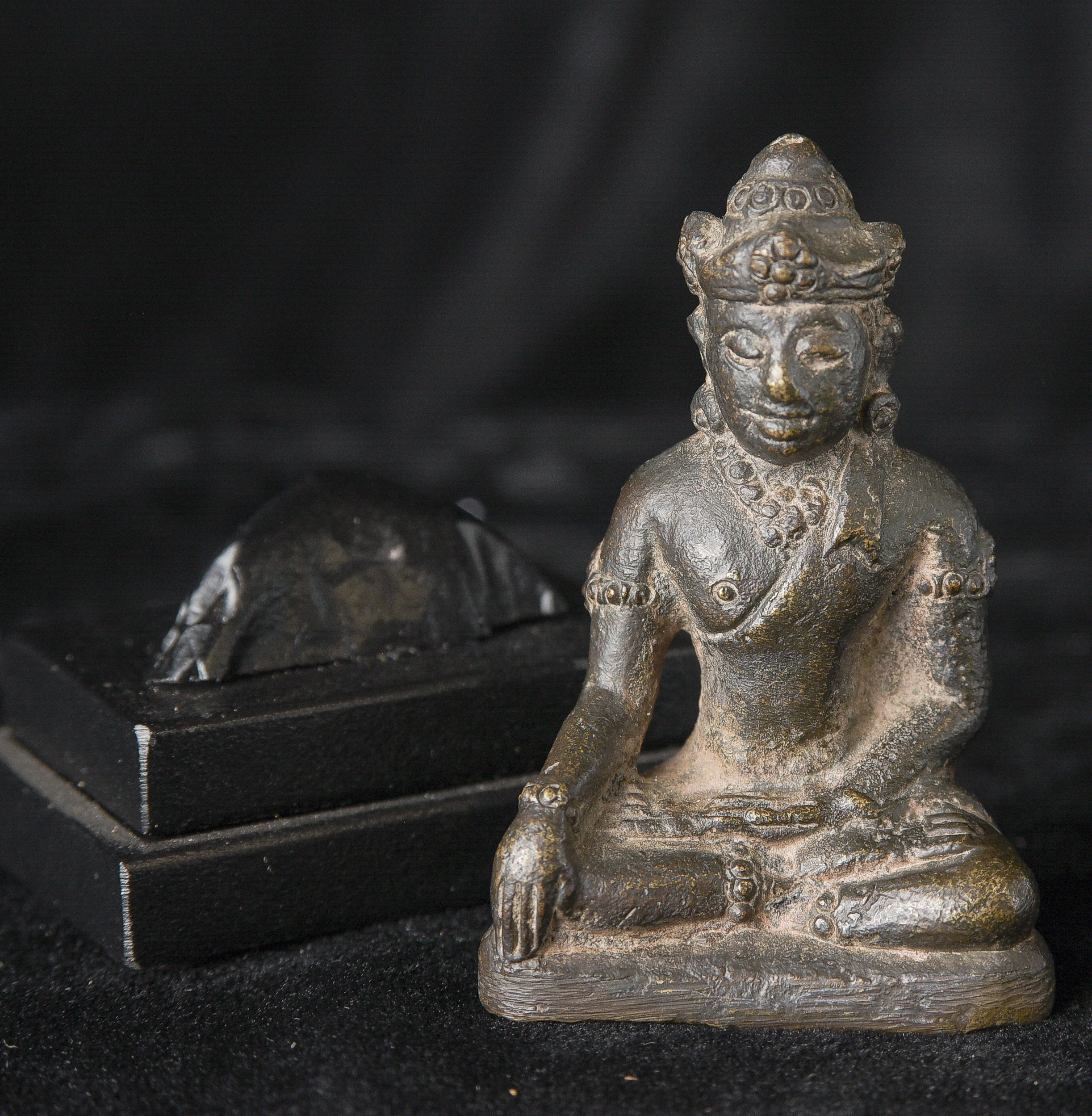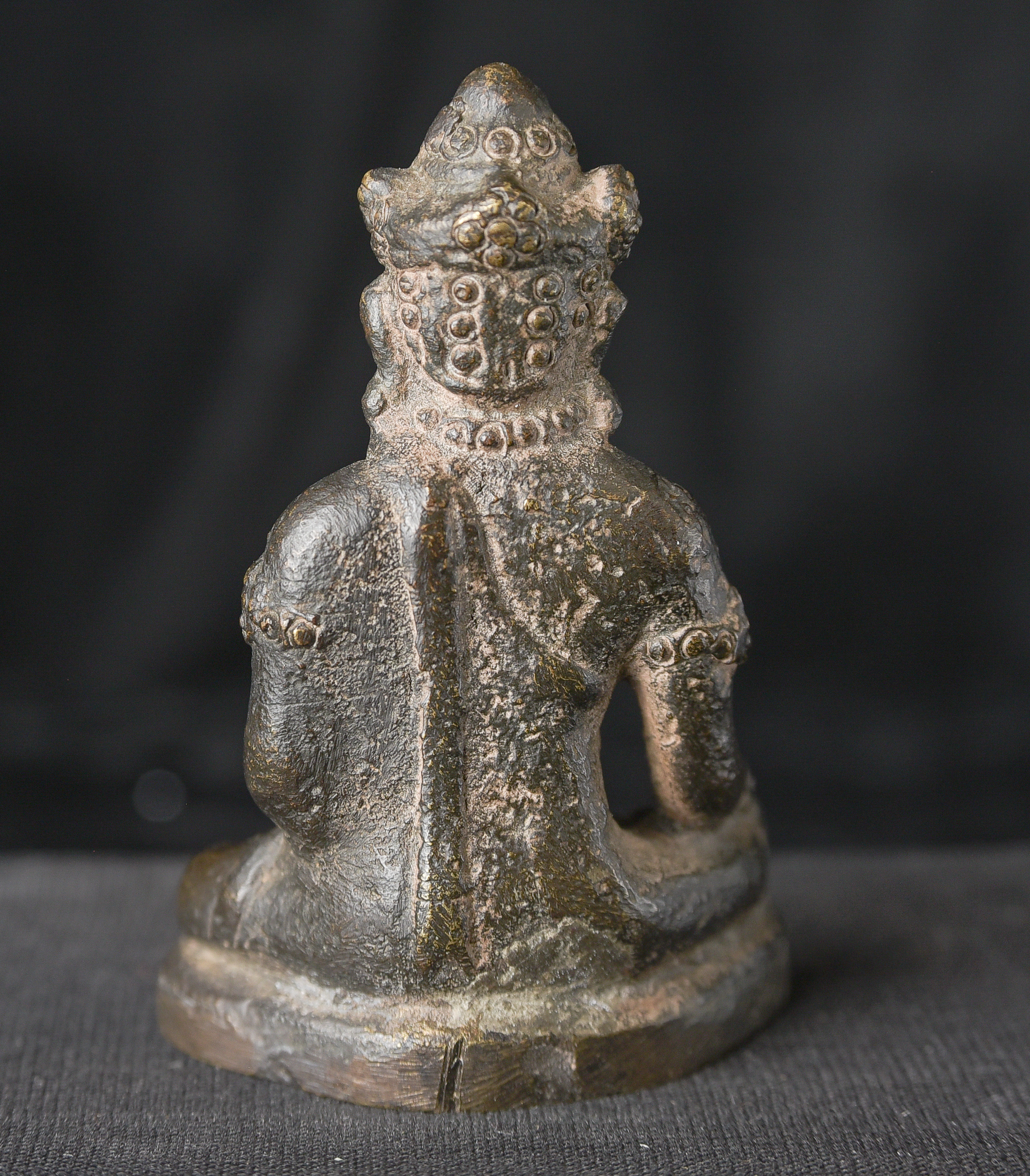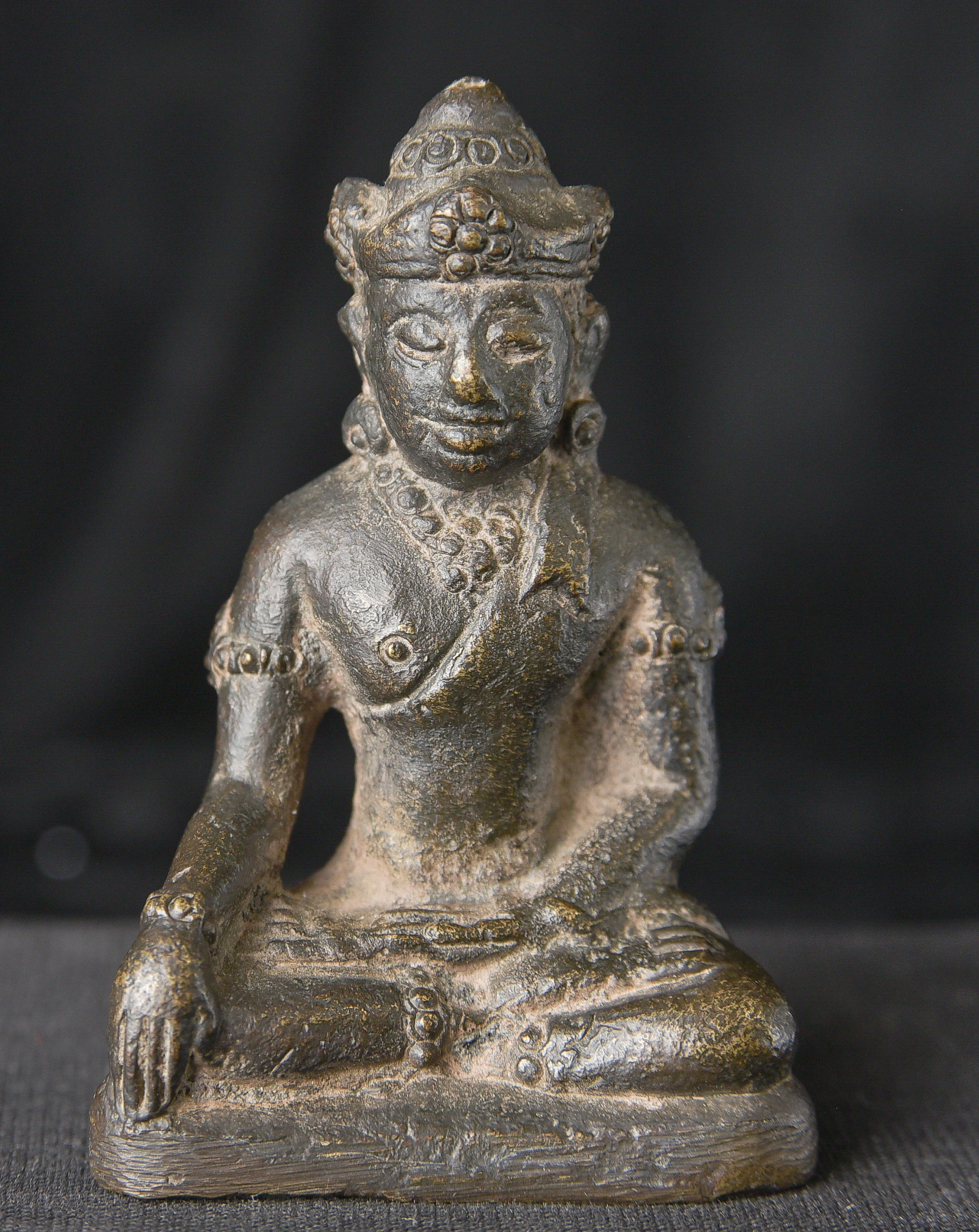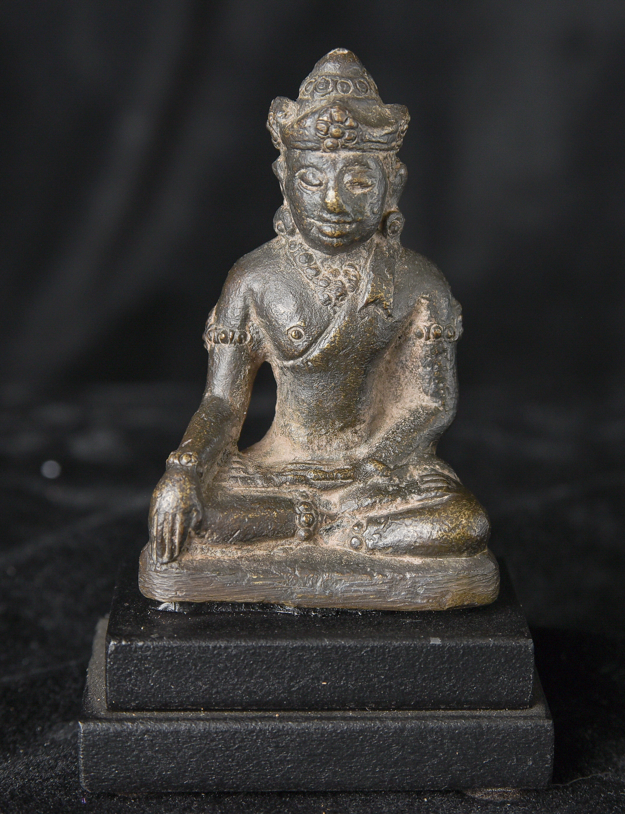 This is an uncommon and very lovely "Buddha in Royal Attire" from Northern Thailand. It is well sculpted, with a great patina, and a fantastic face. Sits only 2-5/8 inches tall, but looks great no matter how large you blow up the photos. The height on the custom stand is 3-3/8 inches. It was previously cemented into a different base and had to be chipped and filed to get it out. As a result, the bottom 1/4 inch of the base has a different look to the surface.