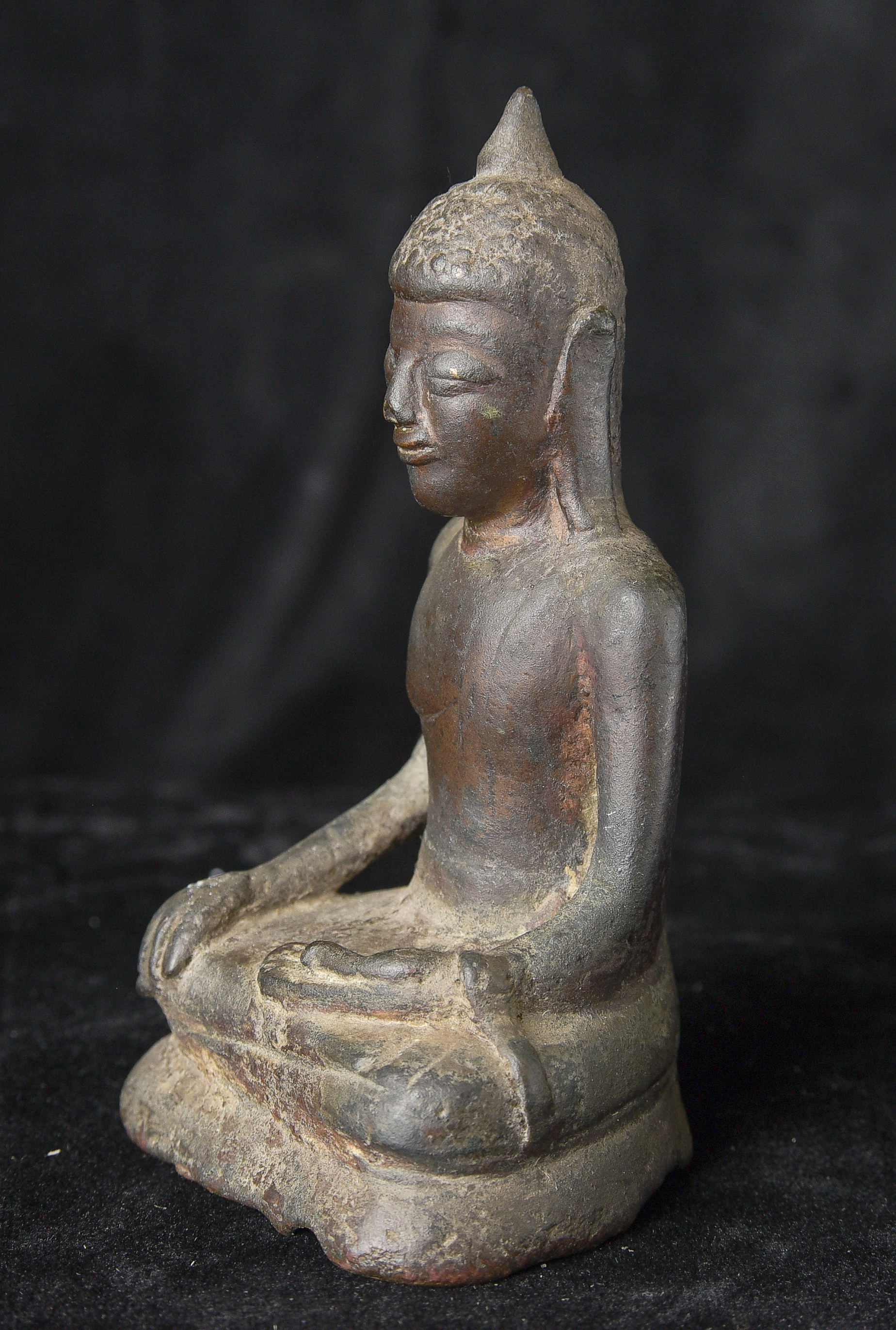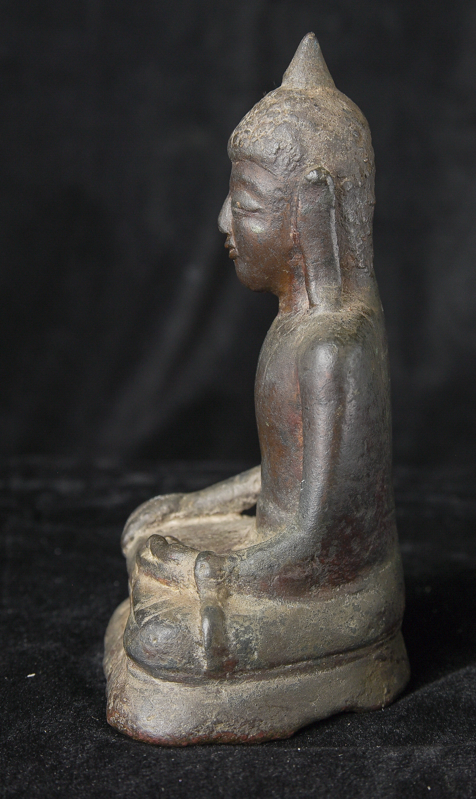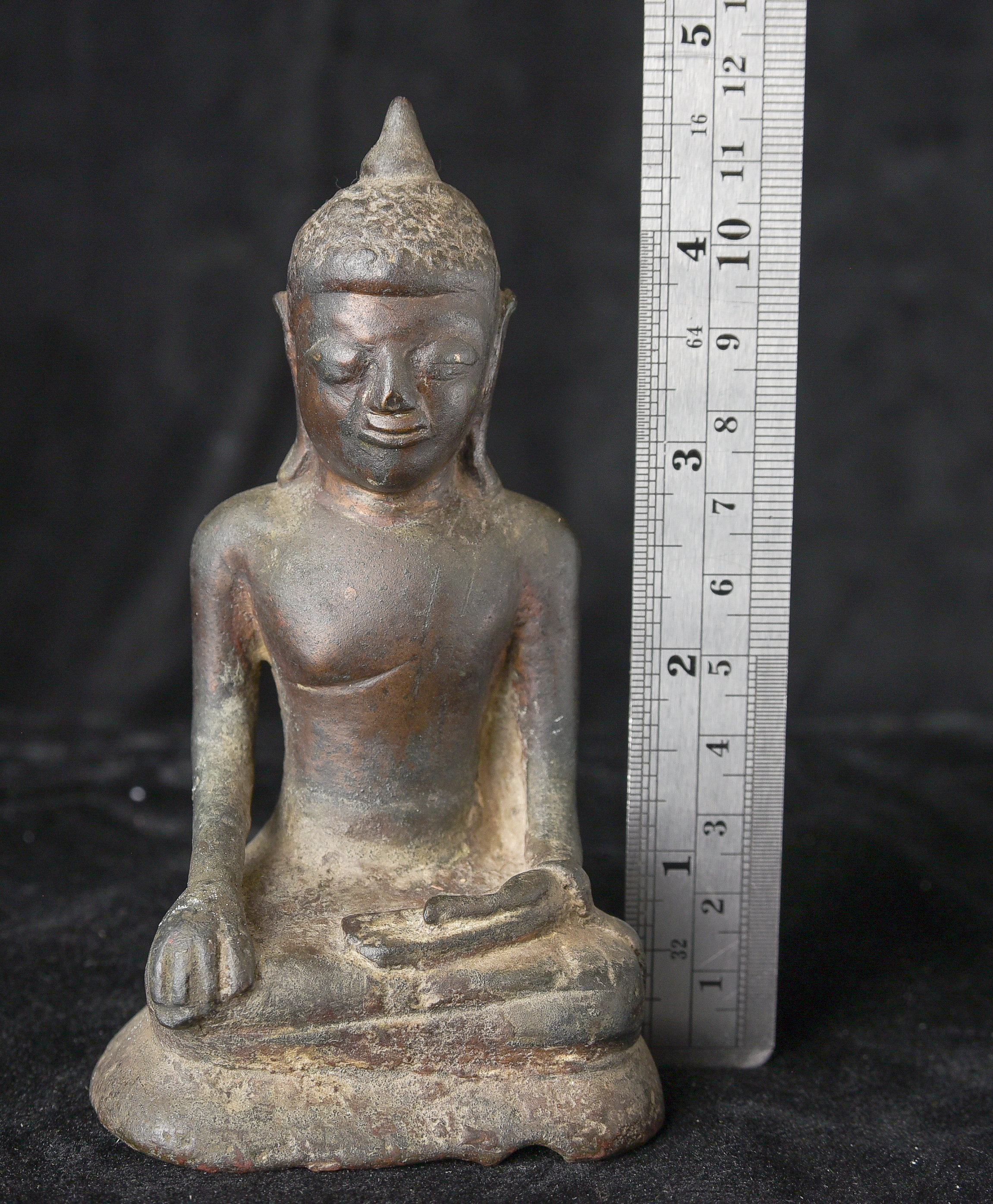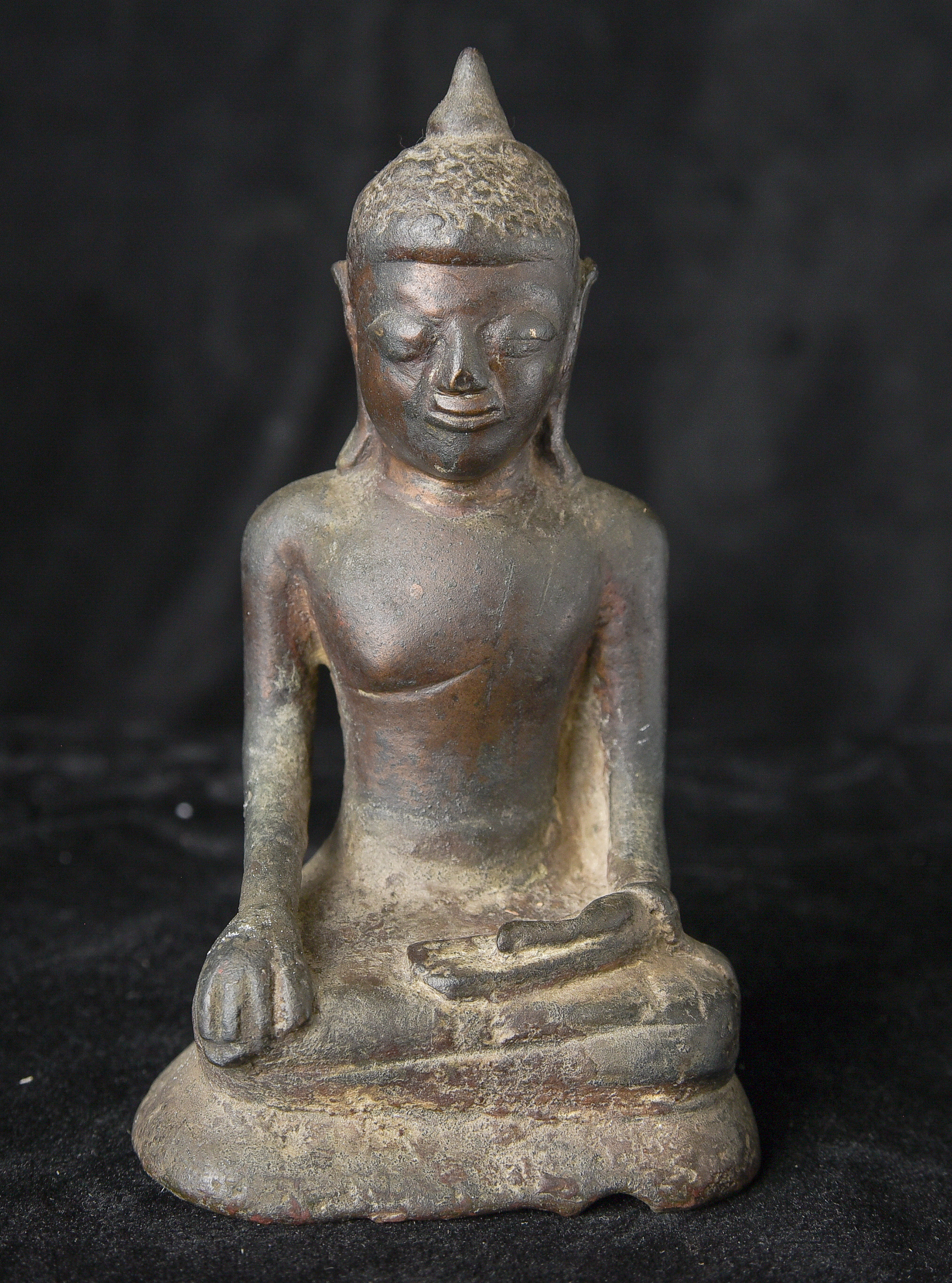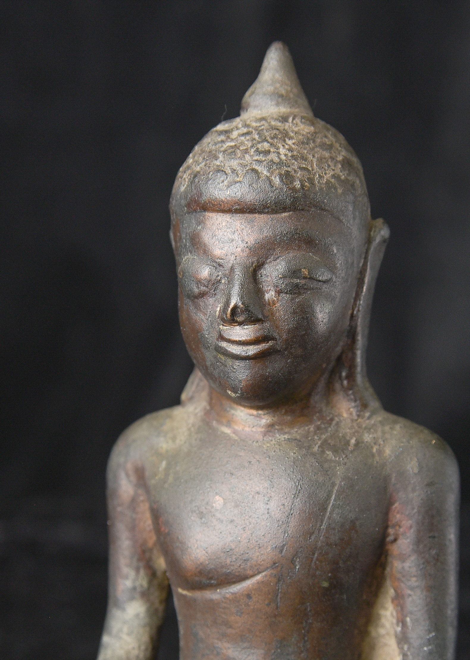 17/18thC Cambodian Buddha. Sweet face. Good condition-has a ding on the nose. Radiates joy, equanimity and contentment. Special. shows influences from different tribal groups and cultures. At first, I thought it was from Burma, but after spending time with it, I now believe it is 17/18 century, or possibly a little earlier, from Cambodia ( 4.75"H x 2.75"W x 2.25"D ) - 465g.