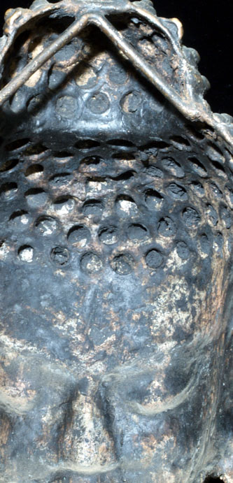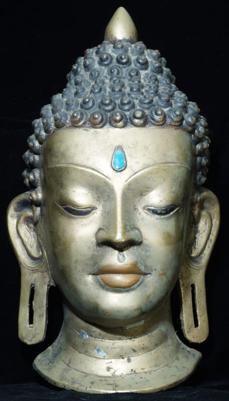 Extraordinary India/Nepal head, unlike any other I have seen. Thickly cast in a lost wax method, which is not how Buddha masks are typically made. The lips are copper and the eyes are silver. I bought him quickly, believing he was not very old, As I studied him I have come to believe that he has age to him(look at the back and at the oxidation, and step back and get the overall feel). I do not know how to give him a precise date. He is very large at a full 14.5 inches tall by 7.75 inches wide- he is larger than life. He is quite heavy at 8.5 pounds. He has an incredible countenance. Special.