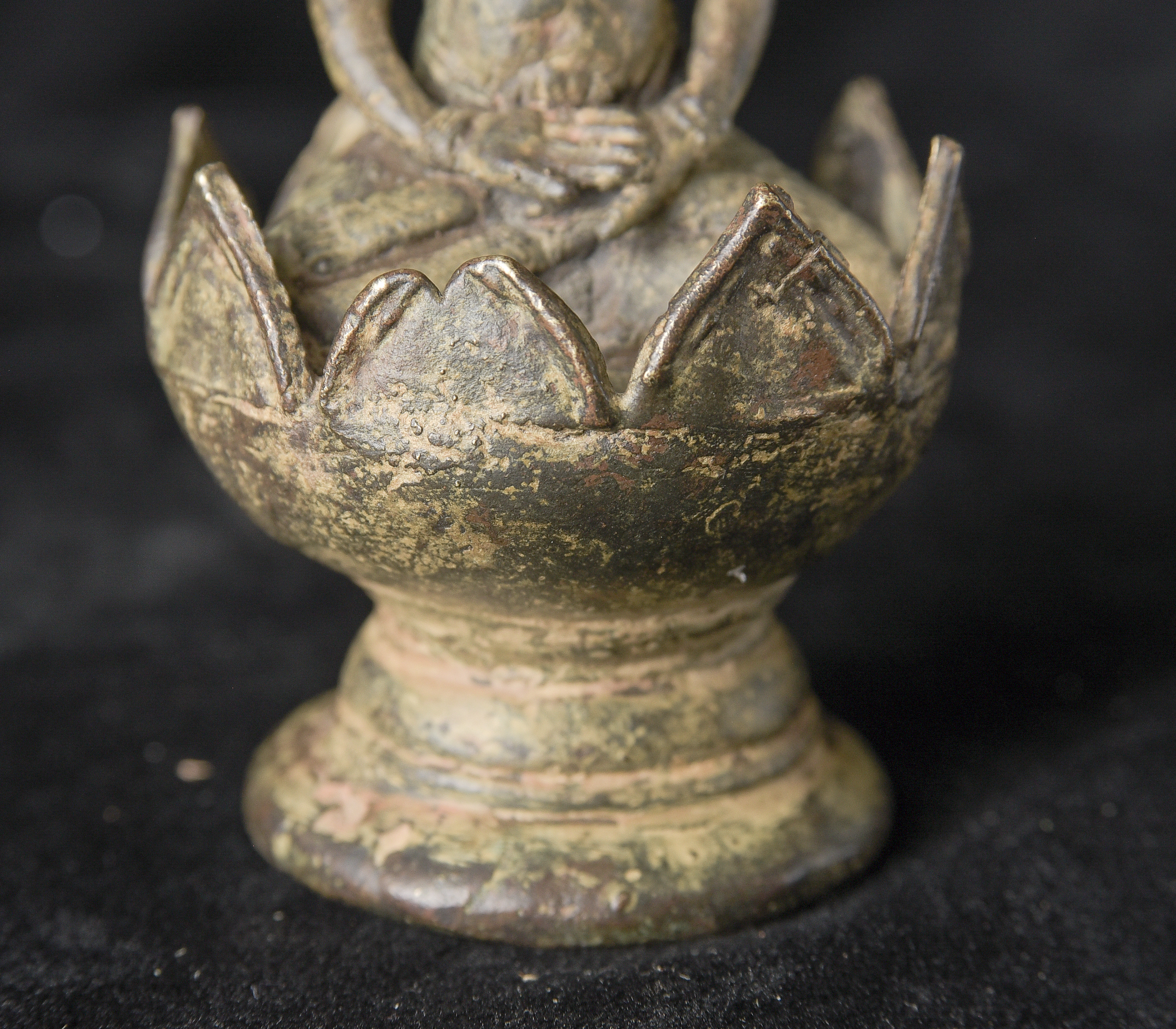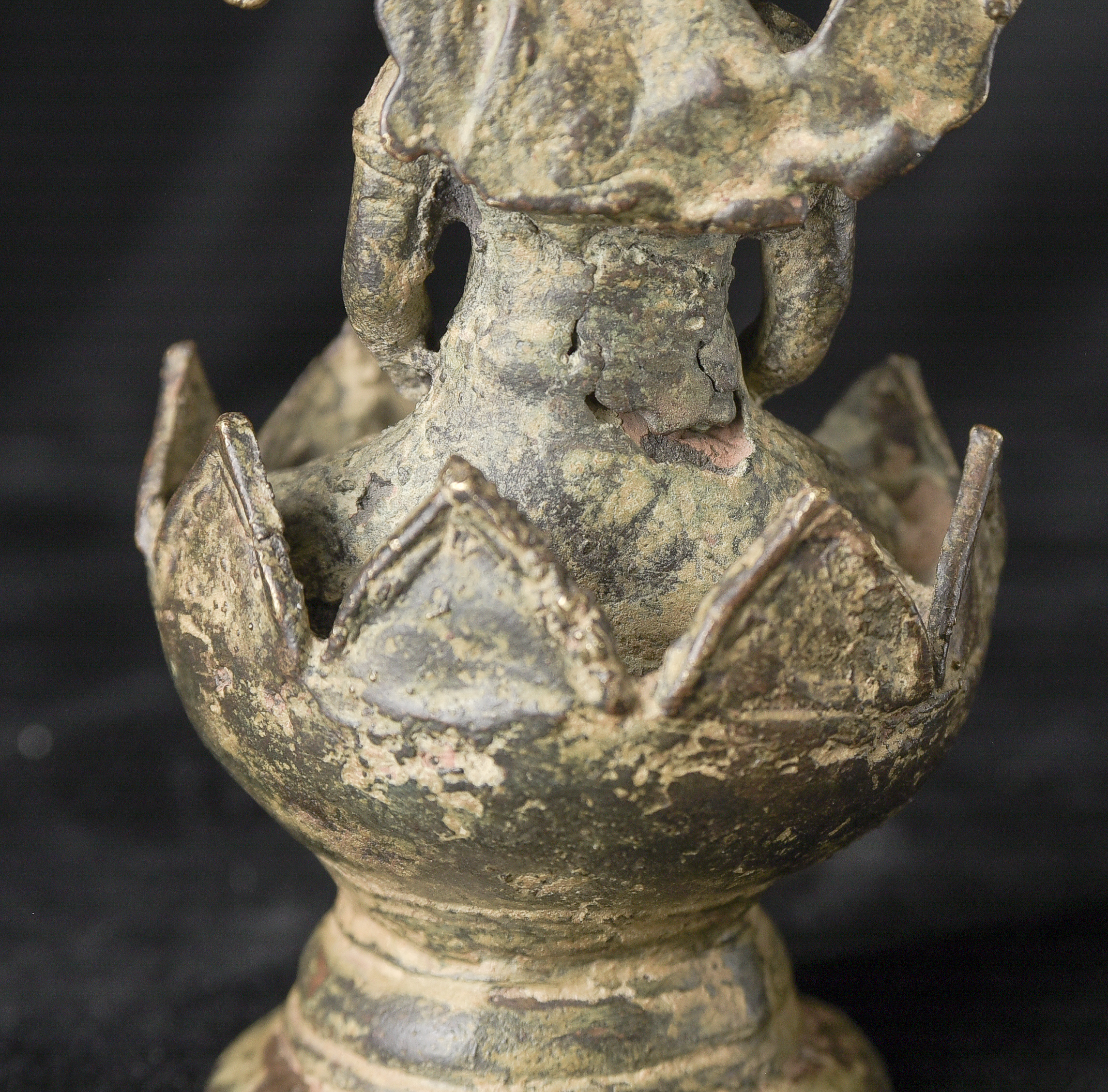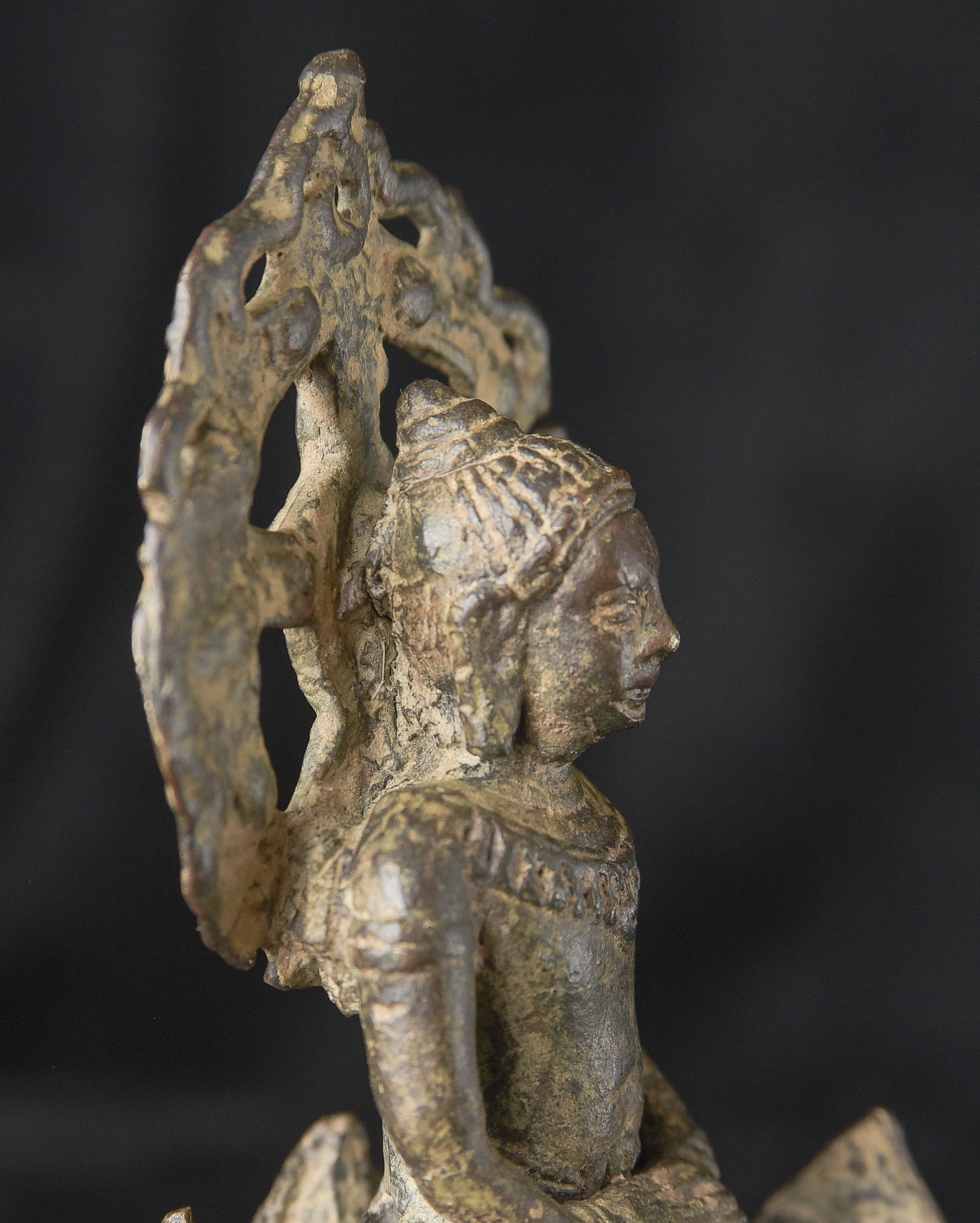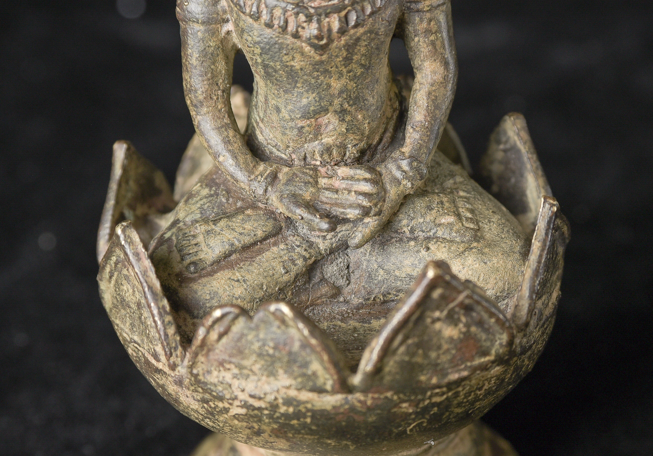 Deeply serene, unusual Java Buddha, 14th-17th Century or earlier. This is a very uncommon type. I have seen three of this type in 30+ years of searching. The last photo in the series shows two similar pieces, items 6647 and 6774. I used to believe these were Burmese, but research shows they are more likely from Java and older than I had originally thought. Domestic Packing and shipping are included. (5"H x 2.25"W x 2"D ) - 315g.