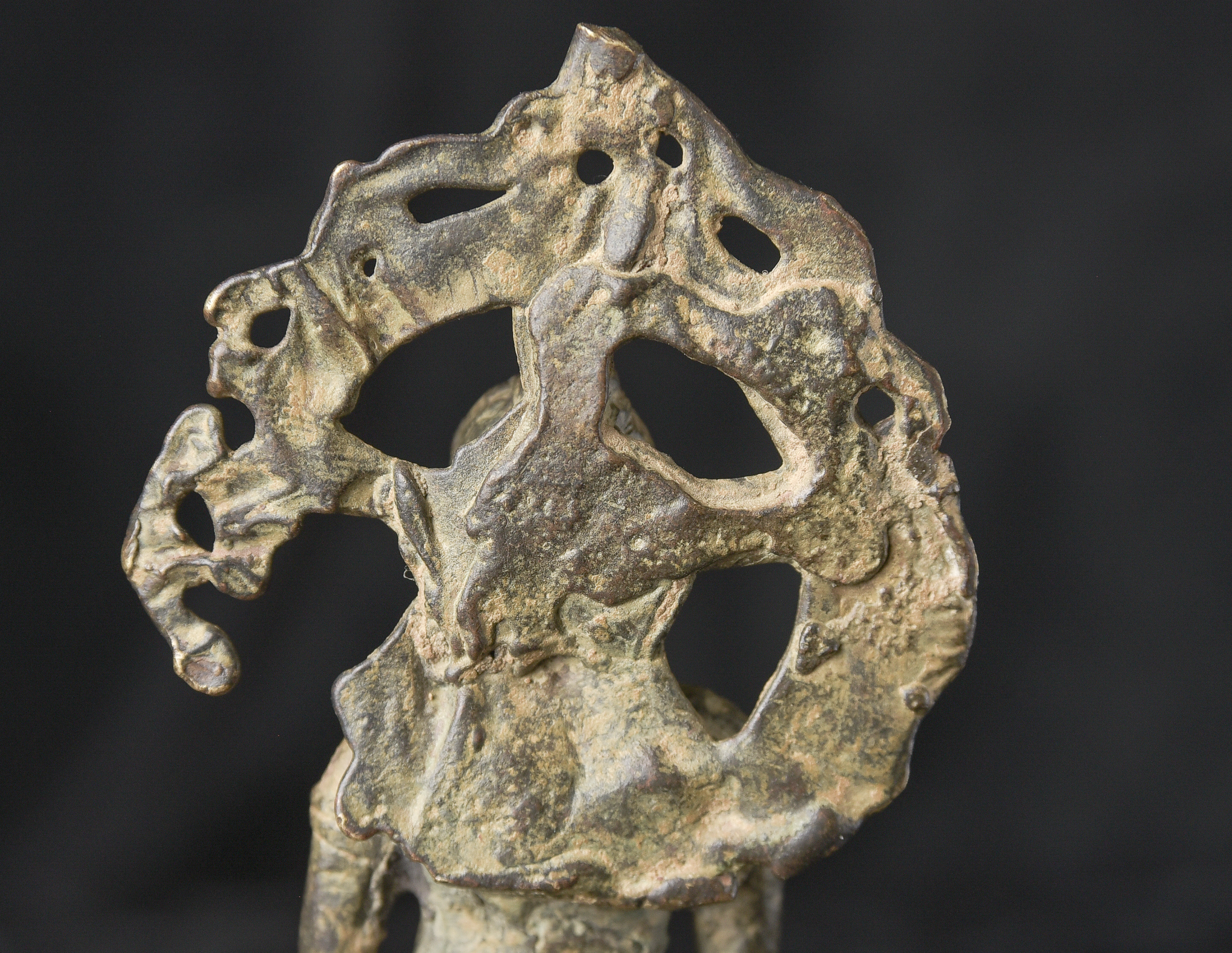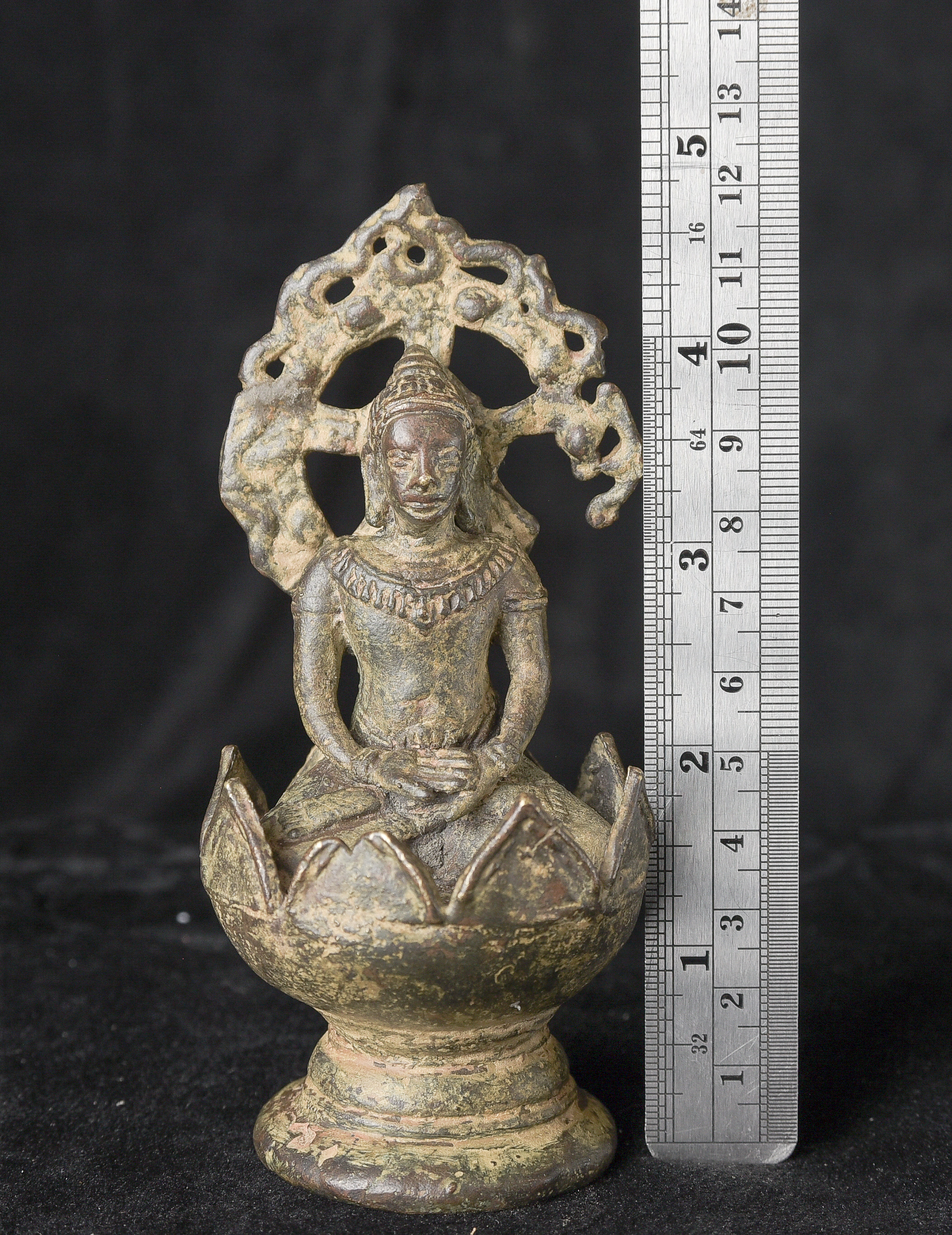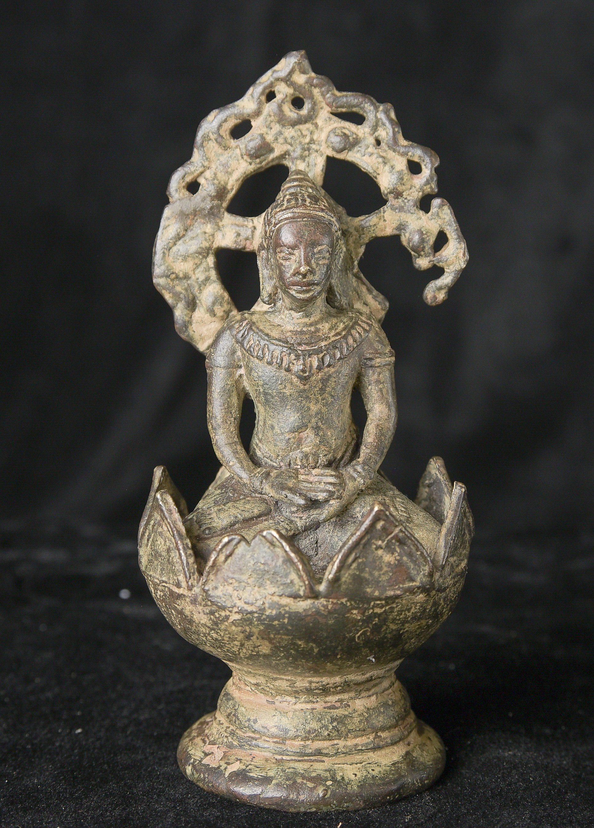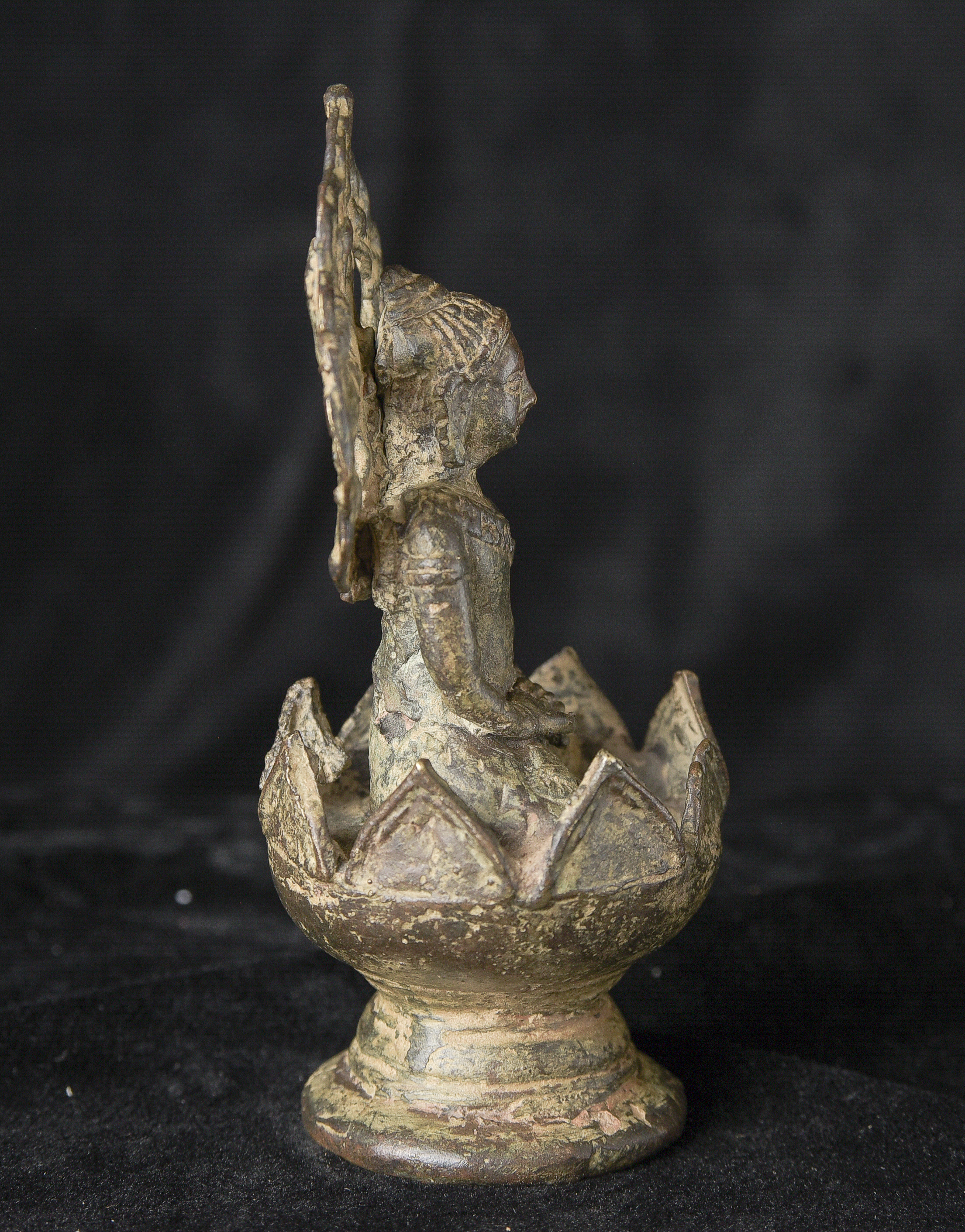Deeply serene, unusual Java Buddha, 14th-17th Century or earlier. This is a very uncommon type. I have seen three of this type in 30+ years of searching. The last photo in the series shows two similar pieces, items 6647 and 6774. I used to believe these were Burmese, but research shows they are more likely from Java and older than I had originally thought. Domestic Packing and shipping are included. (5"H x 2.25"W x 2"D ) - 315g.