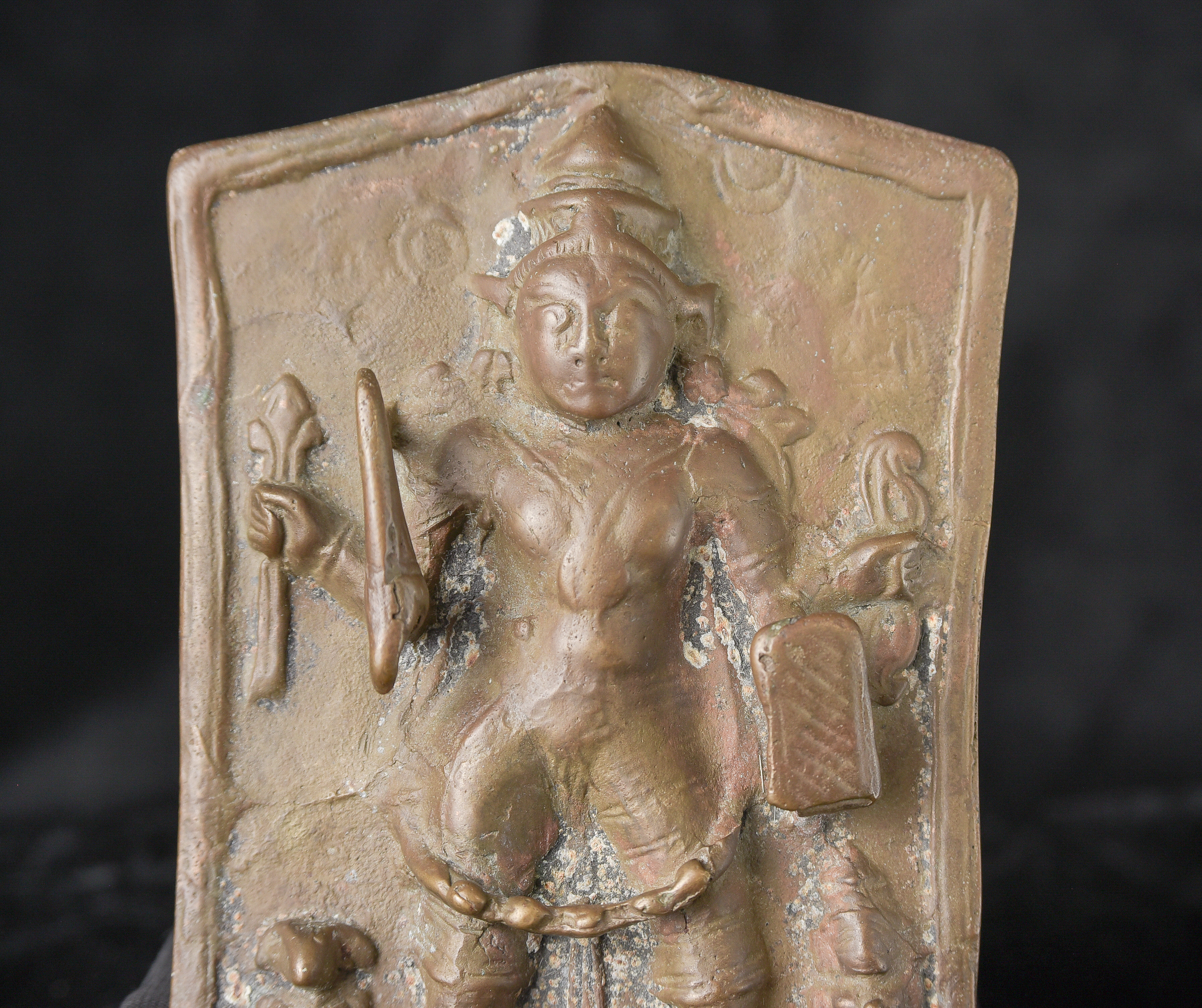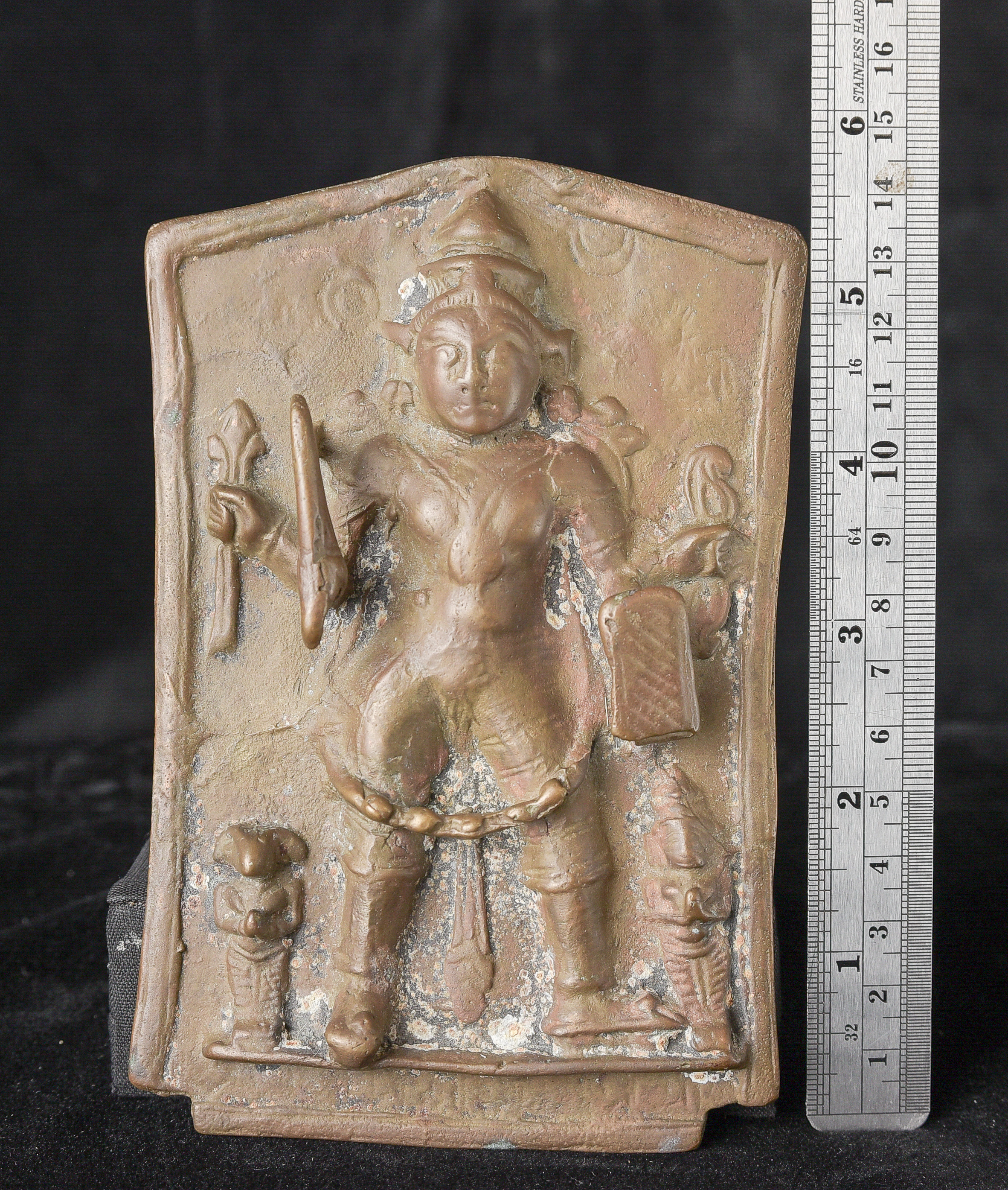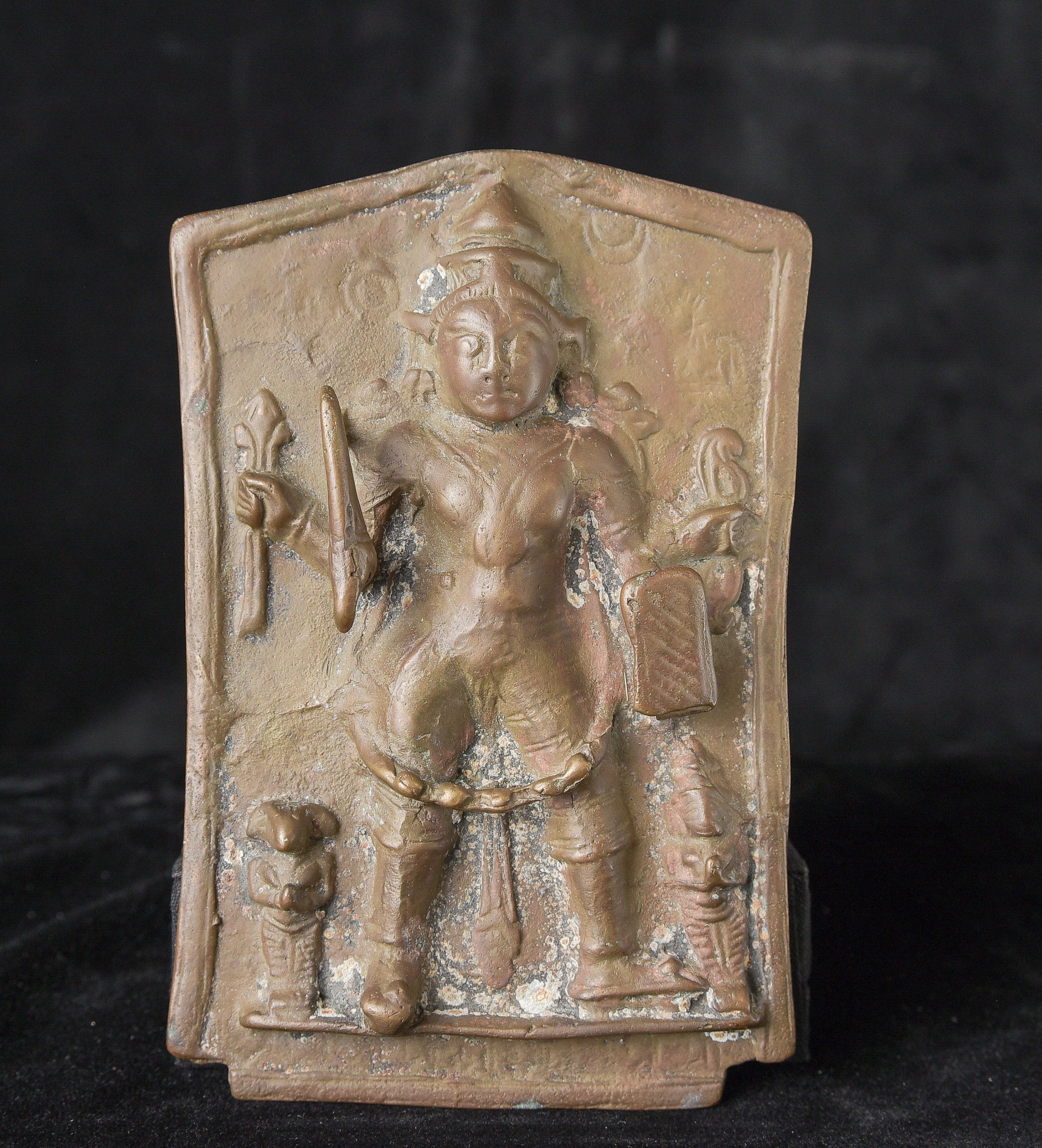 18/19thC Indian Bronze Virabhadra plaque. Significant ritual wear( 4"H x 6"W x 1"D ) - 470g.
