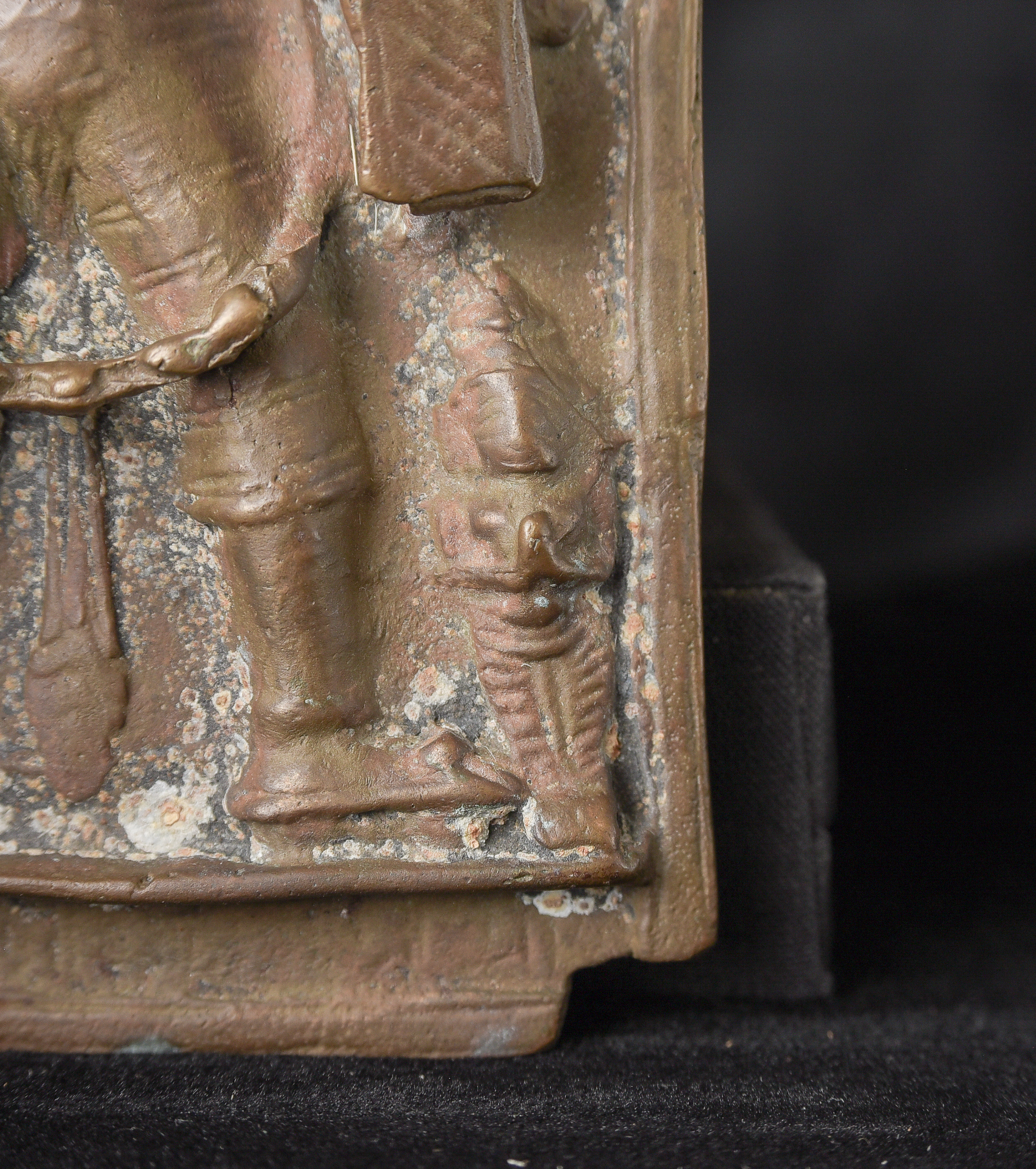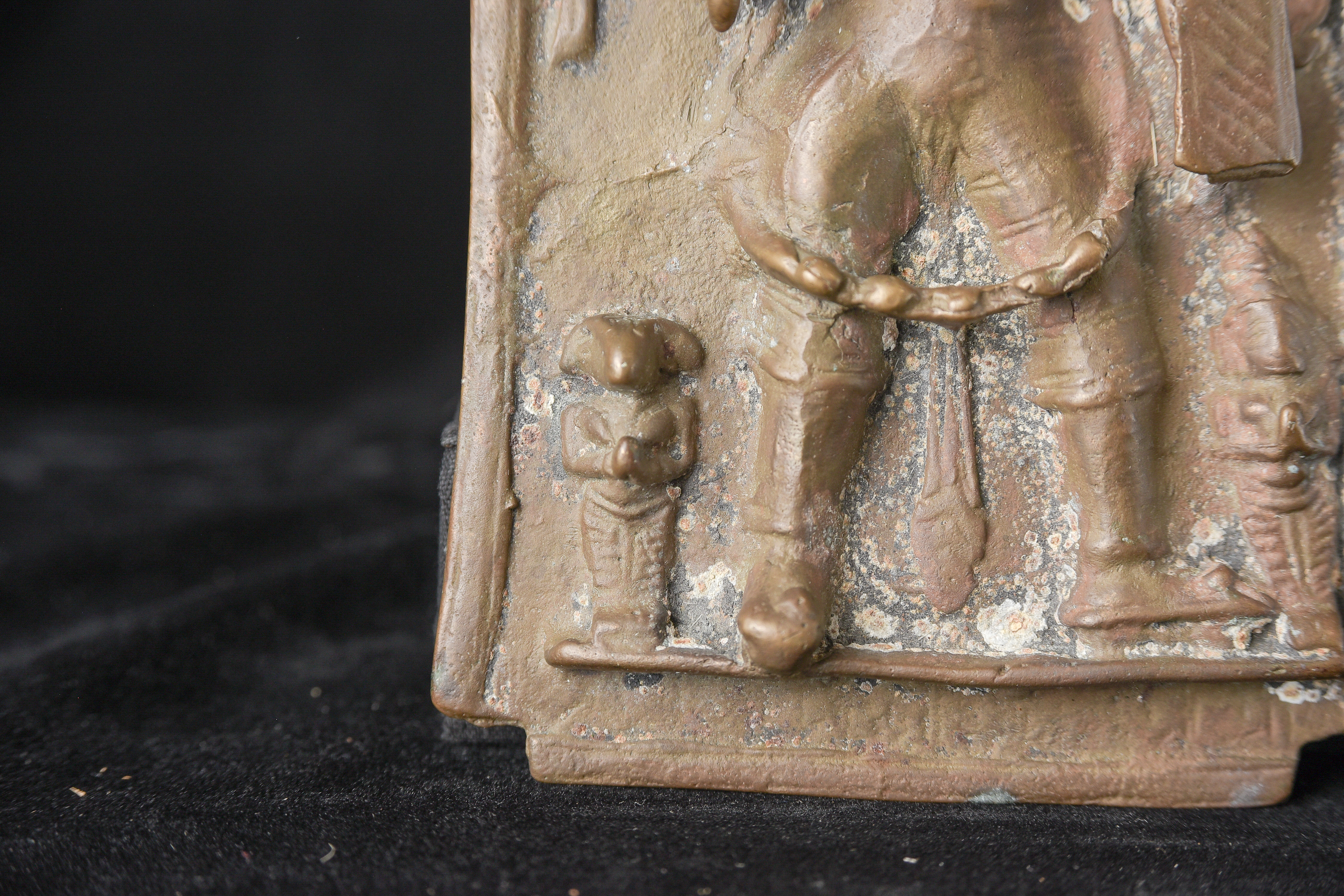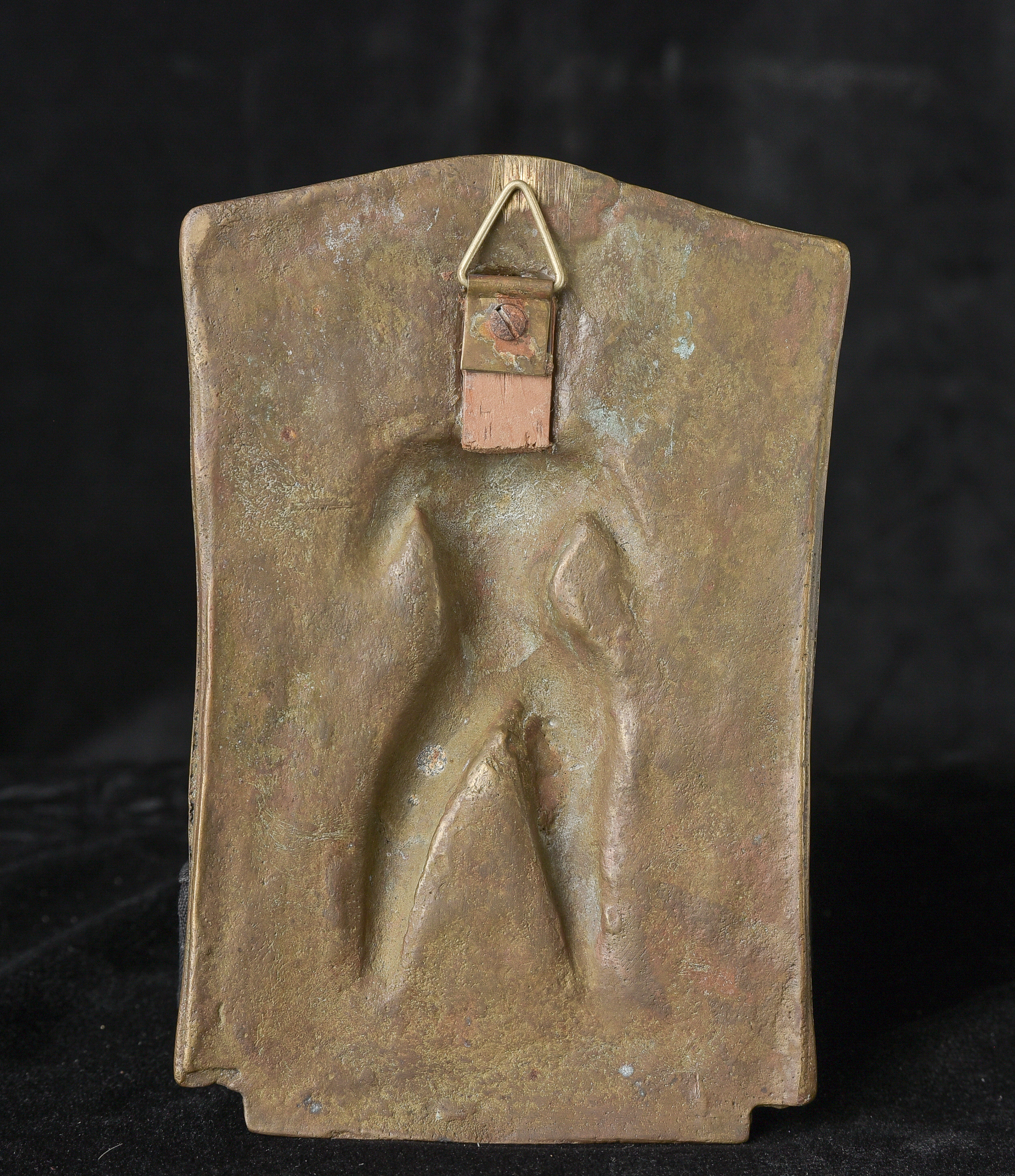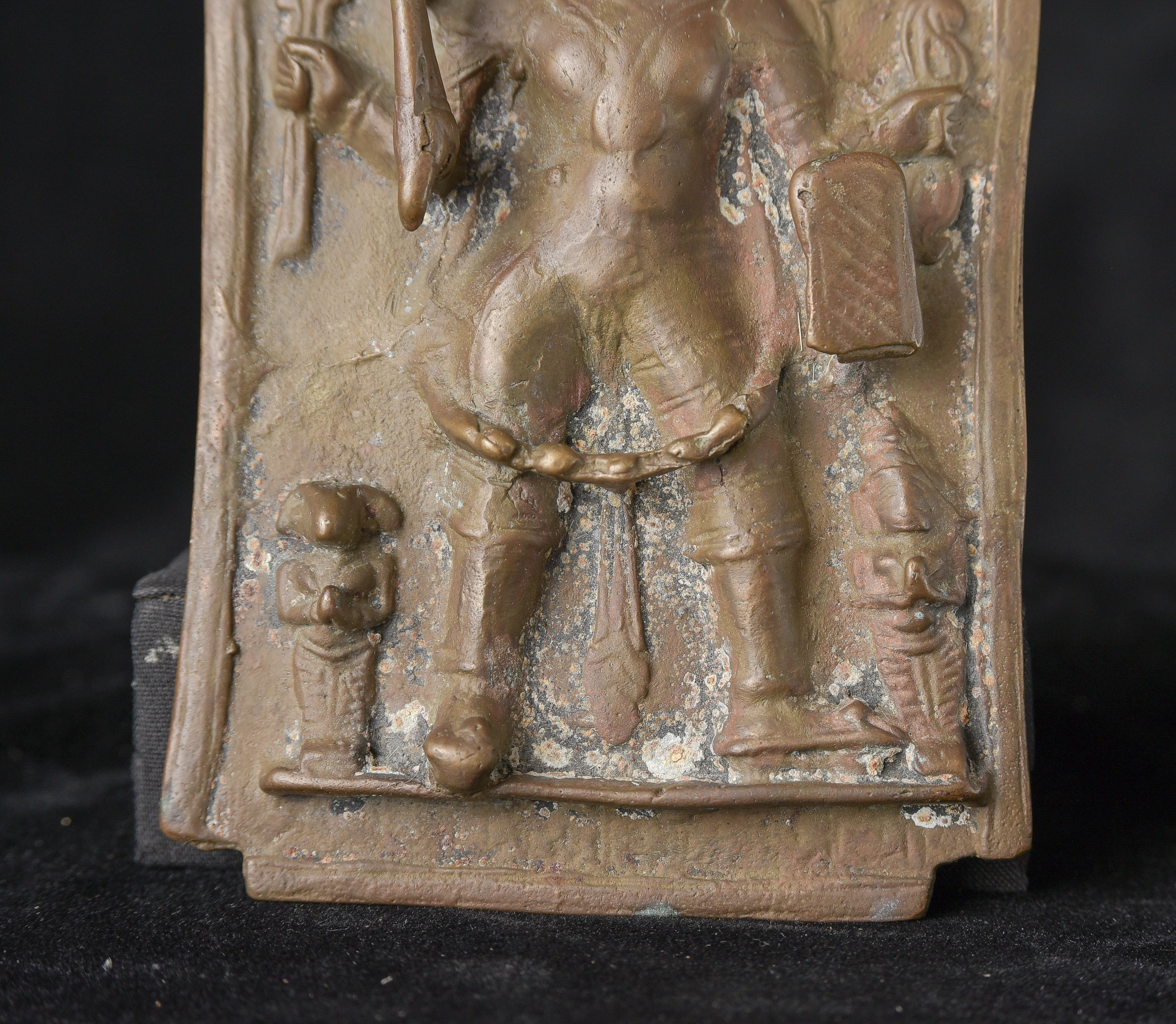 18/19thC Indian Bronze Virabhadra plaque. Significant ritual wear( 4"H x 6"W x 1"D ) - 470g.