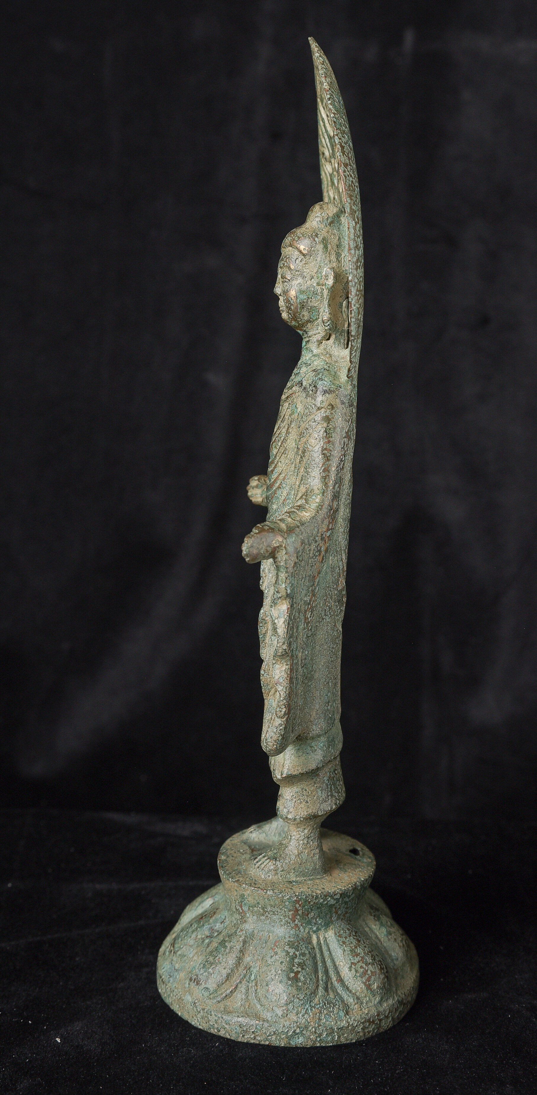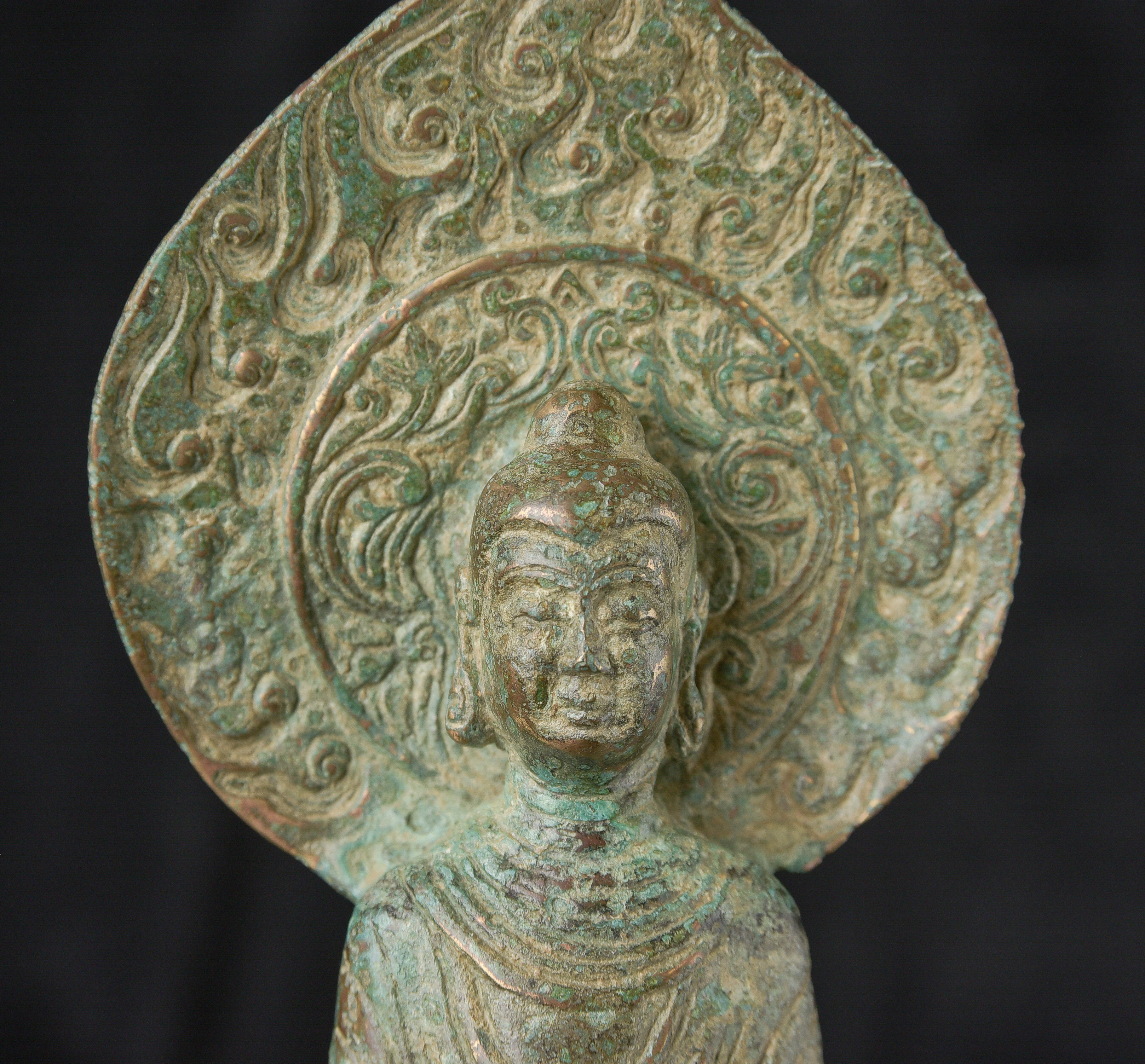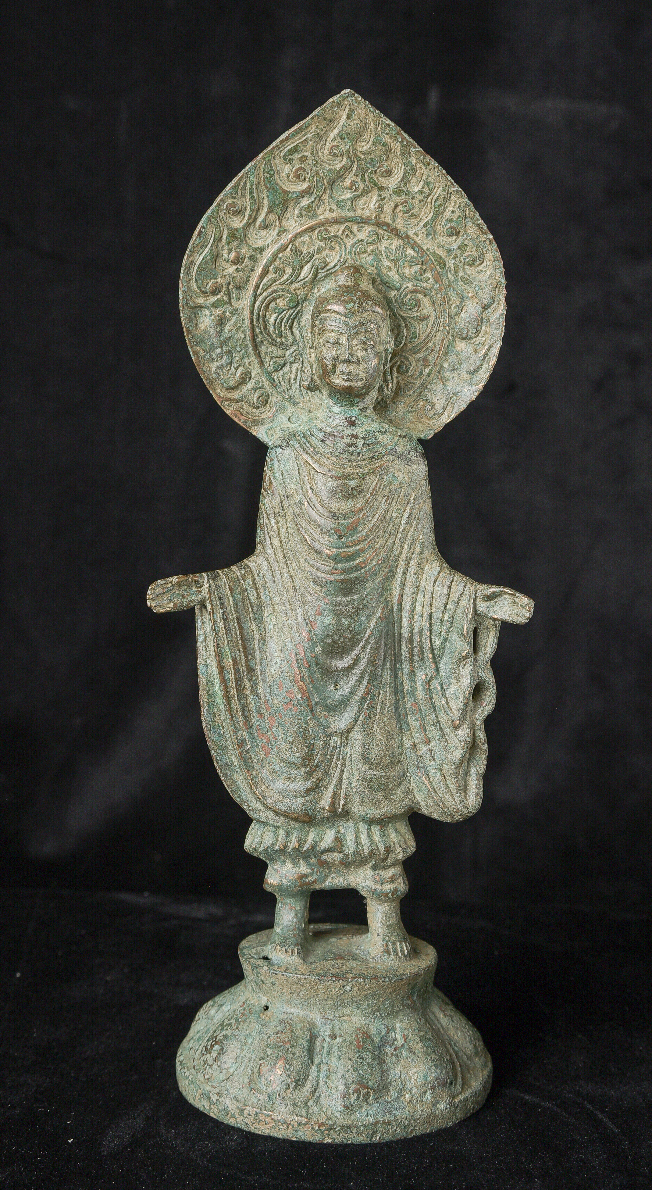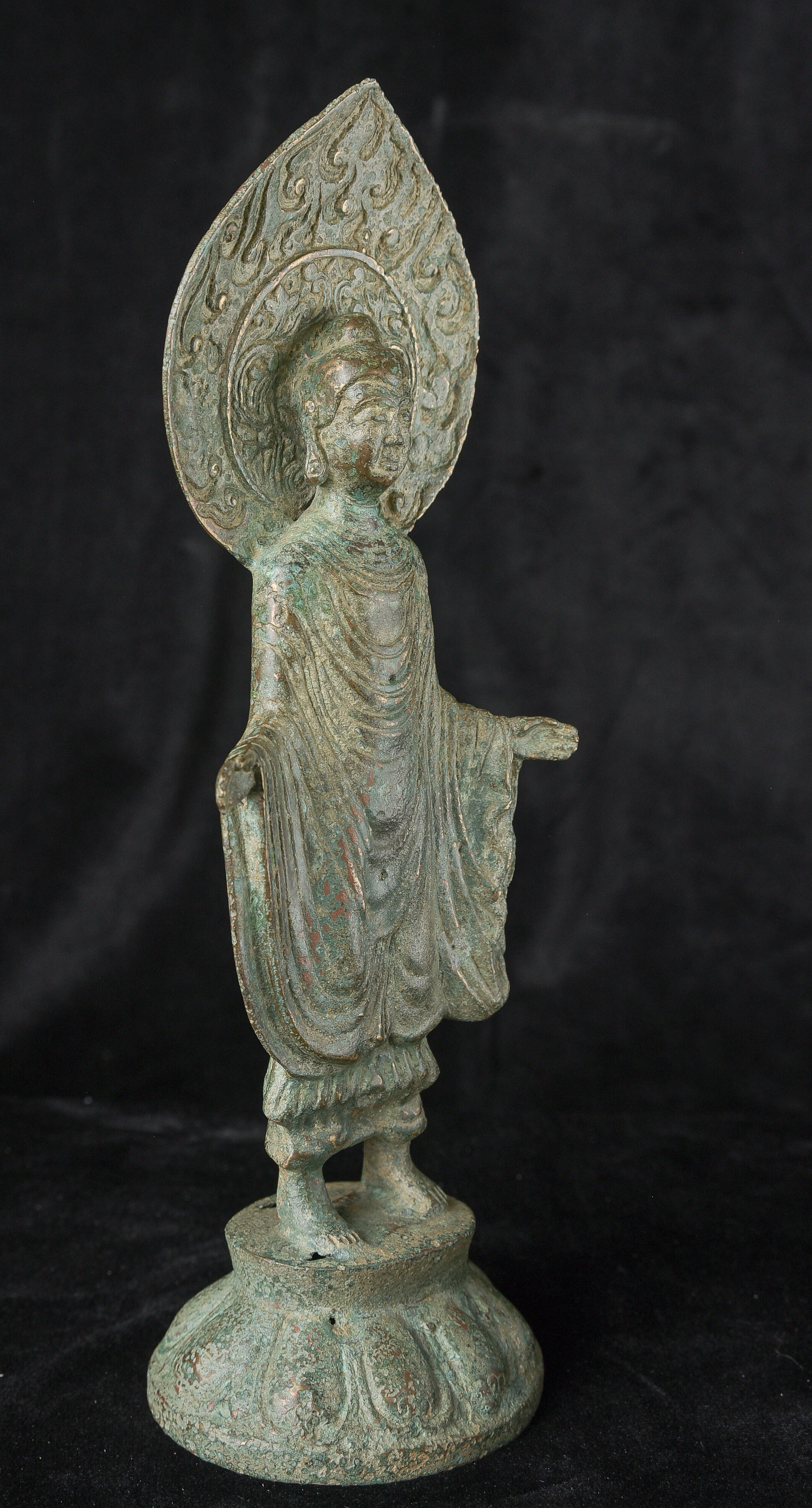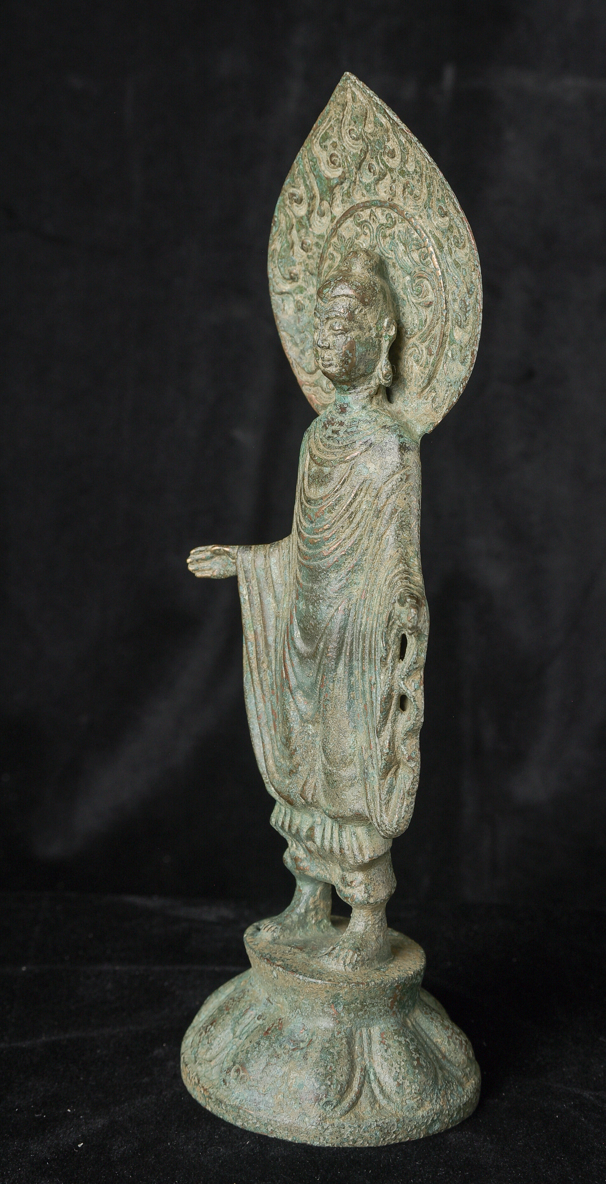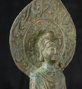 Early style standing Chinese bronze Buddha. The high level of detail in the robes and halo appear to be created by carving out the detail rather than casting it into the metal. This is a very uncommon and quite time consuming way of creating sculpture like this. The style is archaic and are extremely early, the dating of the figure is much more recent, though it may not be 20th century. ( 9.75"H x 3.75"W x 2.75"D ) - 1.14lbs