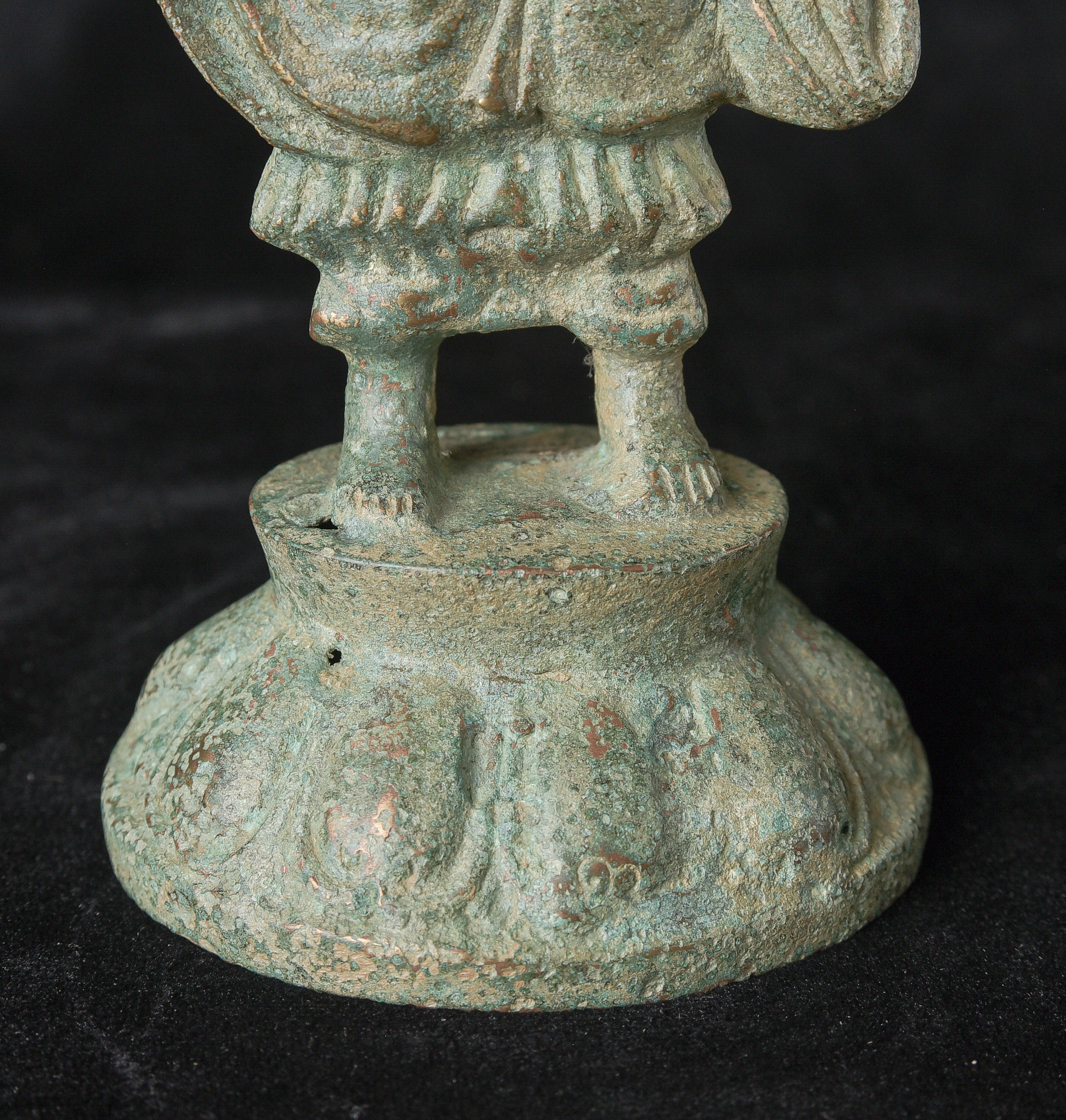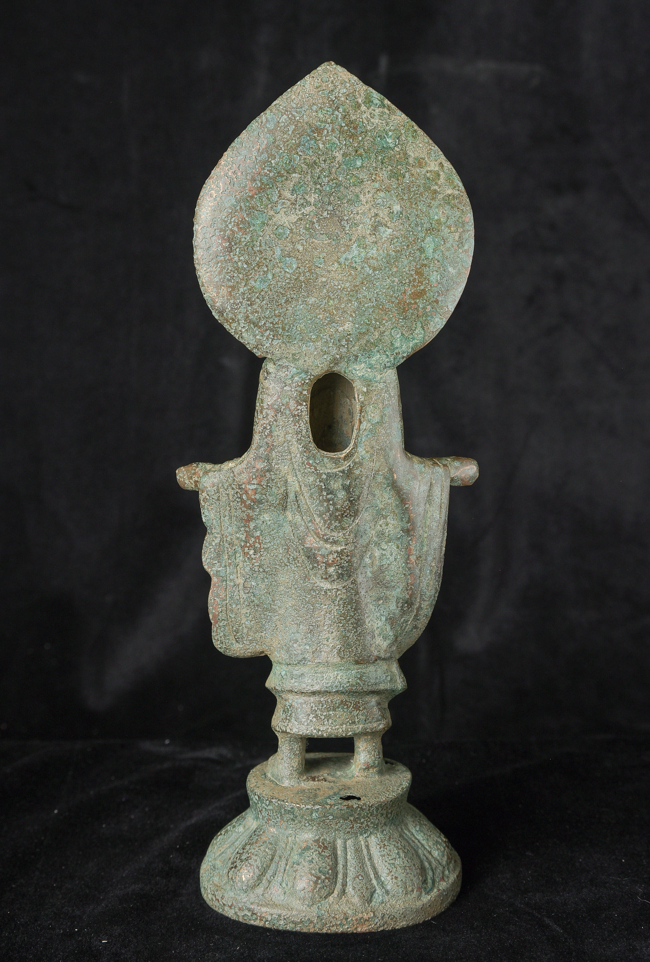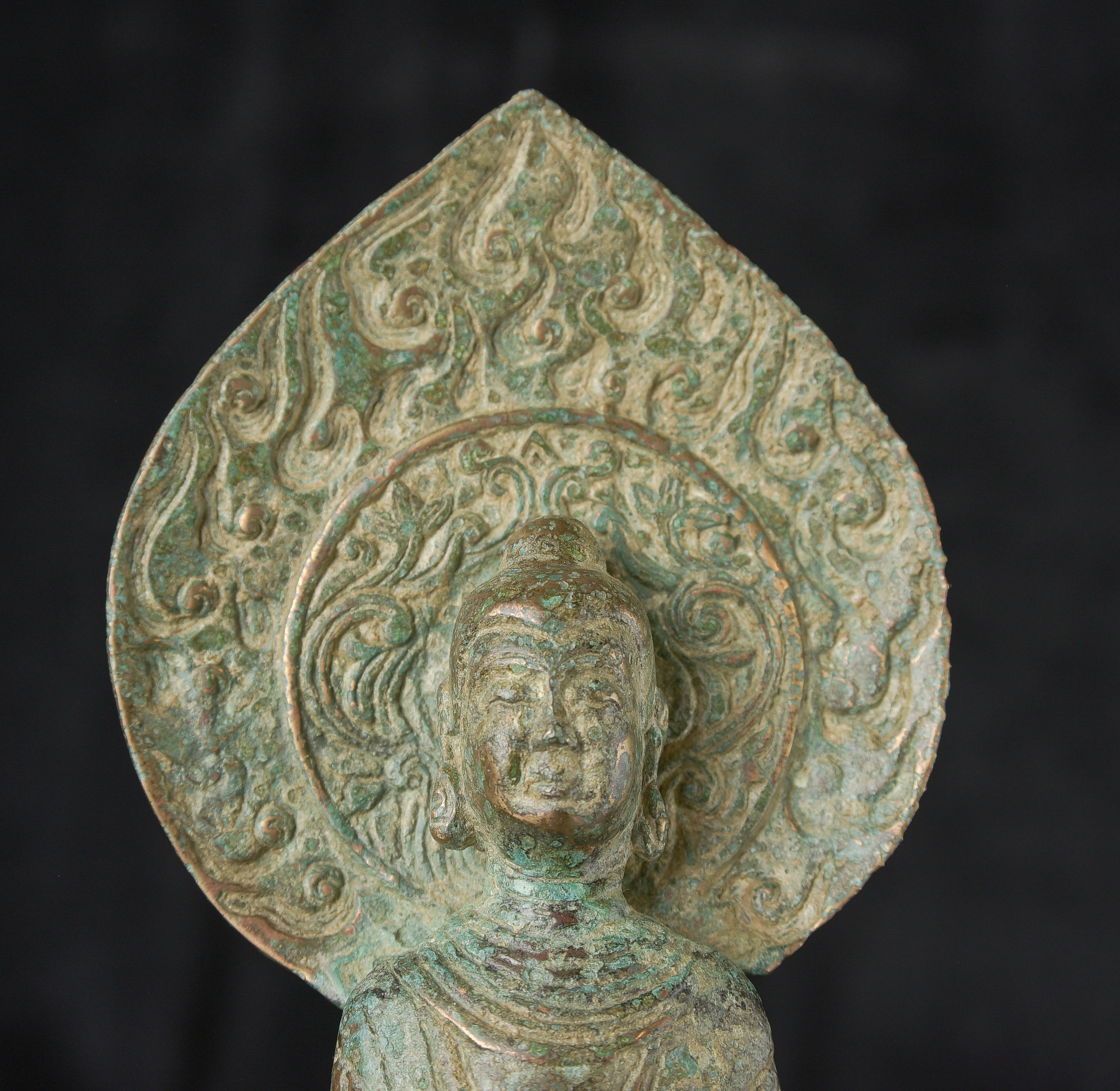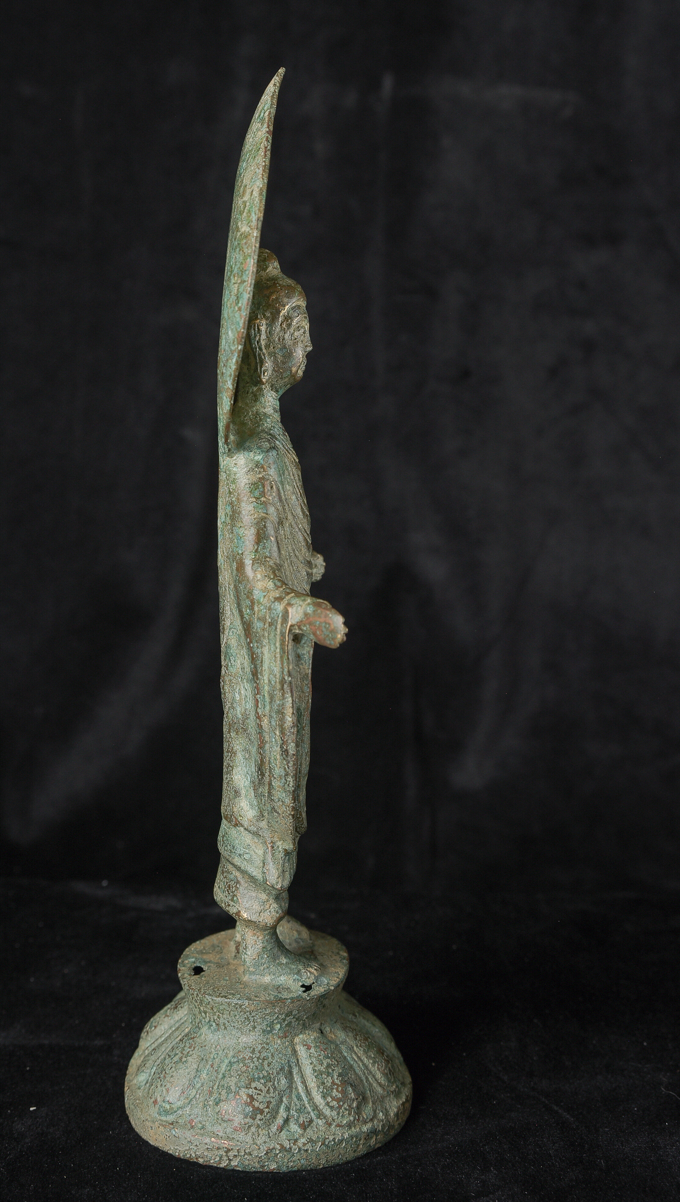 Early style standing Chinese bronze Buddha. The high level of detail in the robes and halo appear to be created by carving out the detail rather than casting it into the metal. This is a very uncommon and quite time consuming way of creating sculpture like this. The style is archaic and are extremely early, the dating of the figure is much more recent, though it may not be 20th century. ( 9.75"H x 3.75"W x 2.75"D ) - 1.14lbs