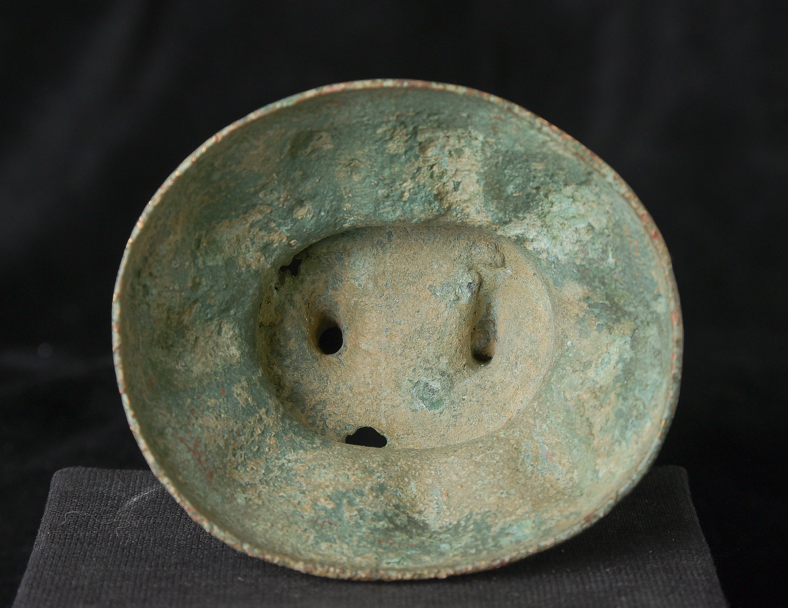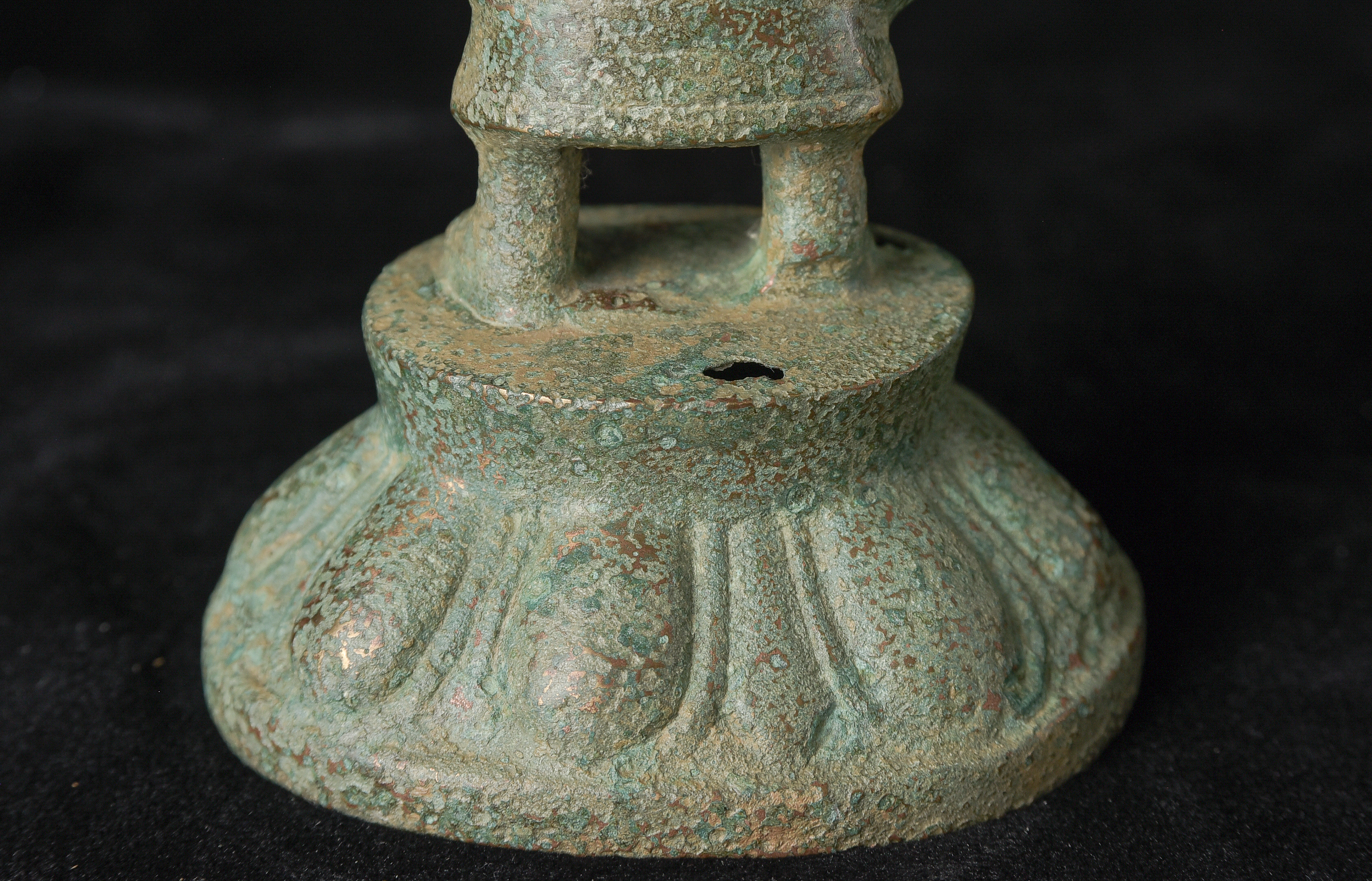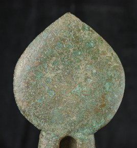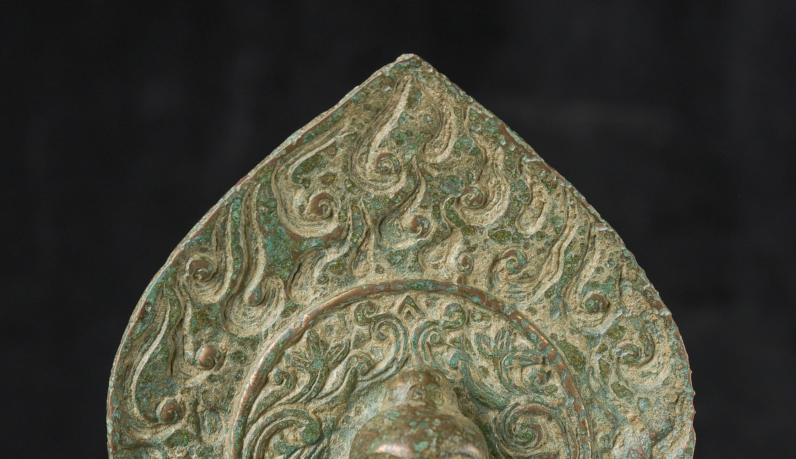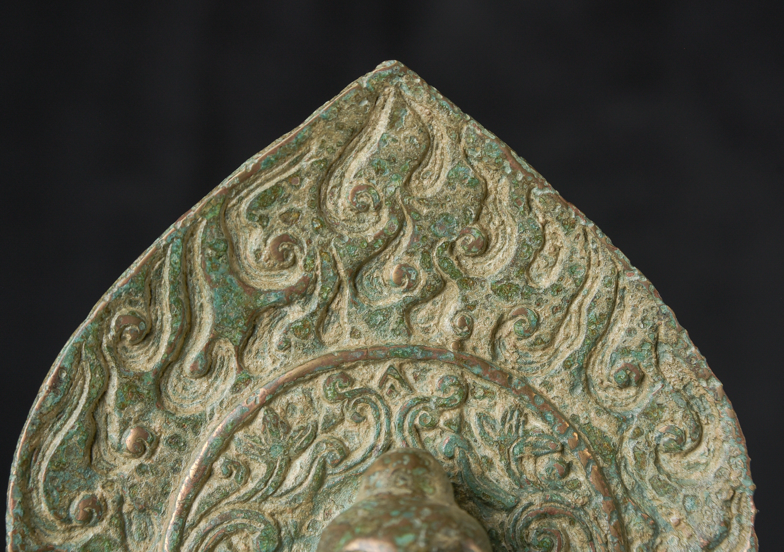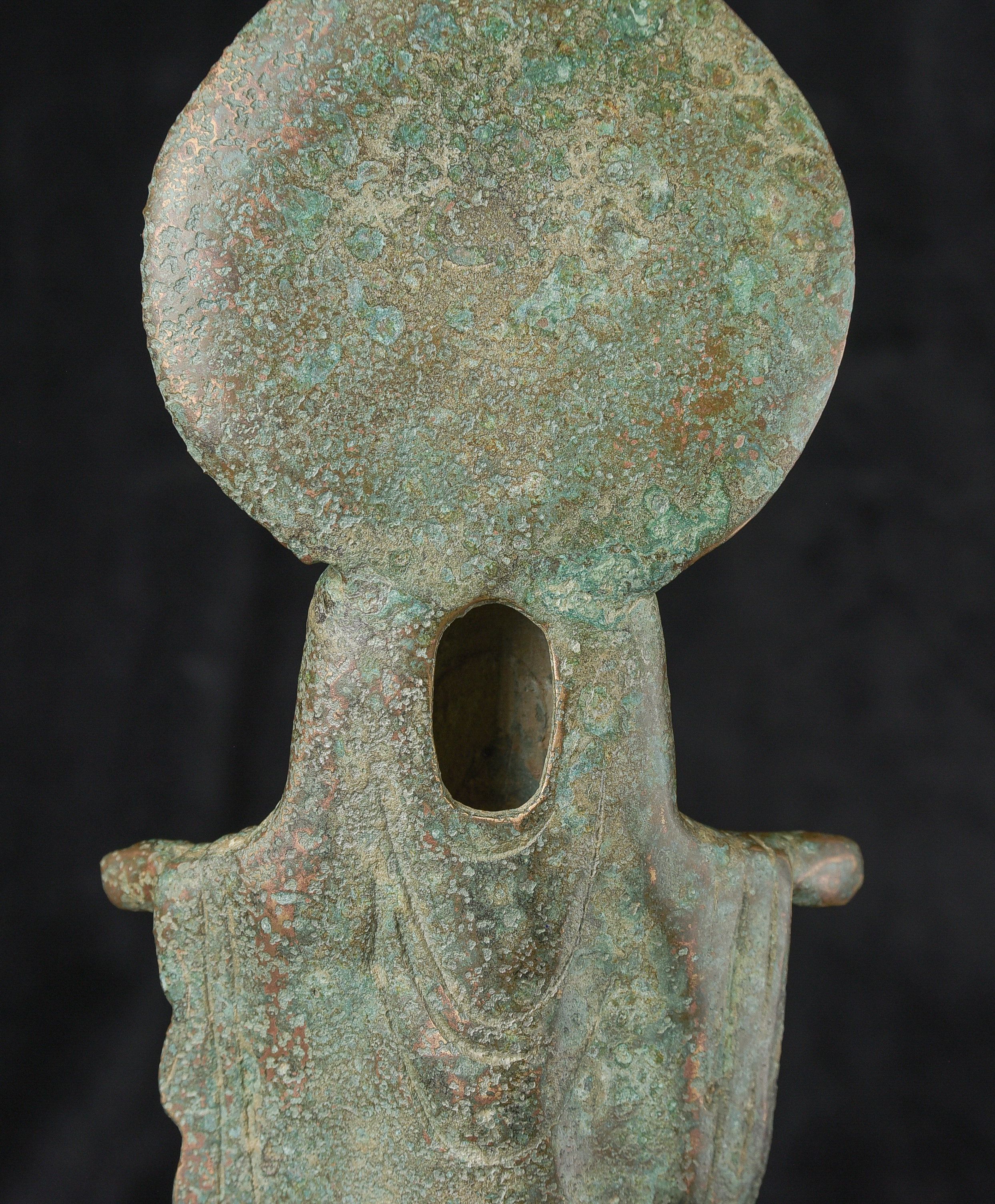 Early style standing Chinese bronze Buddha. The high level of detail in the robes and halo appear to be created by carving out the detail rather than casting it into the metal. This is a very uncommon and quite time consuming way of creating sculpture like this. The style is archaic and are extremely early, the dating of the figure is much more recent, though it may not be 20th century. ( 9.75"H x 3.75"W x 2.75"D ) - 1.14lbs