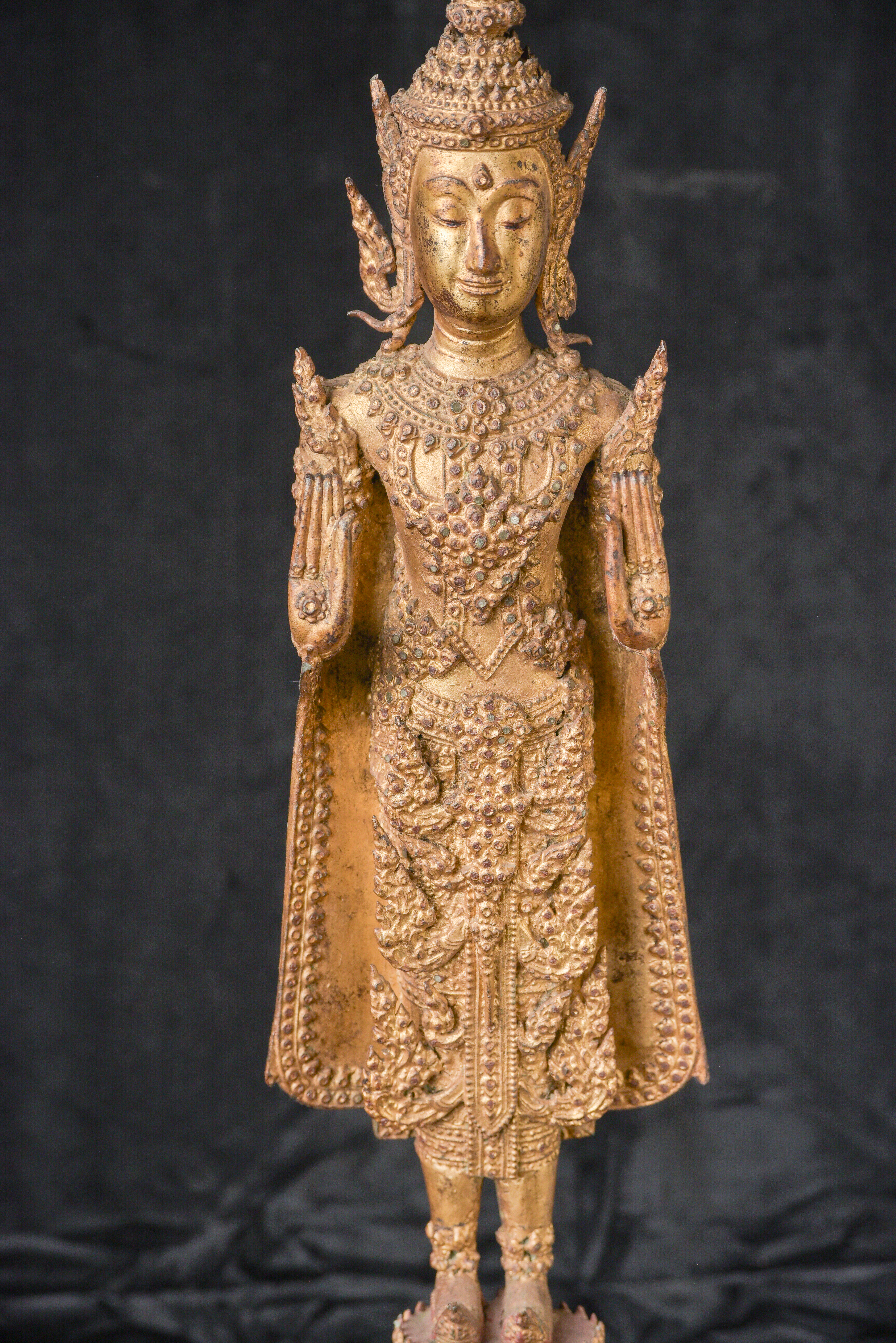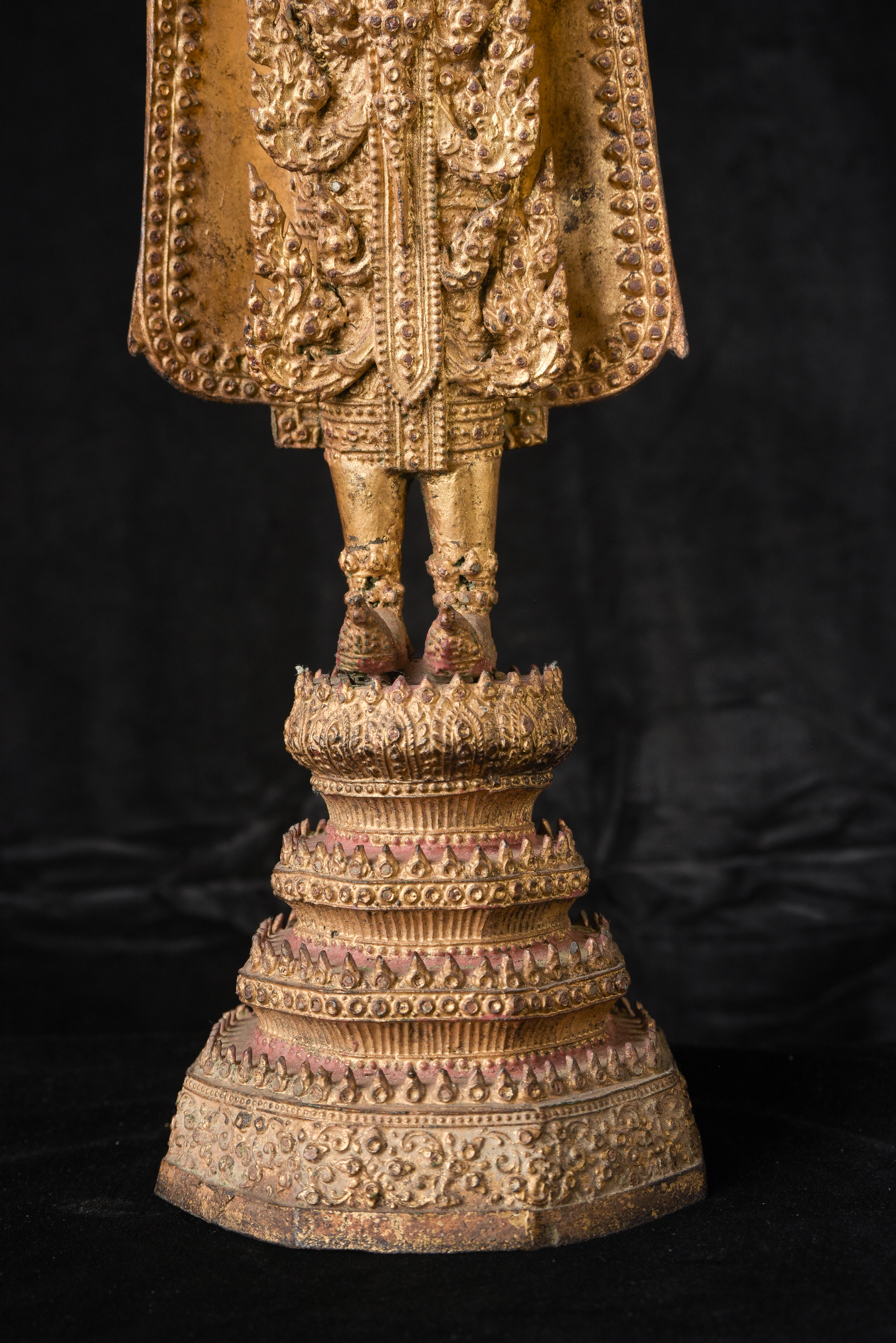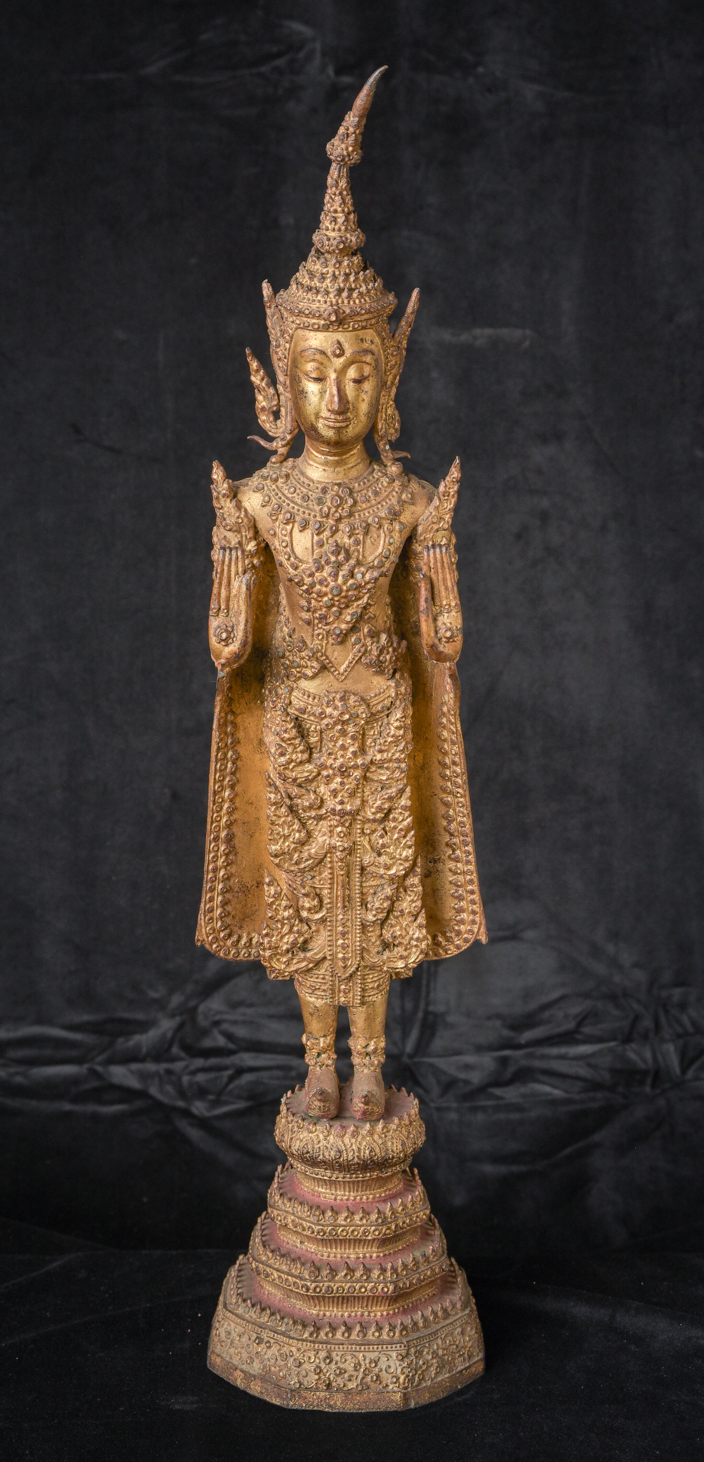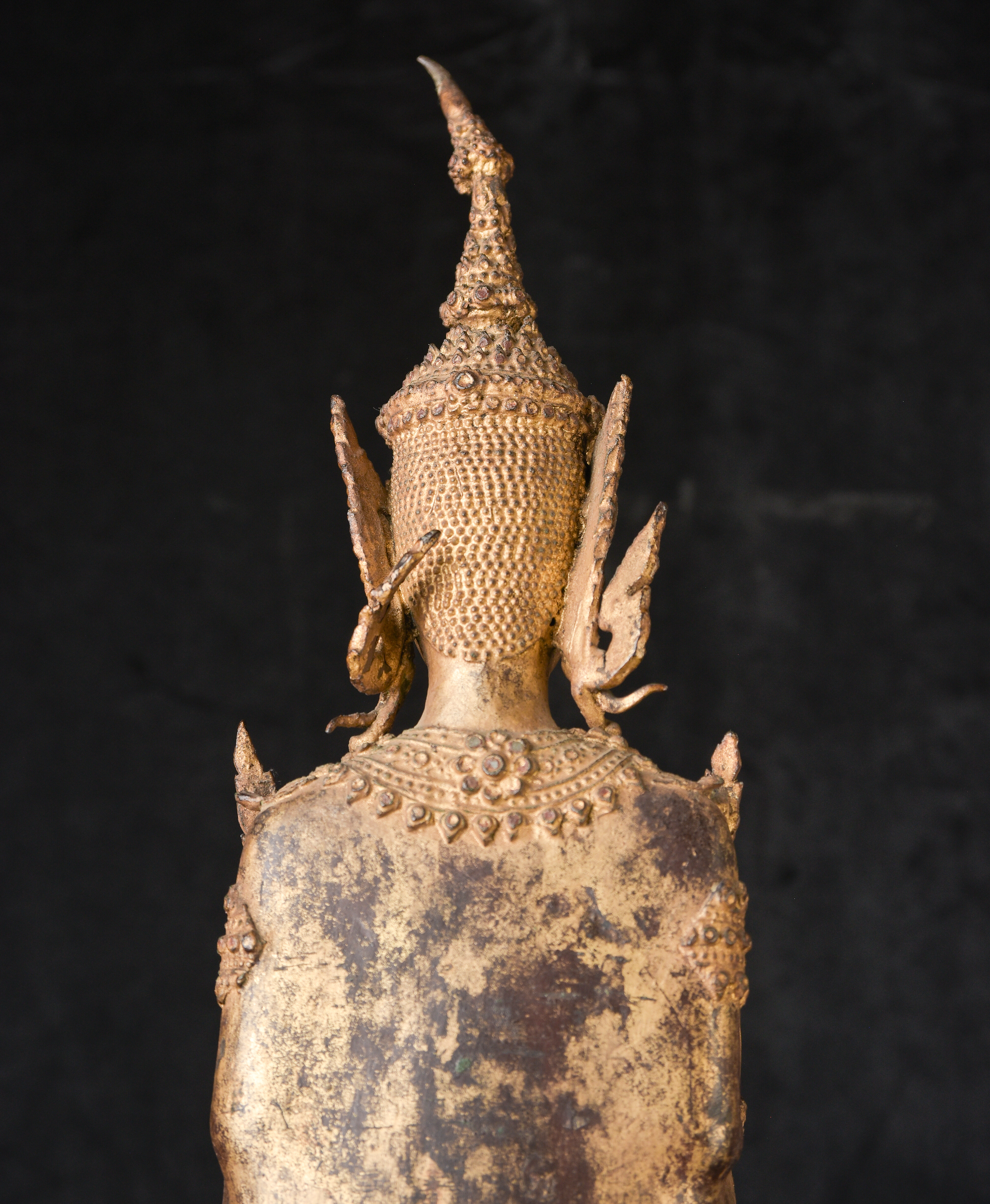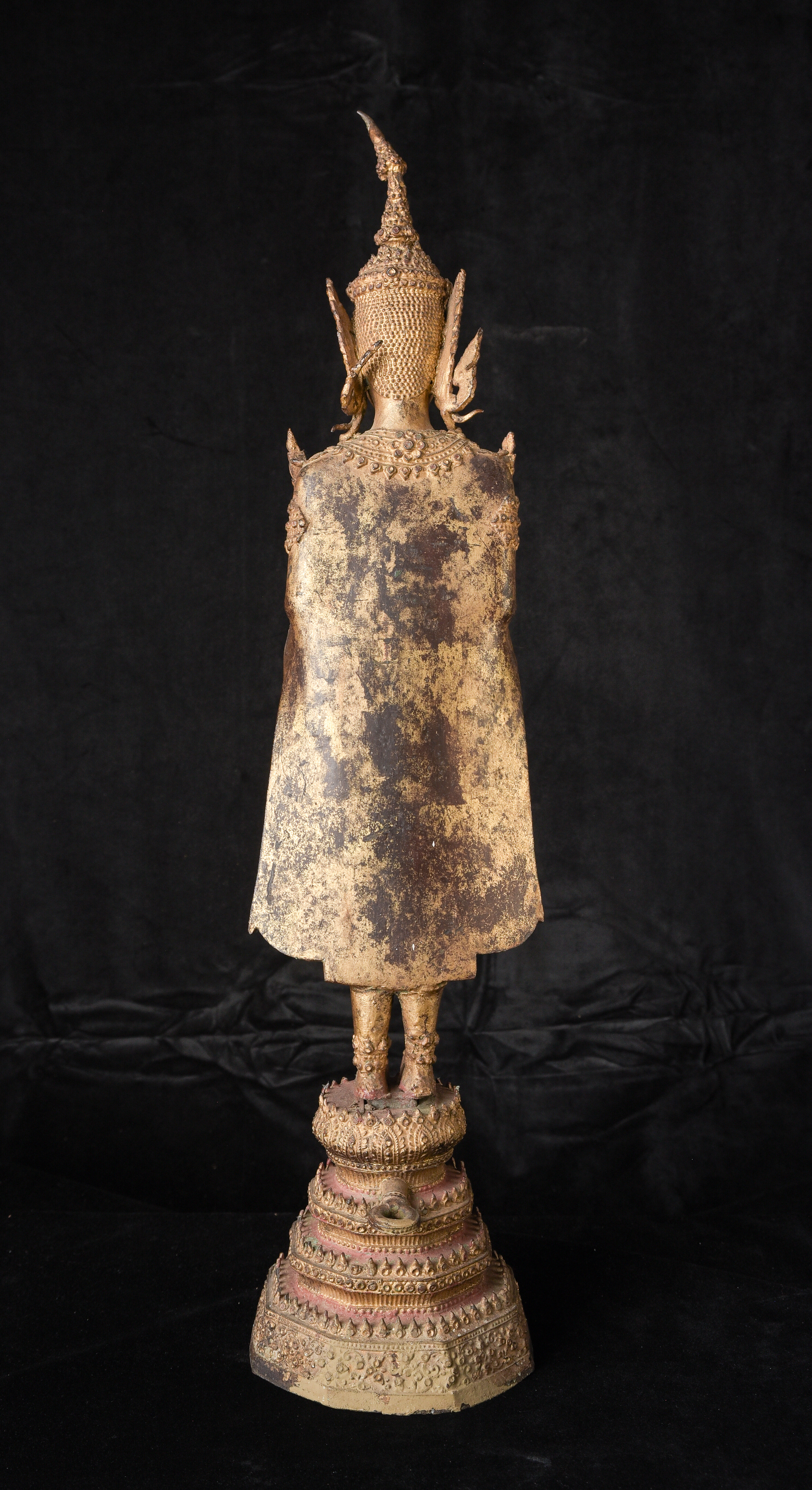 19thC Thai Rattanakosin standing bronze Buddha. A nice example of its type. Leans forward, though stands stably. Has a crooked finial. Overall condition is excellent, with many of the original tiny mirror-like decorations still in place. Good size at( 22.5"H x 5"W x 5"D ) - 10.3lbs