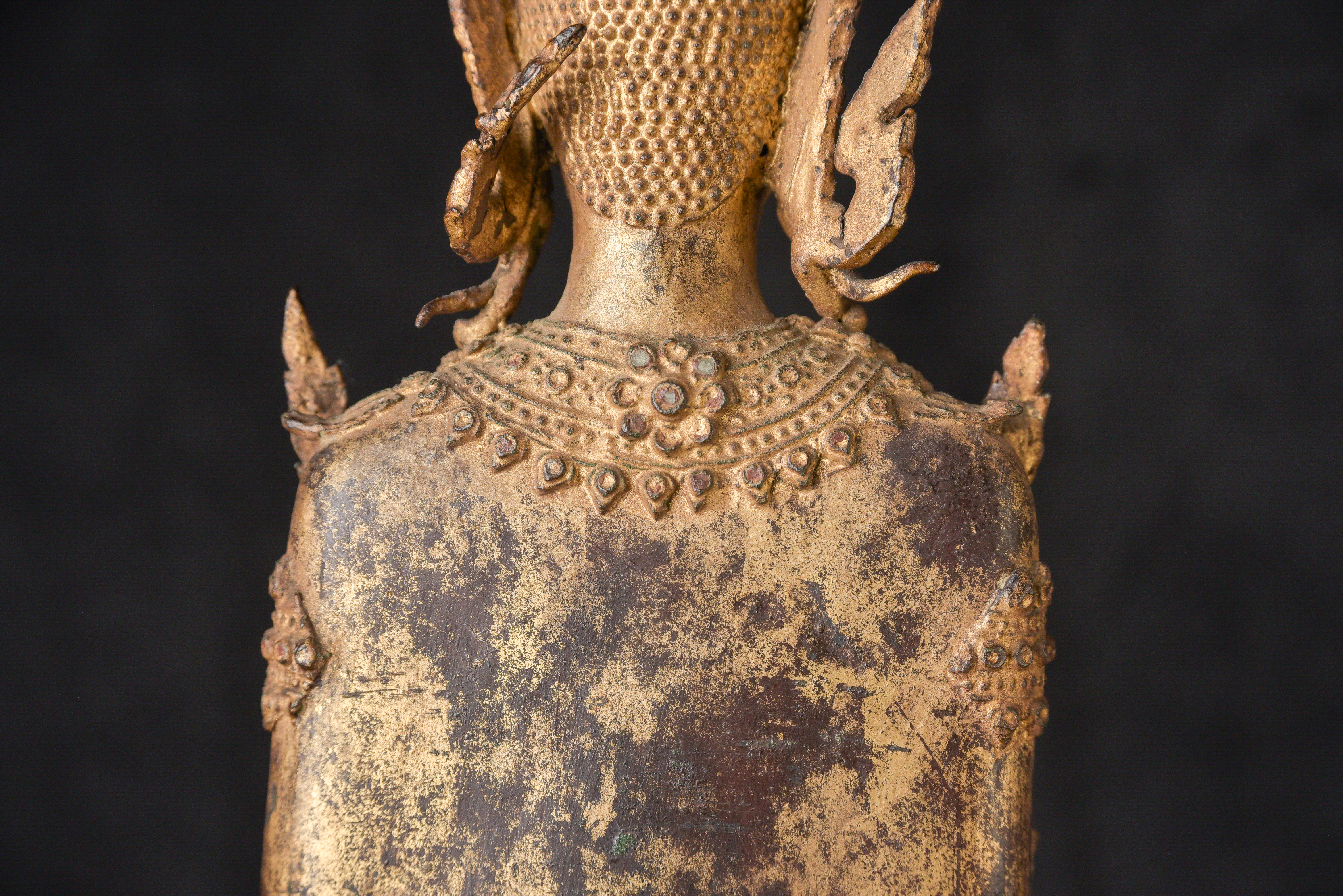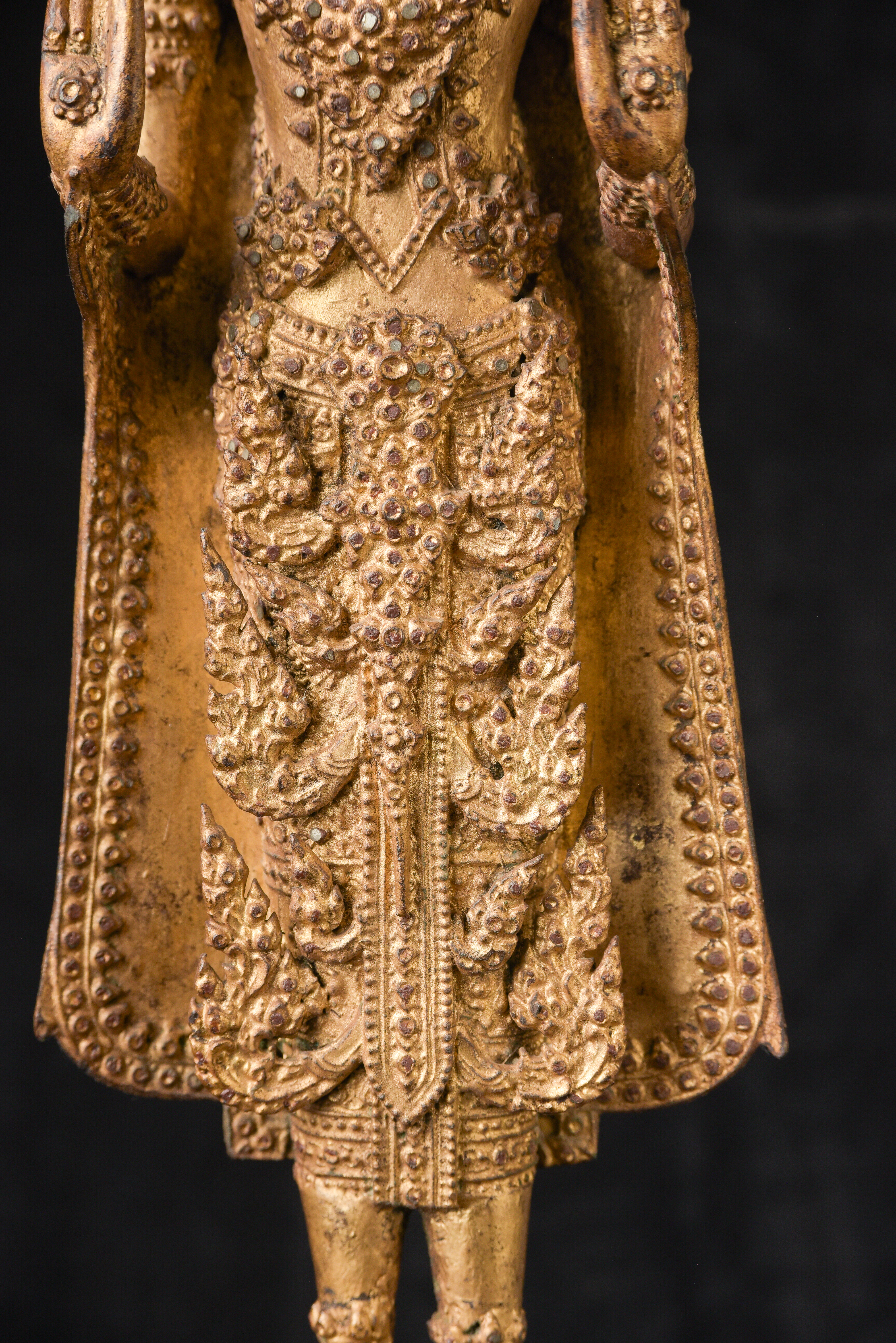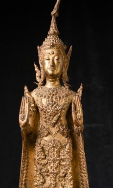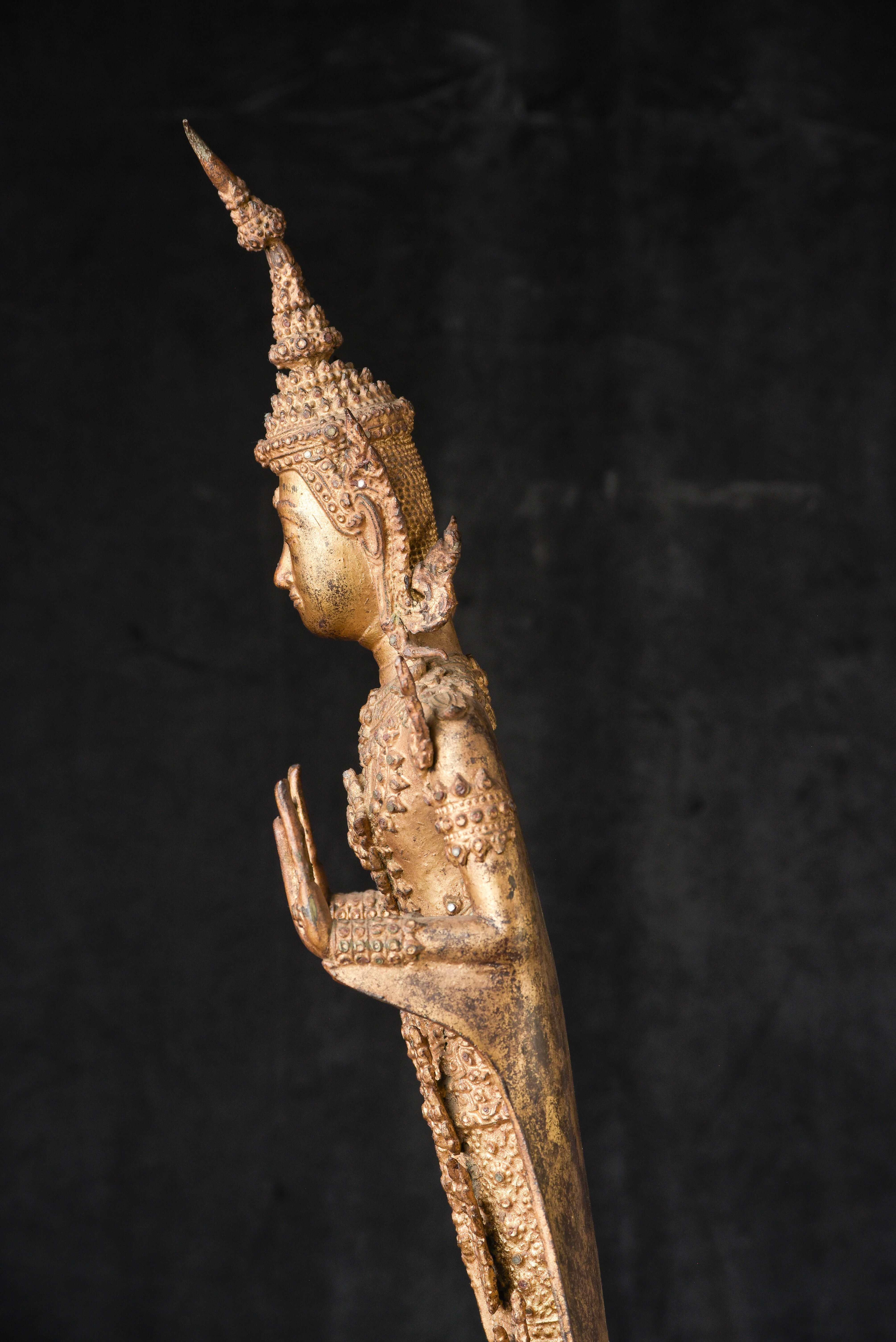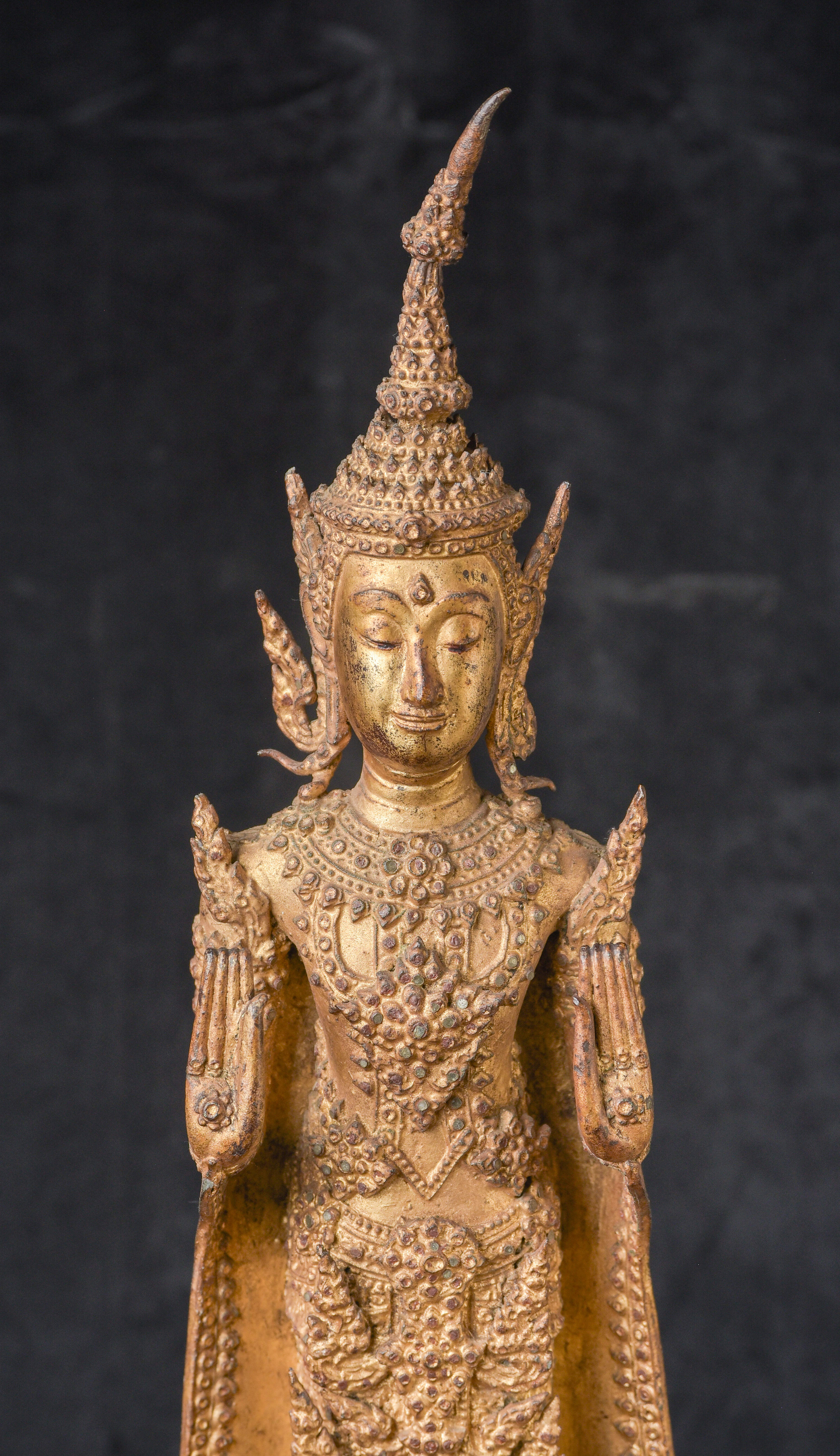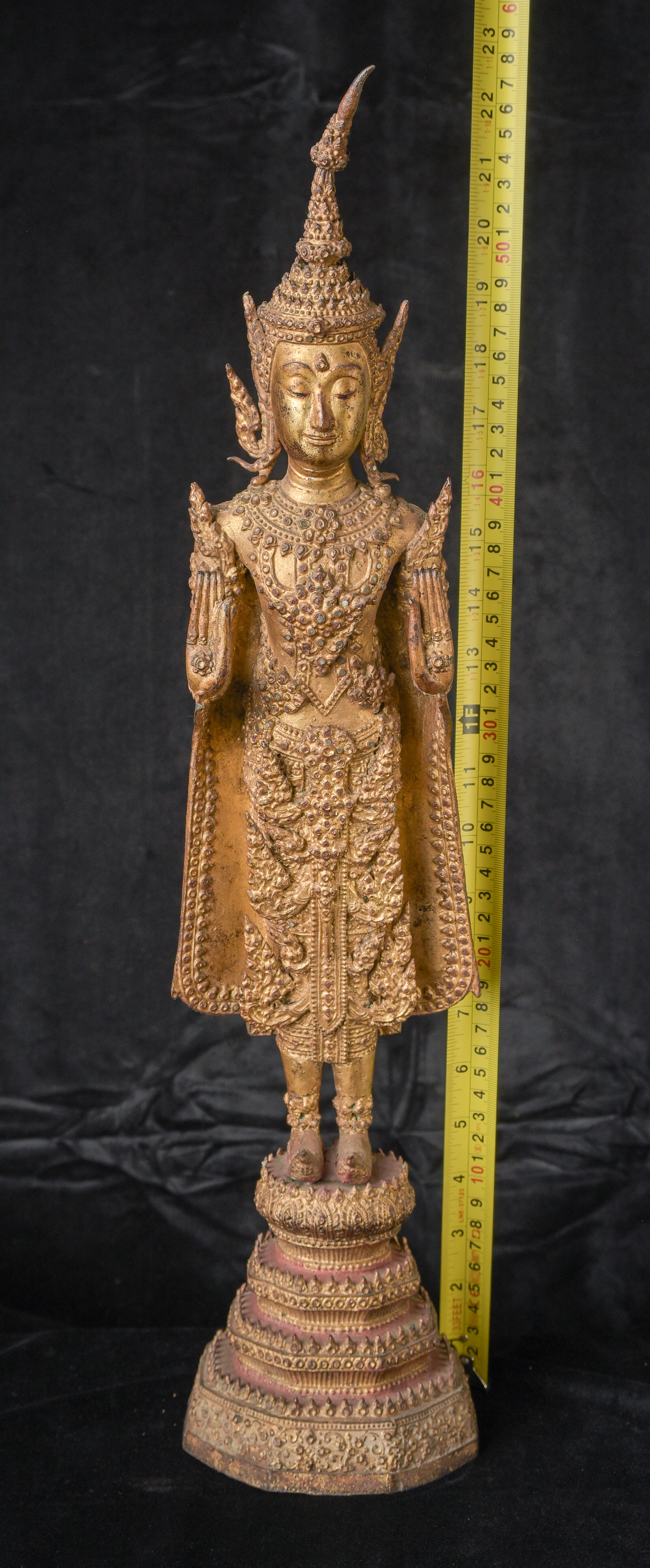 19thC Thai Rattanakosin standing bronze Buddha. A nice example of its type. Leans forward, though stands stably. Has a crooked finial. Overall condition is excellent, with many of the original tiny mirror-like decorations still in place. Good size at( 22.5"H x 5"W x 5"D ) - 10.3lbs