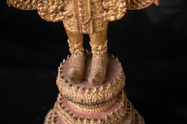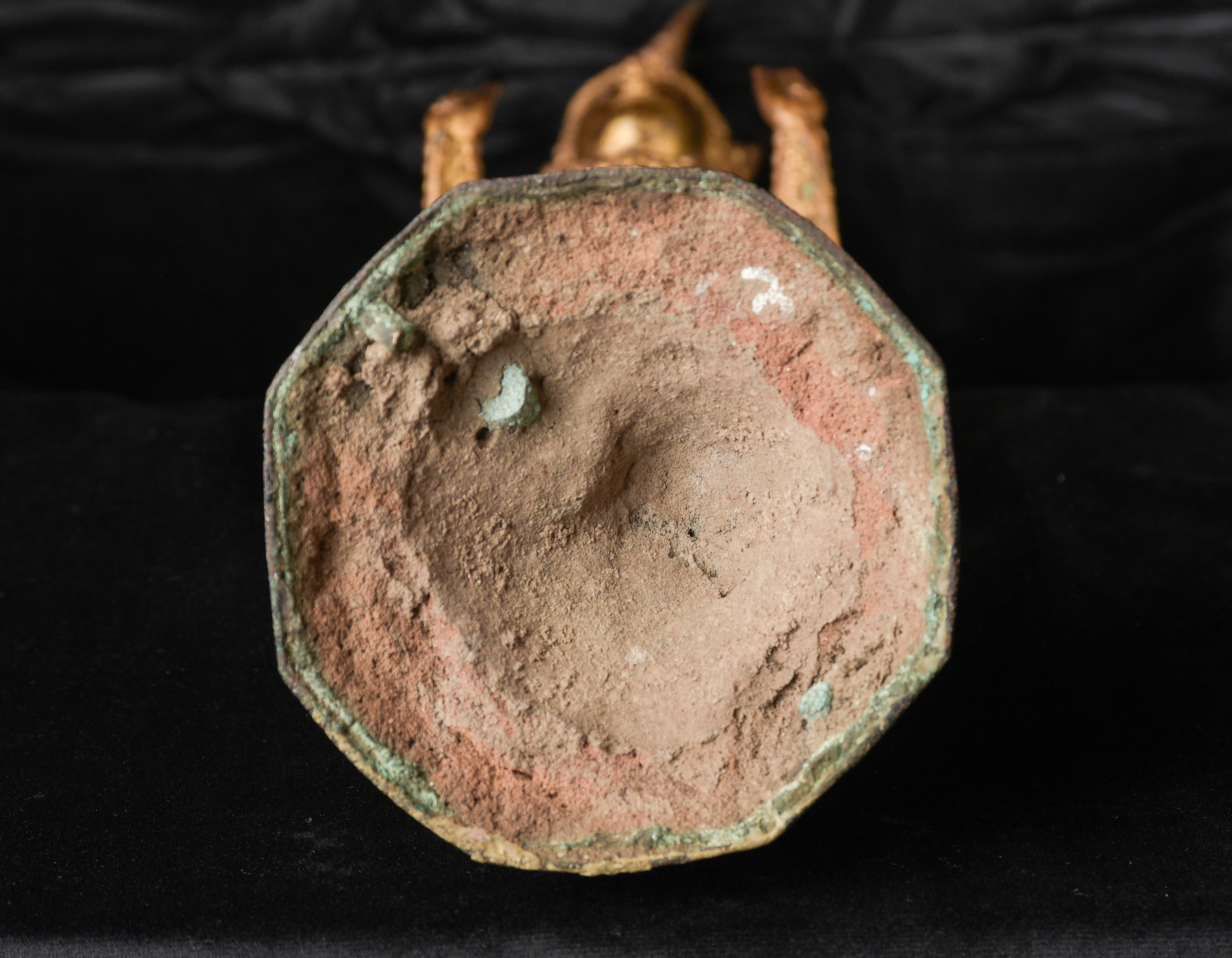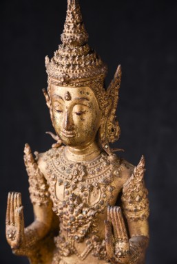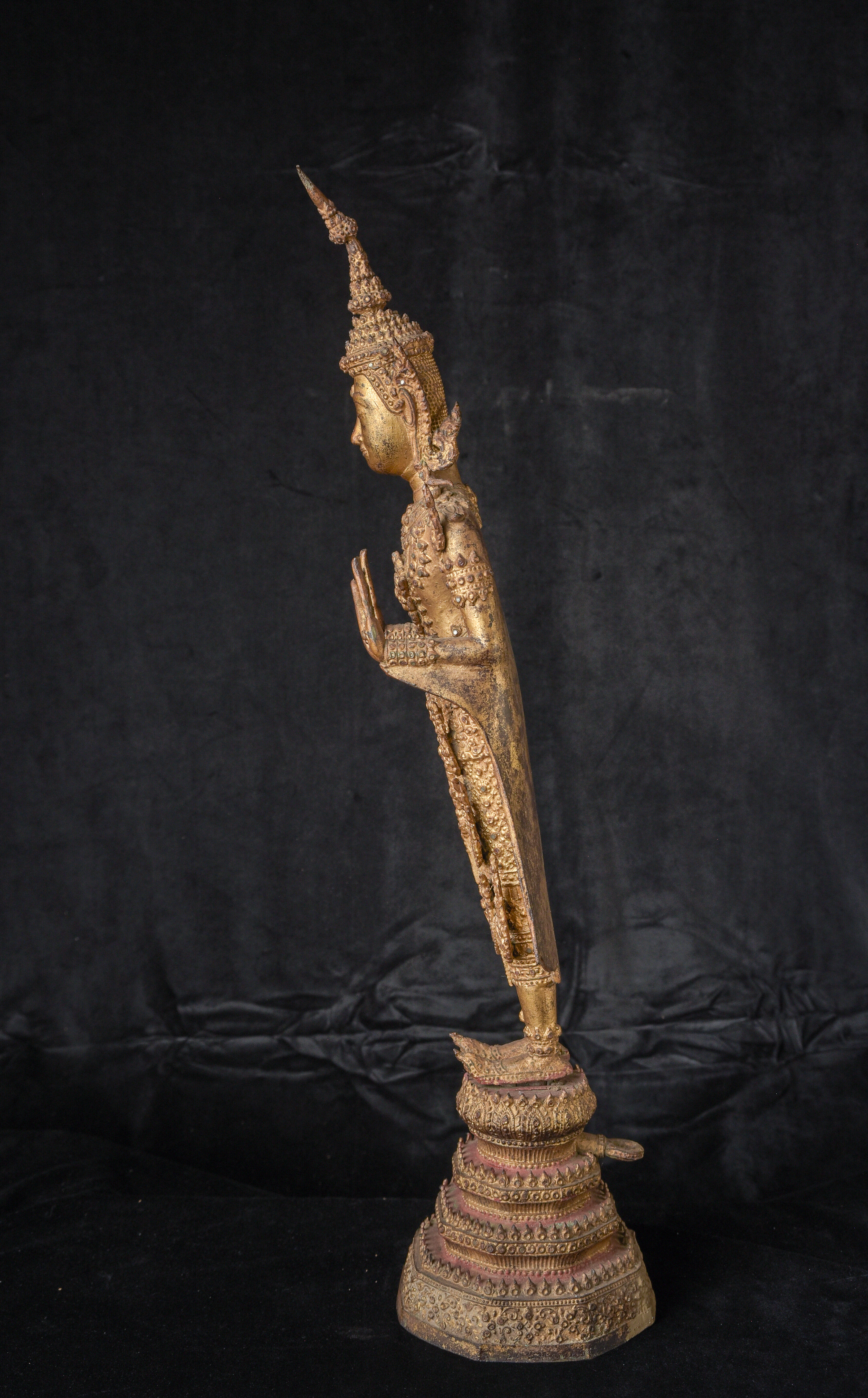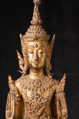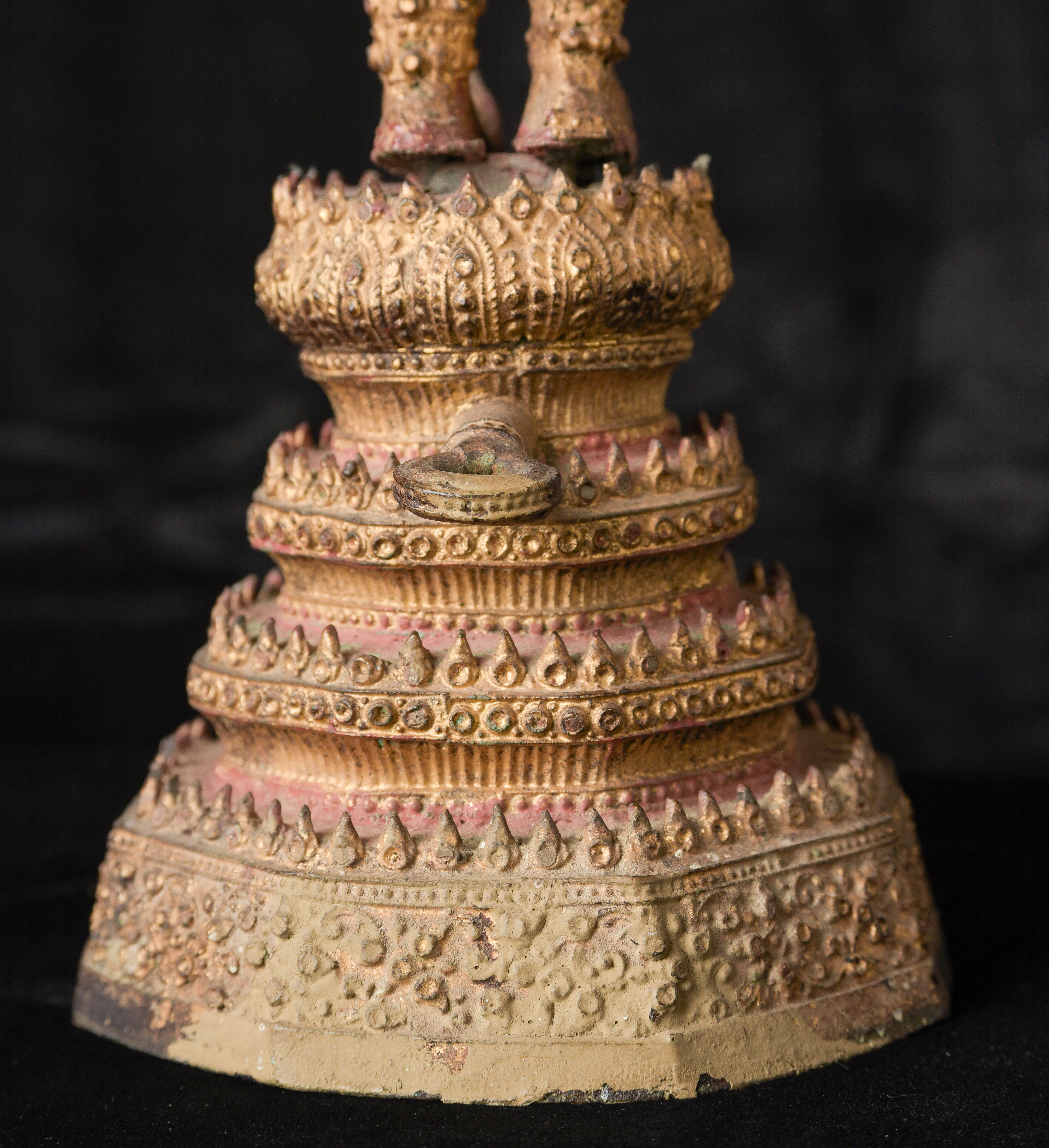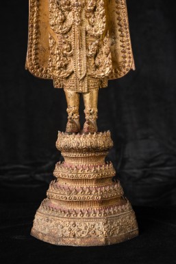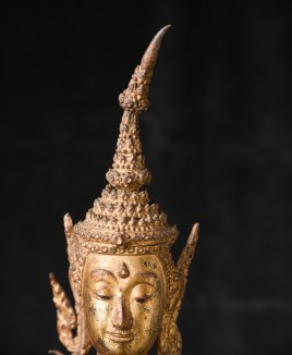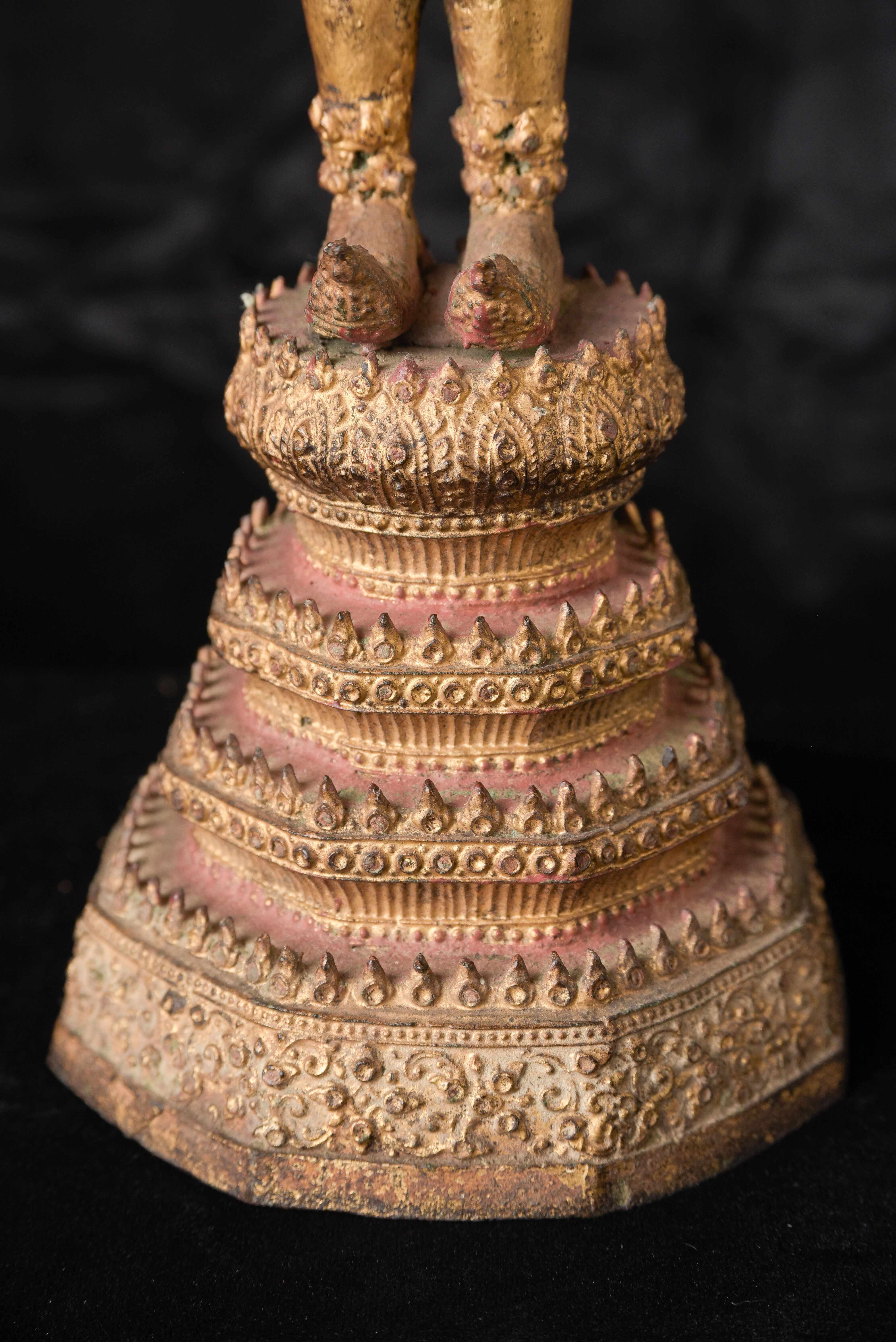 19thC Thai Rattanakosin standing bronze Buddha. A nice example of its type. Leans forward, though stands stably. Has a crooked finial. Overall condition is excellent, with many of the original tiny mirror-like decorations still in place. Good size at( 22.5"H x 5"W x 5"D ) - 10.3lbs