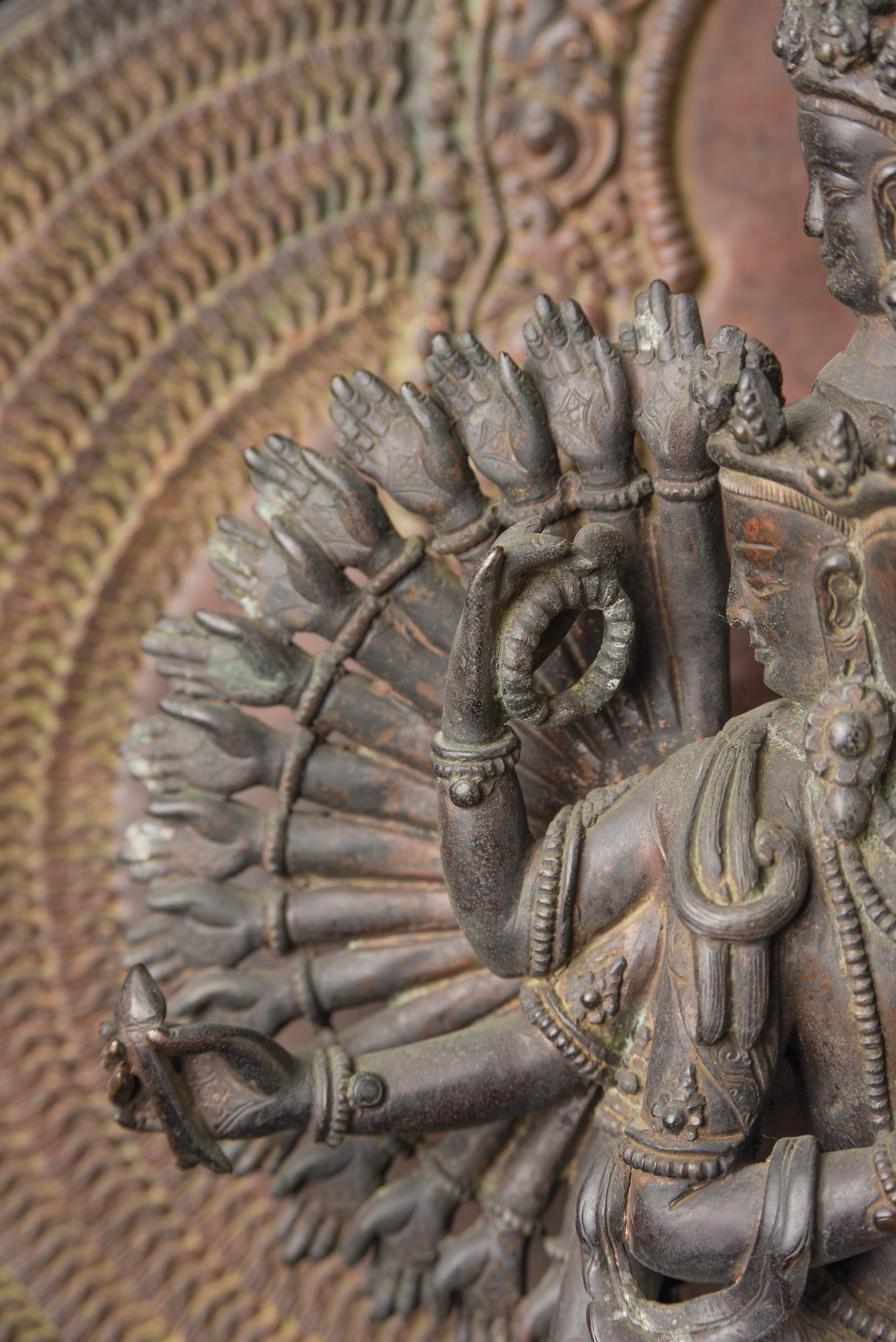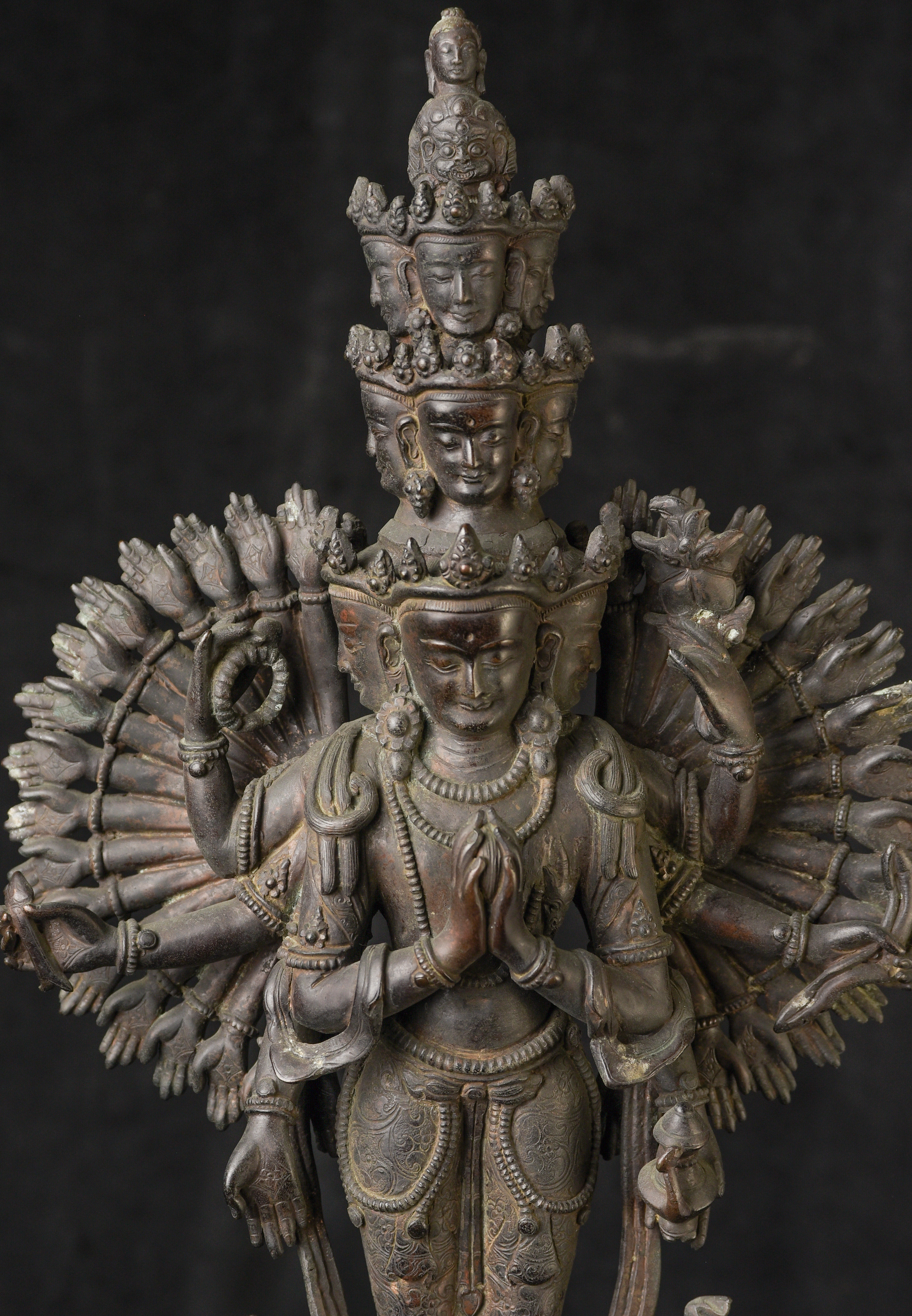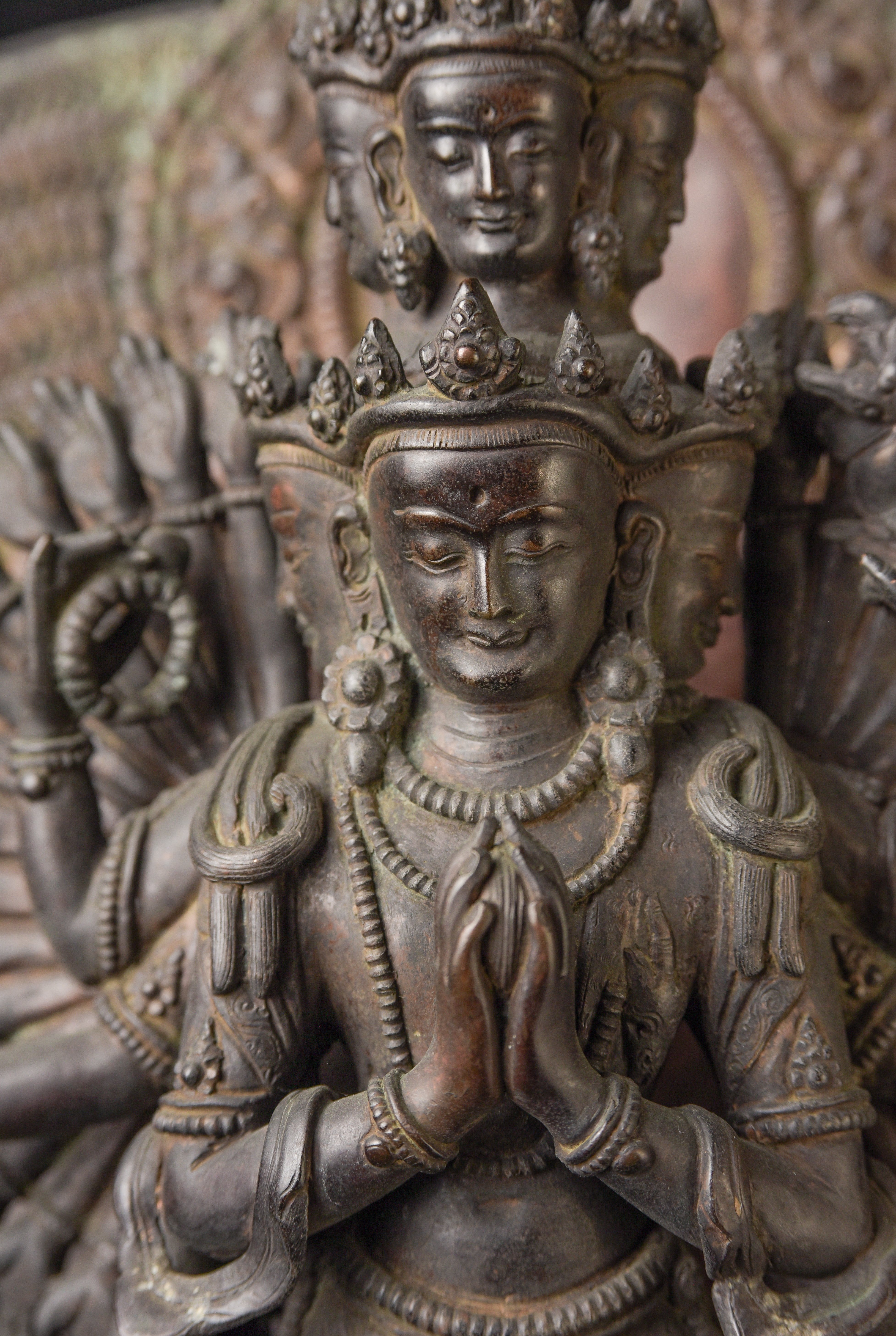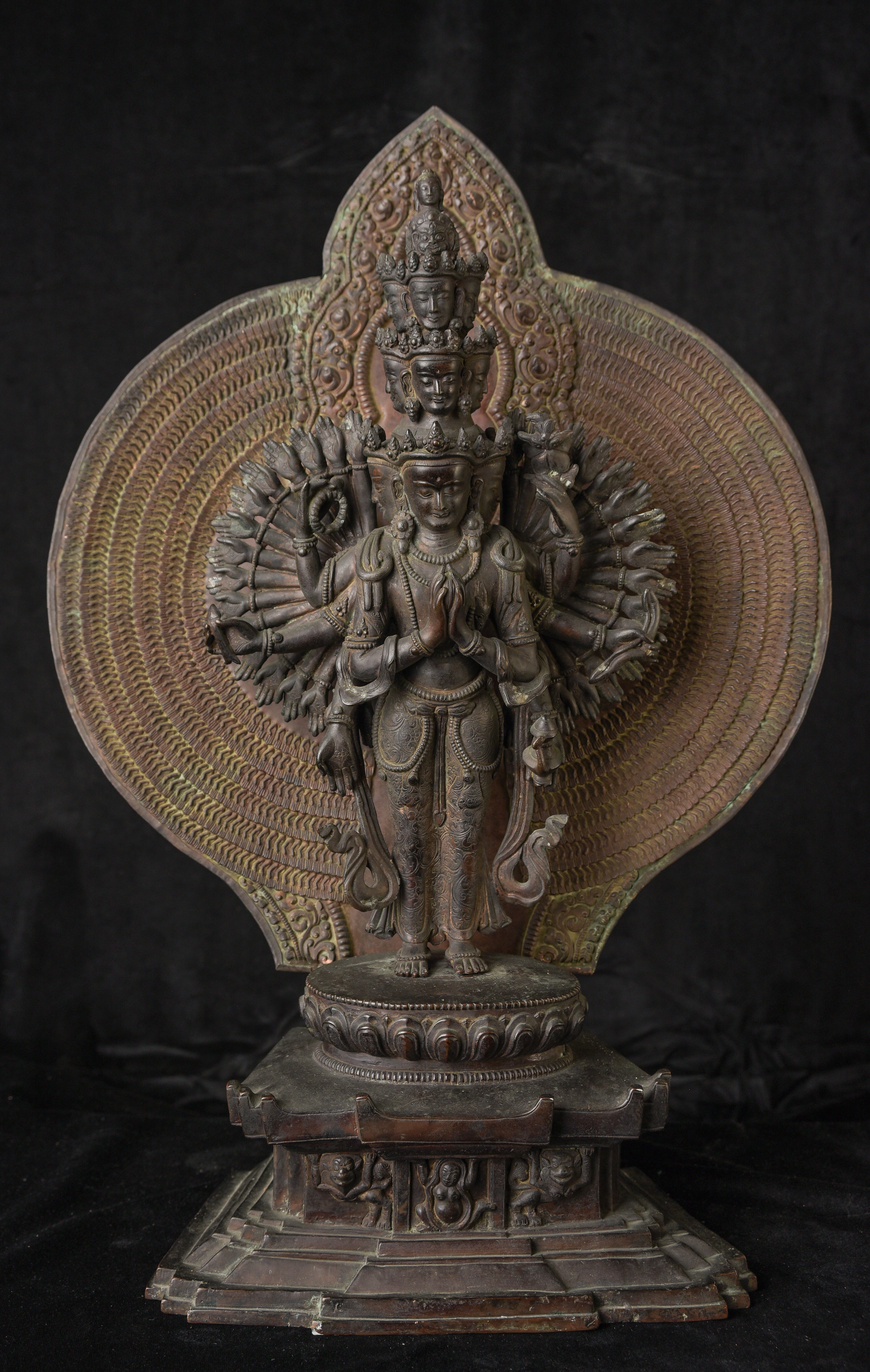 19th/20th century Thousand Arm Bodhisattva/Buddha of Compassion. Created in a number of parts, this sculpture was primarily done in copper using a repousse technique. I have seen a number of these in varying sizes and of different qualities and of different ages over the past 30+ years. This is the best one I have ever seen. That may even be including the ones I’ve seen in museums and high-end auction catalogs. Many of those were older or larger or more rare because their history, but this one is sculpted to an incredibly high level all the way through. I don’t know if there are actually 1000 arms (almost surely not that many), but every one is meticulously sculpted with tremendous care and with attention to meticulous detail.. Beyond that, all of the faces, including the smallest ones and the the fierce deity are all given a high level of attention and care. Very often the central figure/face is given great care and focus, but the lesser faces and the small hands and arms that are not easily seen are done in a more fugitive way. Spend time with the photos of this piece and you will see that every part of this rather large sculpture is sculpted carefully, and with great artistry and finesse. Beyond that it has a spiritual quality that radiates, especially from the central face.. Probably approaching 100 years old, based on the patina and the level of where, though it may be younger or slightly older. Period with a piece like this it’s not about the age as the skill and artistry of the maker, and the care that they put into every aspect of the piece is what shines brightly and which comes together to create this very special religious icon. Period a concept part into several pieces as you can see in the photos. No damage loss or repairs that I can see, only expectable wear from use and time. I purchased it from a collector who purchased it at an estate auction in germinate several years ago,. Very good size at 18.5"H x 14"W x 5.5"D . Weighs 13.63lbs