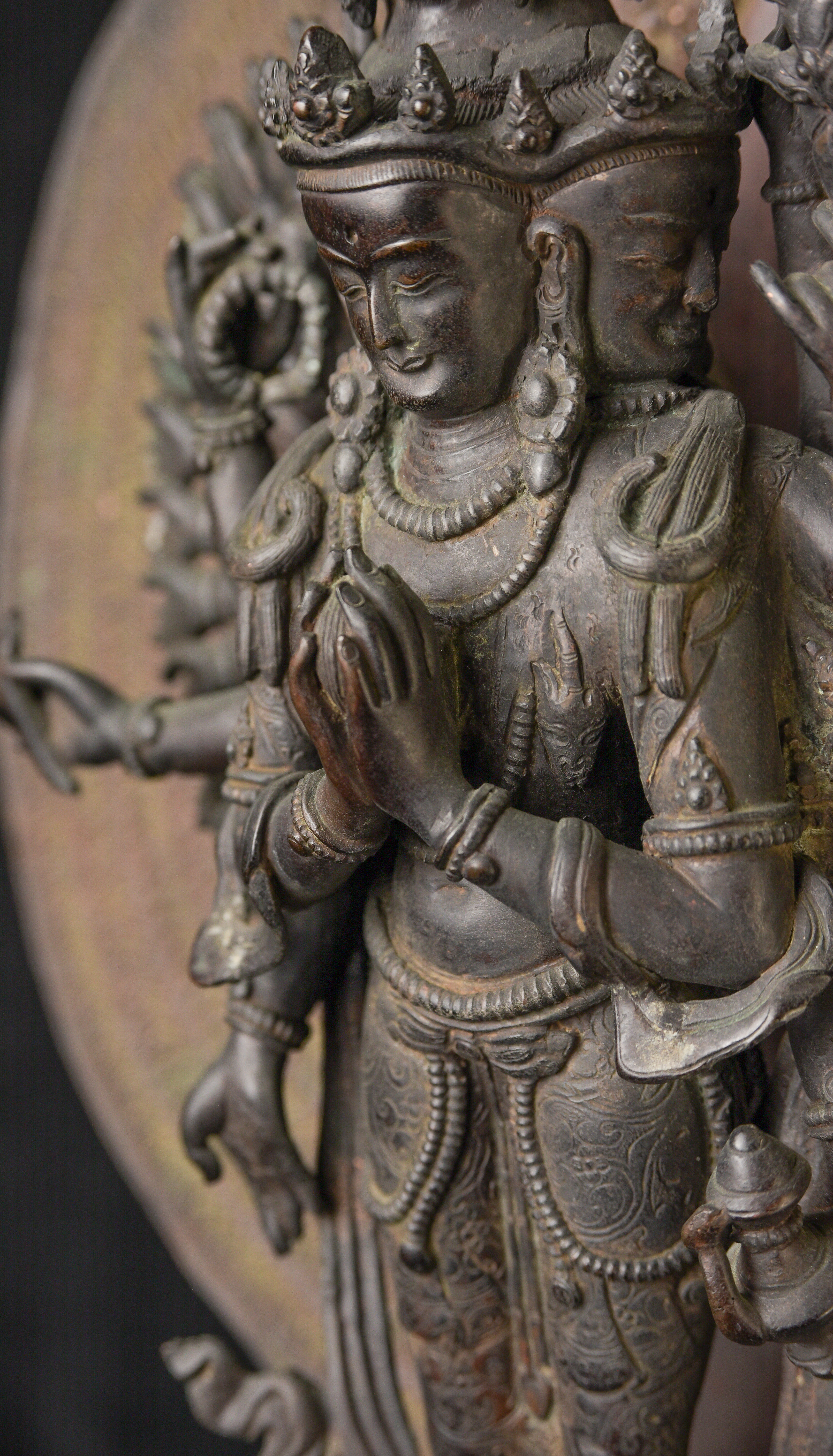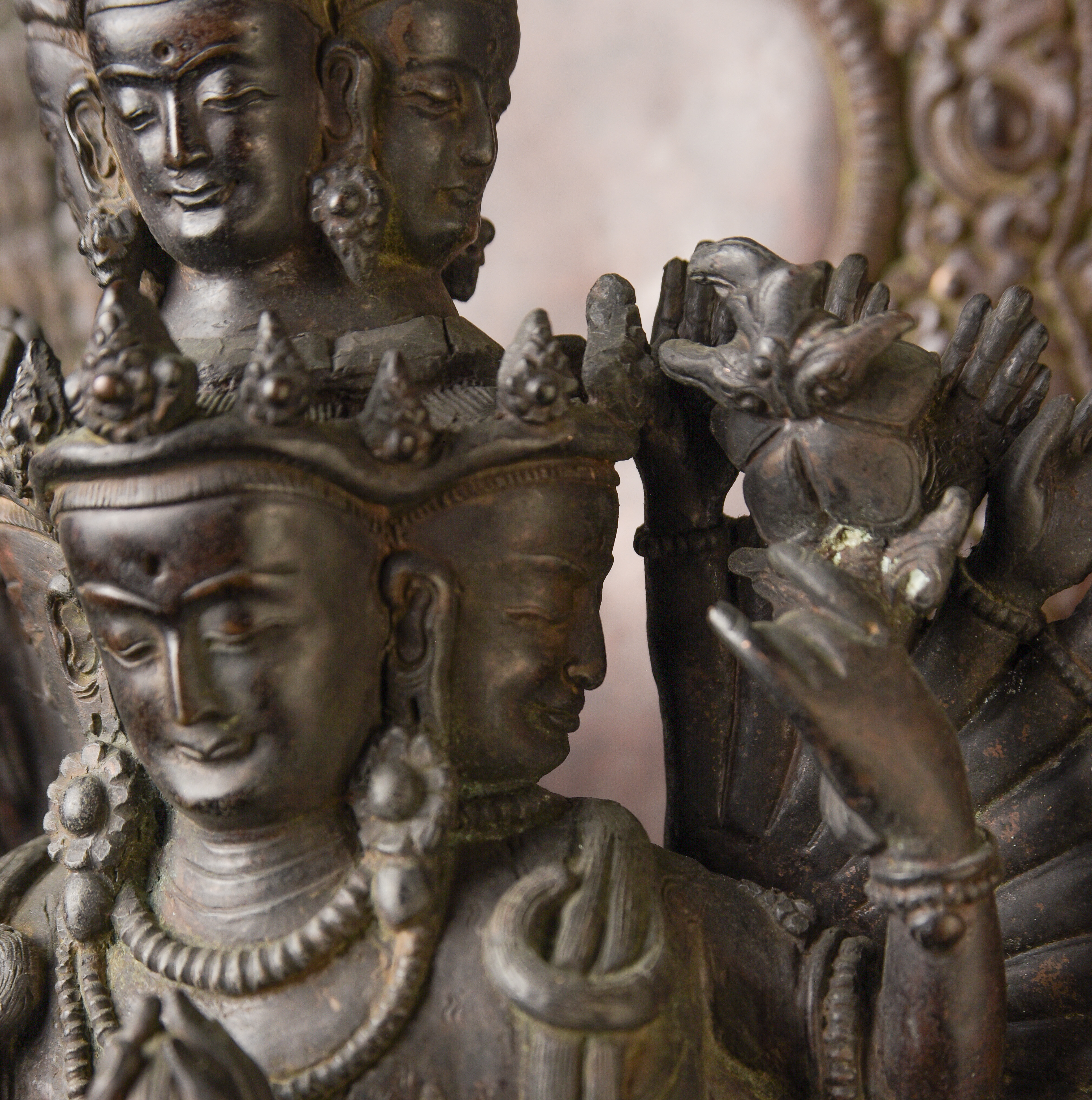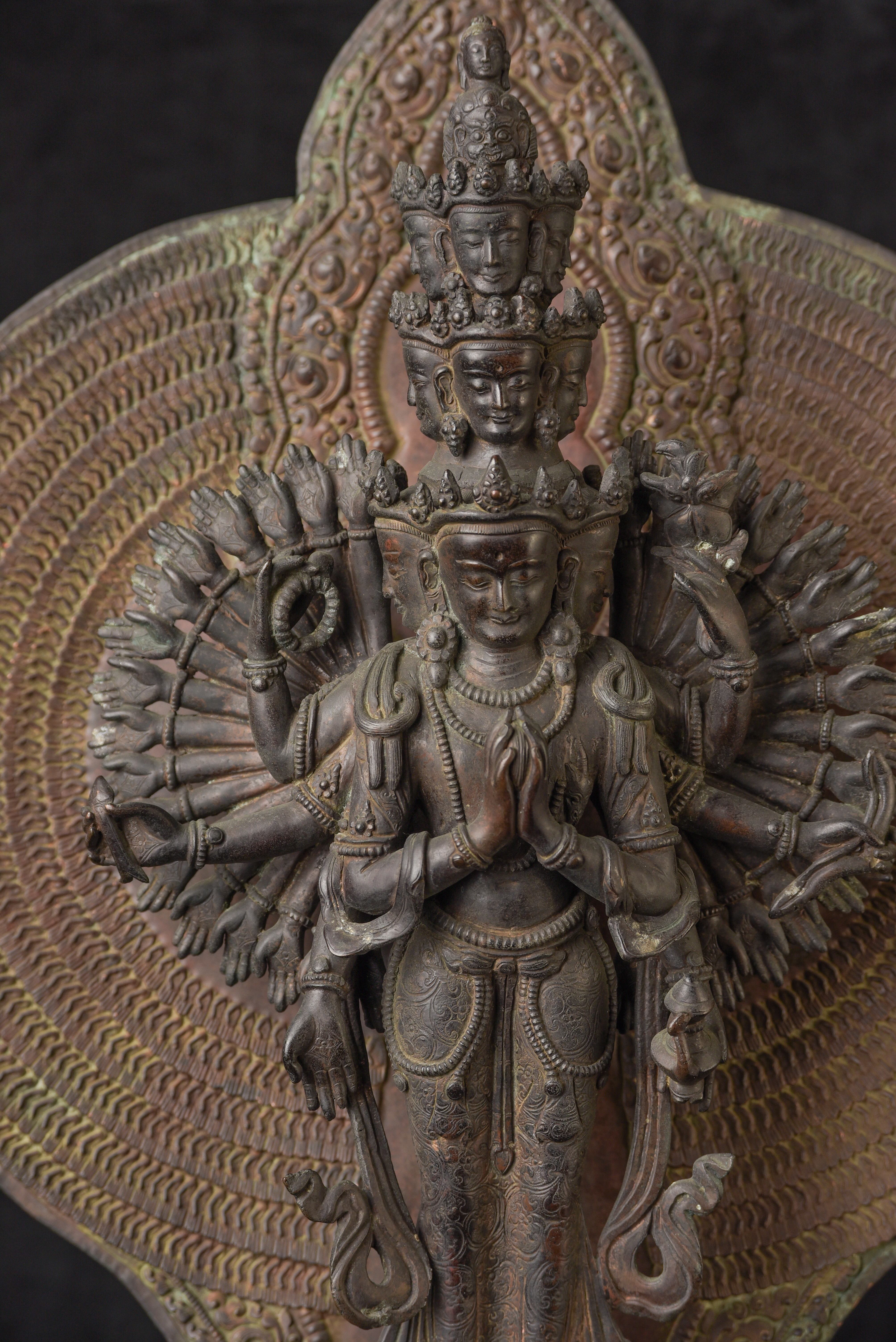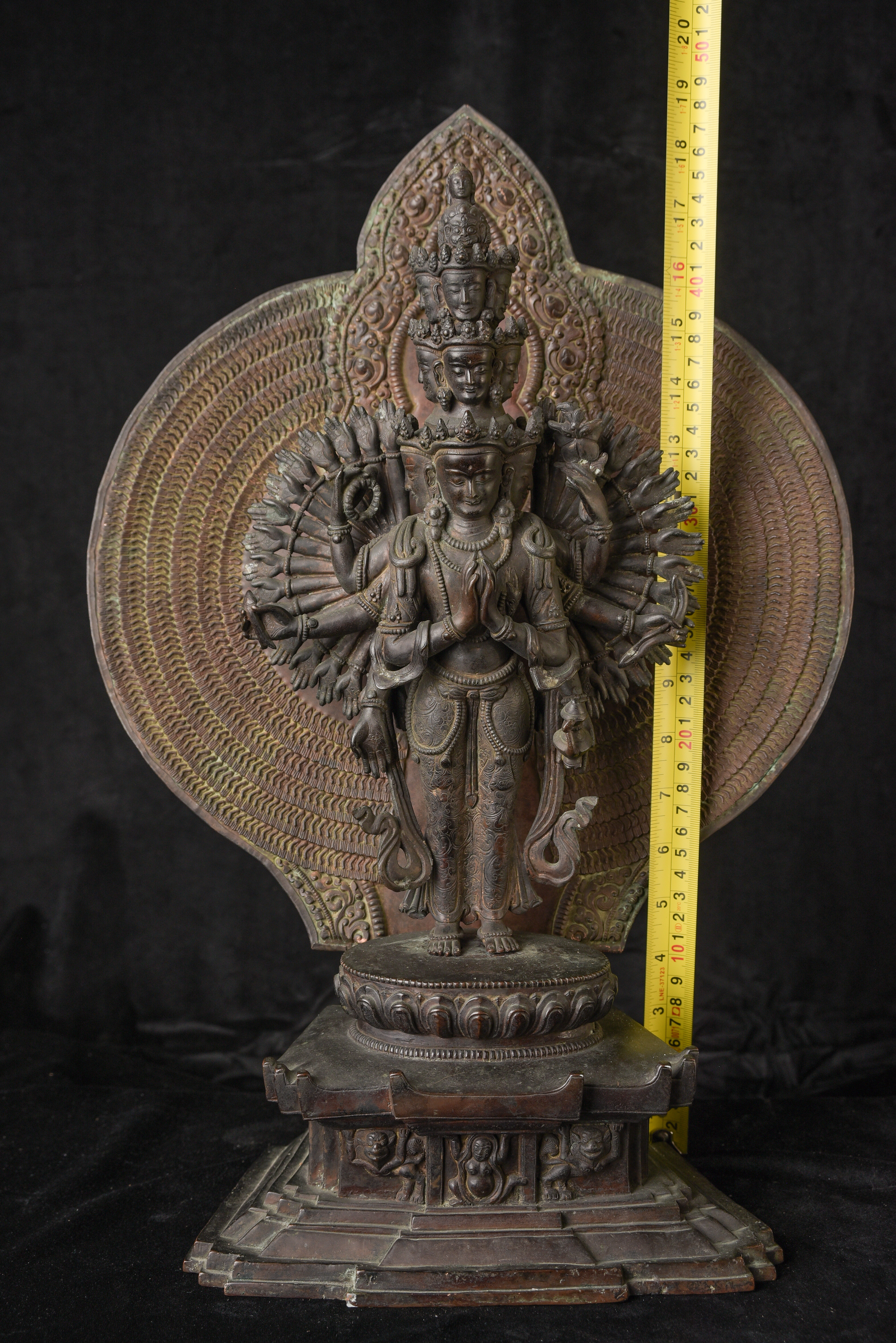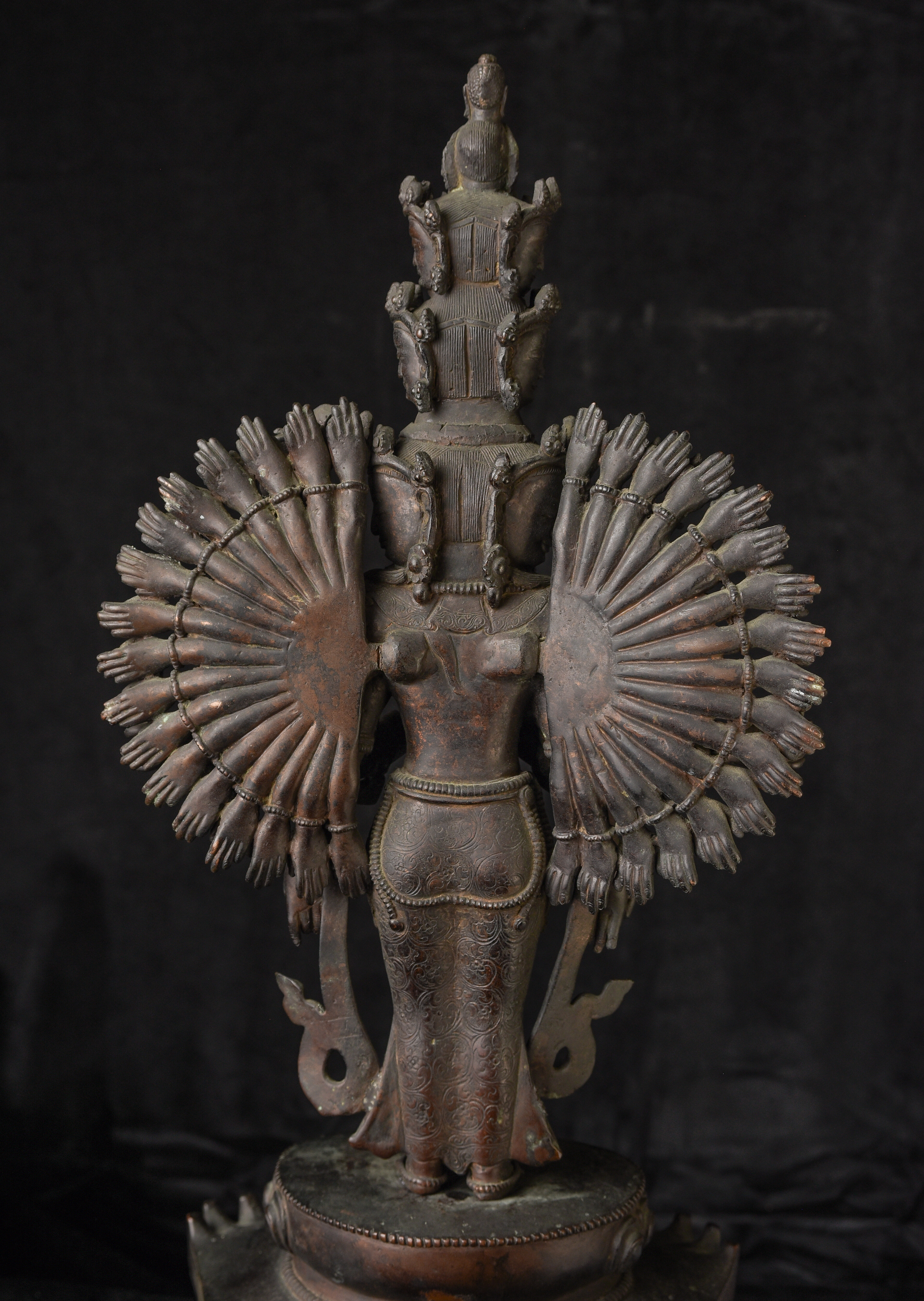 19th/20th century Thousand Arm Bodhisattva/Buddha of Compassion. Created in a number of parts, this sculpture was primarily done in copper using a repousse technique. I have seen a number of these in varying sizes and of different qualities and of different ages over the past 30+ years. This is the best one I have ever seen. That may even be including the ones I’ve seen in museums and high-end auction catalogs. Many of those were older or larger or more rare because their history, but this one is sculpted to an incredibly high level all the way through. I don’t know if there are actually 1000 arms (almost surely not that many), but every one is meticulously sculpted with tremendous care and with attention to meticulous detail.. Beyond that, all of the faces, including the smallest ones and the the fierce deity are all given a high level of attention and care. Very often the central figure/face is given great care and focus, but the lesser faces and the small hands and arms that are not easily seen are done in a more fugitive way. Spend time with the photos of this piece and you will see that every part of this rather large sculpture is sculpted carefully, and with great artistry and finesse. Beyond that it has a spiritual quality that radiates, especially from the central face.. Probably approaching 100 years old, based on the patina and the level of where, though it may be younger or slightly older. Period with a piece like this it’s not about the age as the skill and artistry of the maker, and the care that they put into every aspect of the piece is what shines brightly and which comes together to create this very special religious icon. Period a concept part into several pieces as you can see in the photos. No damage loss or repairs that I can see, only expectable wear from use and time. I purchased it from a collector who purchased it at an estate auction in germinate several years ago,. Very good size at 18.5"H x 14"W x 5.5"D . Weighs 13.63lbs