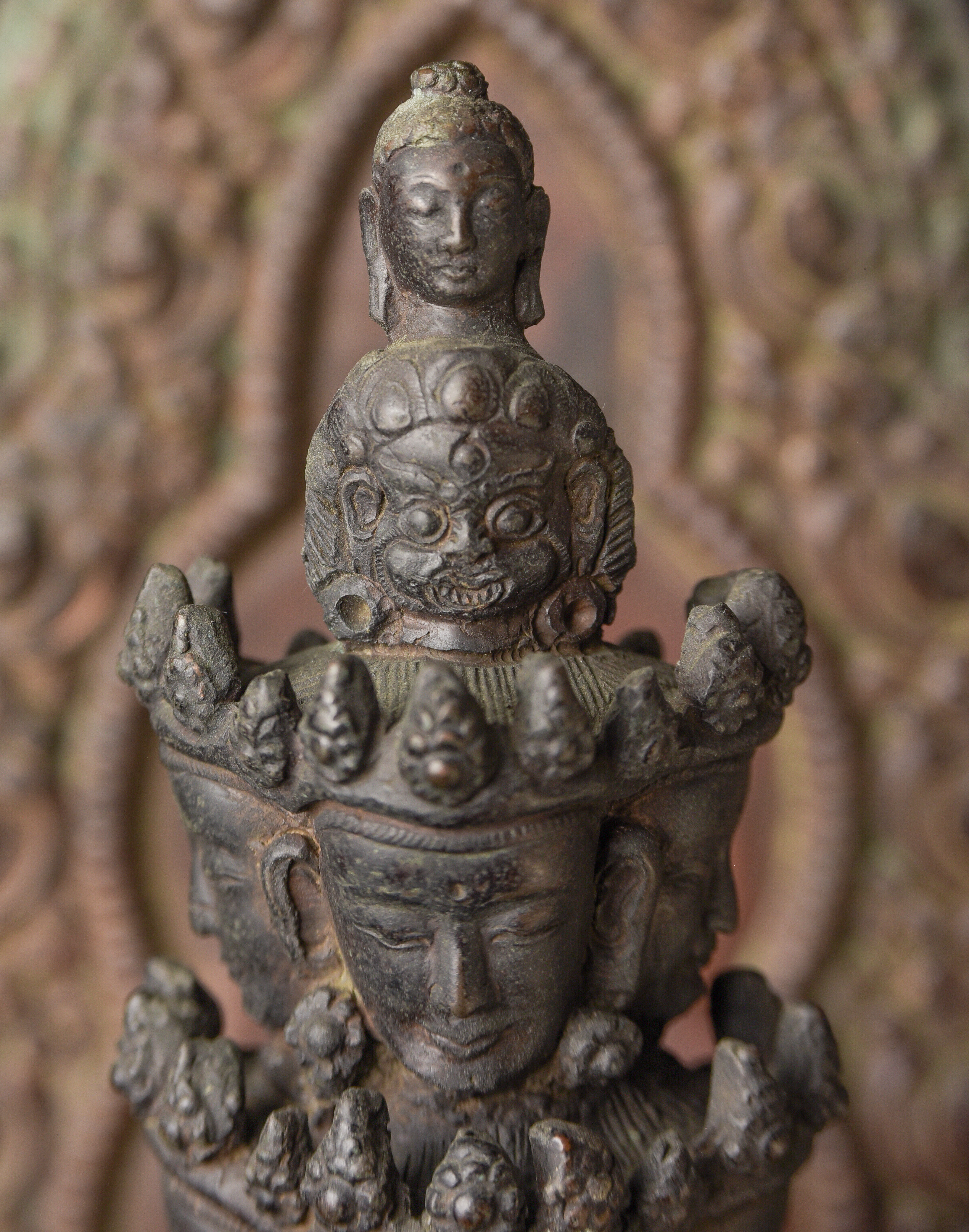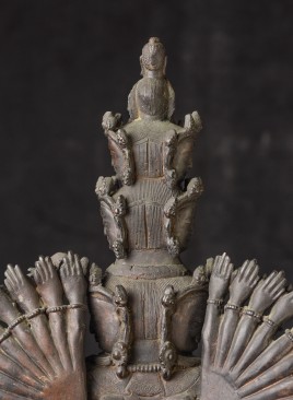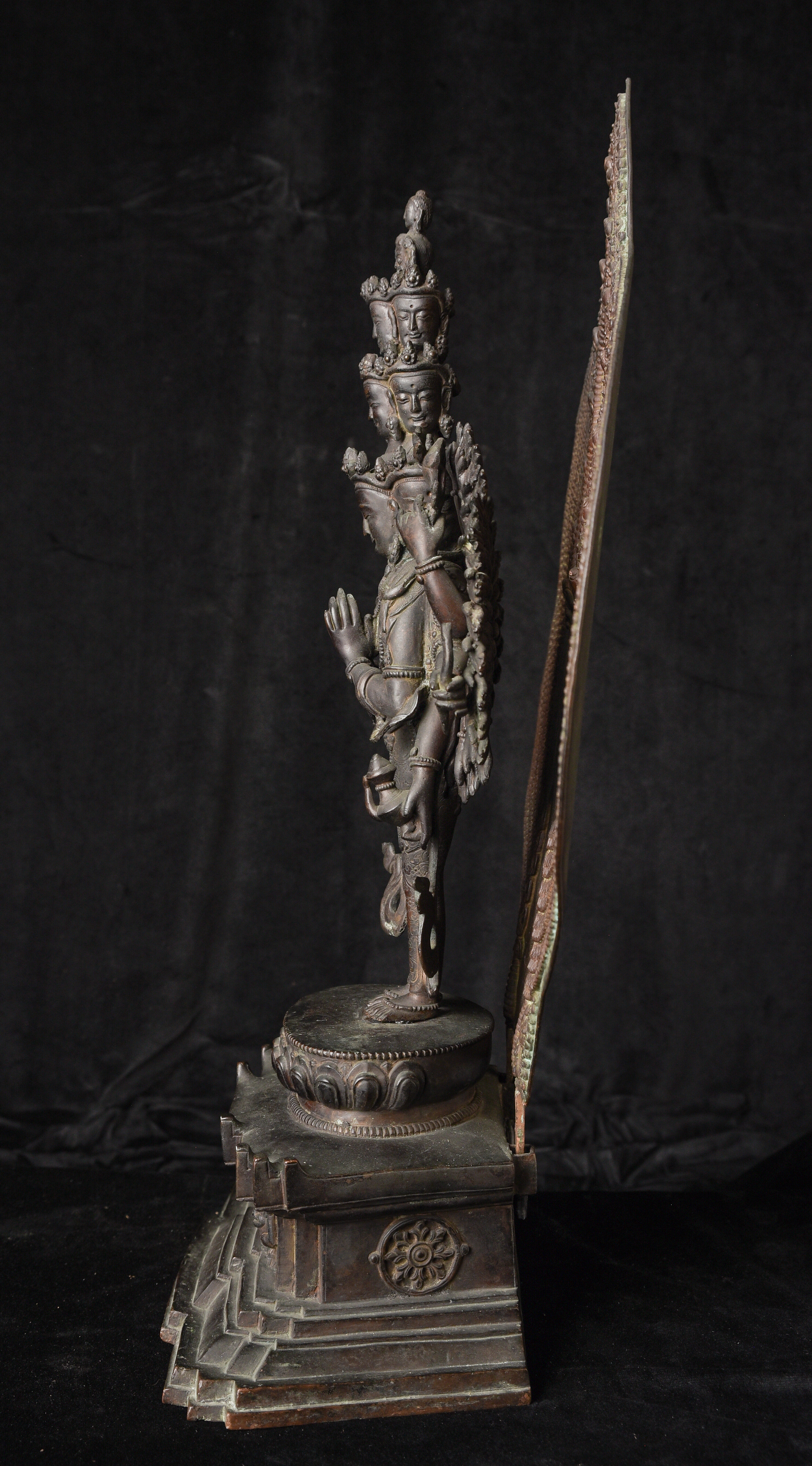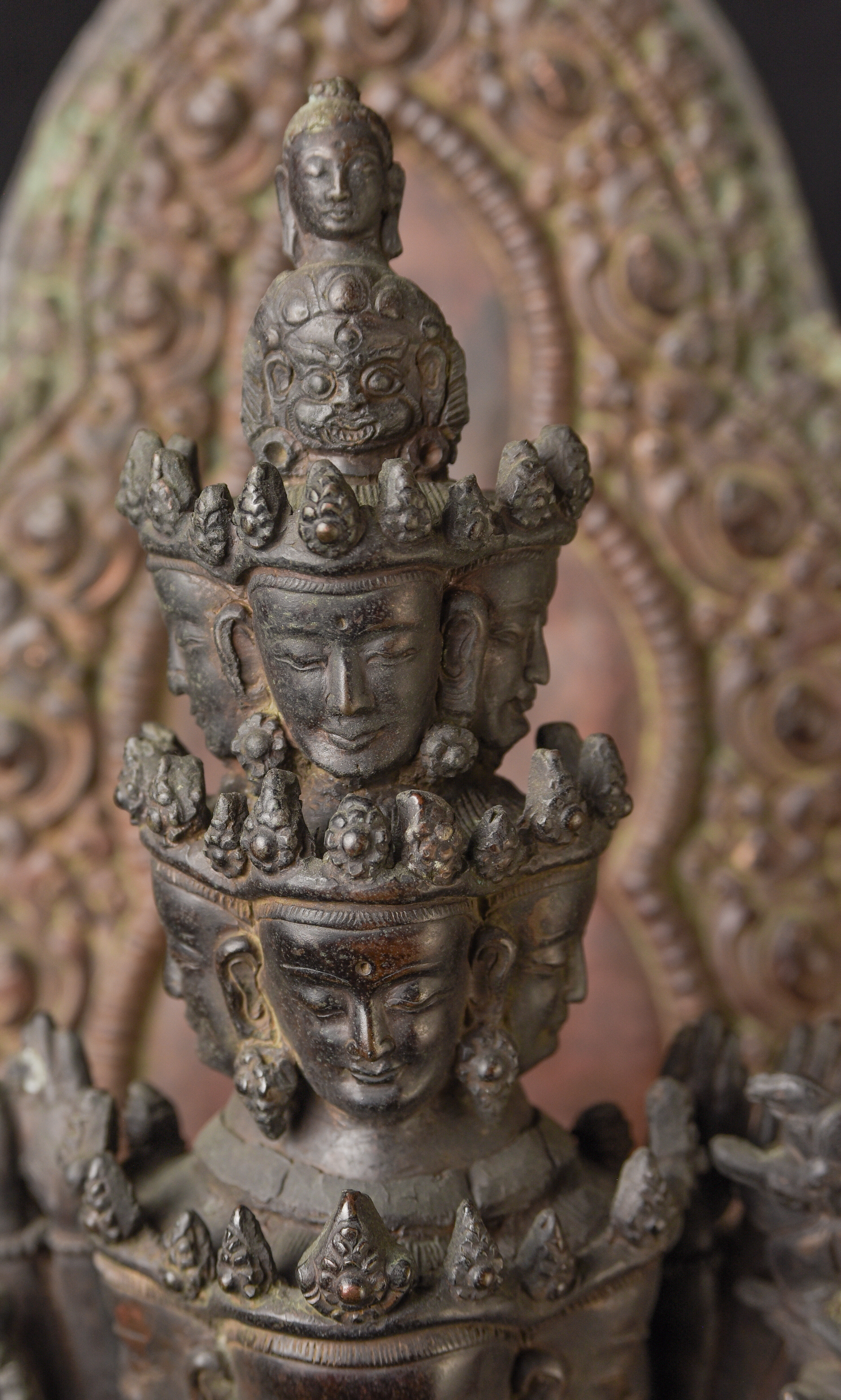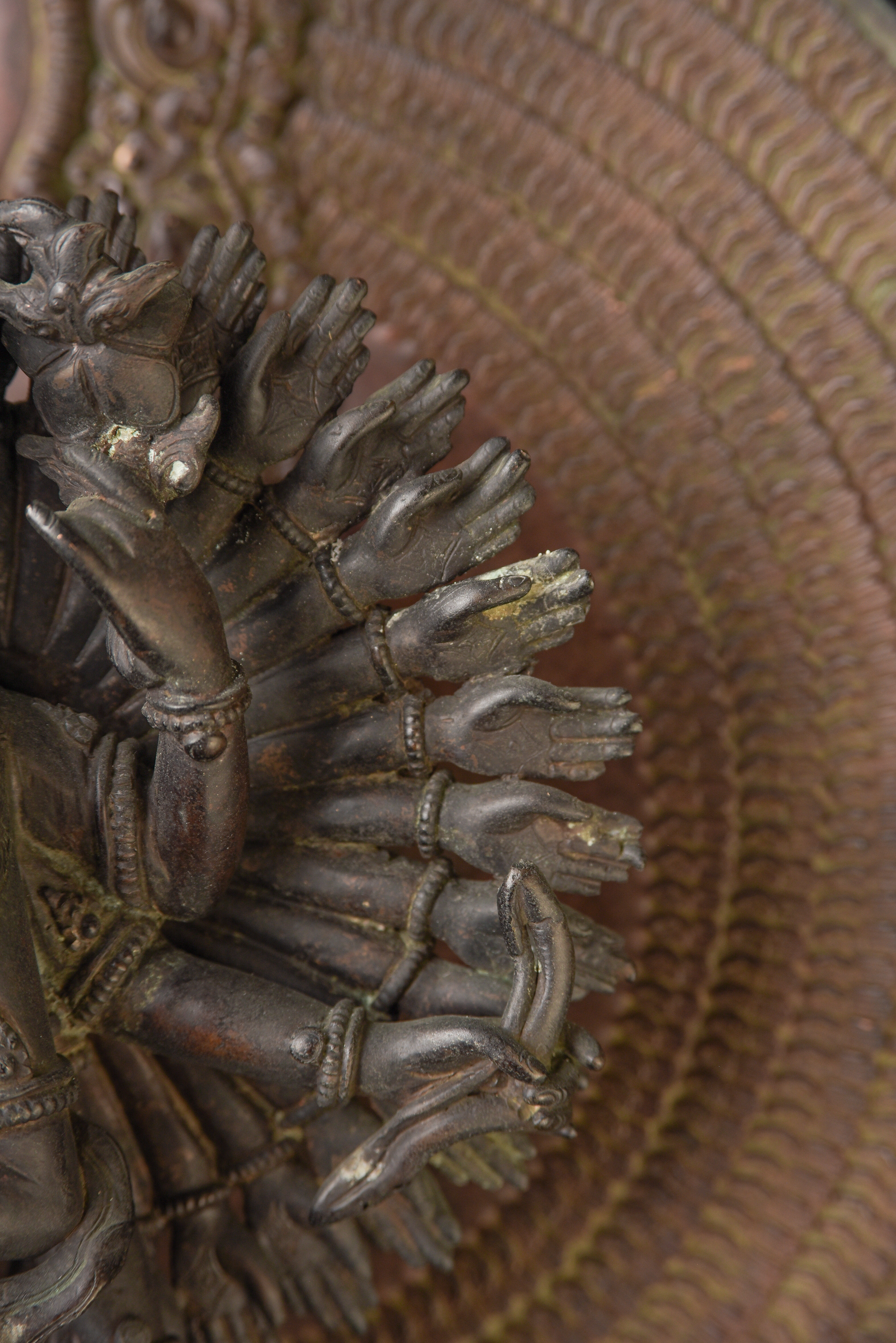 19th/20th century Thousand Arm Bodhisattva/Buddha of Compassion. Created in a number of parts, this sculpture was primarily done in copper using a repousse technique. I have seen a number of these in varying sizes and of different qualities and of different ages over the past 30+ years. This is the best one I have ever seen. That may even be including the ones I’ve seen in museums and high-end auction catalogs. Many of those were older or larger or more rare because their history, but this one is sculpted to an incredibly high level all the way through. I don’t know if there are actually 1000 arms (almost surely not that many), but every one is meticulously sculpted with tremendous care and with attention to meticulous detail.. Beyond that, all of the faces, including the smallest ones and the the fierce deity are all given a high level of attention and care. Very often the central figure/face is given great care and focus, but the lesser faces and the small hands and arms that are not easily seen are done in a more fugitive way. Spend time with the photos of this piece and you will see that every part of this rather large sculpture is sculpted carefully, and with great artistry and finesse. Beyond that it has a spiritual quality that radiates, especially from the central face.. Probably approaching 100 years old, based on the patina and the level of where, though it may be younger or slightly older. Period with a piece like this it’s not about the age as the skill and artistry of the maker, and the care that they put into every aspect of the piece is what shines brightly and which comes together to create this very special religious icon. Period a concept part into several pieces as you can see in the photos. No damage loss or repairs that I can see, only expectable wear from use and time. I purchased it from a collector who purchased it at an estate auction in germinate several years ago,. Very good size at 18.5"H x 14"W x 5.5"D . Weighs 13.63lbs