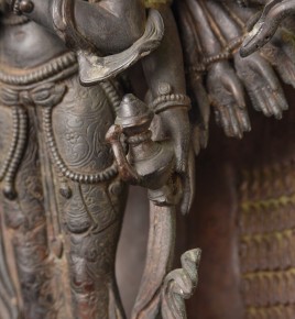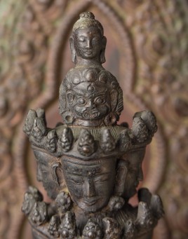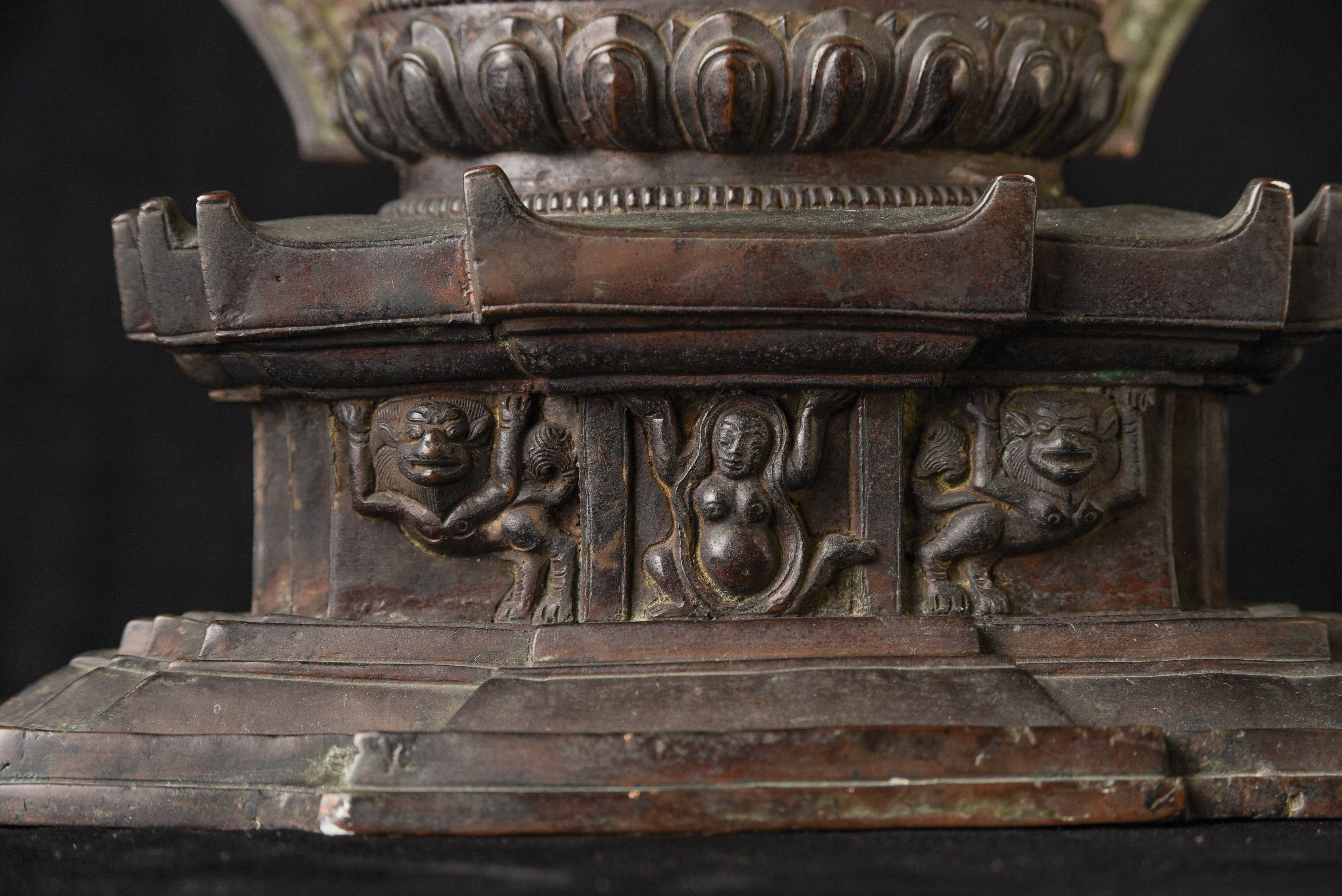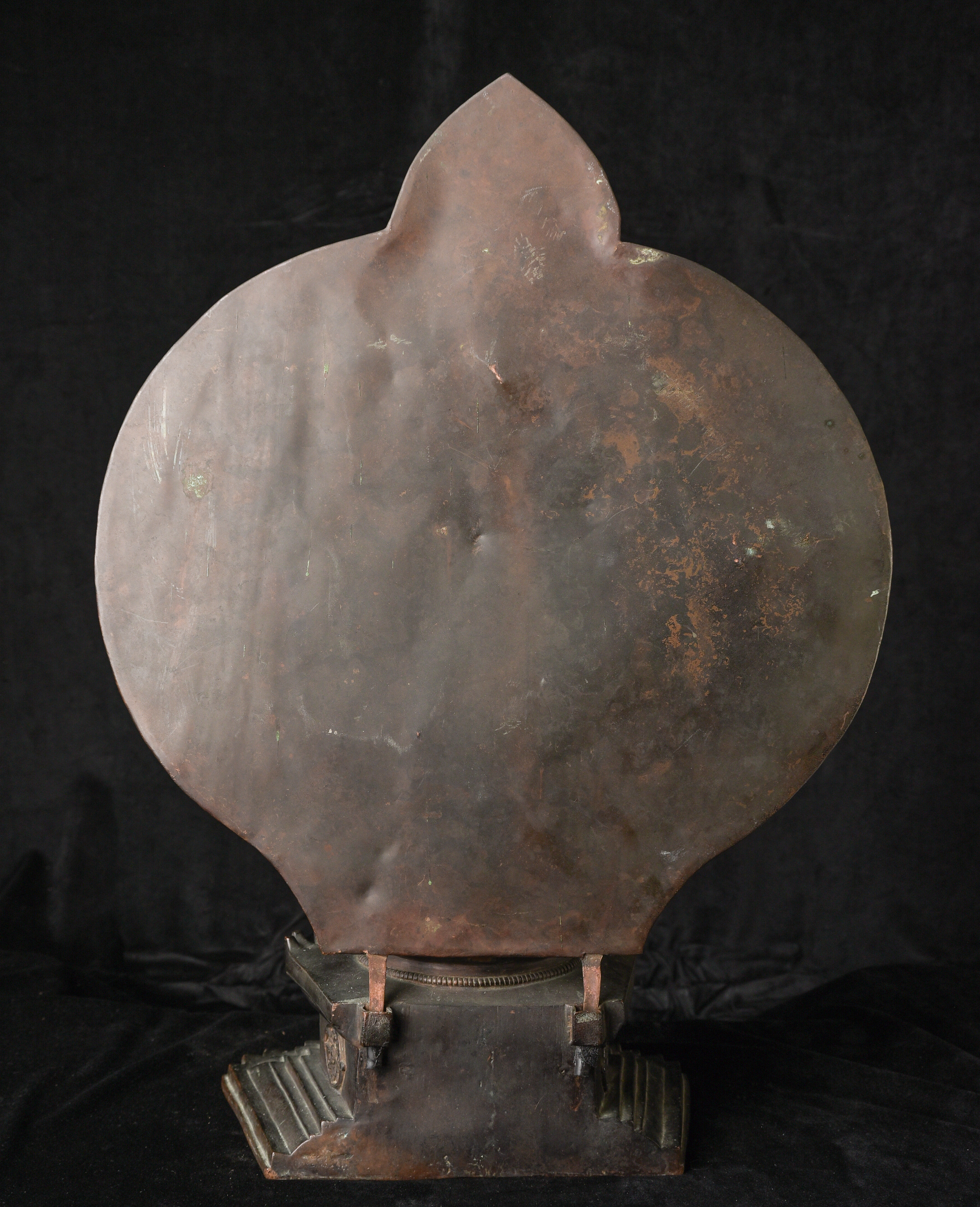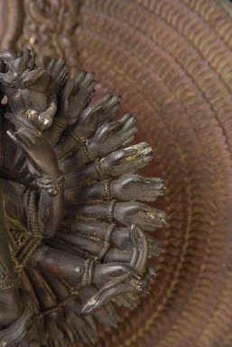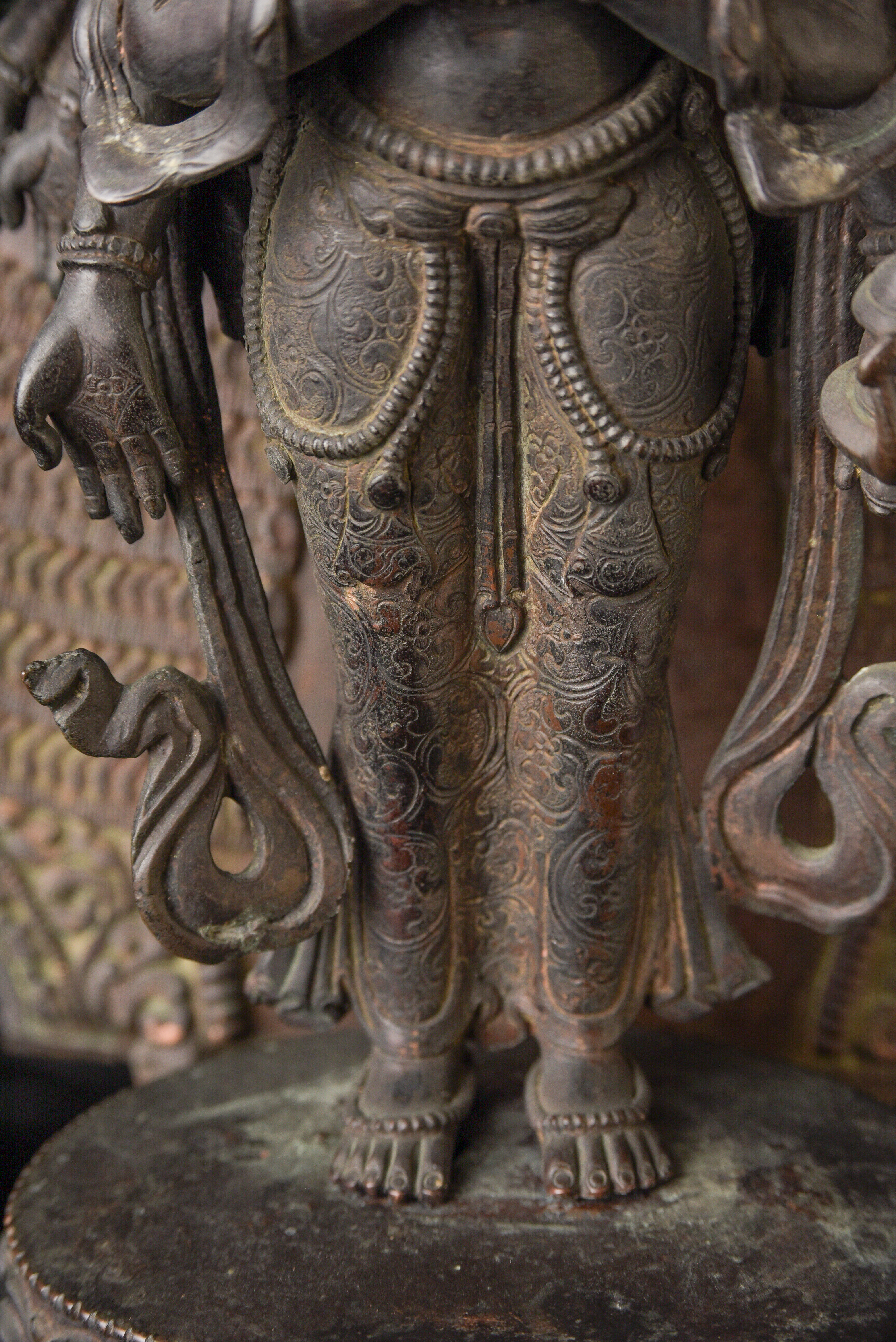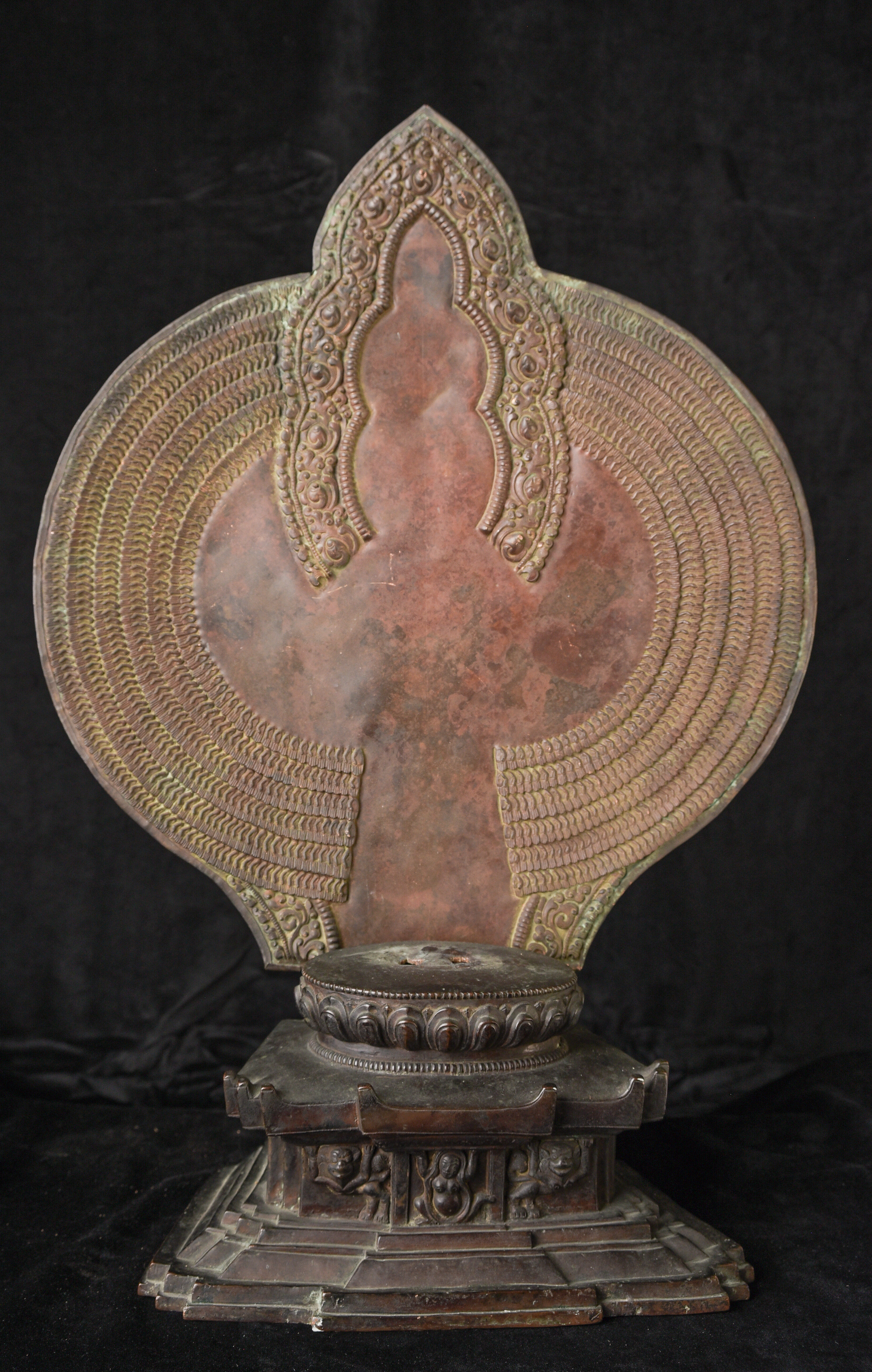 19th/20th century Thousand Arm Bodhisattva/Buddha of Compassion. Created in a number of parts, this sculpture was primarily done in copper using a repousse technique. I have seen a number of these in varying sizes and of different qualities and of different ages over the past 30+ years. This is the best one I have ever seen. That may even be including the ones I’ve seen in museums and high-end auction catalogs. Many of those were older or larger or more rare because their history, but this one is sculpted to an incredibly high level all the way through. I don’t know if there are actually 1000 arms (almost surely not that many), but every one is meticulously sculpted with tremendous care and with attention to meticulous detail.. Beyond that, all of the faces, including the smallest ones and the the fierce deity are all given a high level of attention and care. Very often the central figure/face is given great care and focus, but the lesser faces and the small hands and arms that are not easily seen are done in a more fugitive way. Spend time with the photos of this piece and you will see that every part of this rather large sculpture is sculpted carefully, and with great artistry and finesse. Beyond that it has a spiritual quality that radiates, especially from the central face.. Probably approaching 100 years old, based on the patina and the level of where, though it may be younger or slightly older. Period with a piece like this it’s not about the age as the skill and artistry of the maker, and the care that they put into every aspect of the piece is what shines brightly and which comes together to create this very special religious icon. Period a concept part into several pieces as you can see in the photos. No damage loss or repairs that I can see, only expectable wear from use and time. I purchased it from a collector who purchased it at an estate auction in germinate several years ago,. Very good size at 18.5"H x 14"W x 5.5"D . Weighs 13.63lbs