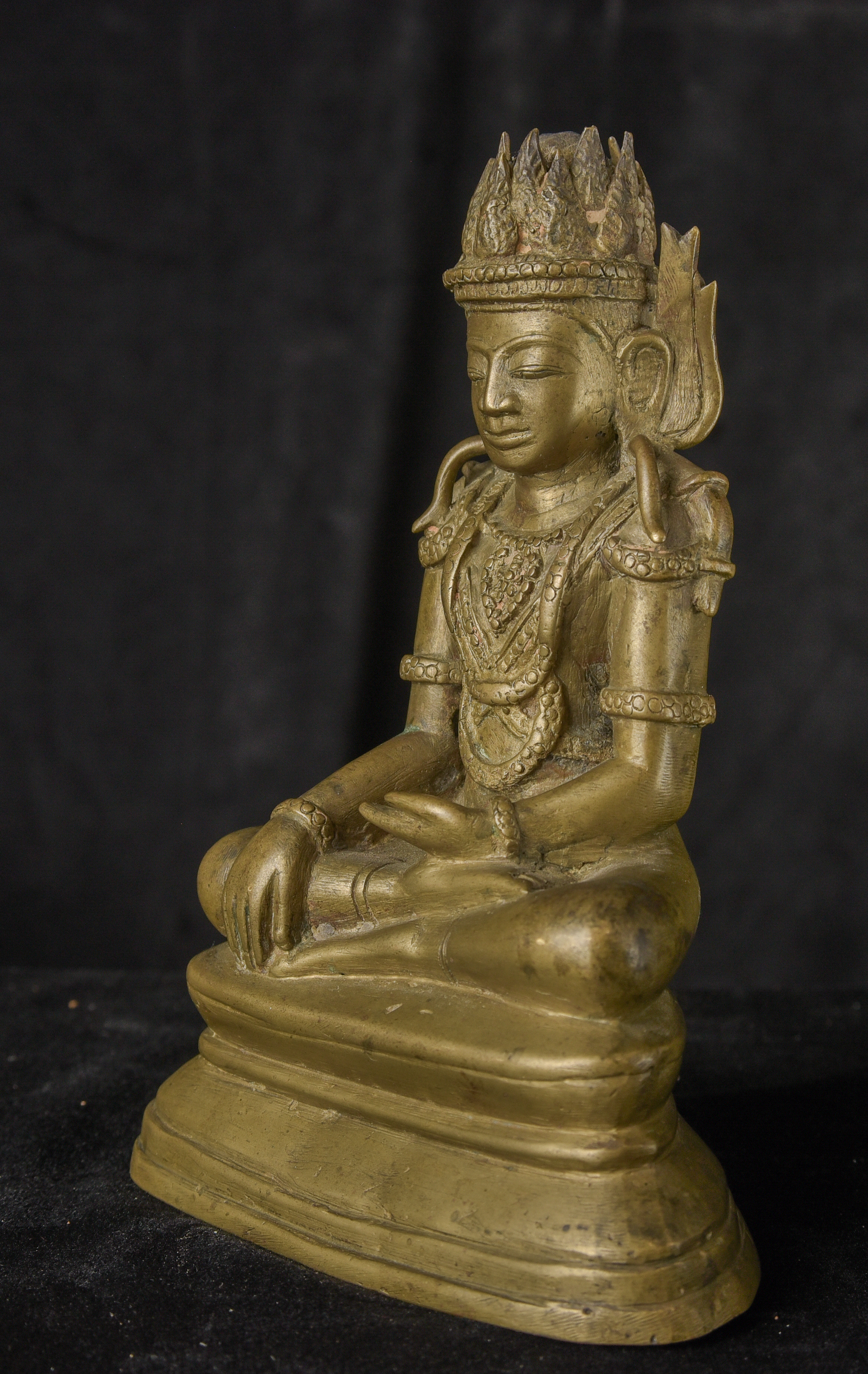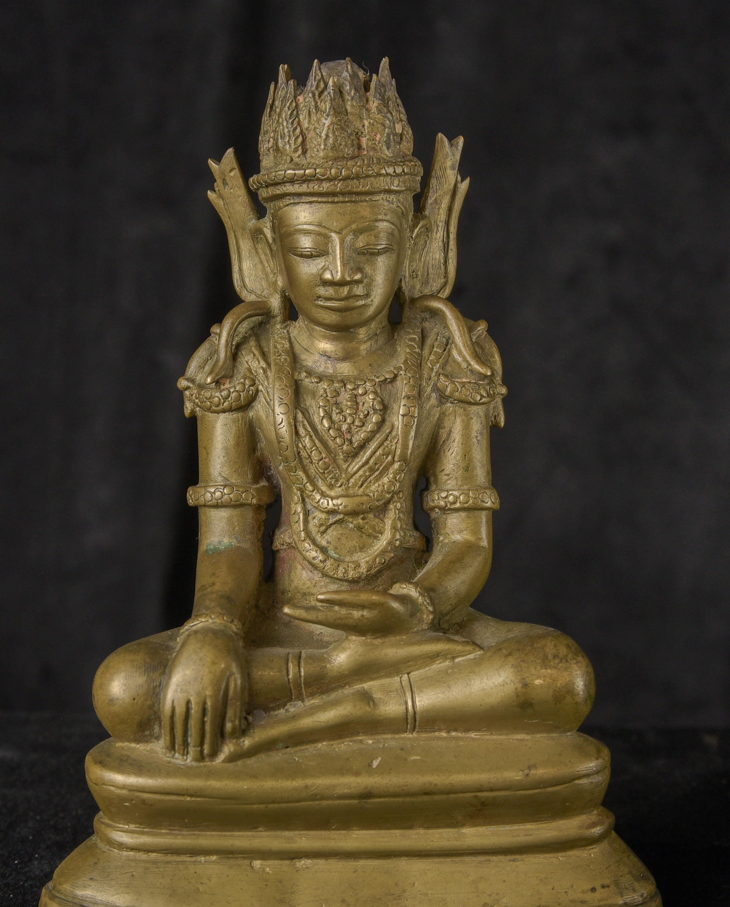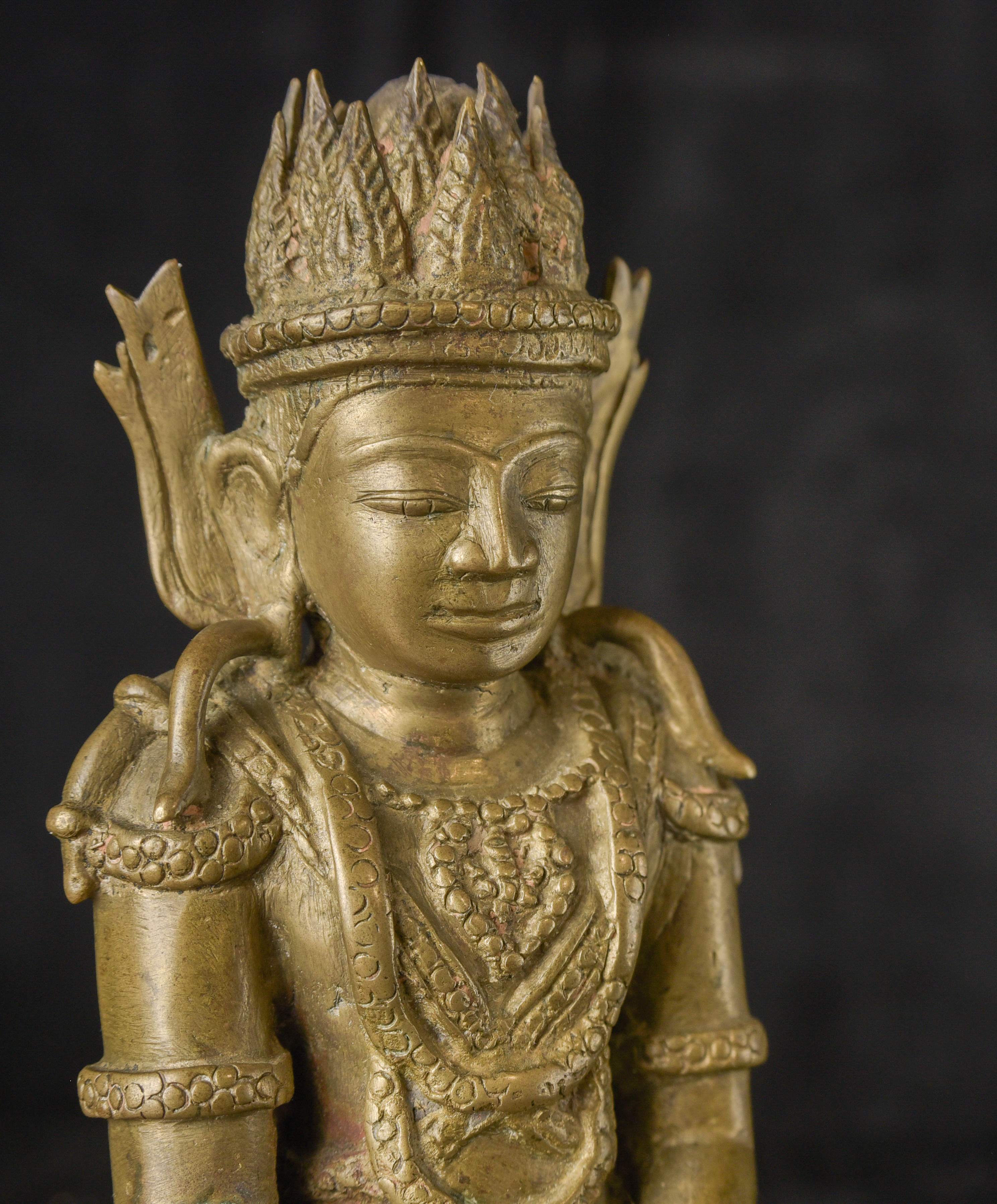 19th century Burmese, Arakan style bronze, or brass Buddha. Very nice face, very unusual and complex crown. This is an uncommon type that I’ve seen very few of over the years. A very appealing ( 6.5"H x 4.75"W x 2.5"D ) - 1.52lbs