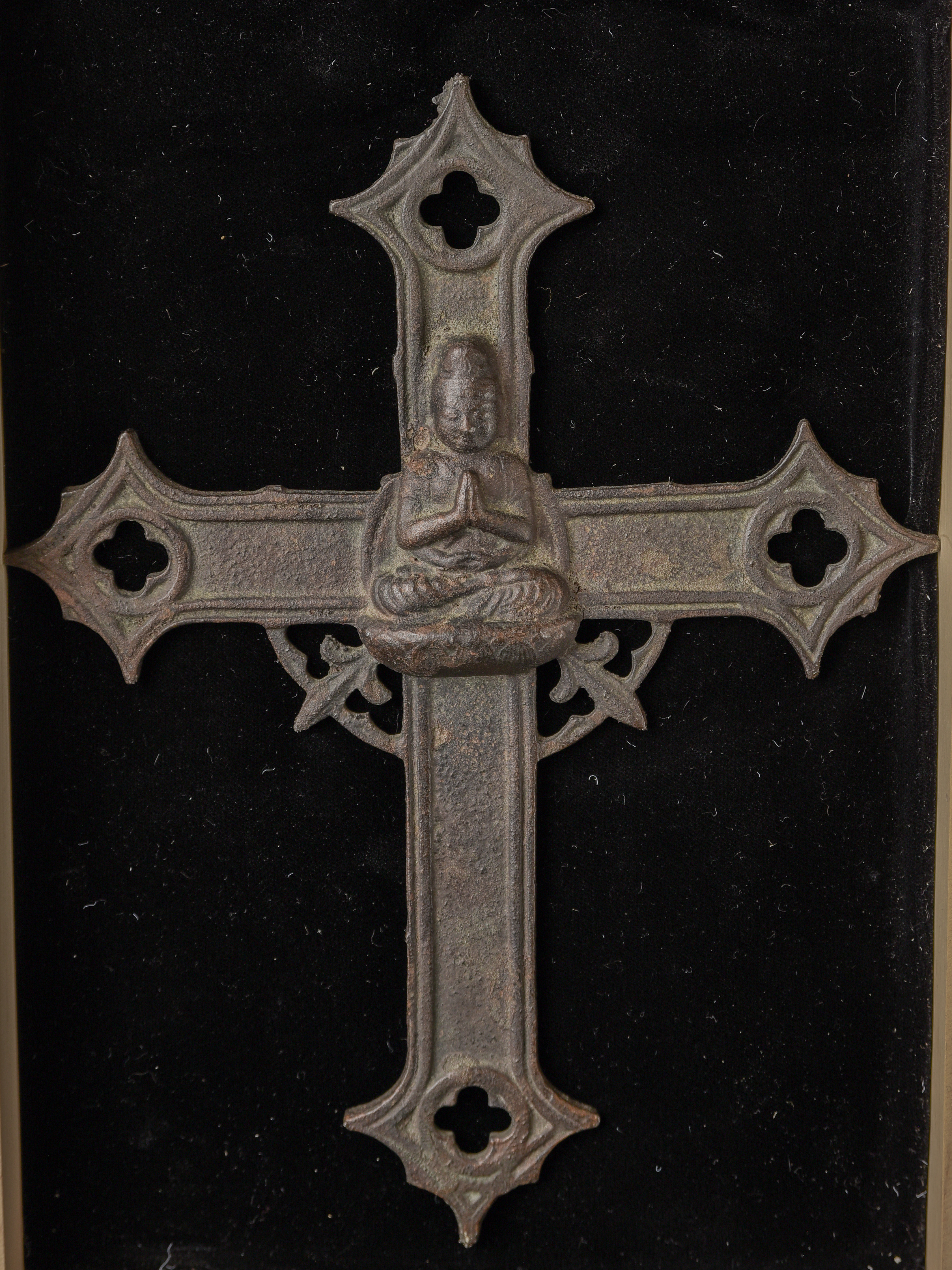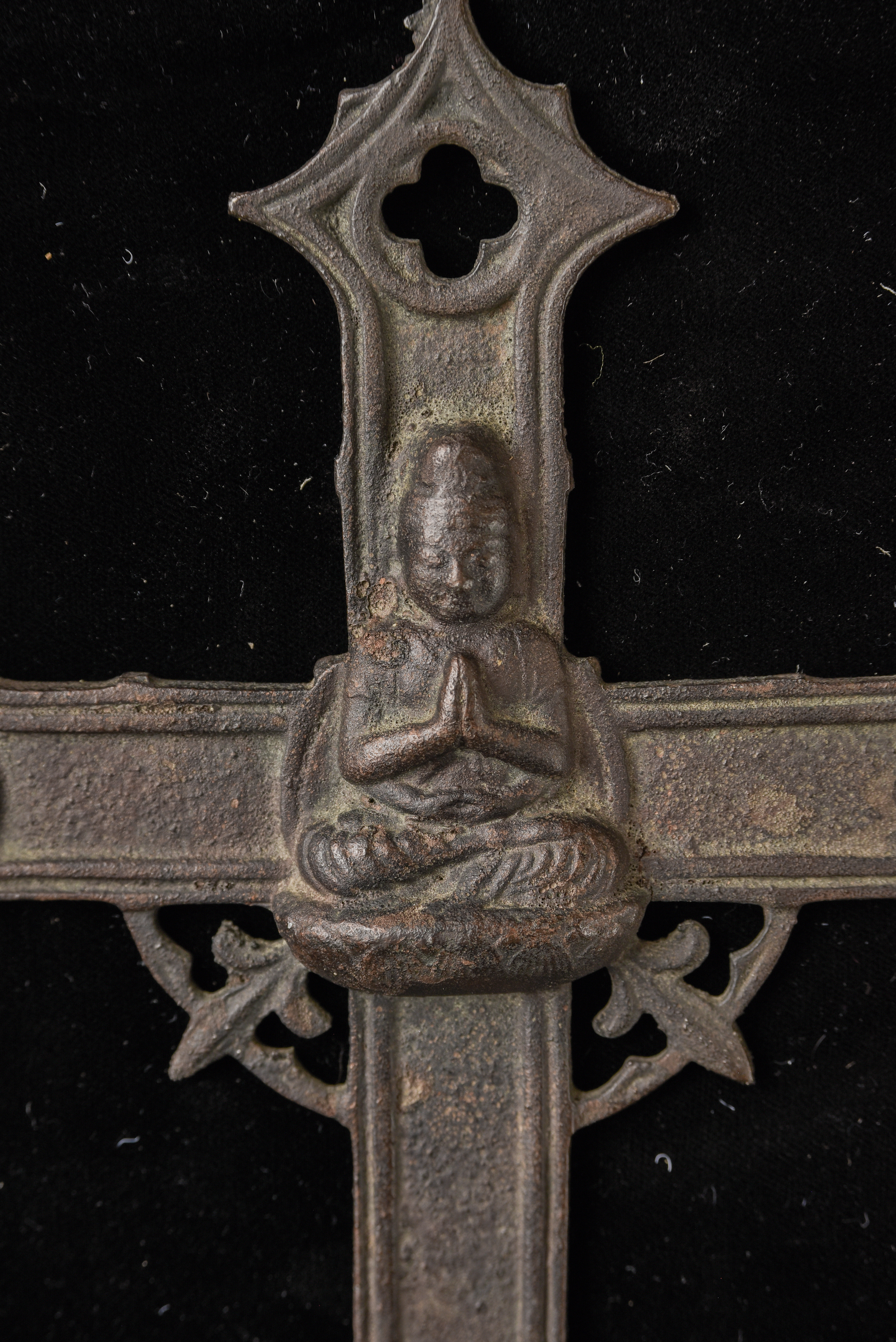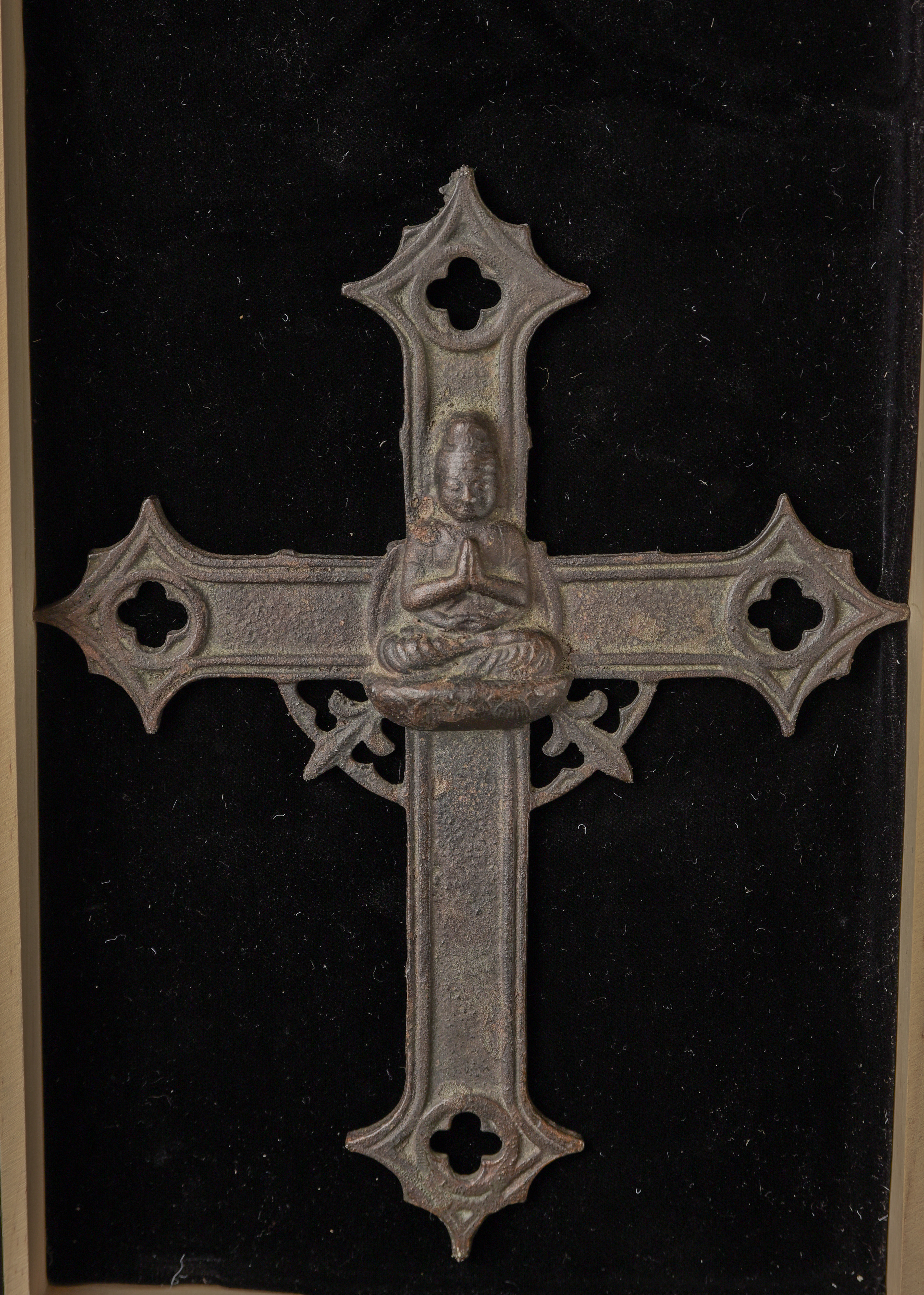 Very rare 16/17thC Japanese Bronze Cross with Buddha. I've owned a number of other iron examples of this over the past 30 years, and seen one other at auction. I've also owned 2 bronze examples, which are less common. I've been told they were used by early Japanese Christians, as they were persecuted by the Shoguns, and wanted to show that they still respected the Buddha and "Honored their Elders" -the decorative scroll work that you see in the very center of the cross on the lower half, probably was also on the upper half when the piece was first made, but it is now long gone. I only know this because I have seen several other examples of this type of cross and the others all have the decorative scrollwork on the top and bottom halves. If you go into the advance search feature on my website and look under both sold and for sale and put in “cross” as a search word, and Japan as the country, you will see the ones I sold in the past, and one other that I currently have available. This one has a particularly nice patina, and there is an echo of a face that still shines through, which is rare as these are usually quite worn. The bronze examples tend to wear better.( 10"H x 8"W x .75"D ) - 1lbs .