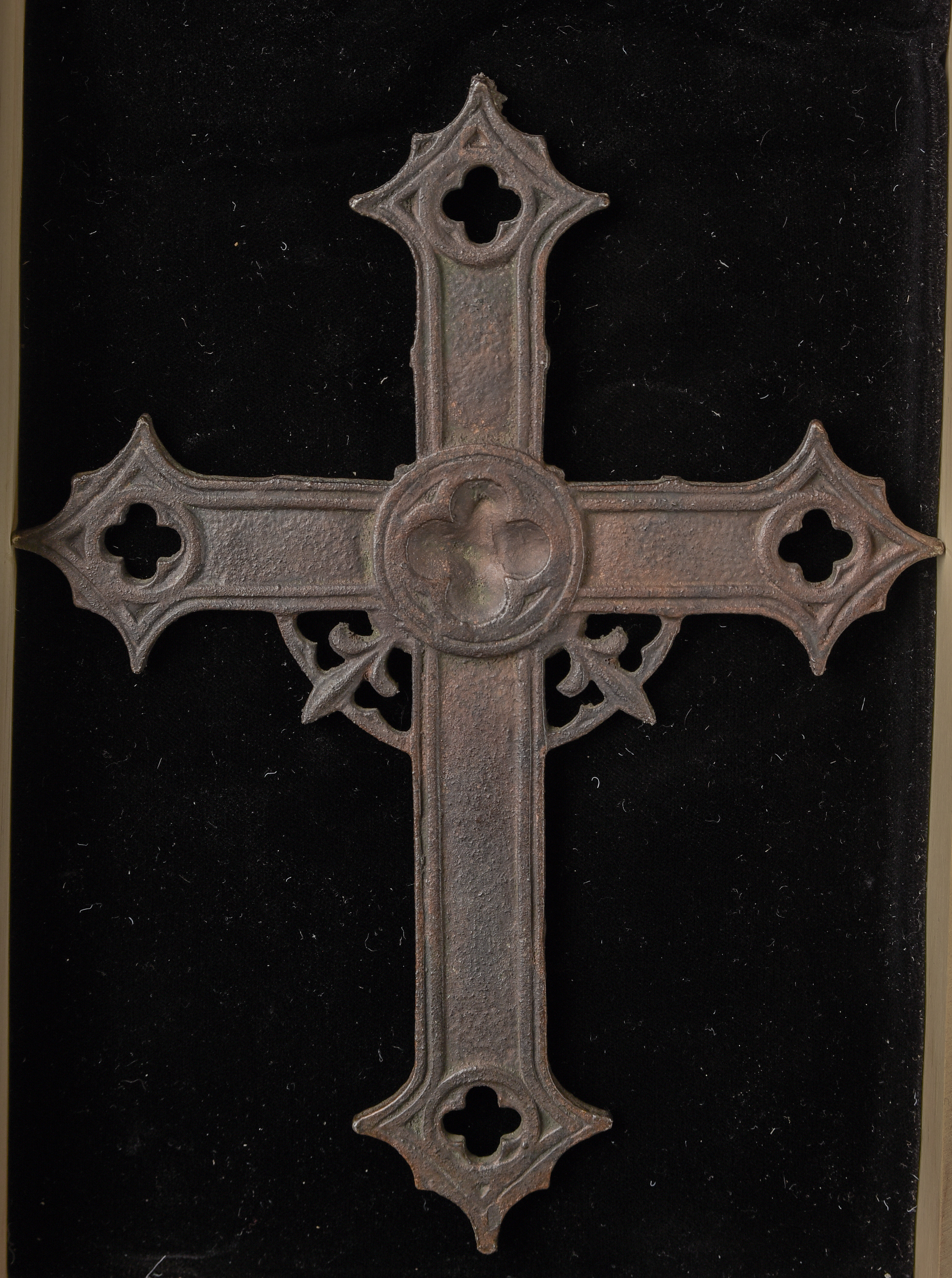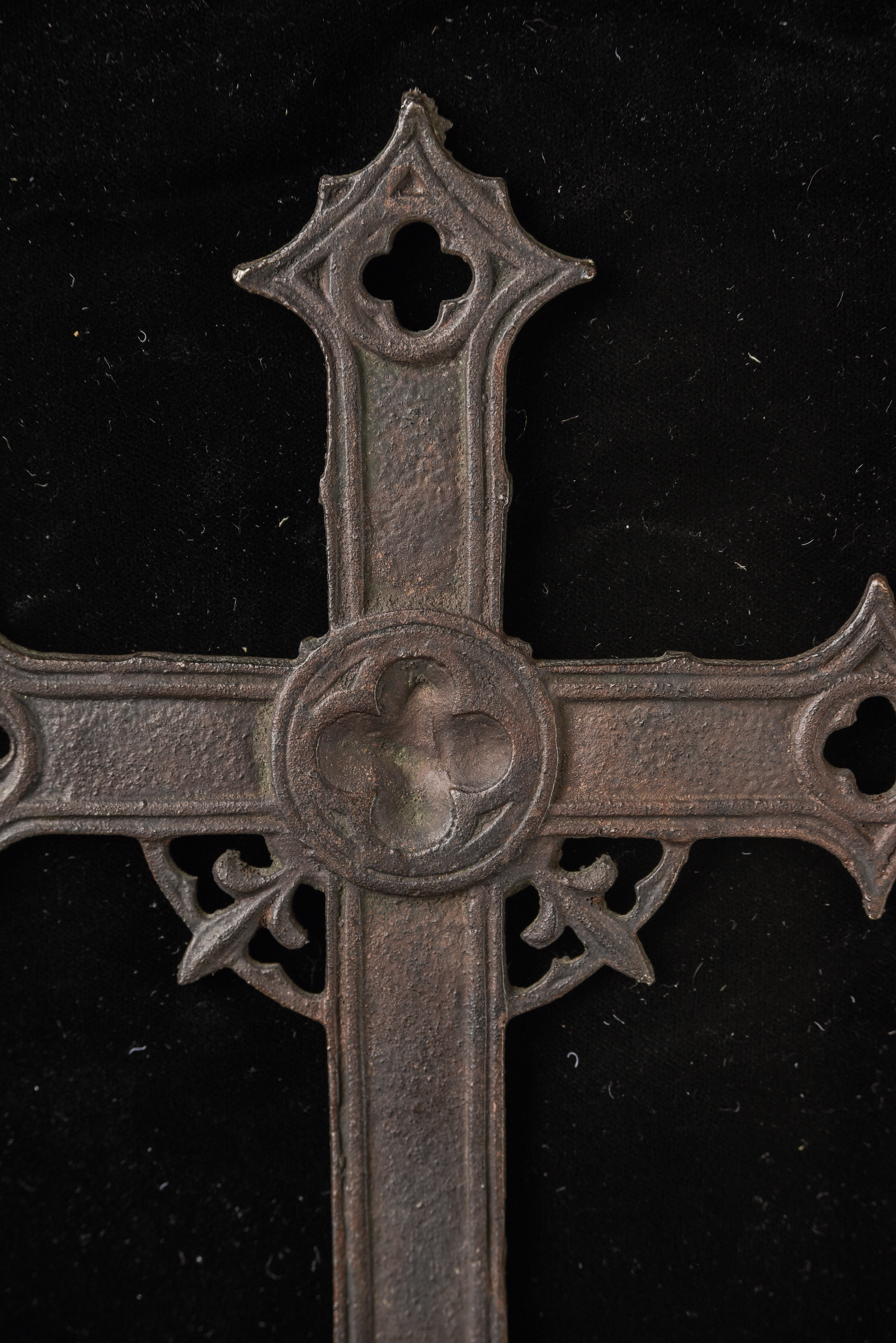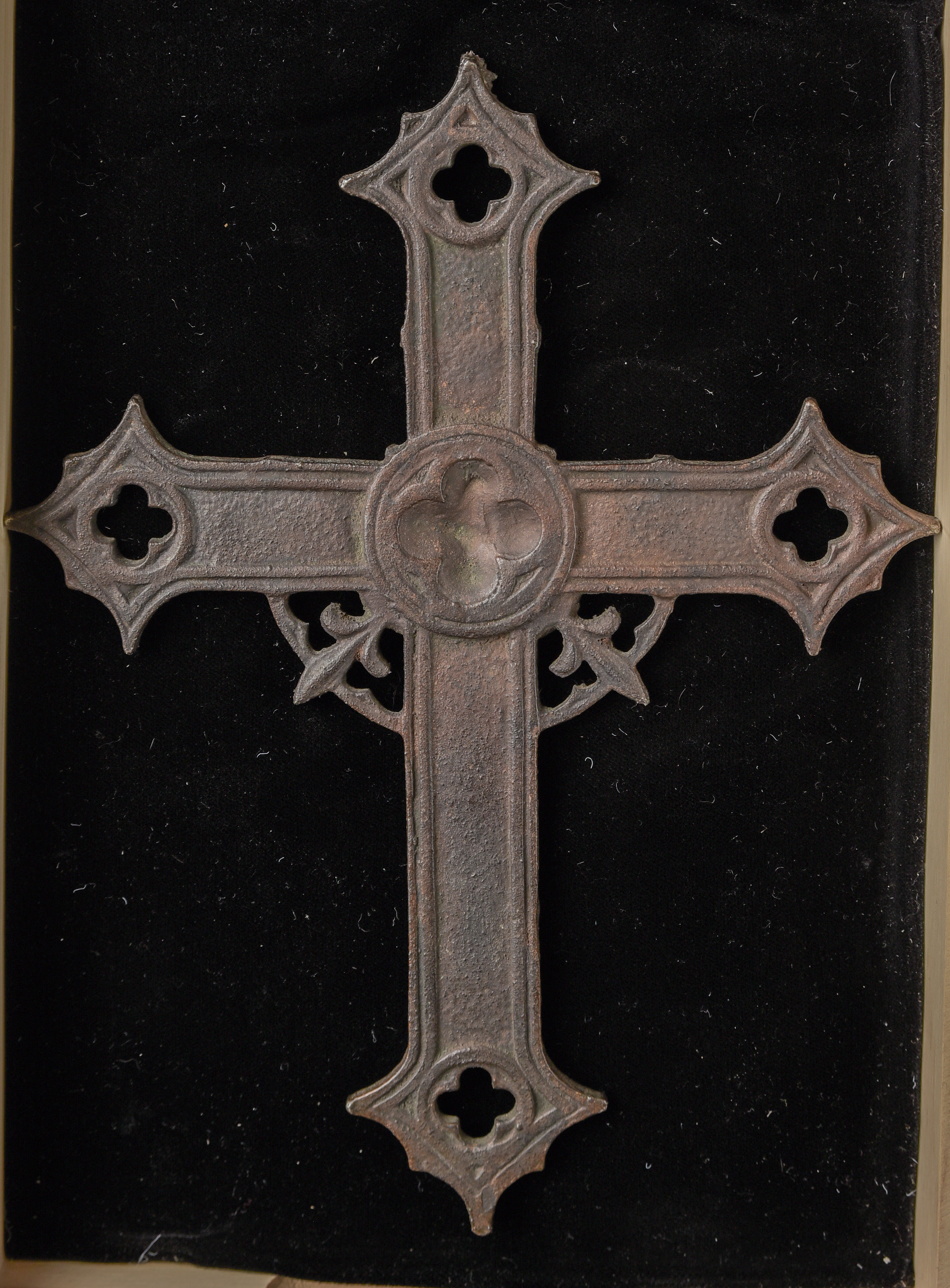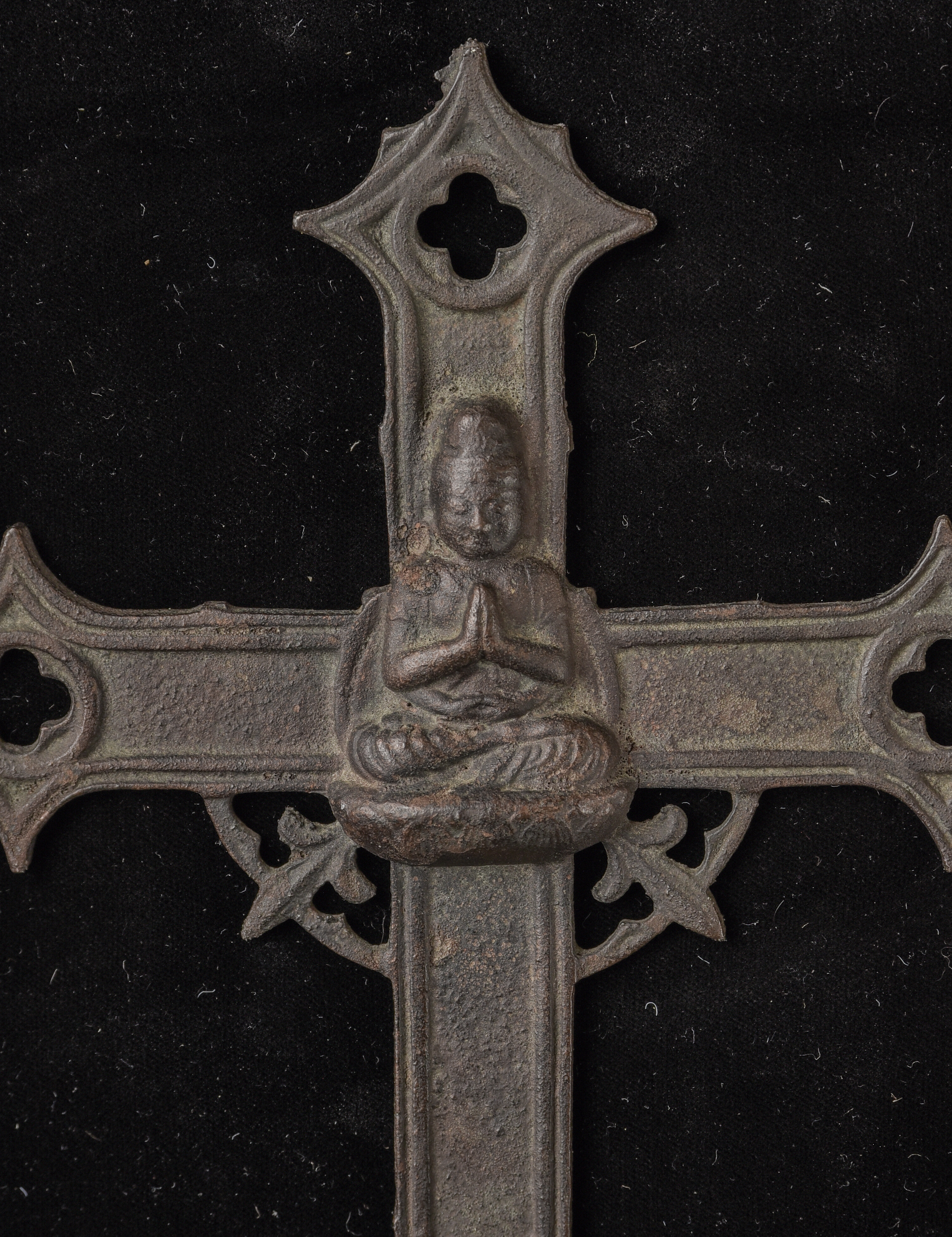 Very rare 16/17thC Japanese Bronze Cross with Buddha. I've owned a number of other iron examples of this over the past 30 years, and seen one other at auction. I've also owned 2 bronze examples, which are less common. I've been told they were used by early Japanese Christians, as they were persecuted by the Shoguns, and wanted to show that they still respected the Buddha and "Honored their Elders" -the decorative scroll work that you see in the very center of the cross on the lower half, probably was also on the upper half when the piece was first made, but it is now long gone. I only know this because I have seen several other examples of this type of cross and the others all have the decorative scrollwork on the top and bottom halves. If you go into the advance search feature on my website and look under both sold and for sale and put in “cross” as a search word, and Japan as the country, you will see the ones I sold in the past, and one other that I currently have available. This one has a particularly nice patina, and there is an echo of a face that still shines through, which is rare as these are usually quite worn. The bronze examples tend to wear better.( 10"H x 8"W x .75"D ) - 1lbs .