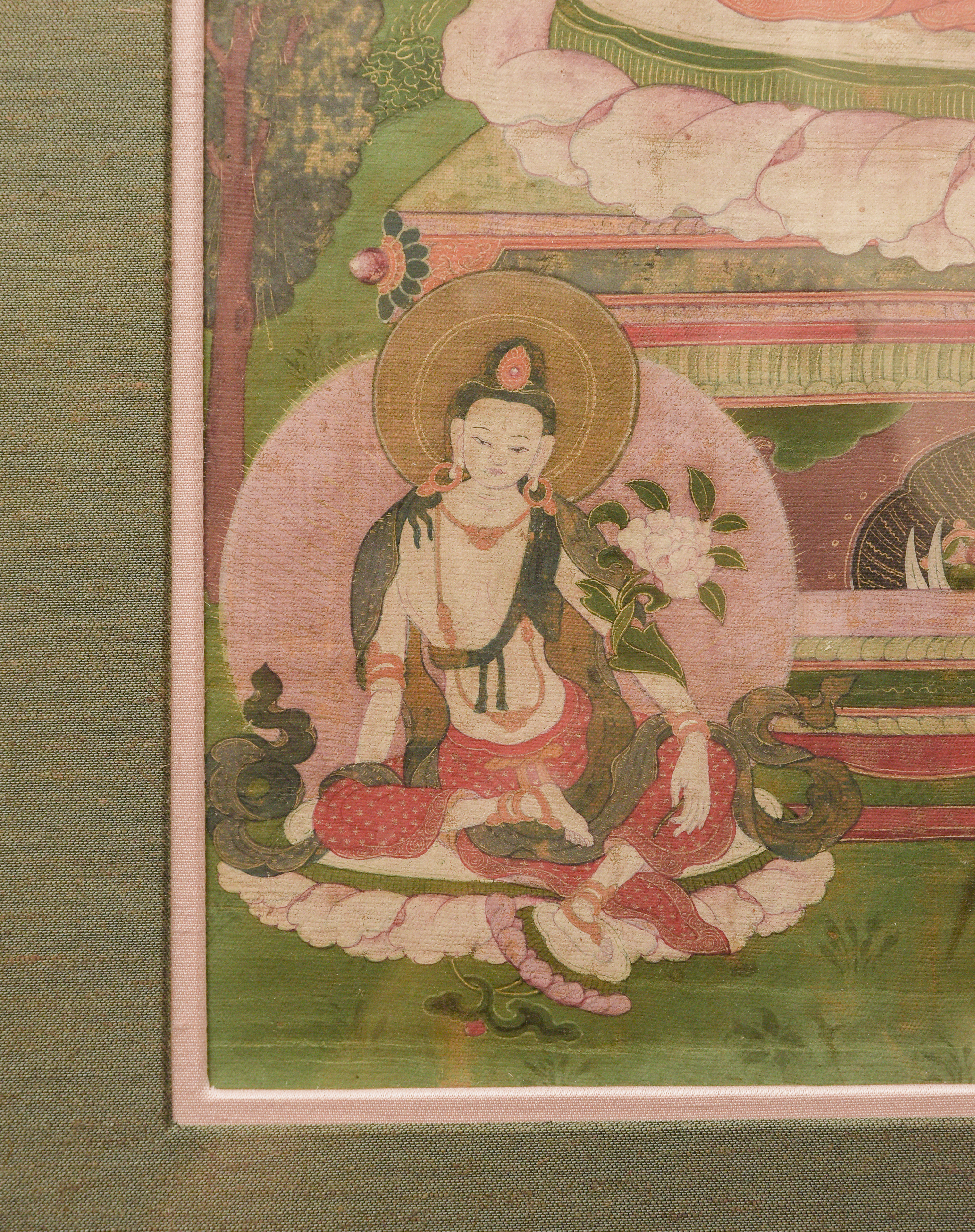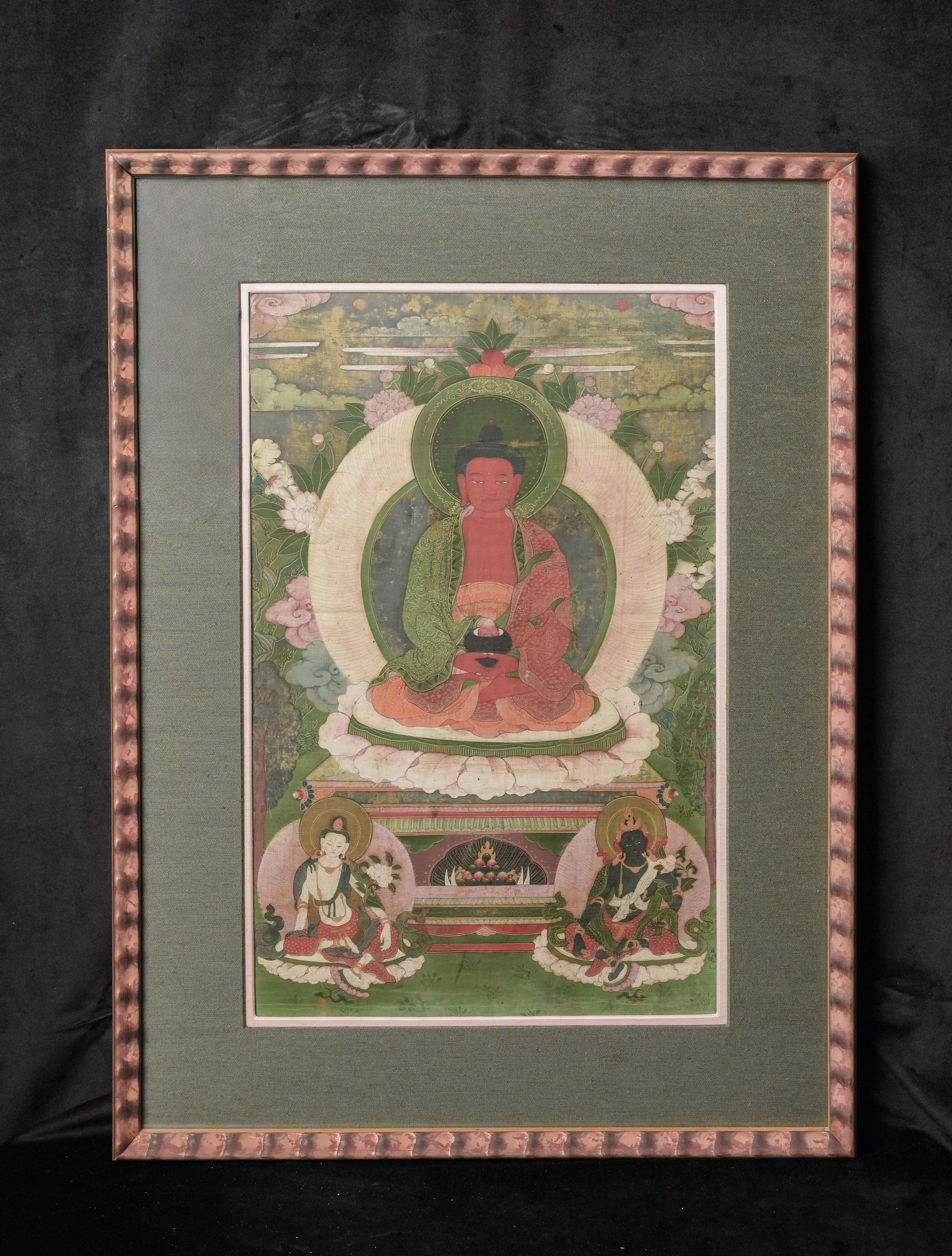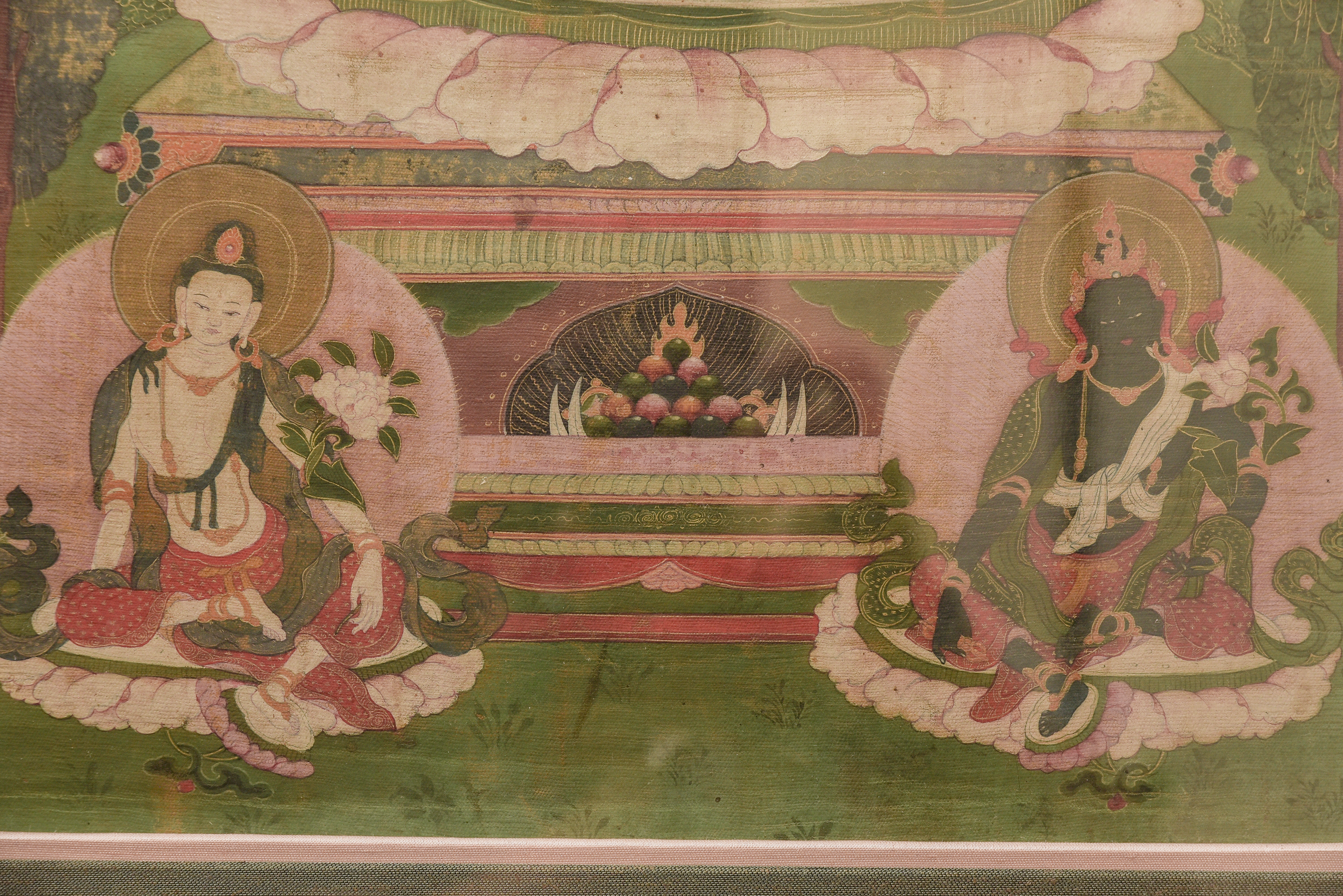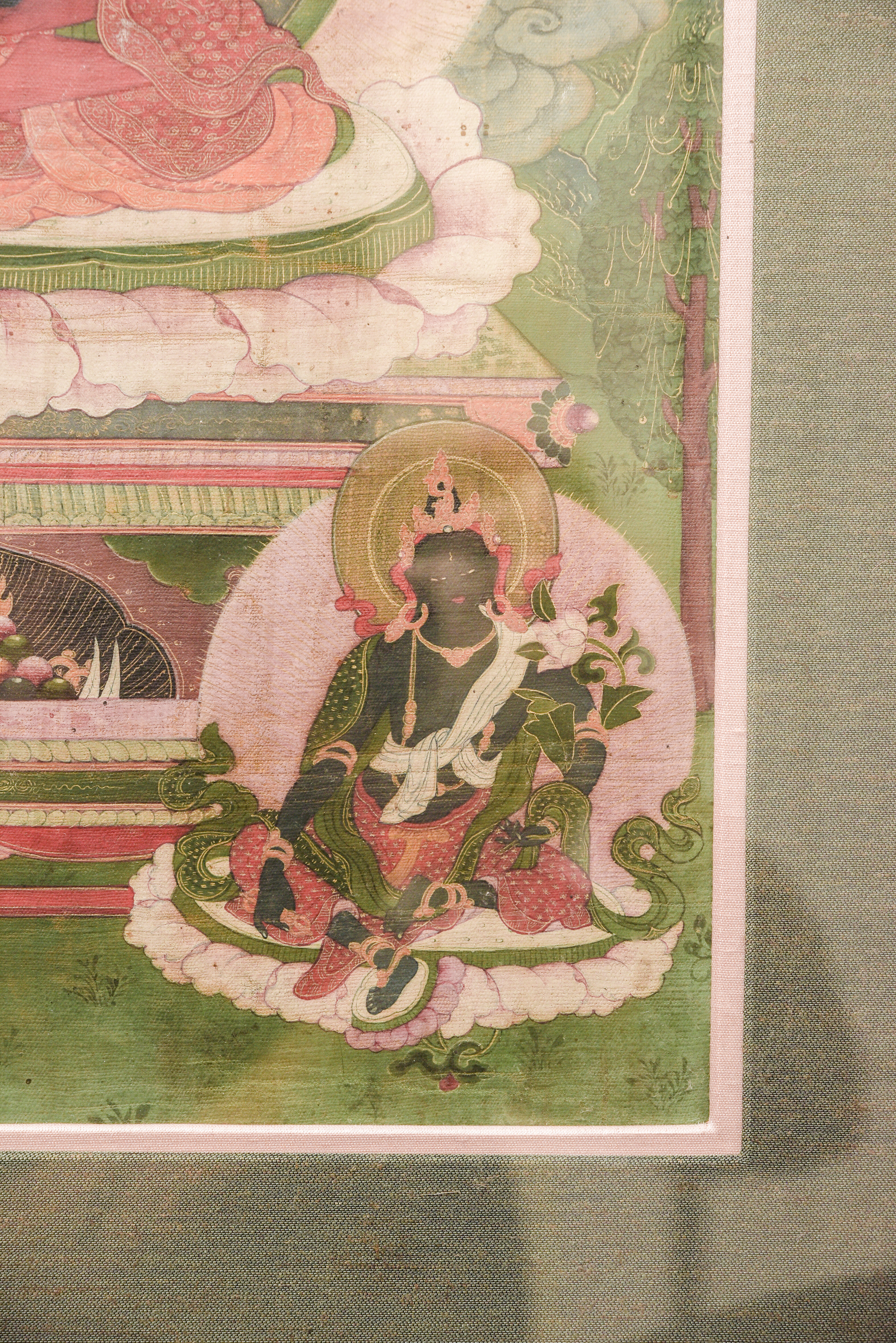 18/19 century Tibetan or Mongolian beautifully framed, Thangka. Very well painted, and in excellent condition. I bought this piece 35 years ago for my personal collection, and sold it about 10 years later. Recently I was fortunate to purchase back a group of treasured pieces from a collector who was downsizing and moving into a retirement home, and now I am able to offer it once again. - ( 20.5"H x 28"W x 1"D )