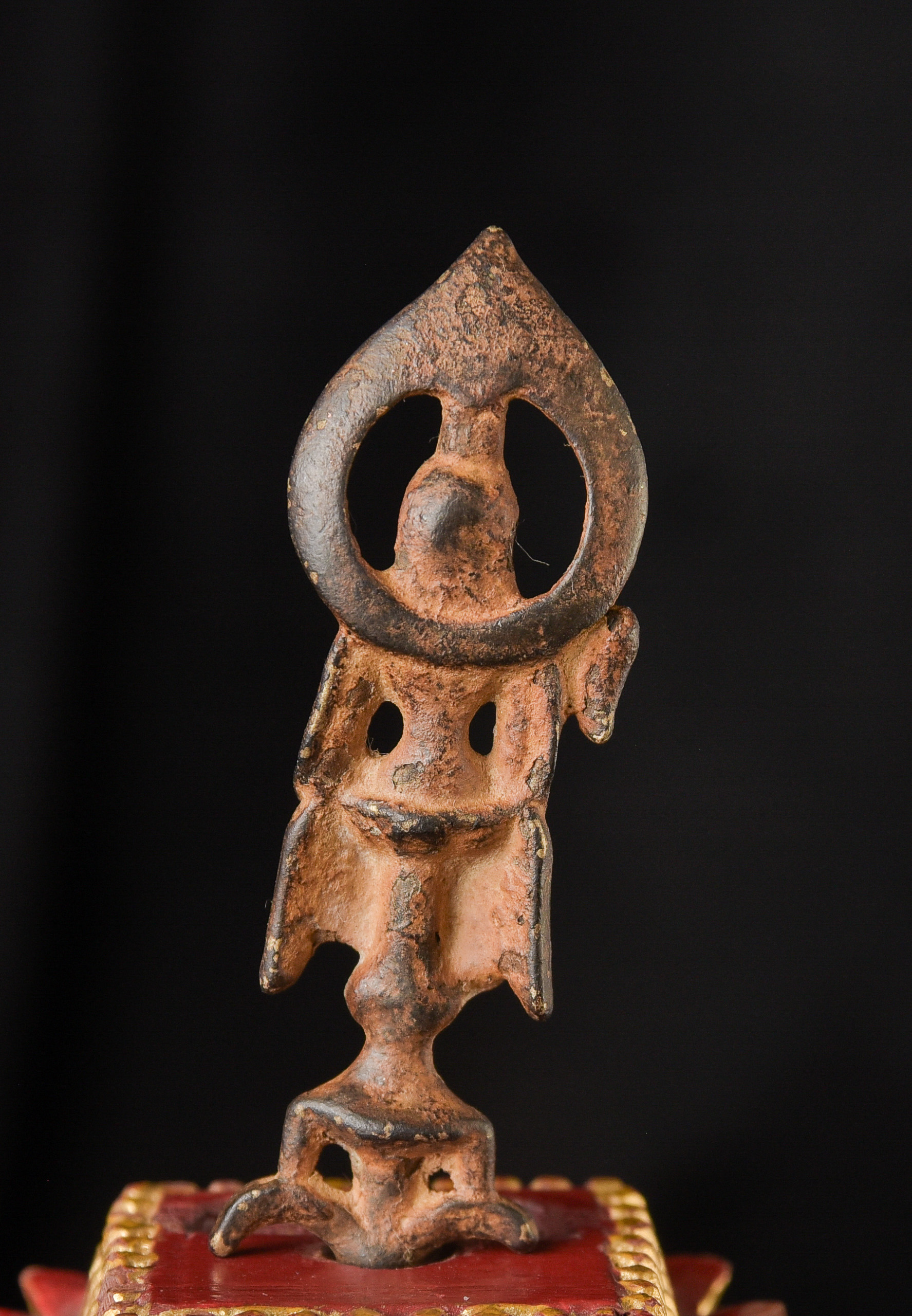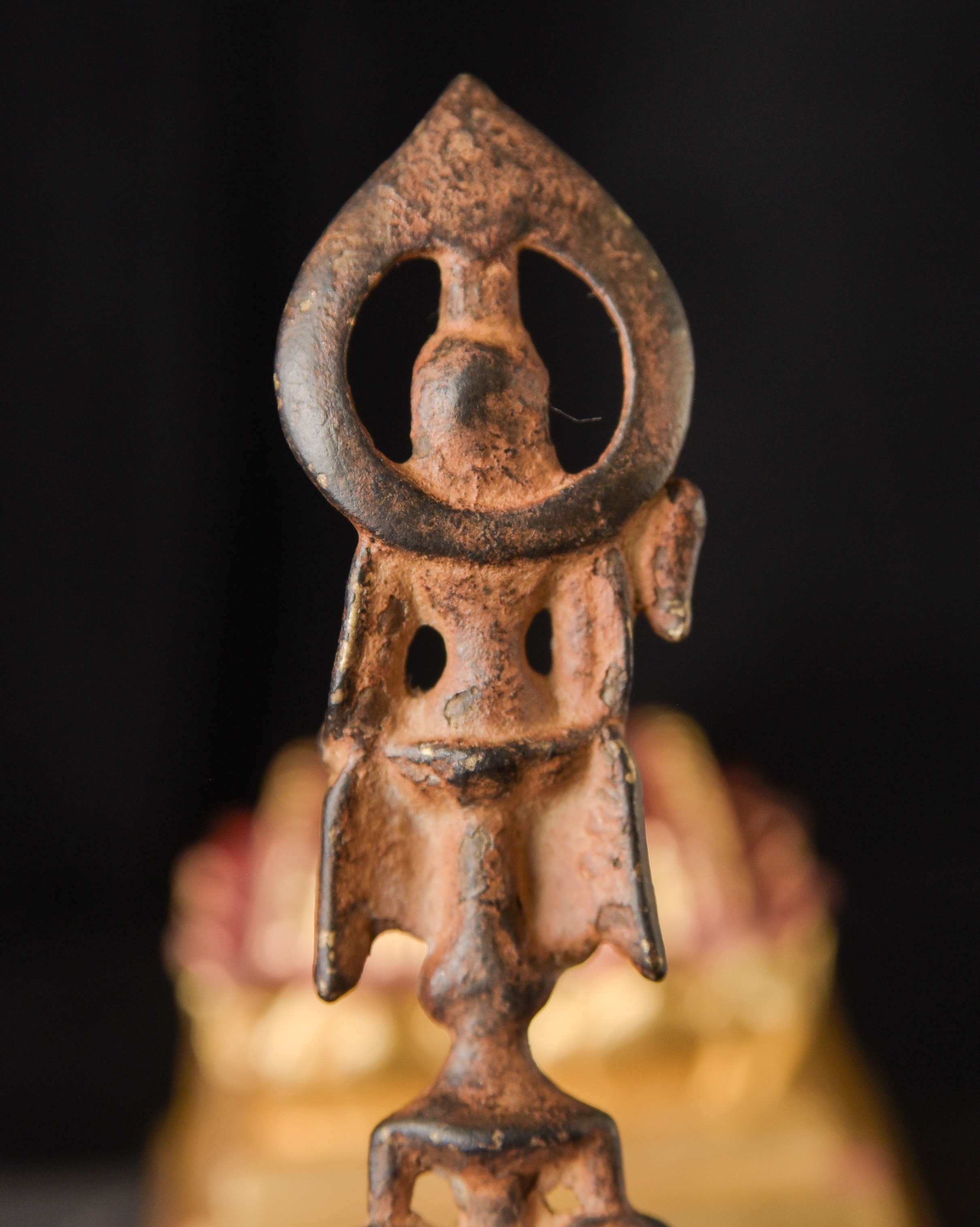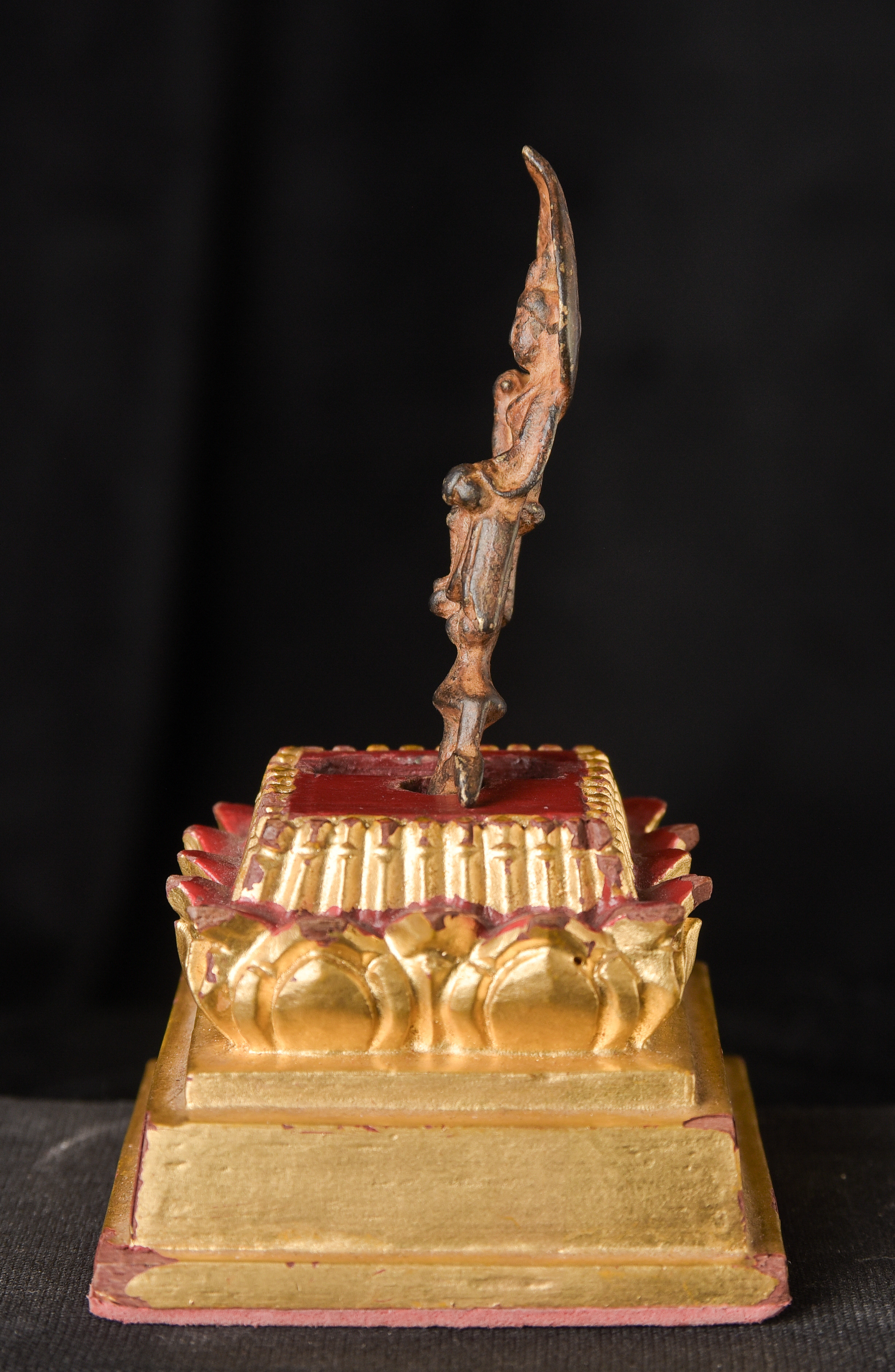 19th century Thai AMBER Saenkajai . He is a Buddhist figure who was a devotees of the Buddha, who brings good luck and good fortune. This is an amazing miniature sculpture in a number of ways. First, it is a very fine carving – if you look at the face, you can see skill of the carver. Second, the very few Buddhist Amber carvings you see are almost all carved of reconstituted Amber, which is basically melted down Amber. This is carved from a natural block of amber. Finally, it has remarkable surface to it, which shows 100+ years of devotion. I could try and describe this, but it’s better to simply look at the photos. In addition to the main figure, there is the bird which is the symbol of the Ratanakosin Dynasty carved into each side of the base. This is extremely rare and special little statue. ( 2.75"H x .75"W x .375"D ) - 20g.
