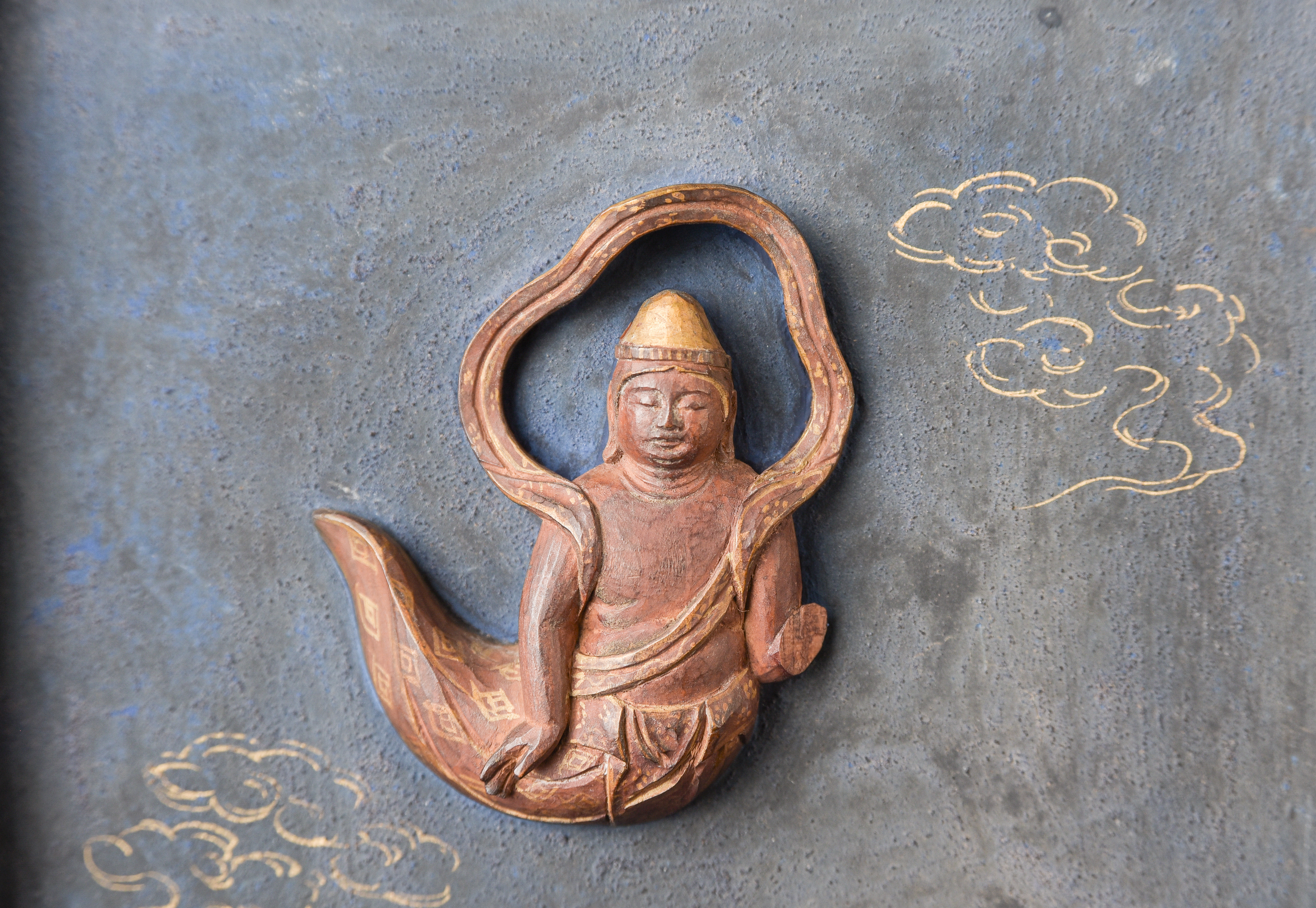 Edo section of a Japanese Altar. Exquisitely sculpted, with crushed lapis background. A few losses, but overall in remarkable condition. I've seen hundreds of Japanese altars and Zushis, but never another like this. Amazing quality to the carving. ( 8.5"H x 5.75"W x .875"D )