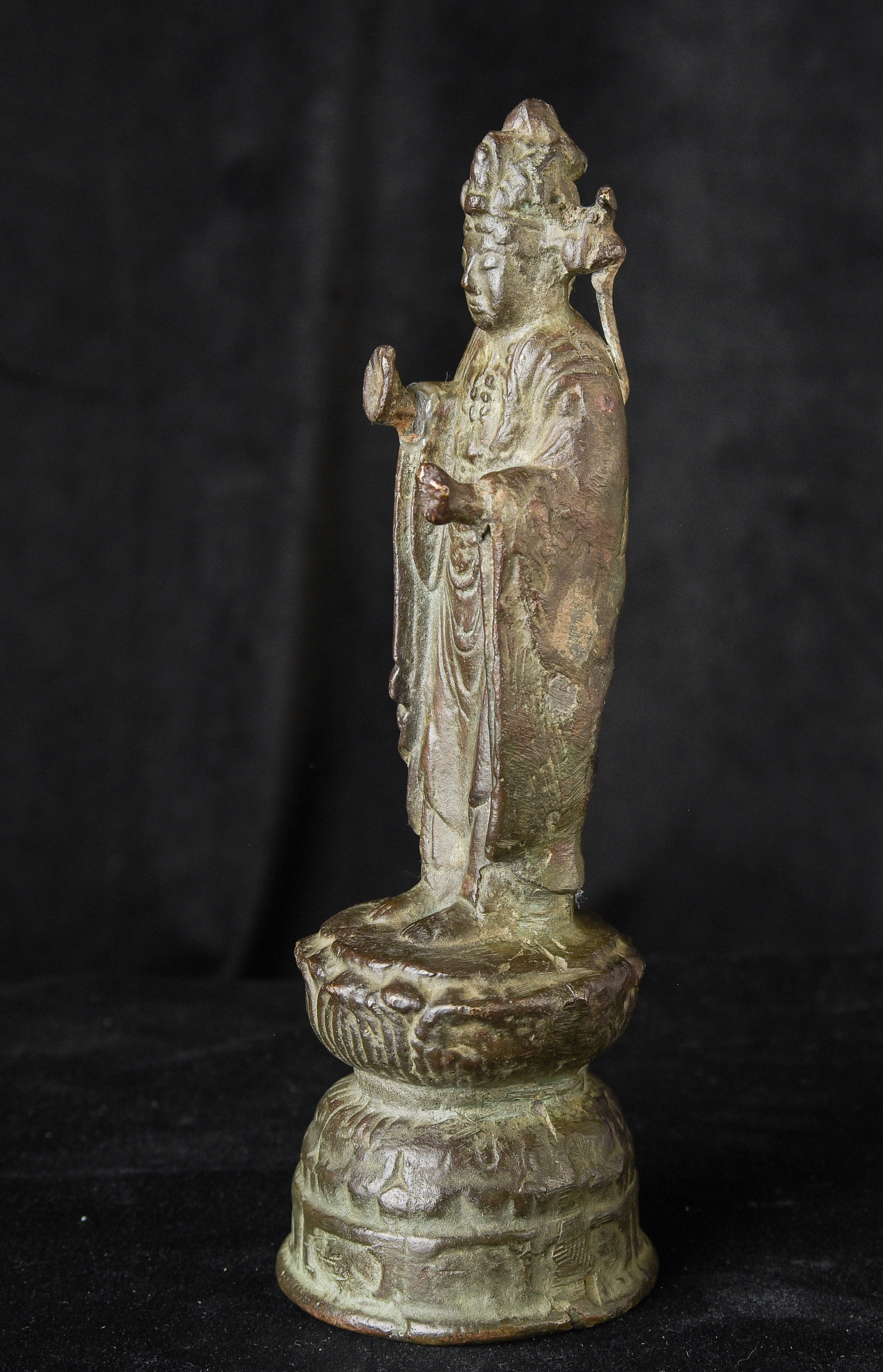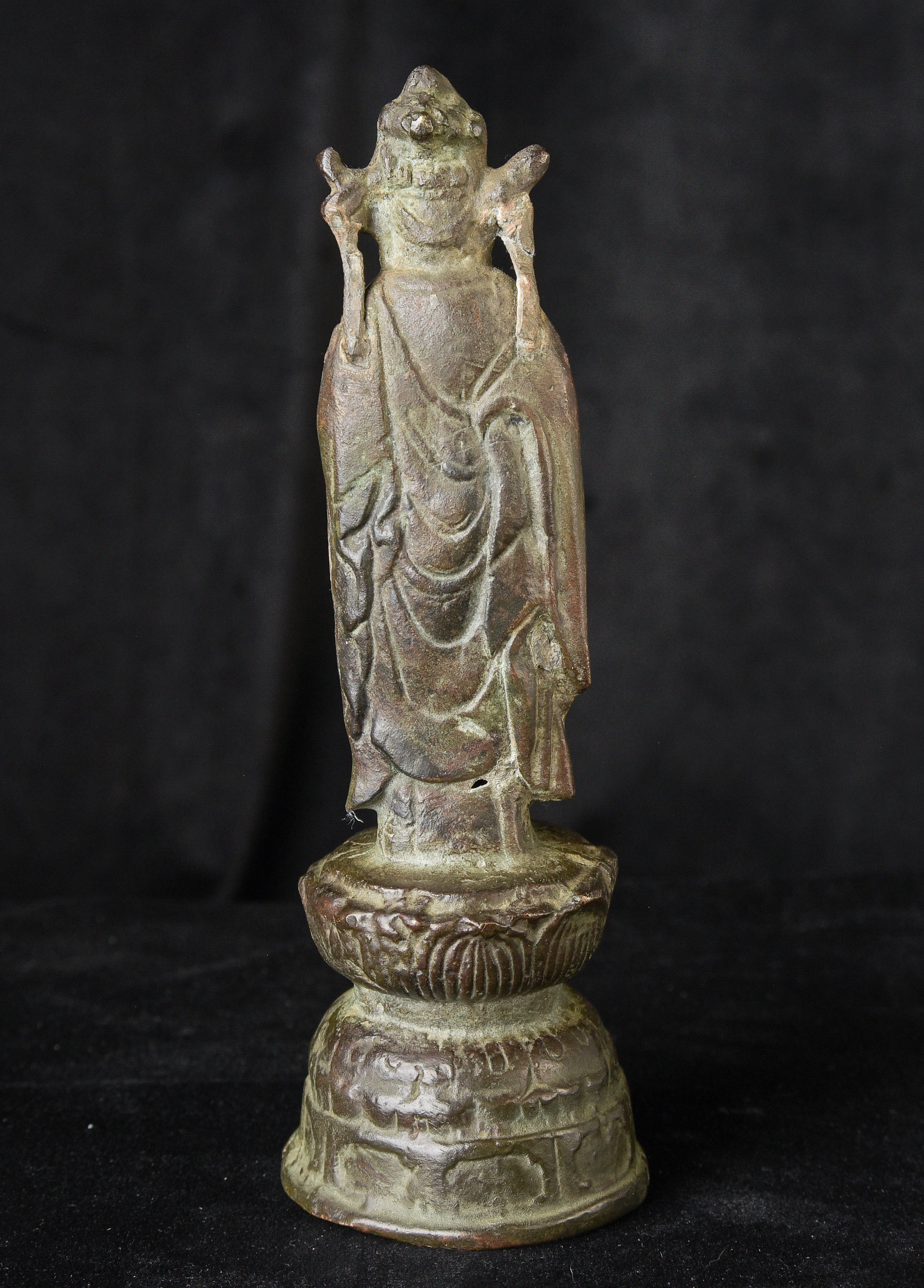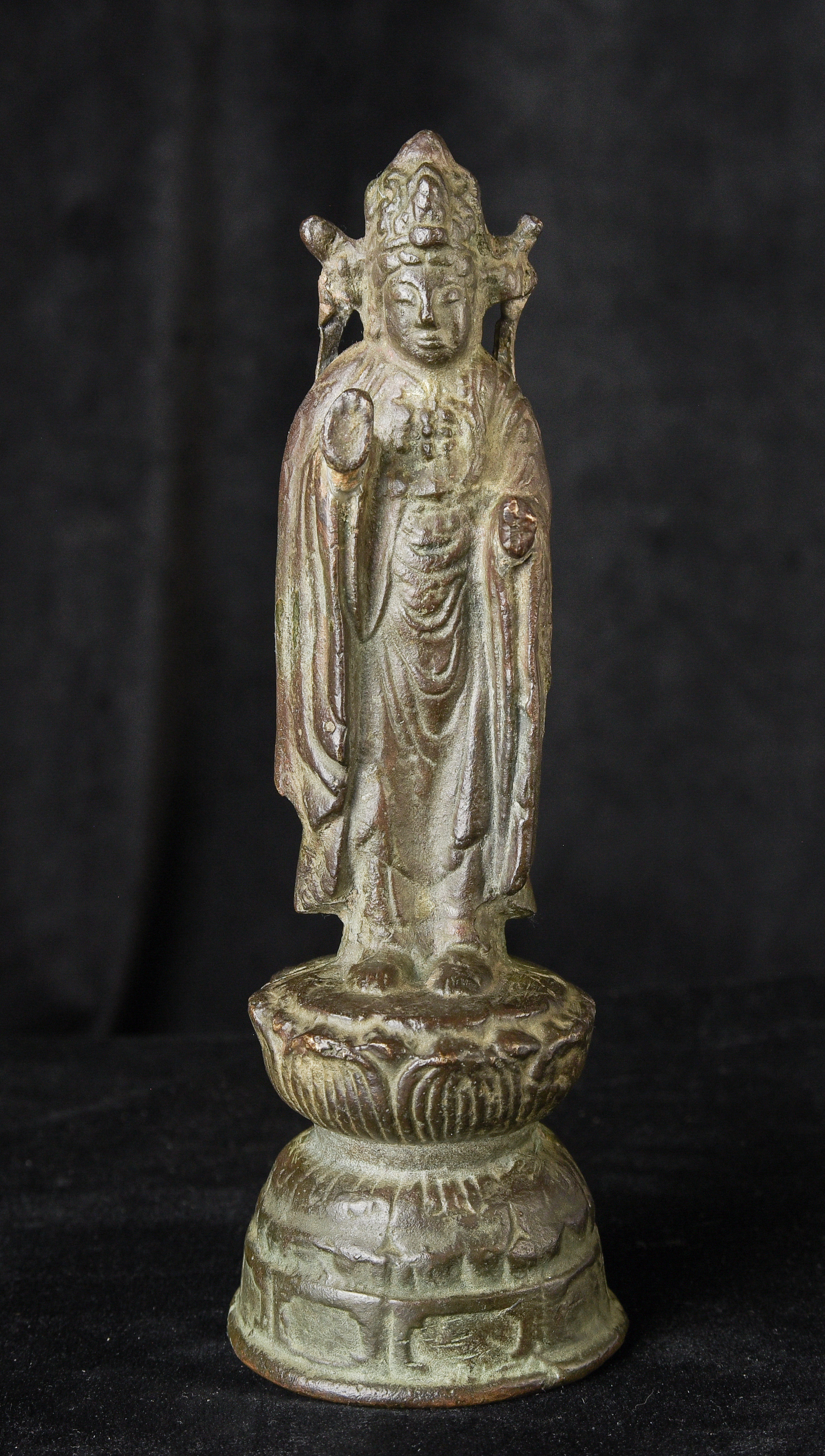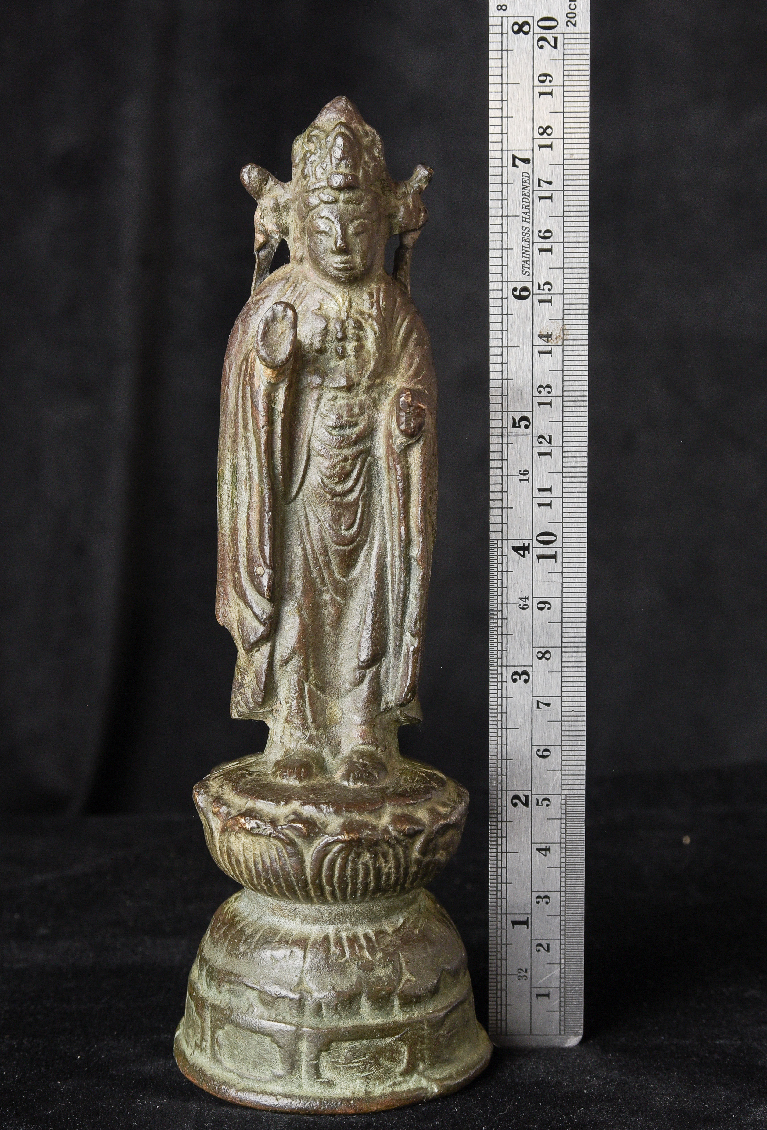 18/19thC Korean bronze Buddha/Bodhisattva. Stands in quiet contemplation. In good overall condition with usual ritual wear. The ribbons extending down from the ears to the shoulders appear to have been reattached and like they need care to stay in place. This is the first of this type I have offered. ( 7.5"H x 2"W x 2.5"D ) - 1.47lbs