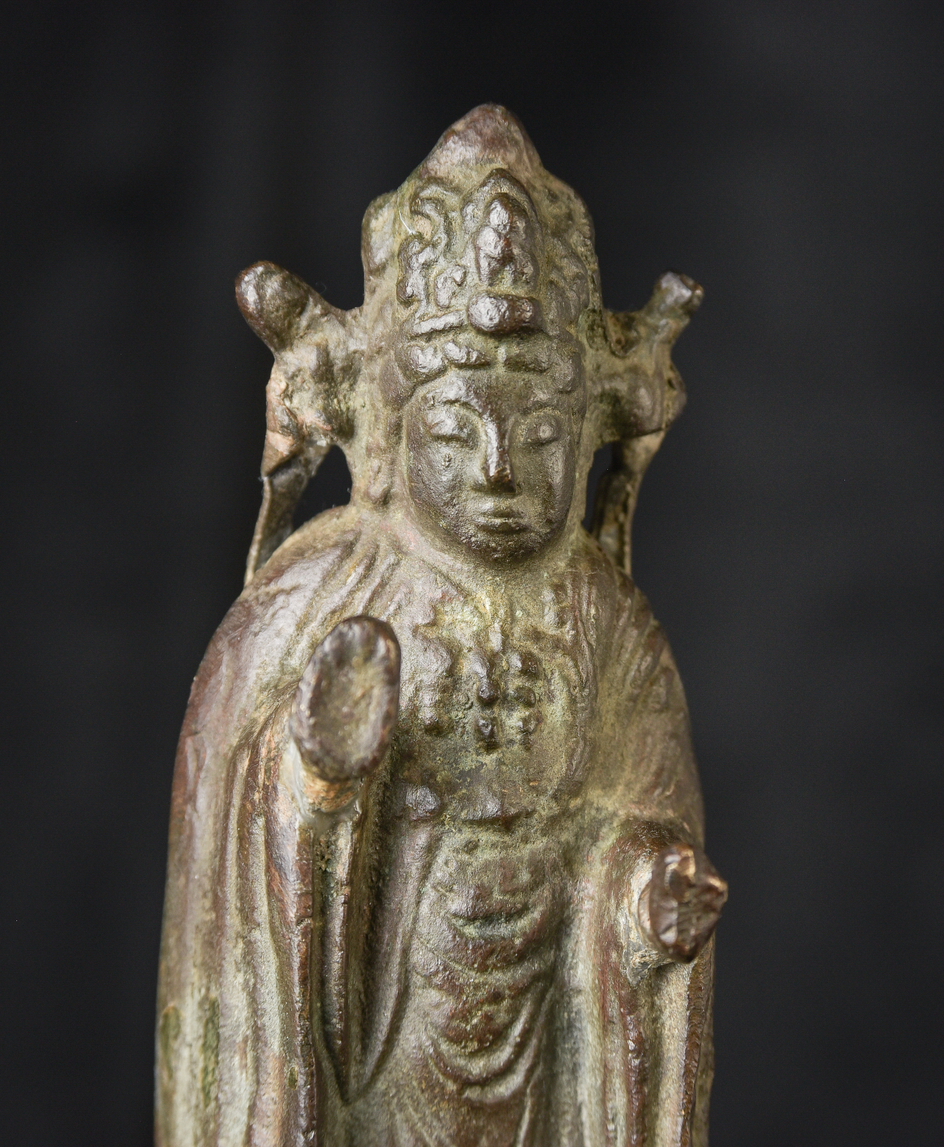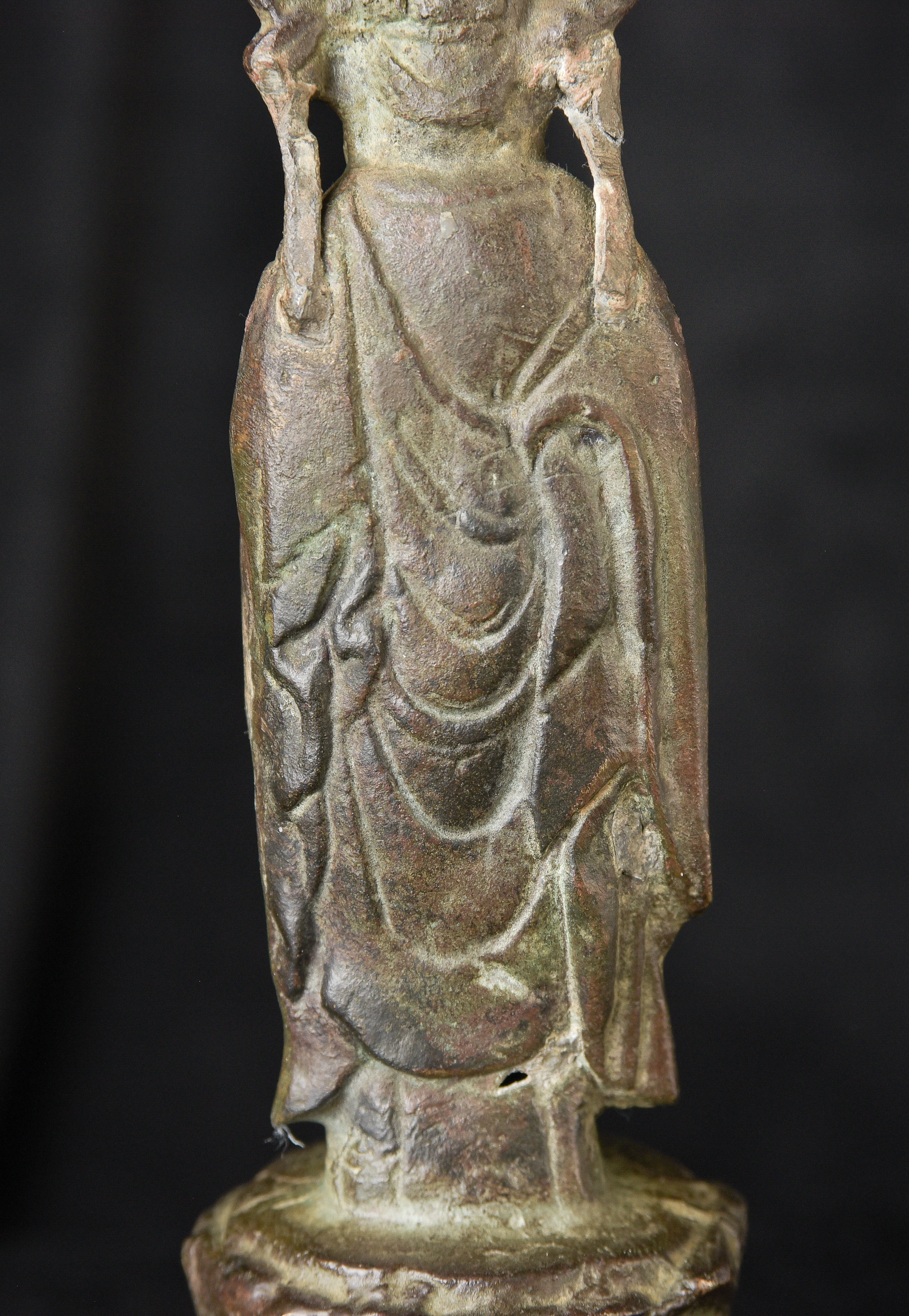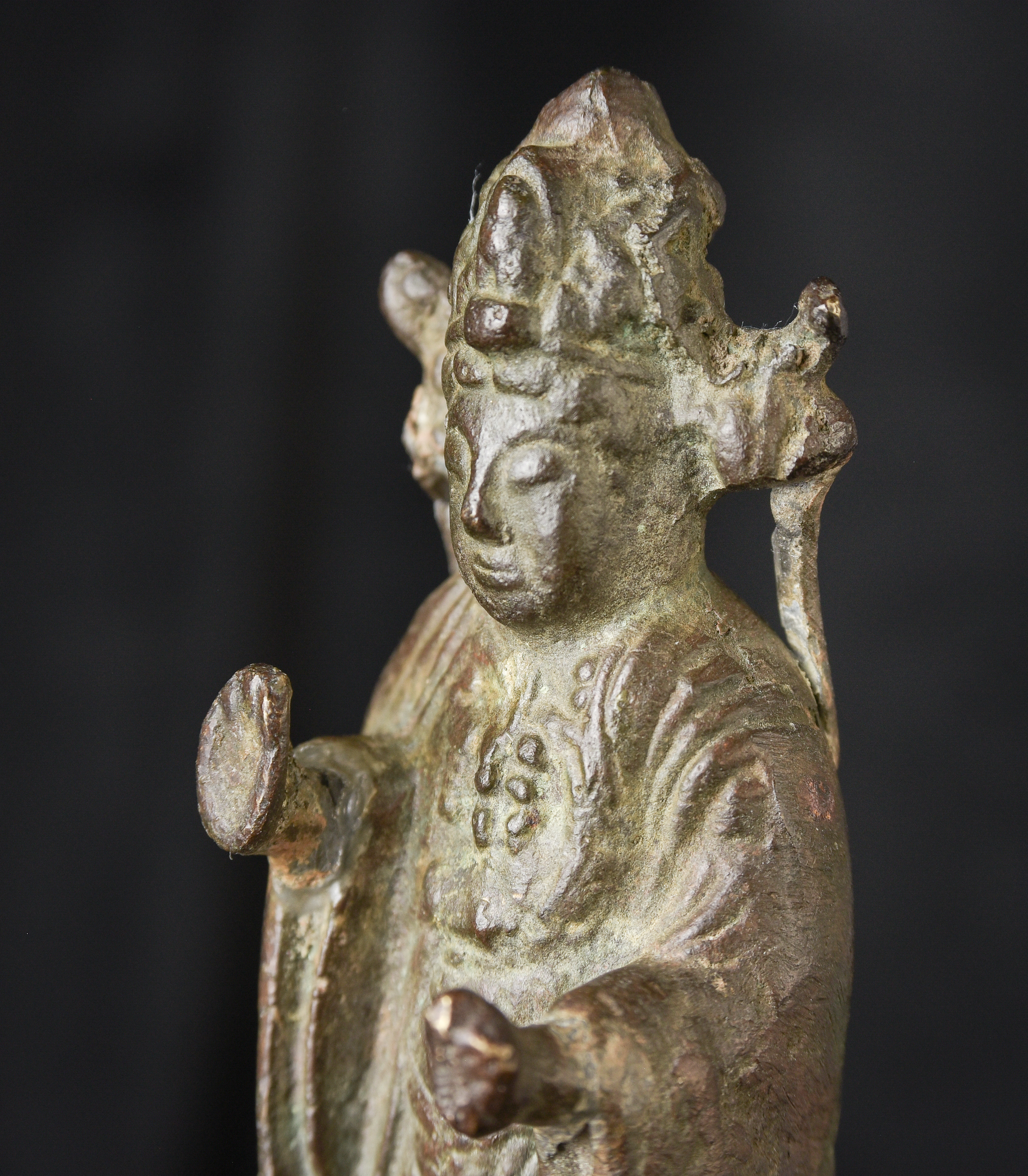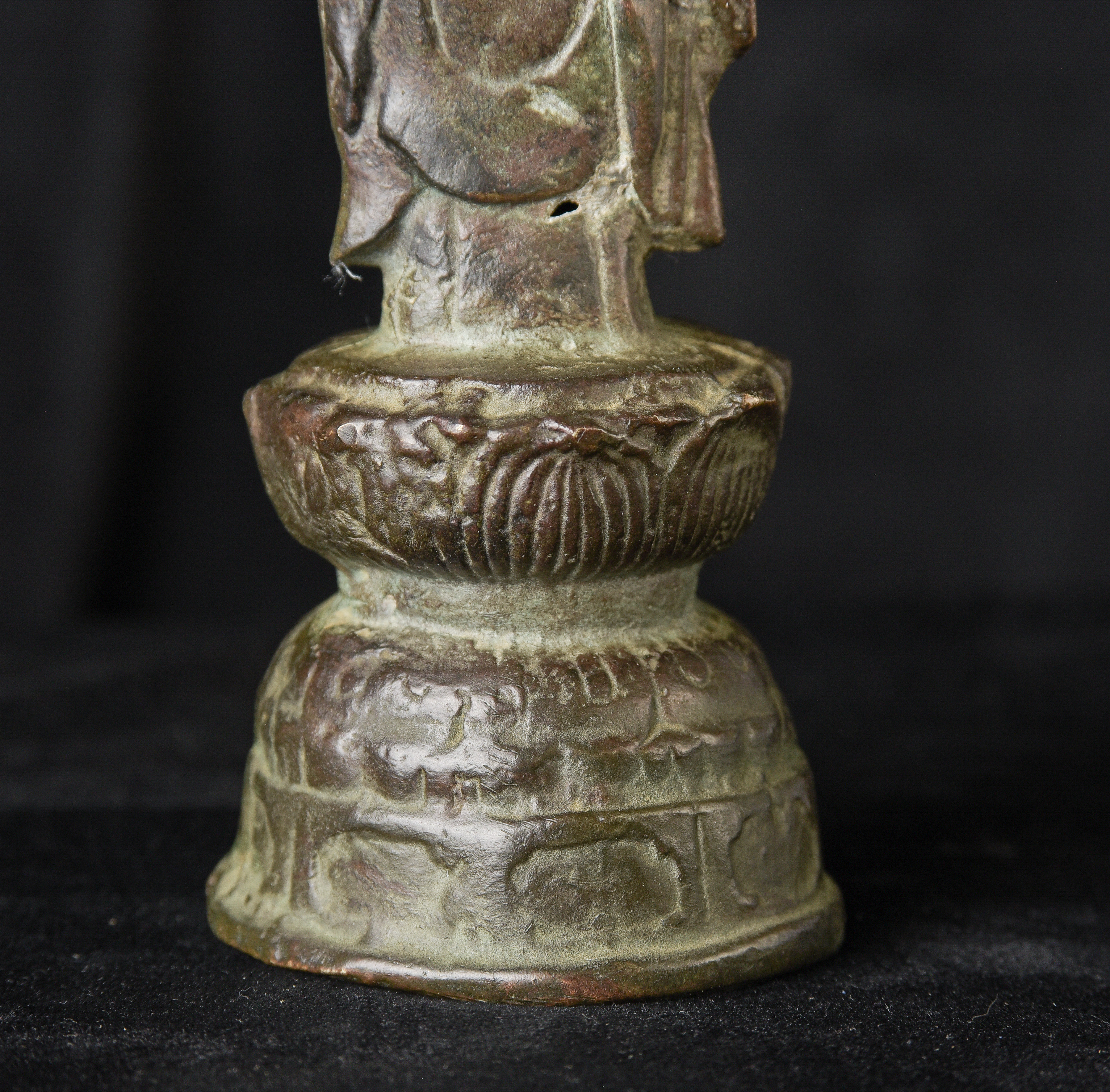 18/19thC Korean bronze Buddha/Bodhisattva. Stands in quiet contemplation. In good overall condition with usual ritual wear. The ribbons extending down from the ears to the shoulders appear to have been reattached and like they need care to stay in place. This is the first of this type I have offered. ( 7.5"H x 2"W x 2.5"D ) - 1.47lbs