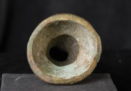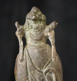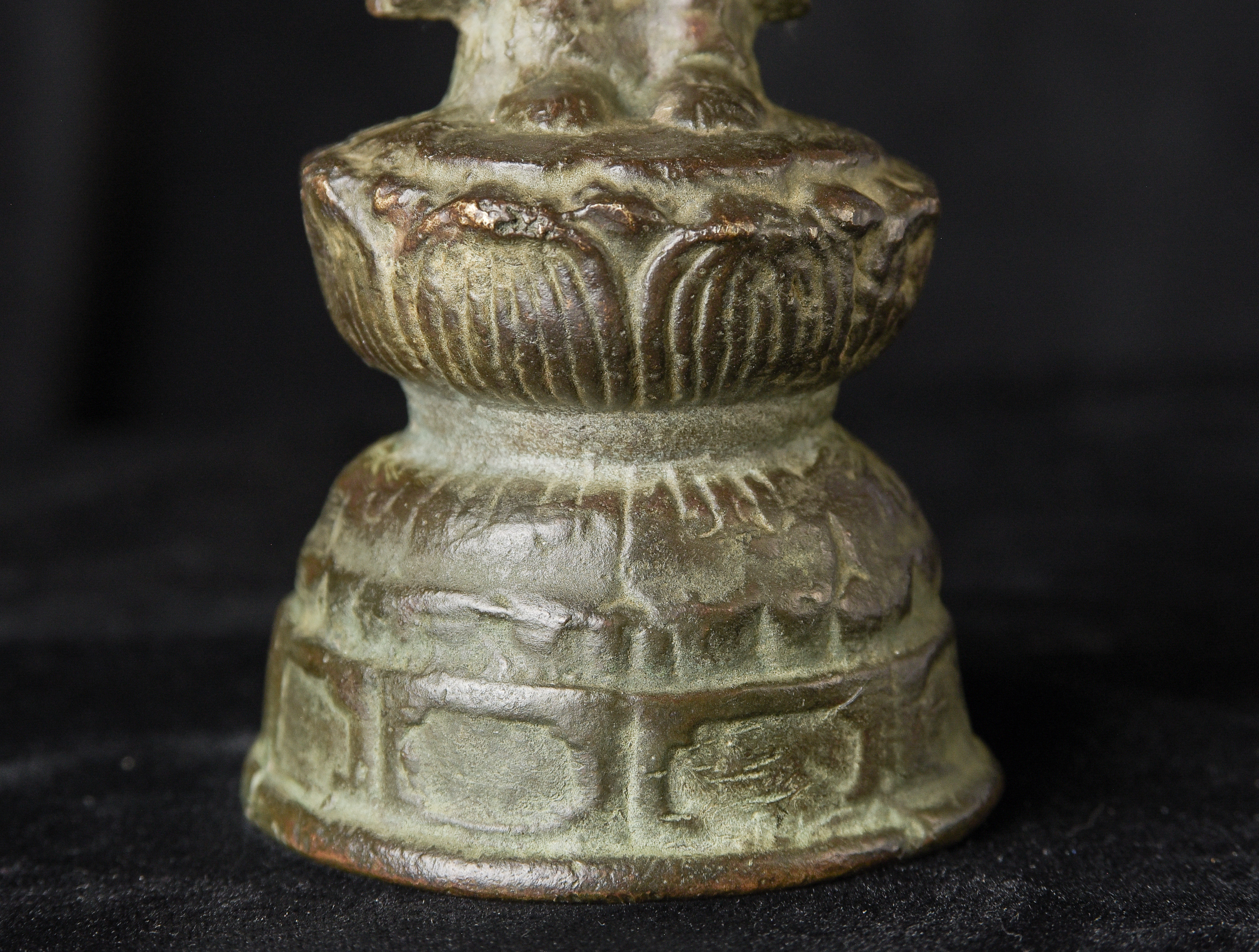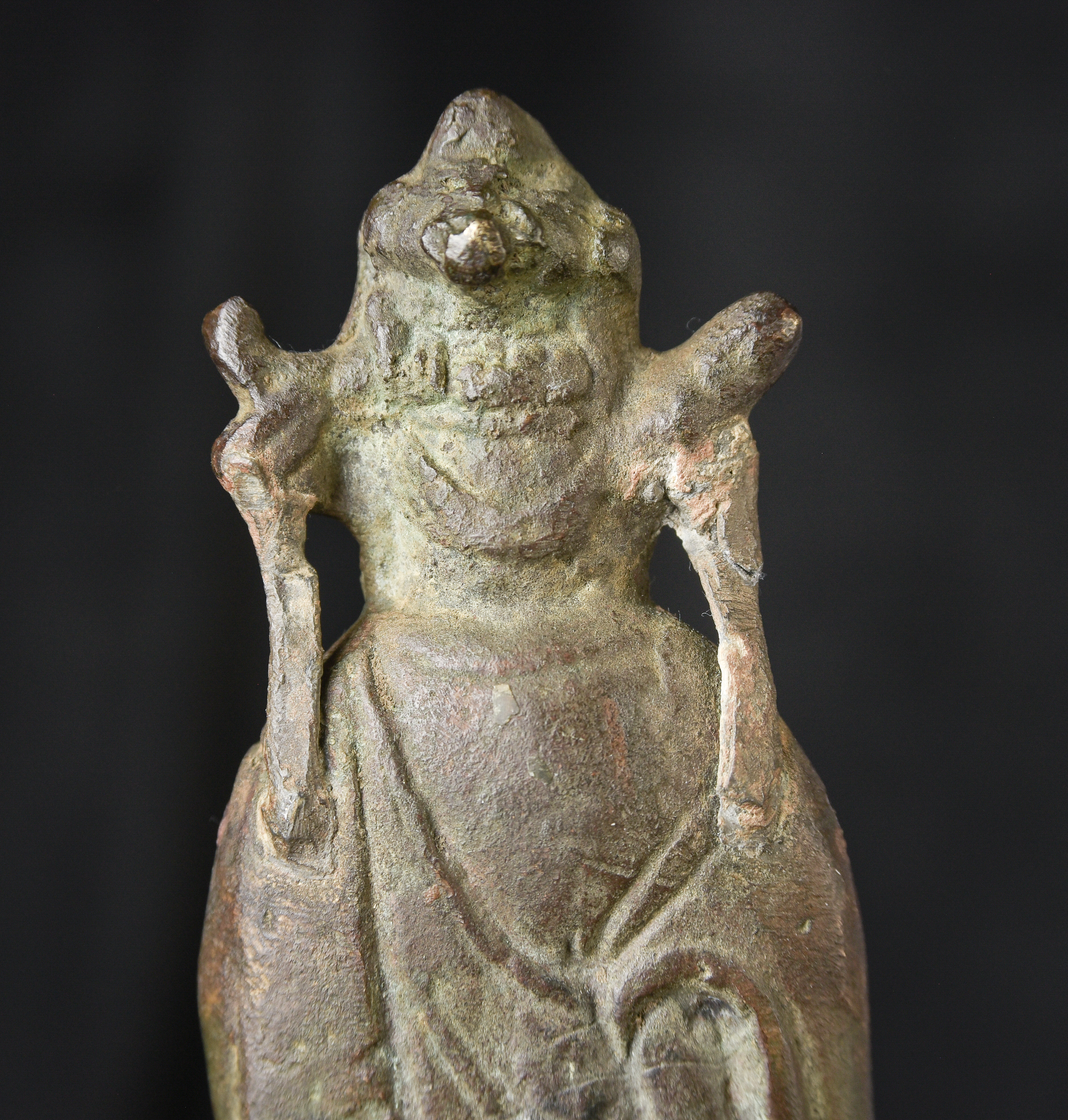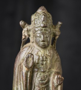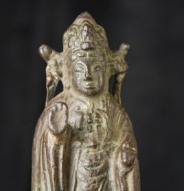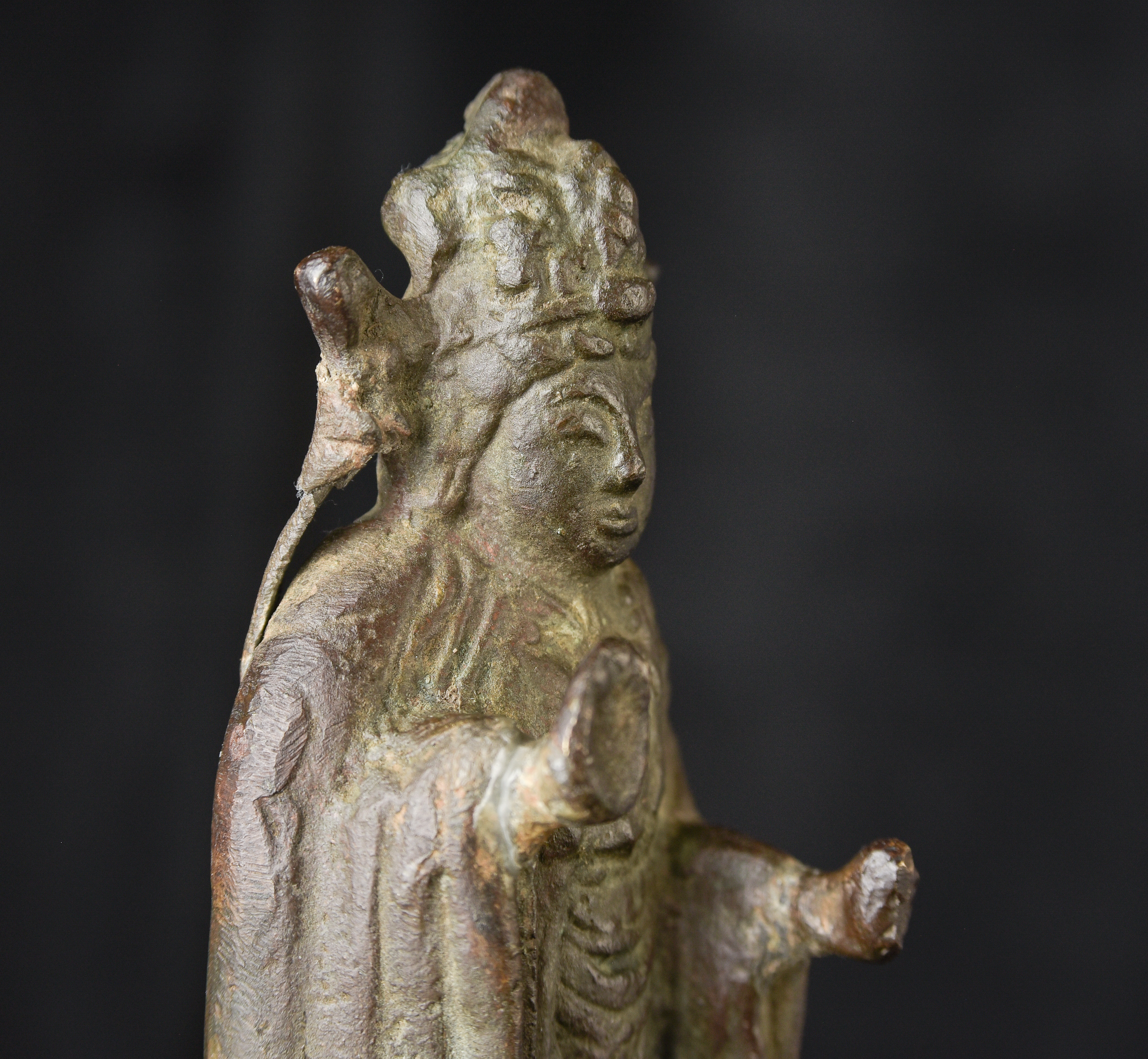 18/19thC Korean bronze Buddha/Bodhisattva. Stands in quiet contemplation. In good overall condition with usual ritual wear. The ribbons extending down from the ears to the shoulders appear to have been reattached and like they need care to stay in place. This is the first of this type I have offered. ( 7.5"H x 2"W x 2.5"D ) - 1.47lbs
