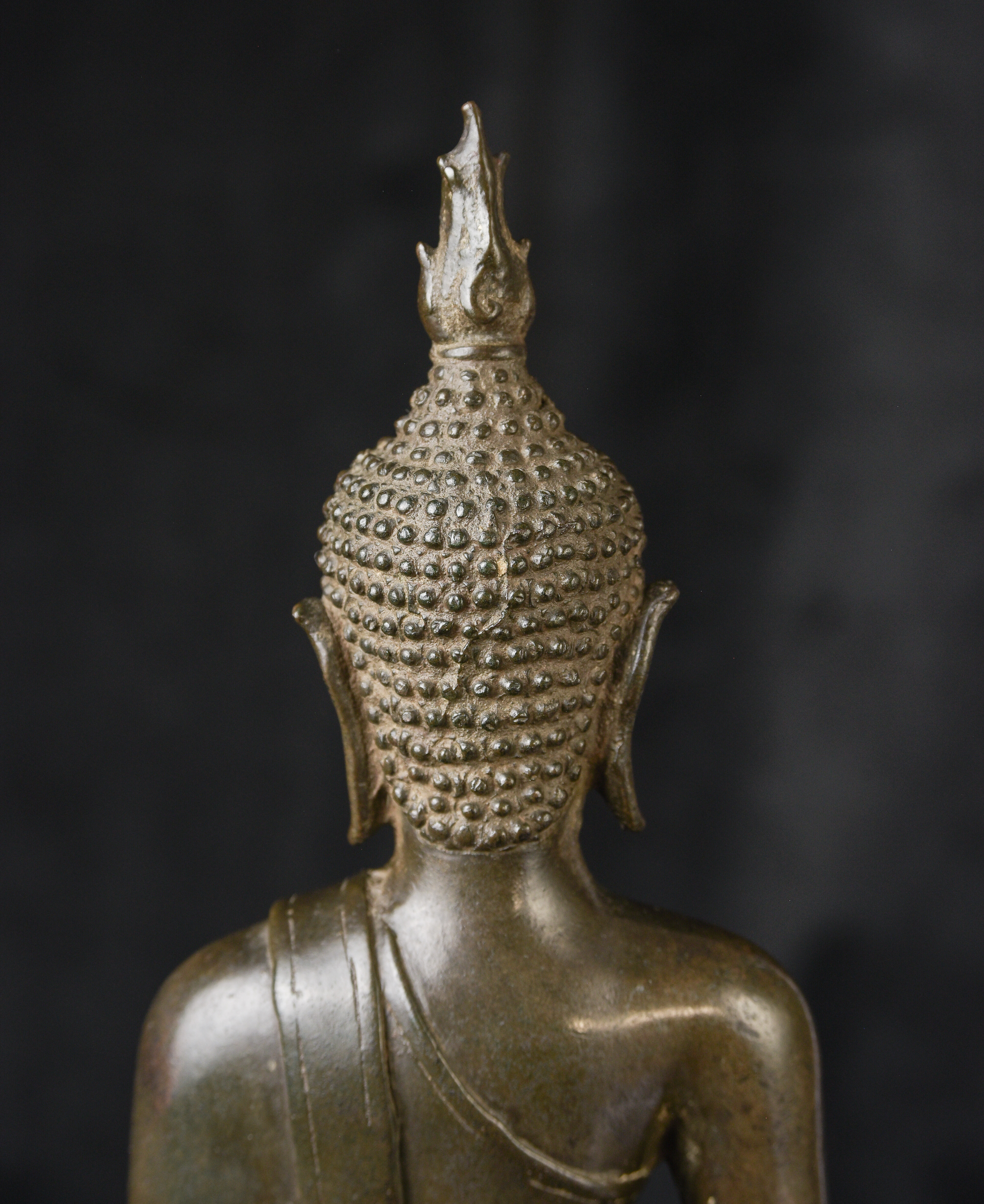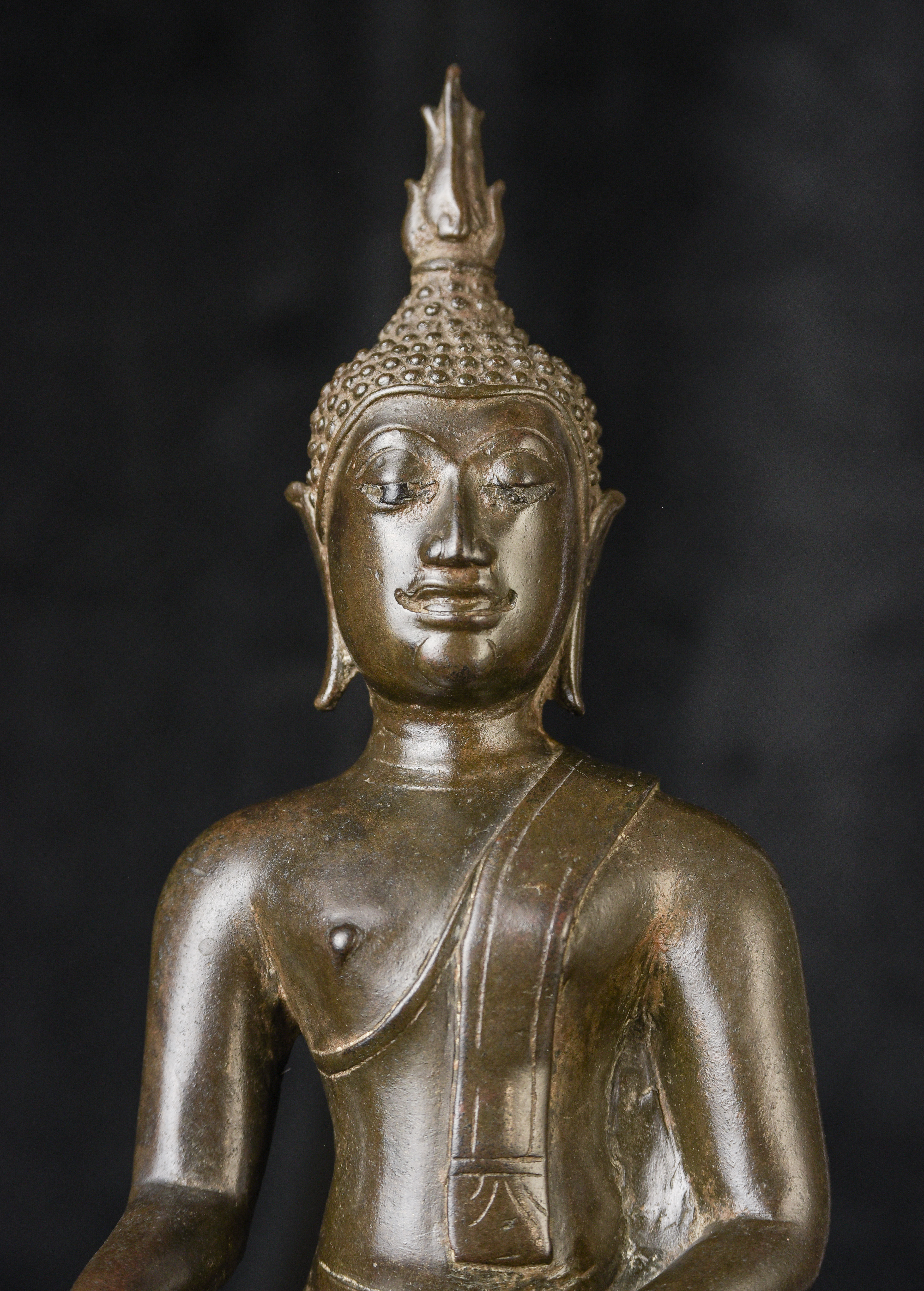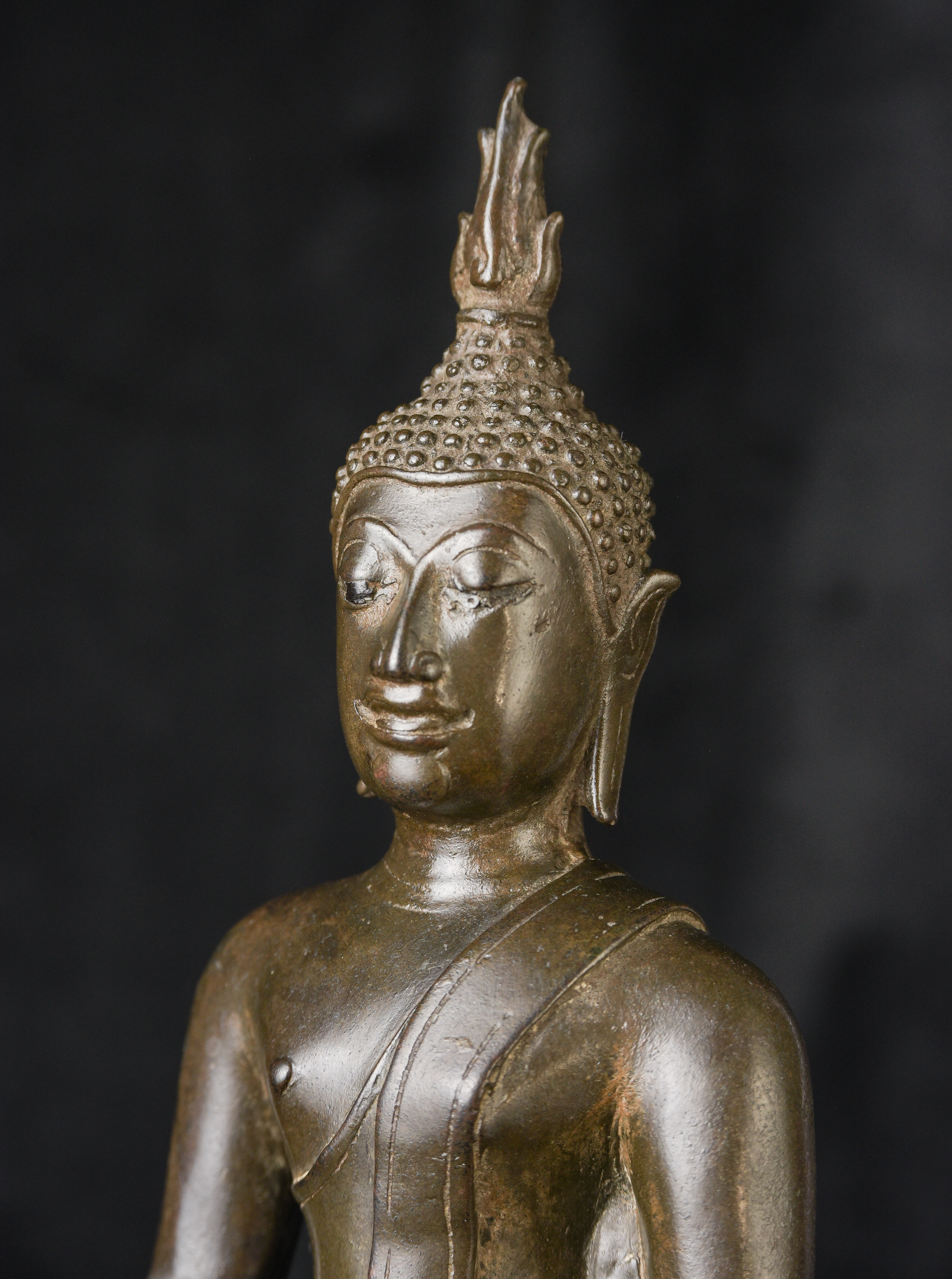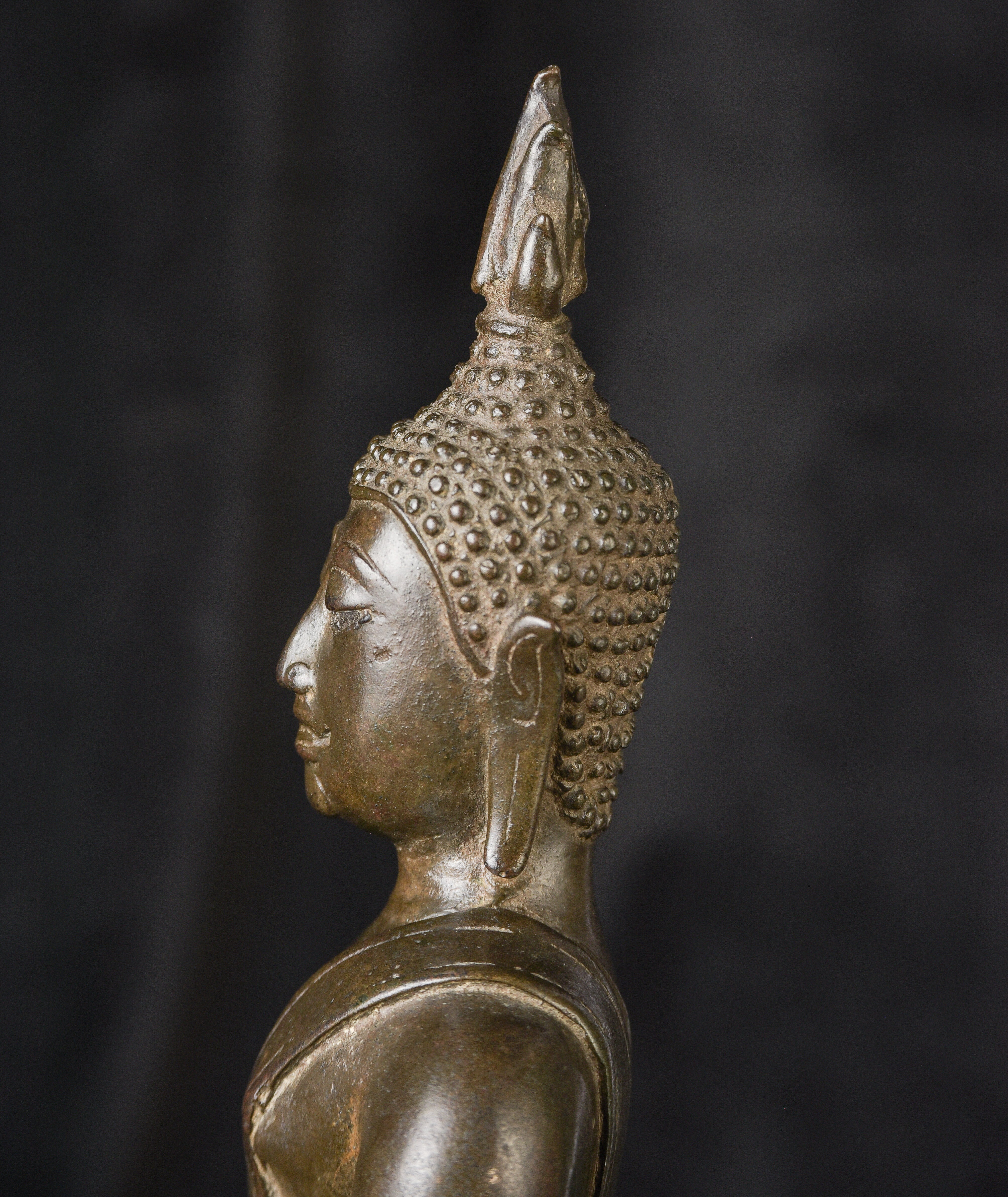 15/16th century northern Thai bronze Buddha. This is an exceptional example. Beautifully sculpted, cast, and finished. It has a superb patina with a mirror like surface. The face radiates, joy and happiness. The eyes, wow, not complete, appear original, which is rare to find. Overall, it is a superb Buddha. ( 13"H x 6.5"W x 4"D ) - 4.92lbs