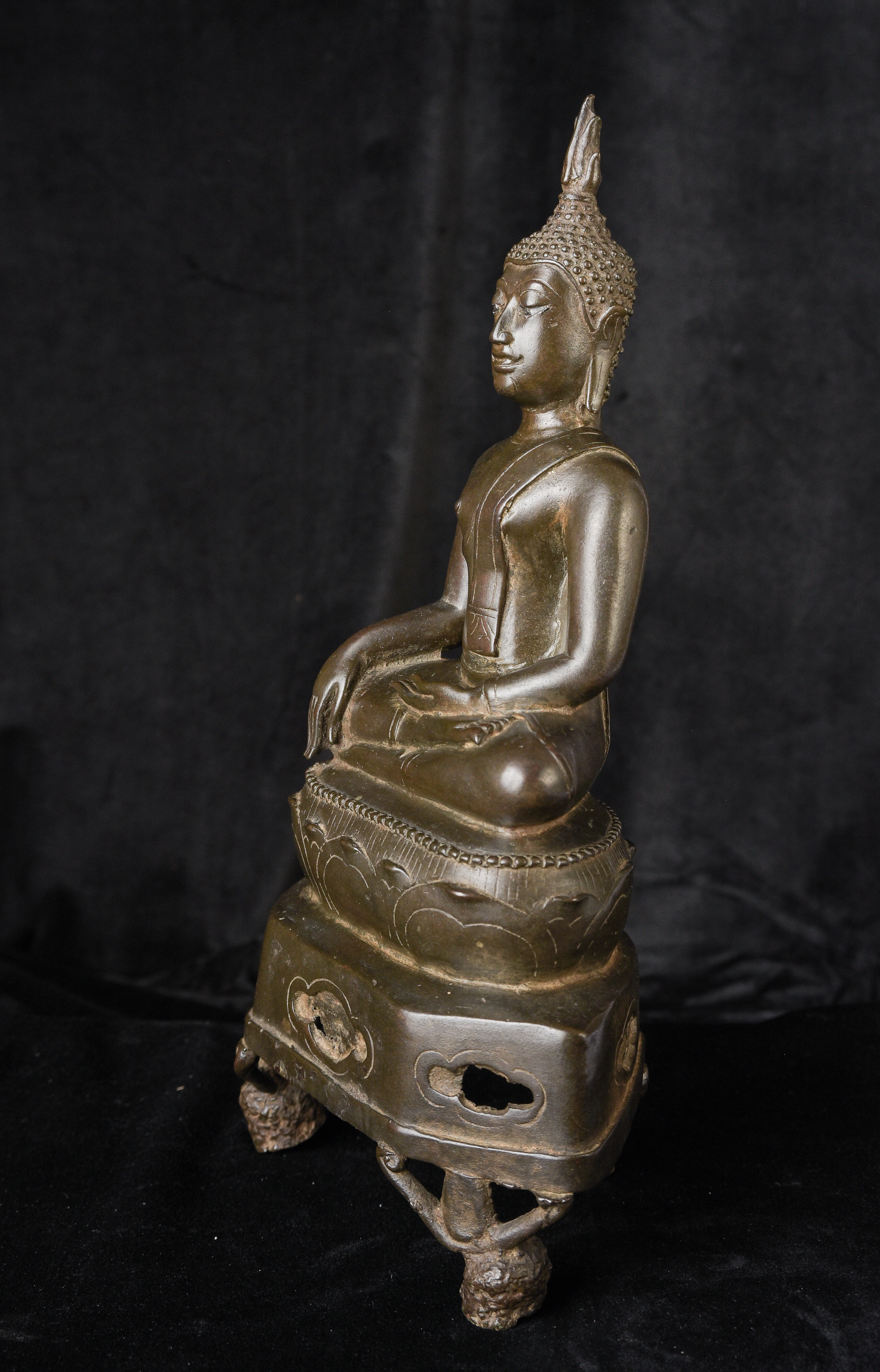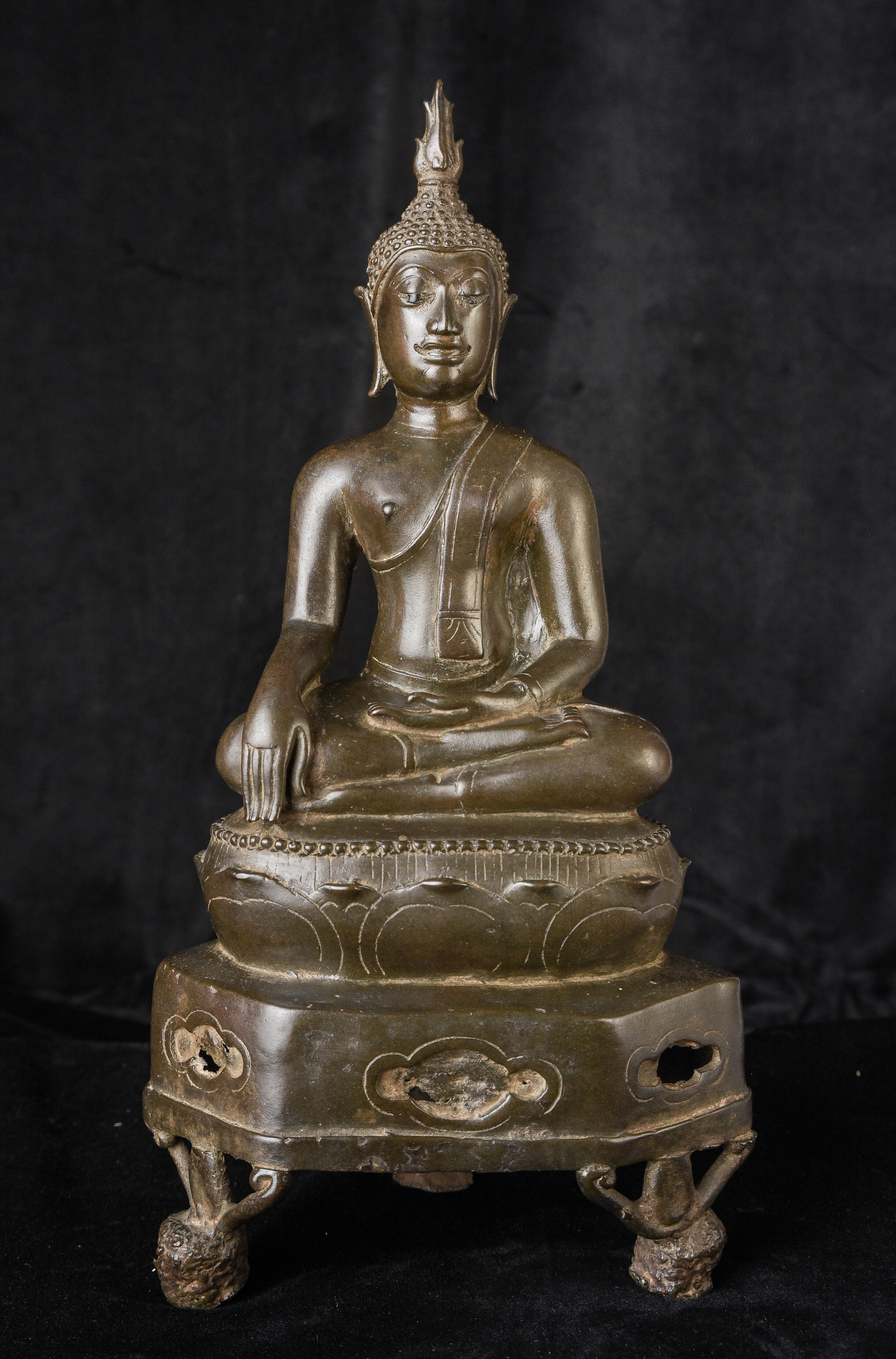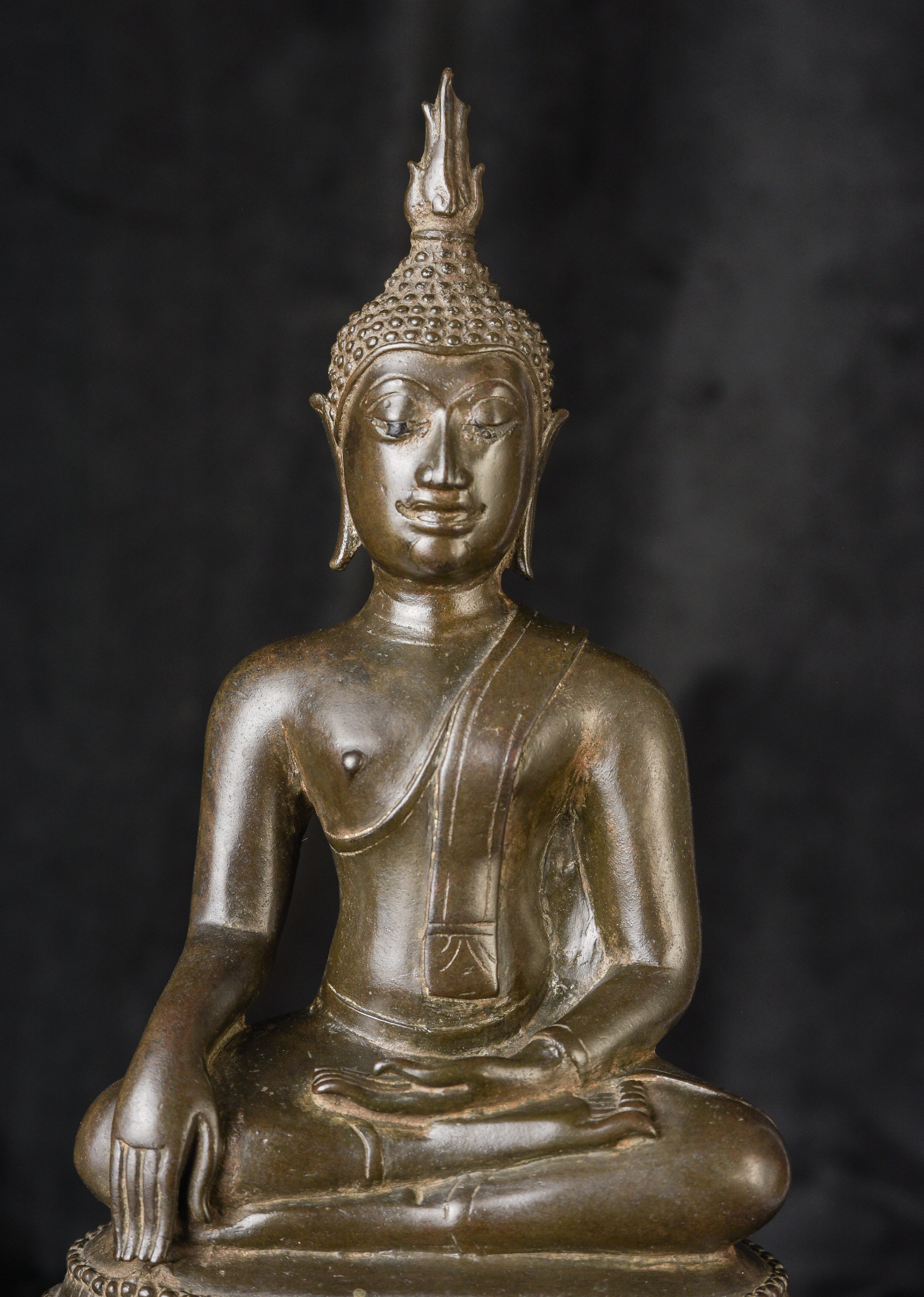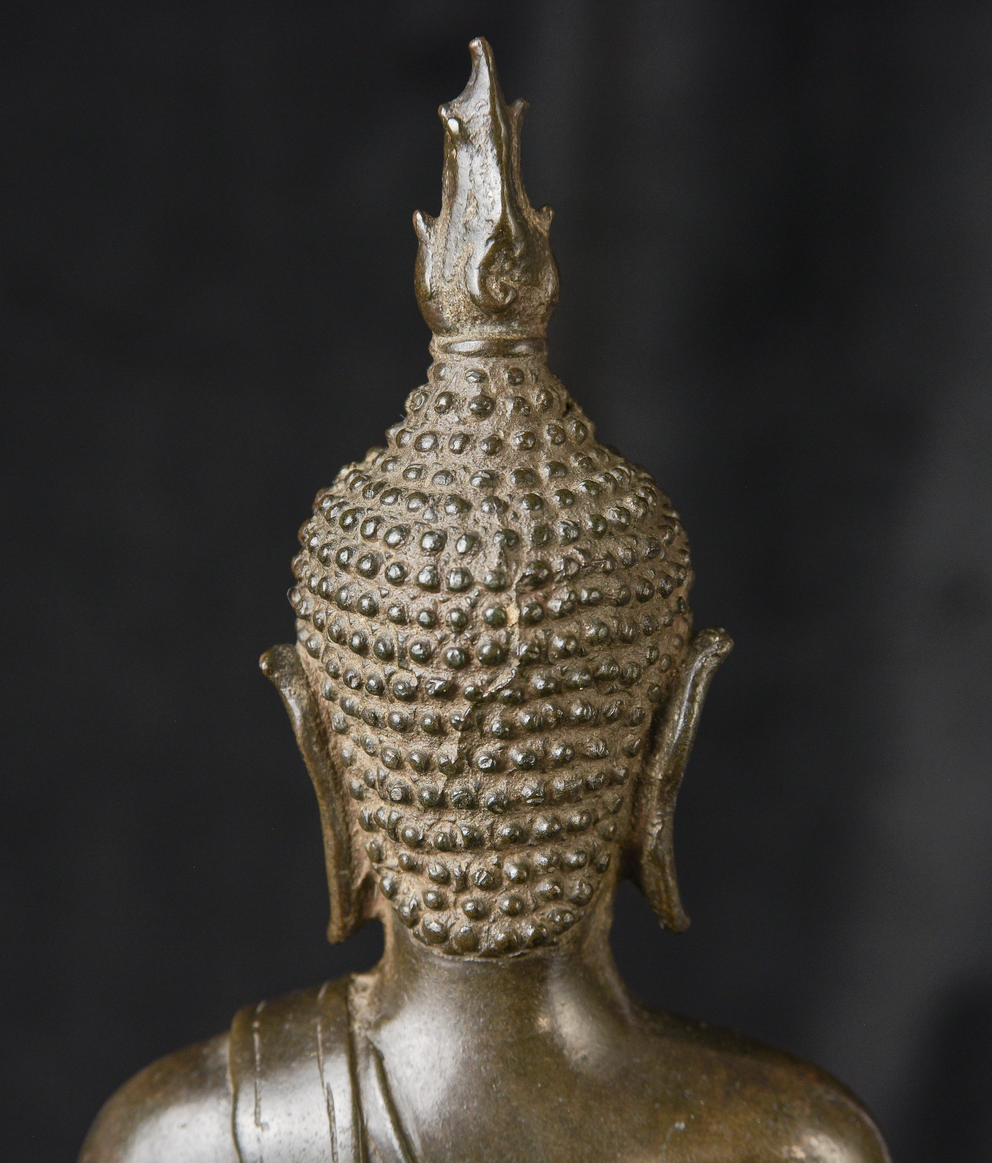 15/16th century northern Thai bronze Buddha. This is an exceptional example. Beautifully sculpted, cast, and finished. It has a superb patina with a mirror like surface. The face radiates, joy and happiness. The eyes, wow, not complete, appear original, which is rare to find. Overall, it is a superb Buddha. ( 13"H x 6.5"W x 4"D ) - 4.92lbs
