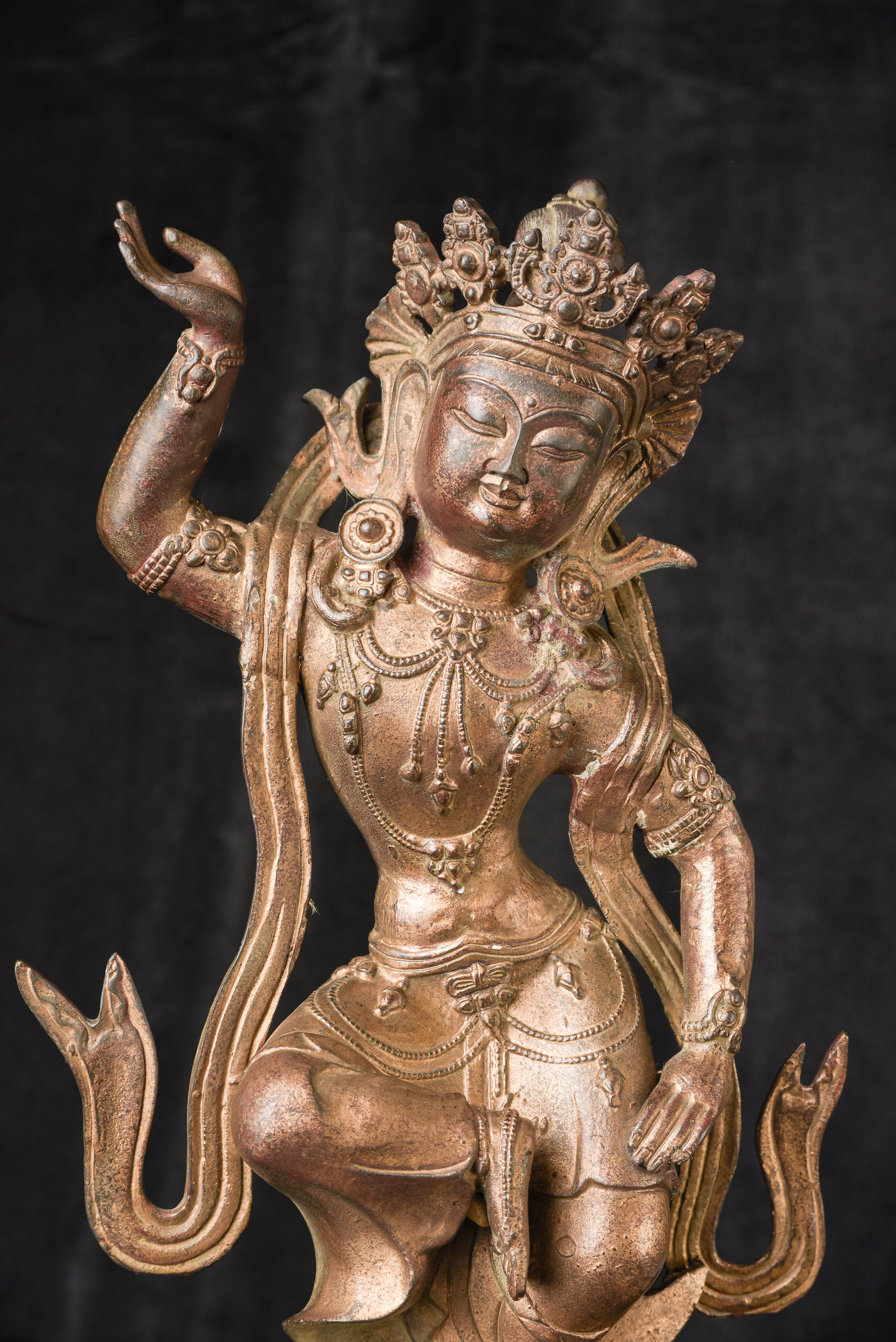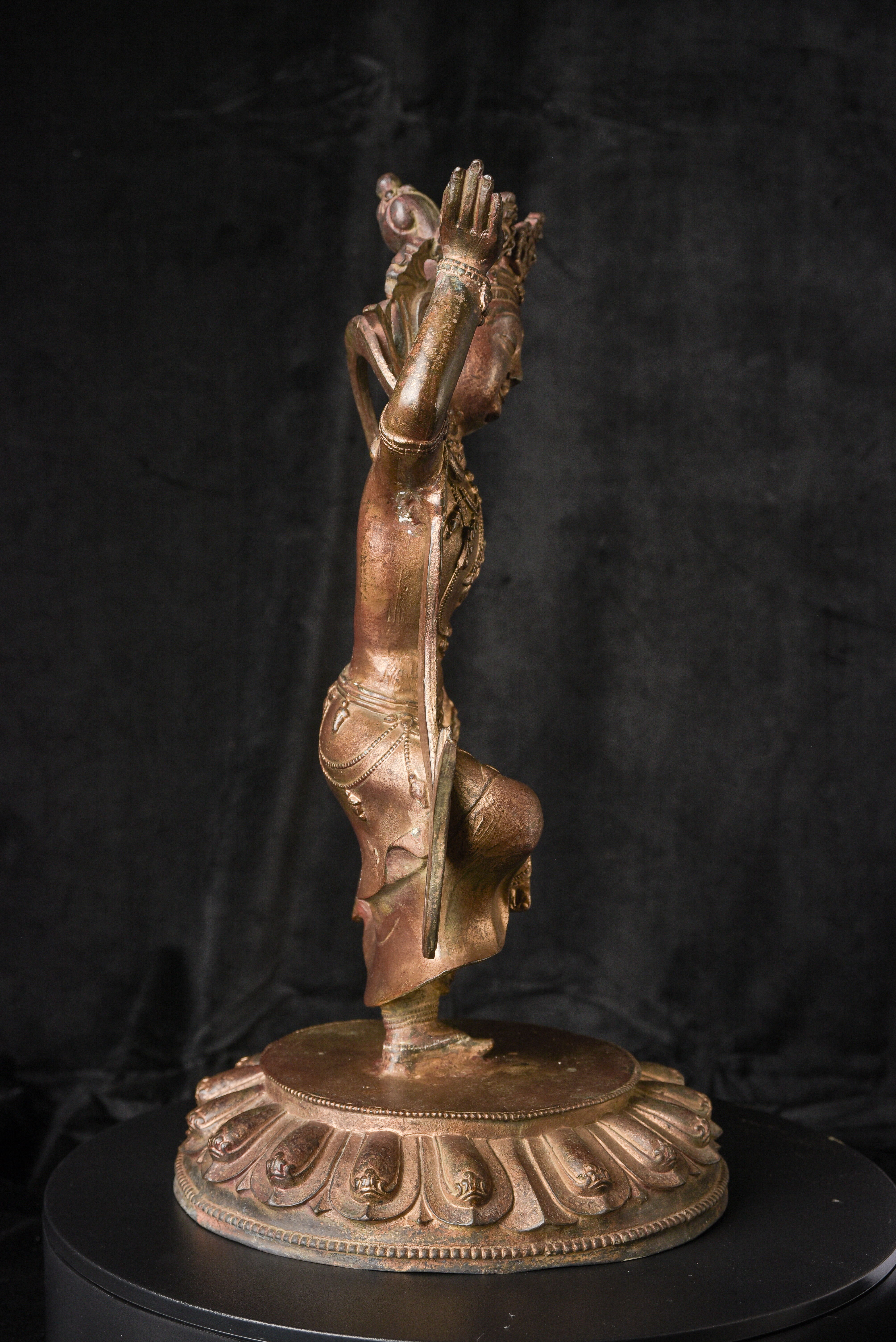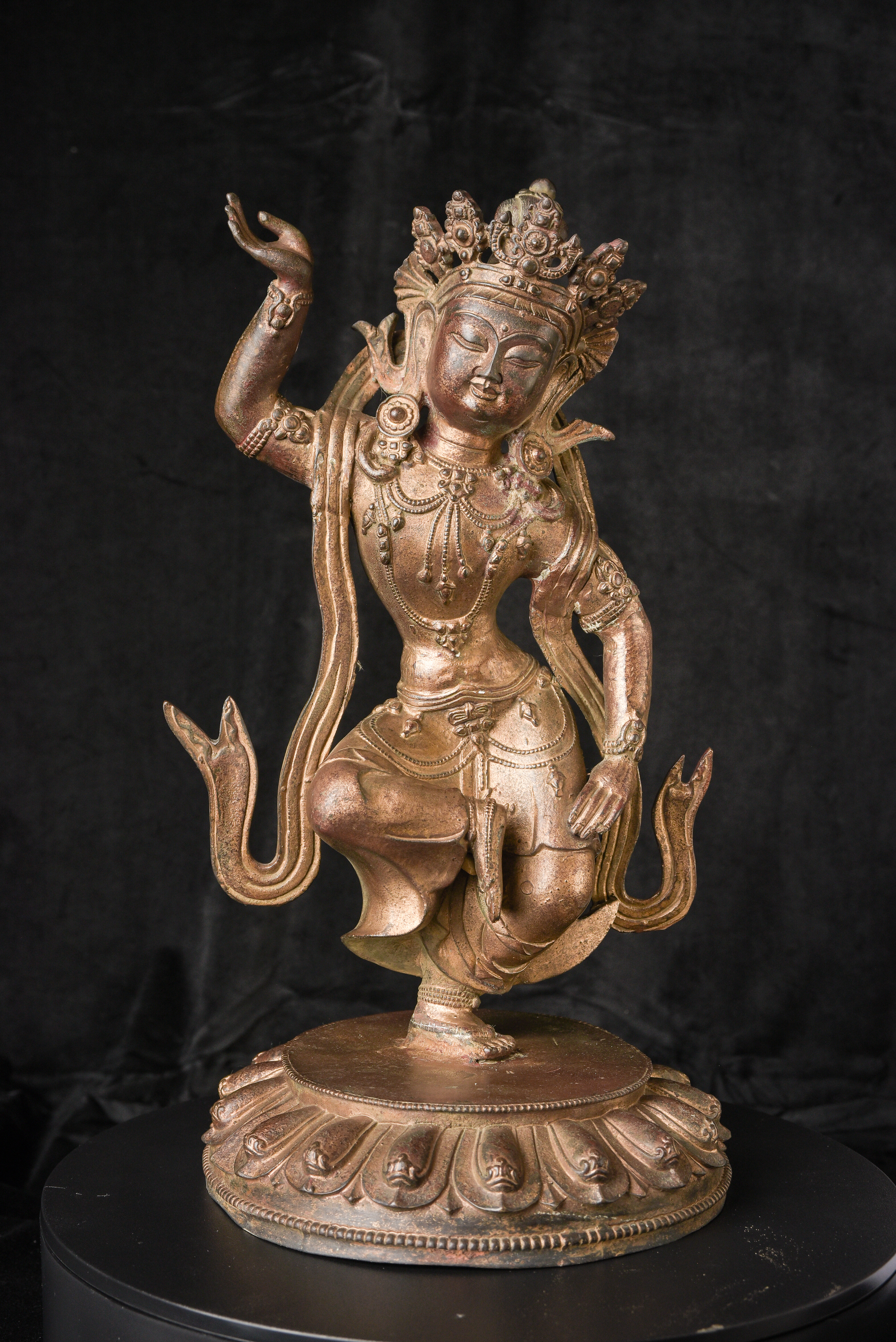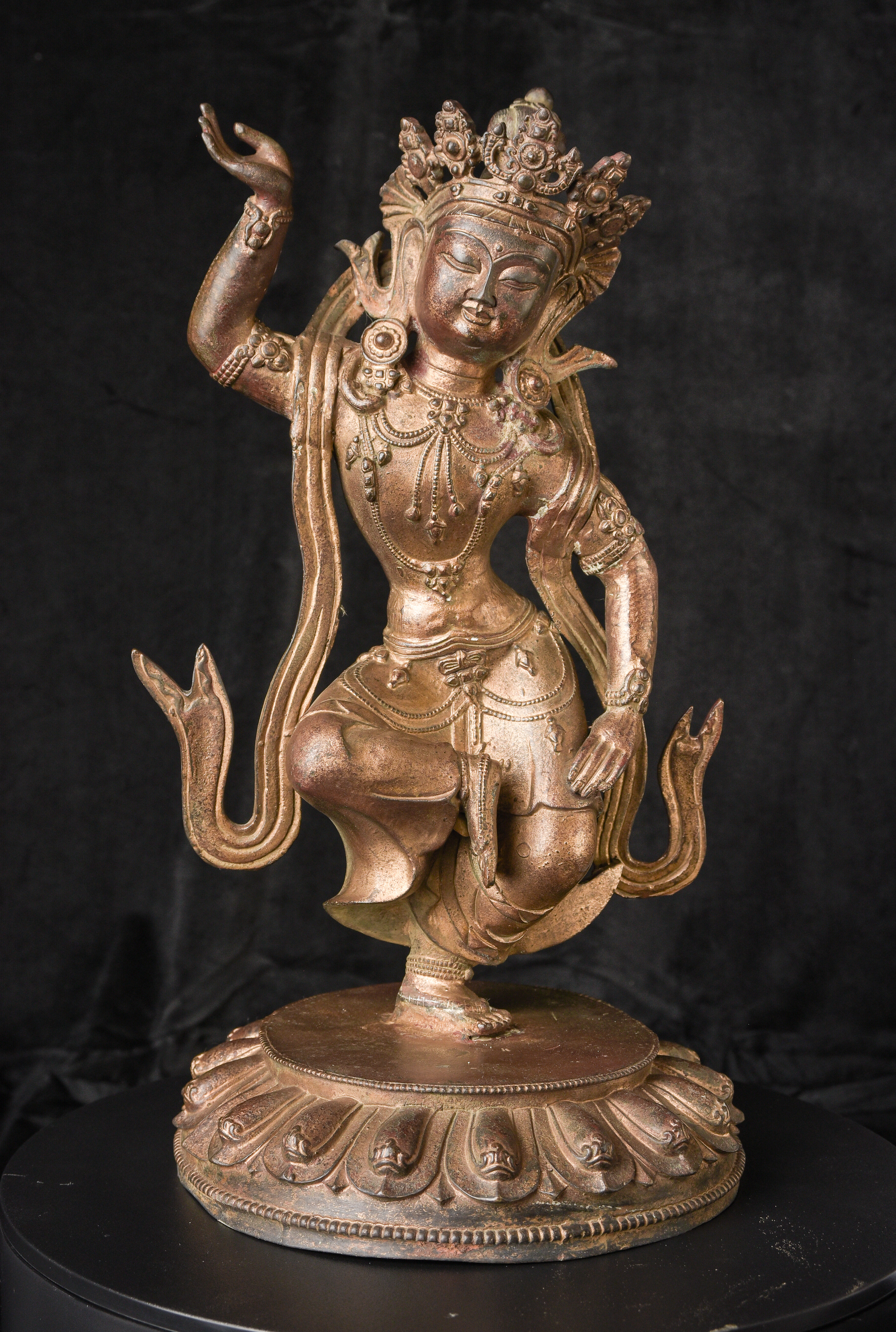 Chinese or Chinese Tibetan bronze. sculpture of a dancing Buddhist figure. It is particularly well cast and finished for a vintage piece of its type. Look closely at the photos and pay attention to the details, such as the jewelry, ribbons and base. Very good size and weight. ( 16.25"H x 9.25"W x 9"D ) - 9.11lbs