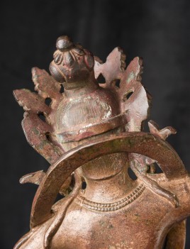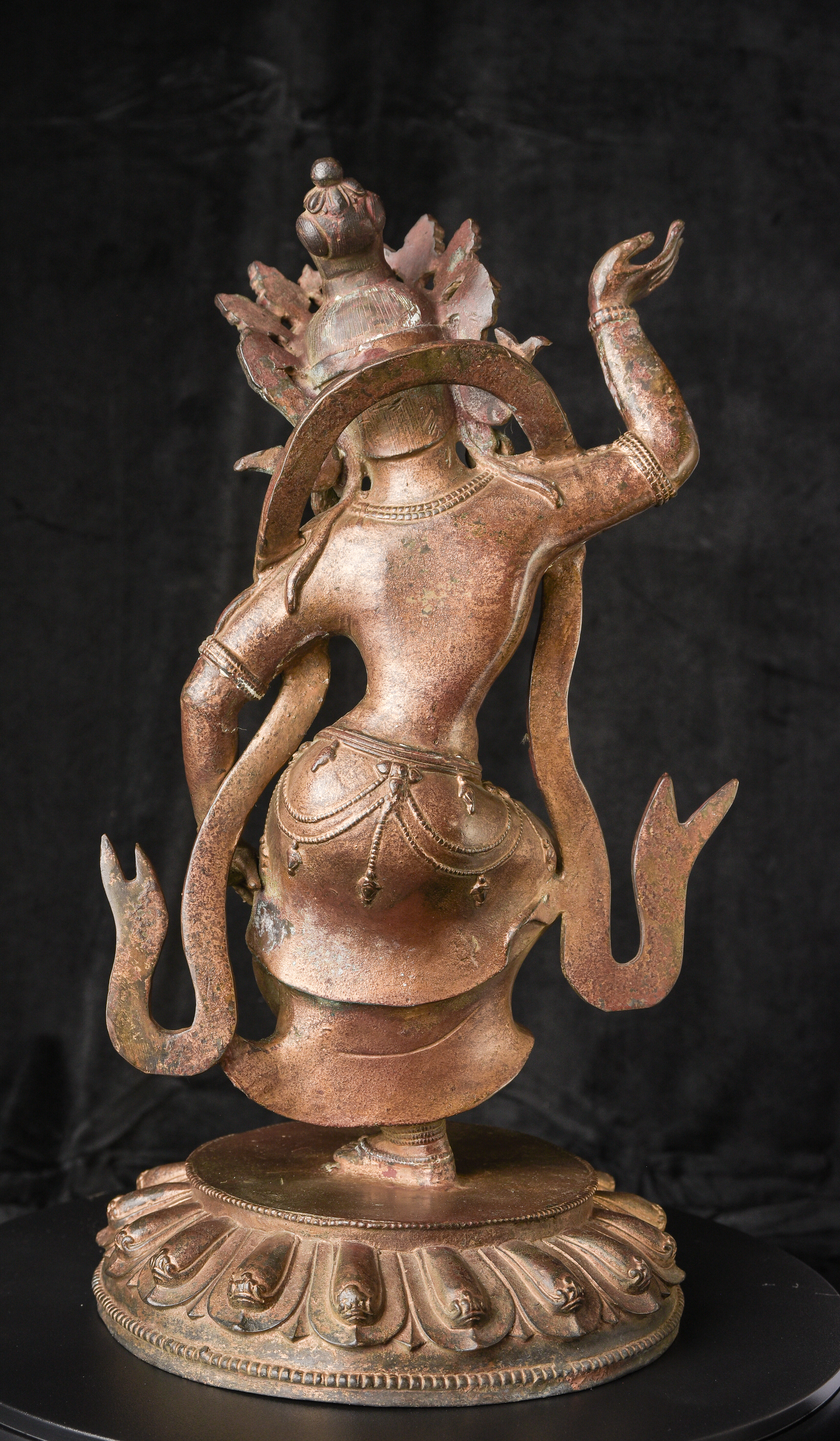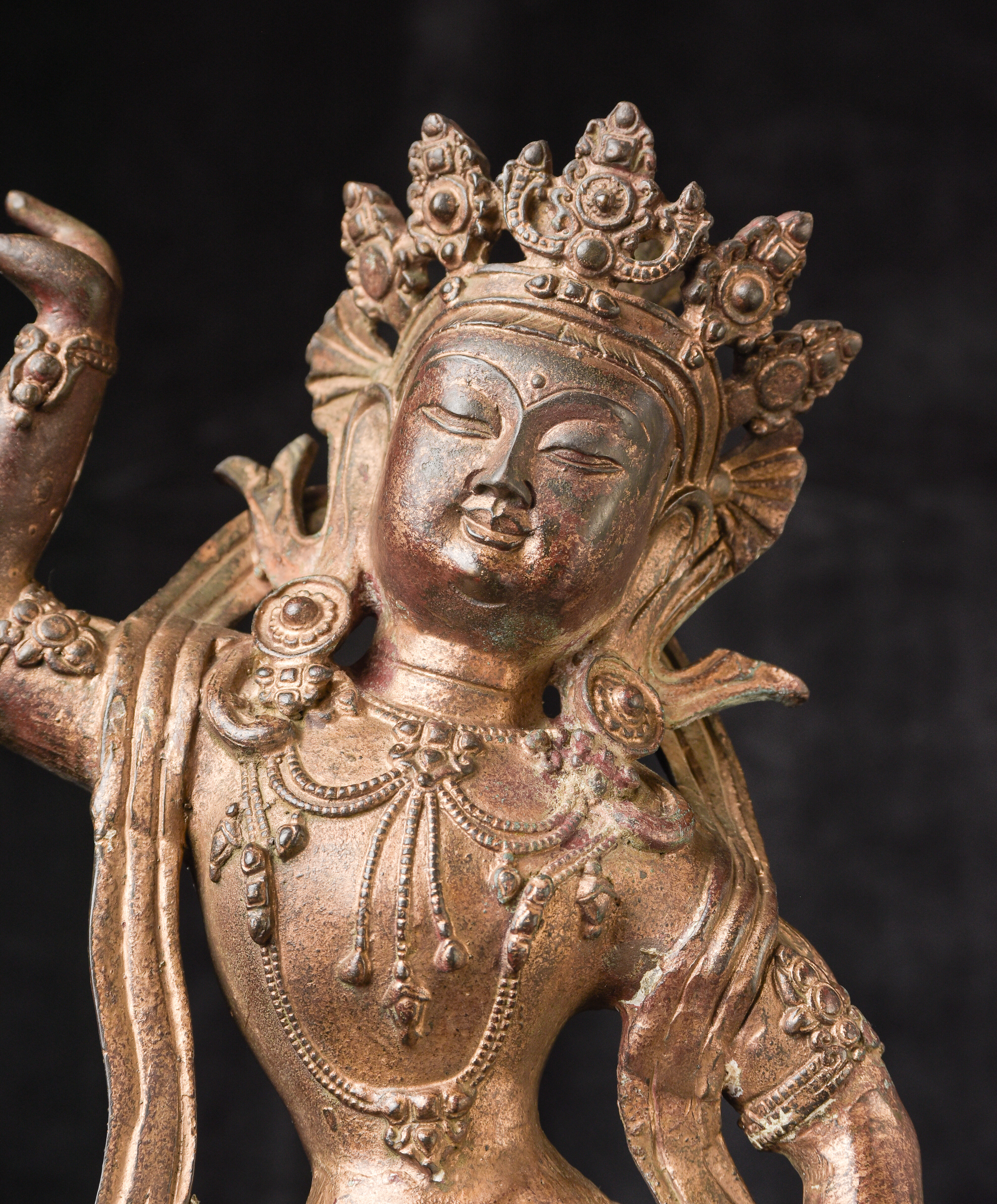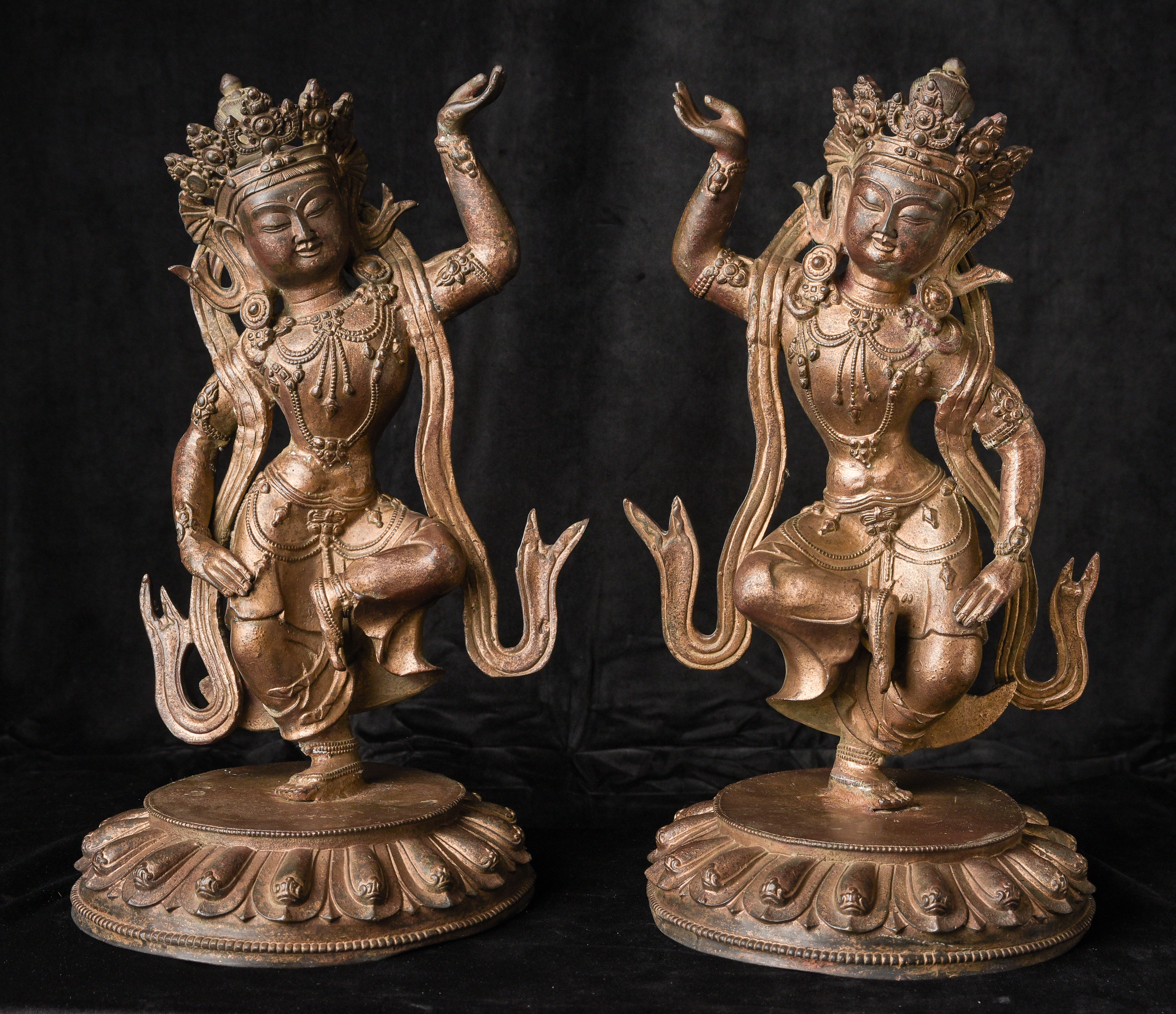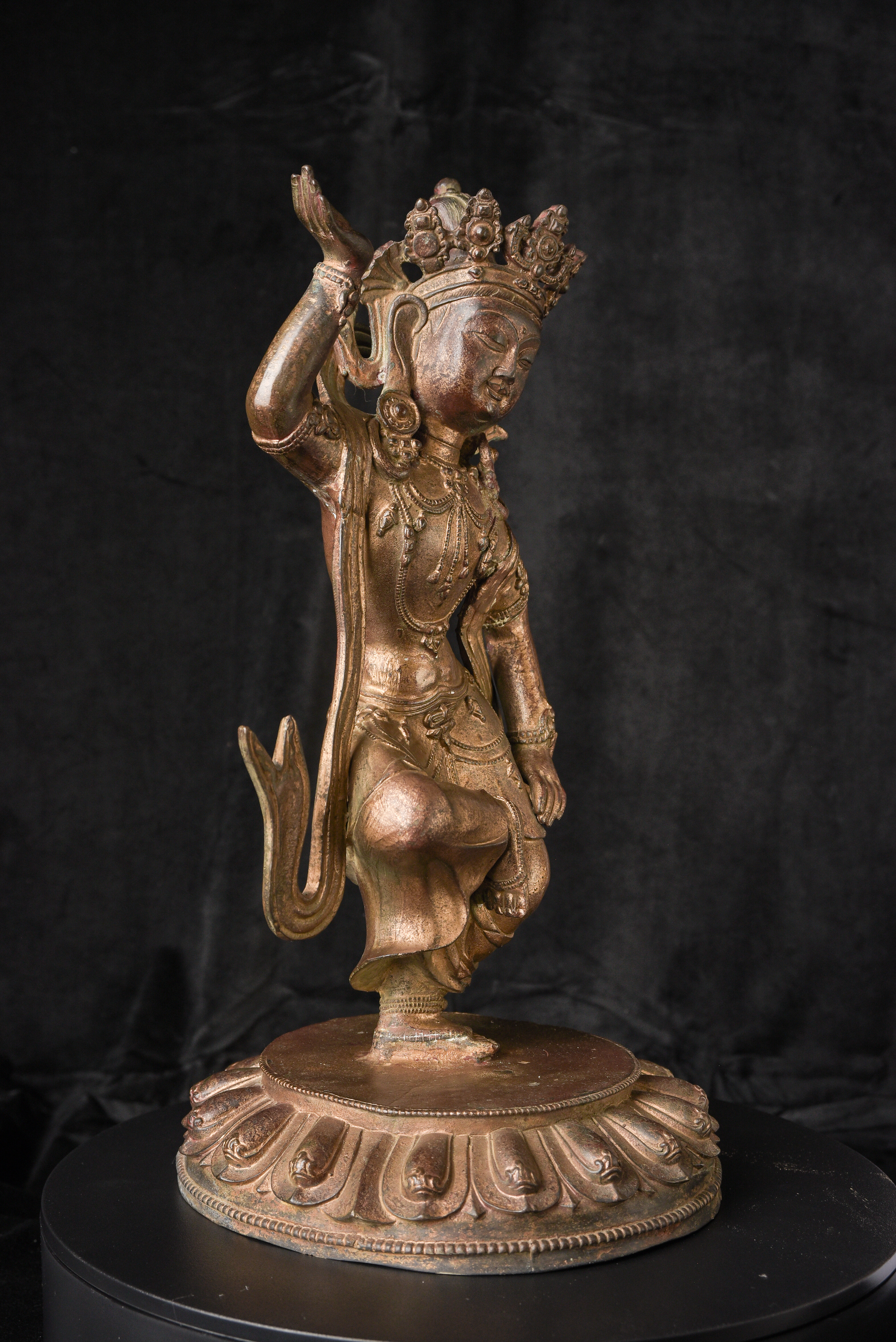 Chinese or Chinese Tibetan bronze. sculpture of a dancing Buddhist figure. It is particularly well cast and finished for a vintage piece of its type. Look closely at the photos and pay attention to the details, such as the jewelry, ribbons and base. Very good size and weight. ( 16.25"H x 9.25"W x 9"D ) - 9.11lbs