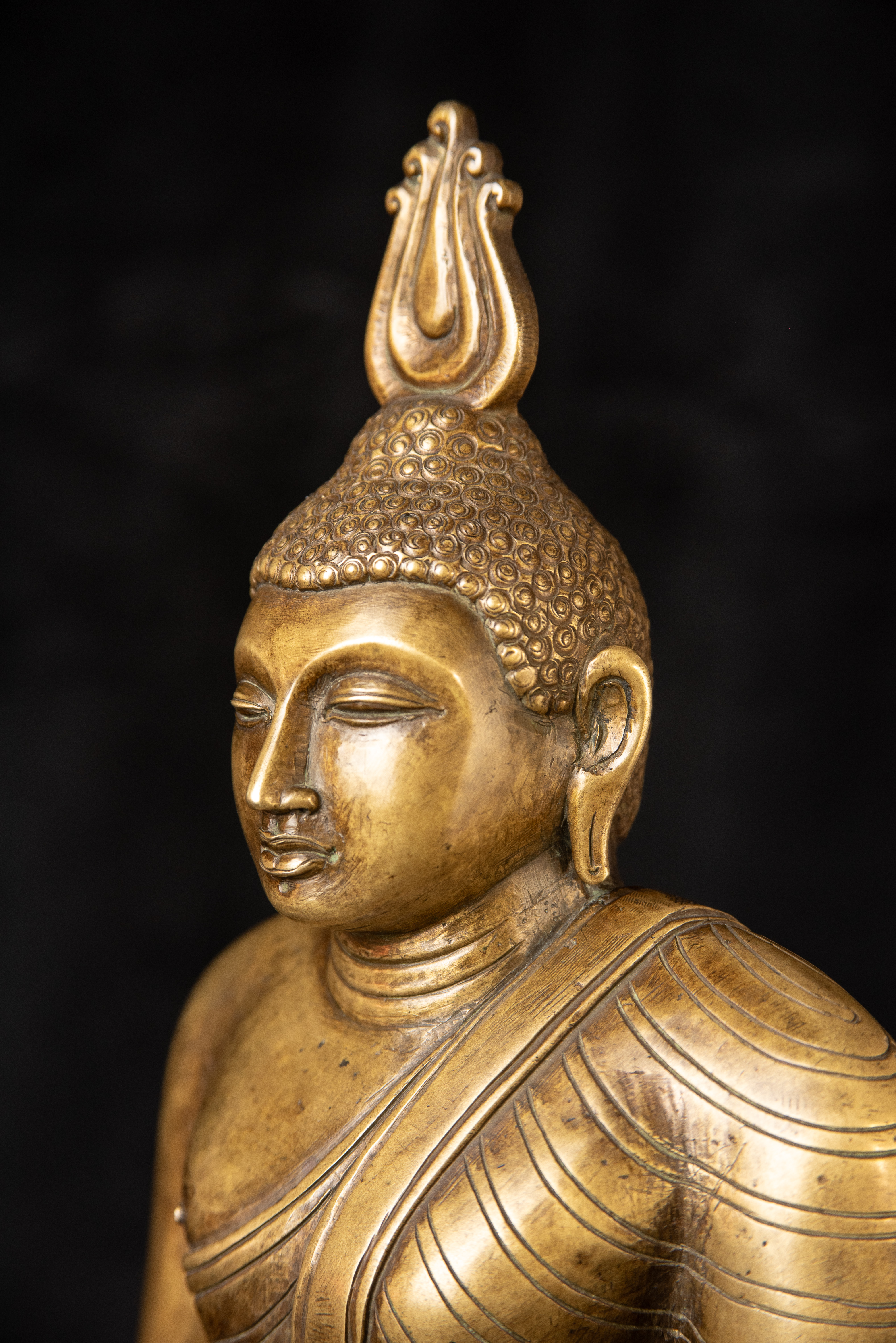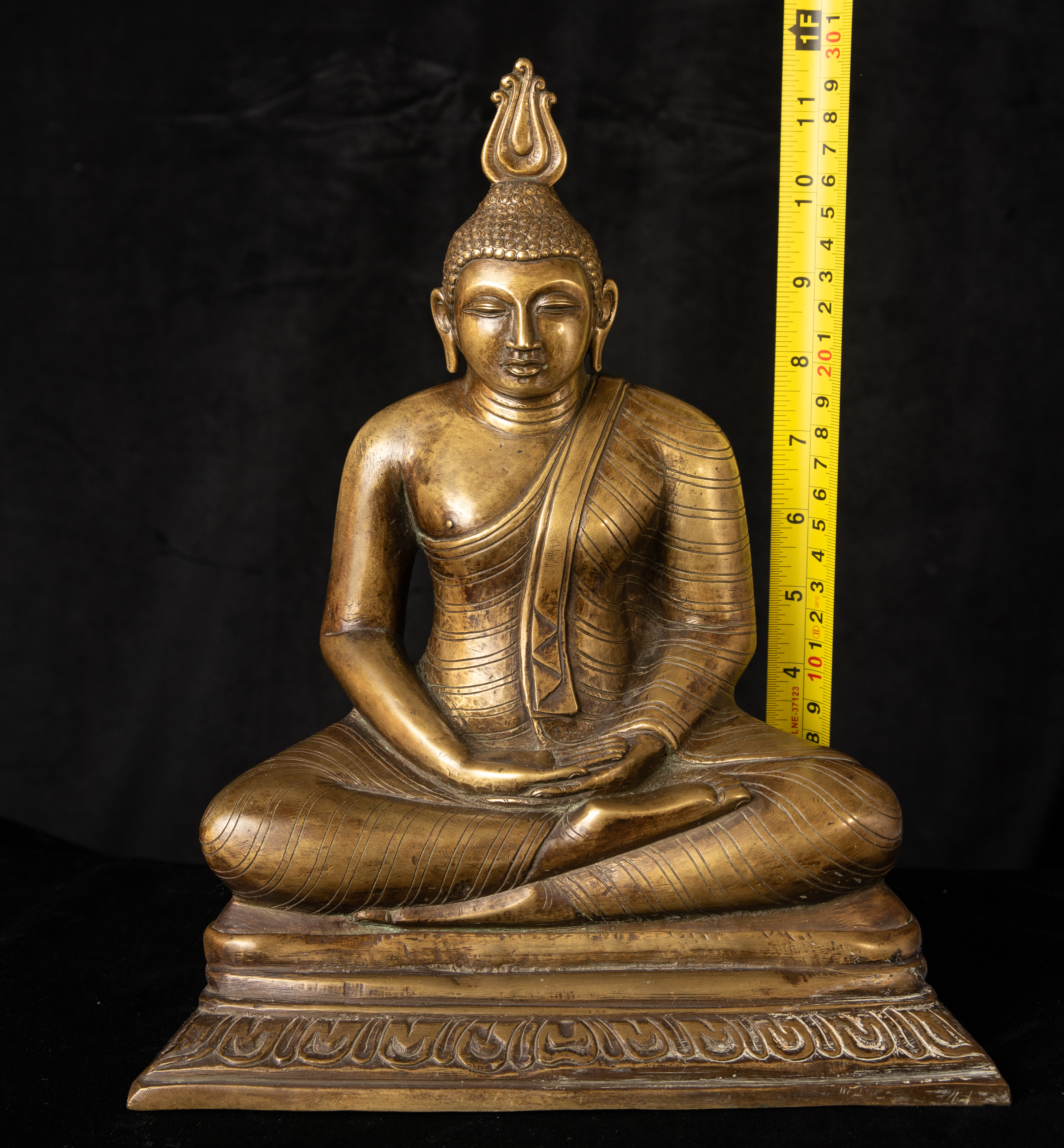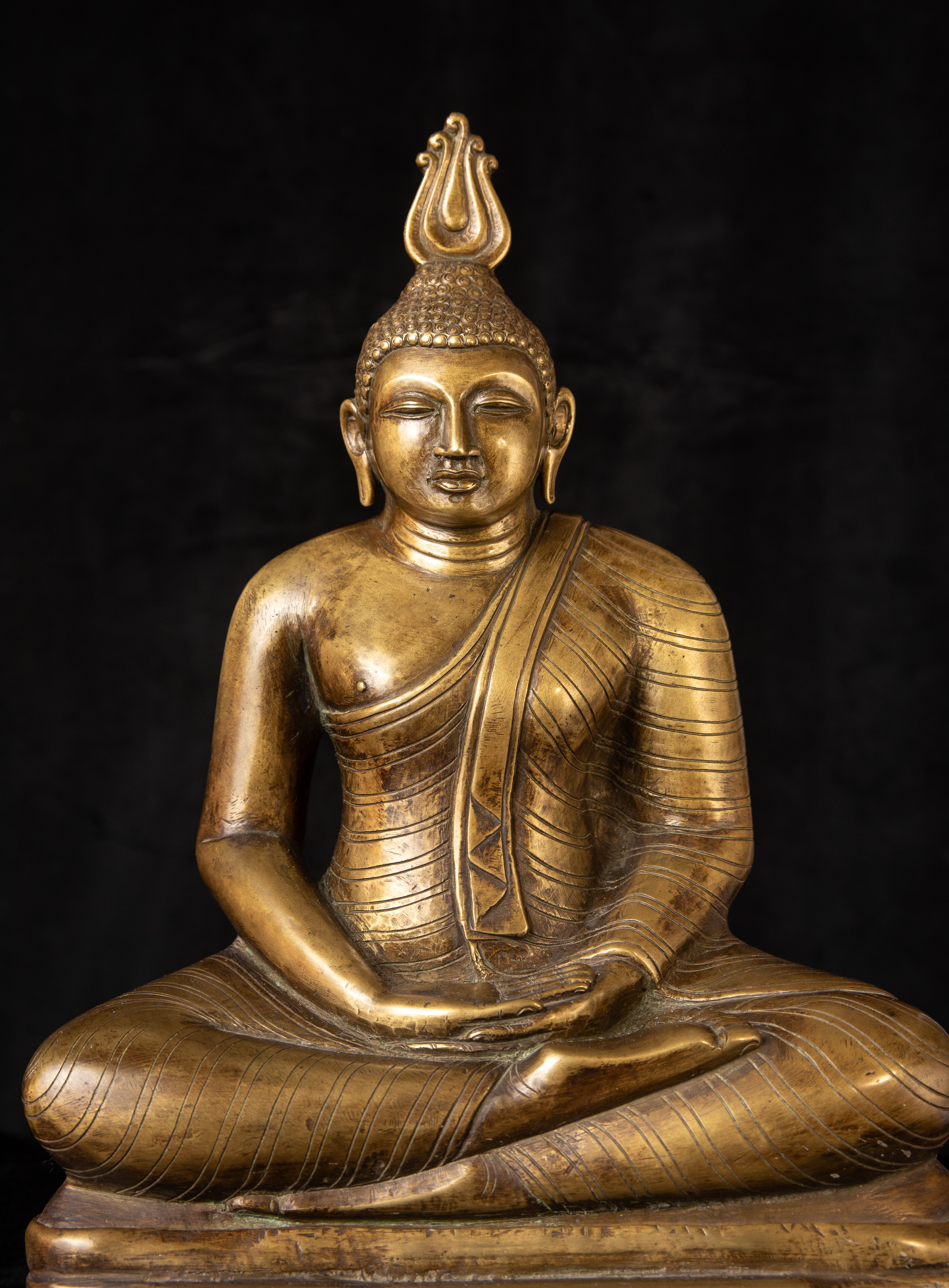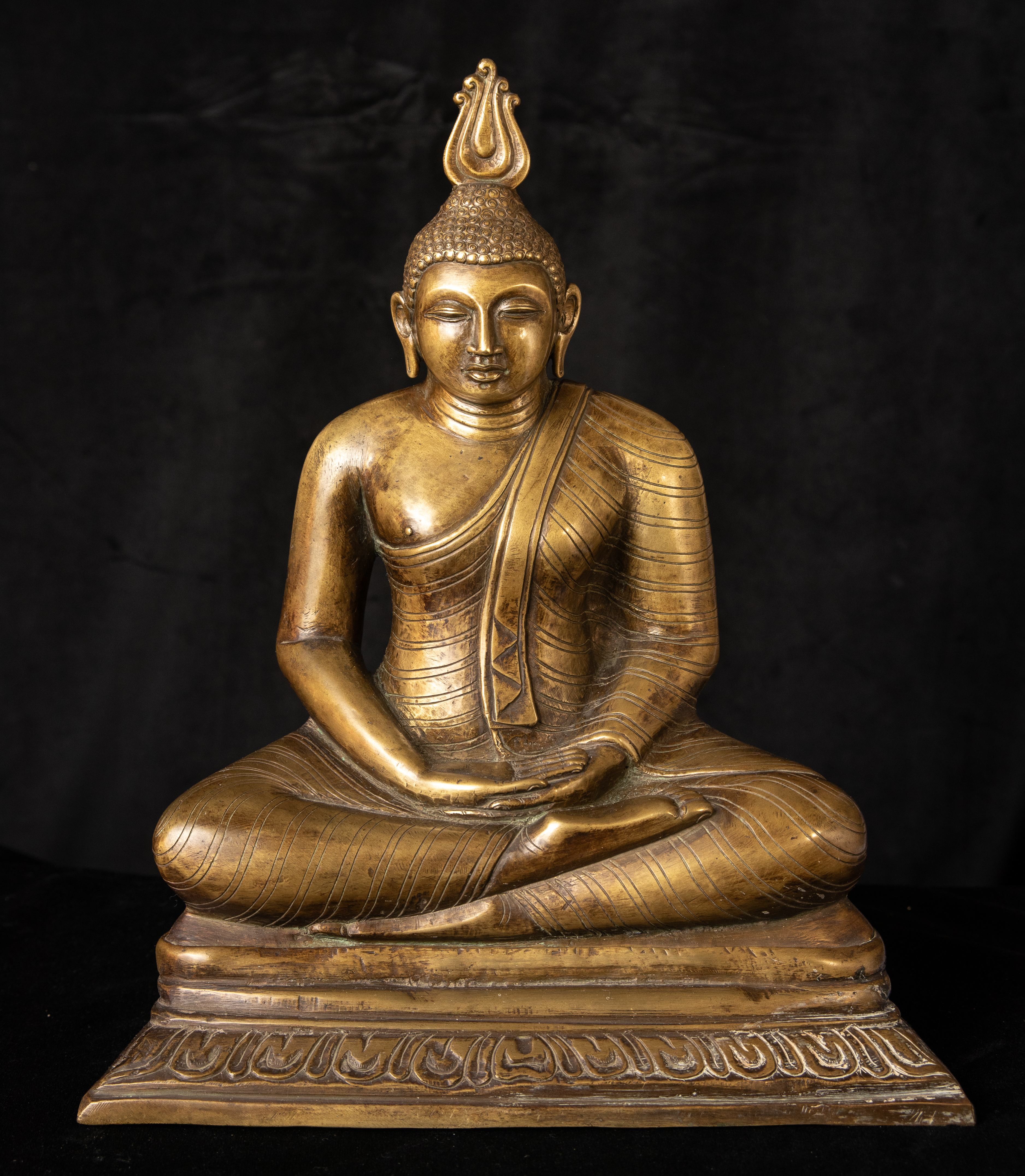 19th century Sri Lankan Buddha. Superb example of its type. On a permanently attached base, though in the 19th century, which was post Kandy, the base and the Buddha were sometimes cast separately and attached after casting, as appears was done in this case.. While it has good weight, I do not believe it is fully solid cast as our 18th century and earlier Sri Lankan Buddhas. It is the best example of its type I have ever seen, the beauty in the face is palpable. The quality of the hand work and detail is exceptional. The detail work on most Sri Lankan Buddha is done after casting which gives it a crispness that is rarely seen on other types of Buddha statues. This one is even better than the vast majority of Sri Lankan Buddhas. Great care, time, and attention were taken in every aspect of the detail work. Note how carefully the rose of hair lineup While I can’t date it precisely, the very high quality of the casting, with the pleasing plump shape and the fine finish support a 19th century dating. It is larger than the height suggests due to the roundness of the body and the significant width and depth of the overall figure. He has a good deal of mass to him. The best 19th century Sri Lankan Buddha, I have offered in 30 years.(11"H x 9.75"W x 6"D)-10.6lbs