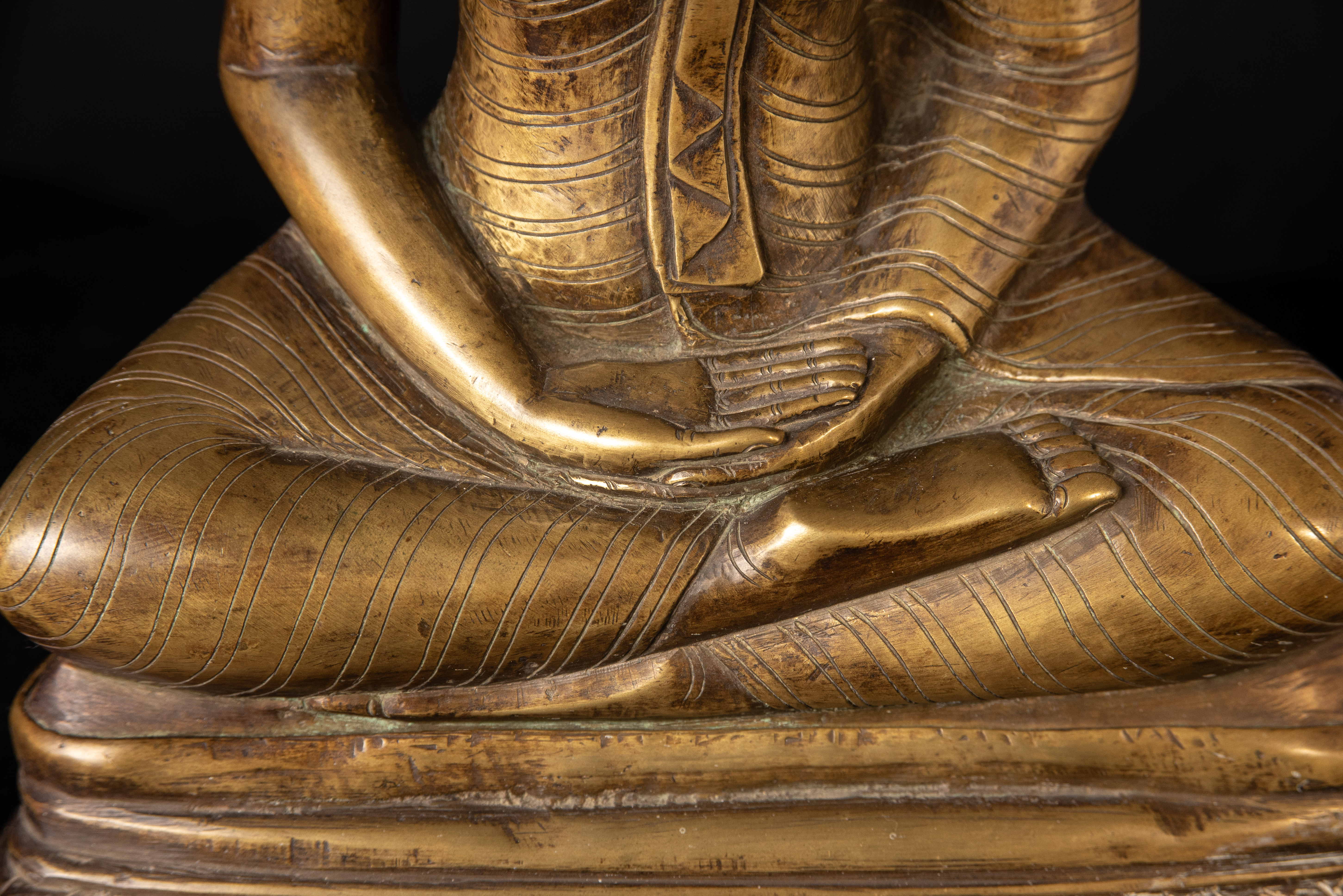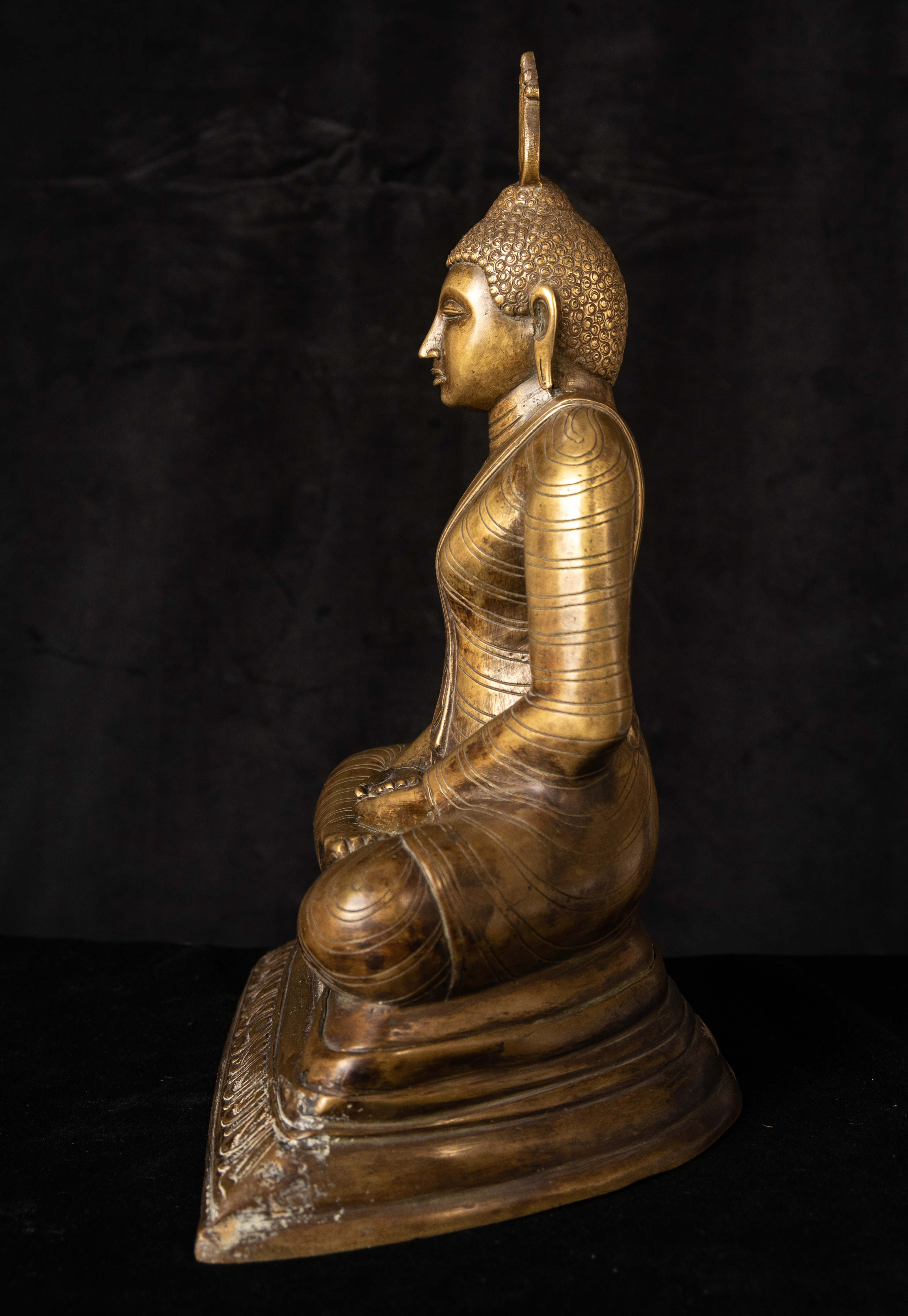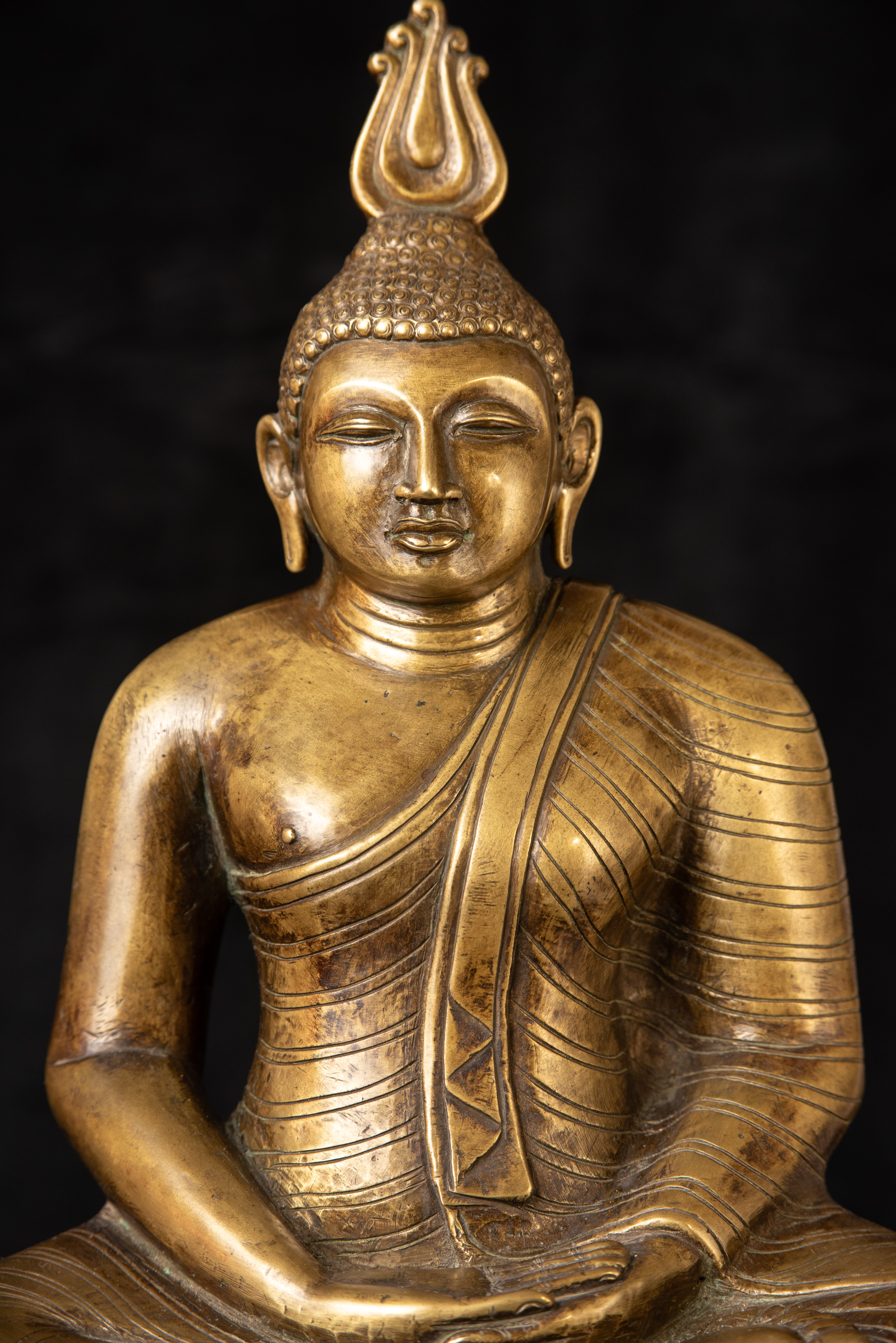 19th century Sri Lankan Buddha. Superb example of its type. On a permanently attached base, though in the 19th century, which was post Kandy, the base and the Buddha were sometimes cast separately and attached after casting, as appears was done in this case.. While it has good weight, I do not believe it is fully solid cast as our 18th century and earlier Sri Lankan Buddhas. It is the best example of its type I have ever seen, the beauty in the face is palpable. The quality of the hand work and detail is exceptional. The detail work on most Sri Lankan Buddha is done after casting which gives it a crispness that is rarely seen on other types of Buddha statues. This one is even better than the vast majority of Sri Lankan Buddhas. Great care, time, and attention were taken in every aspect of the detail work. Note how carefully the rose of hair lineup While I can’t date it precisely, the very high quality of the casting, with the pleasing plump shape and the fine finish support a 19th century dating. It is larger than the height suggests due to the roundness of the body and the significant width and depth of the overall figure. He has a good deal of mass to him. The best 19th century Sri Lankan Buddha, I have offered in 30 years.(11"H x 9.75"W x 6"D)-10.6lbs