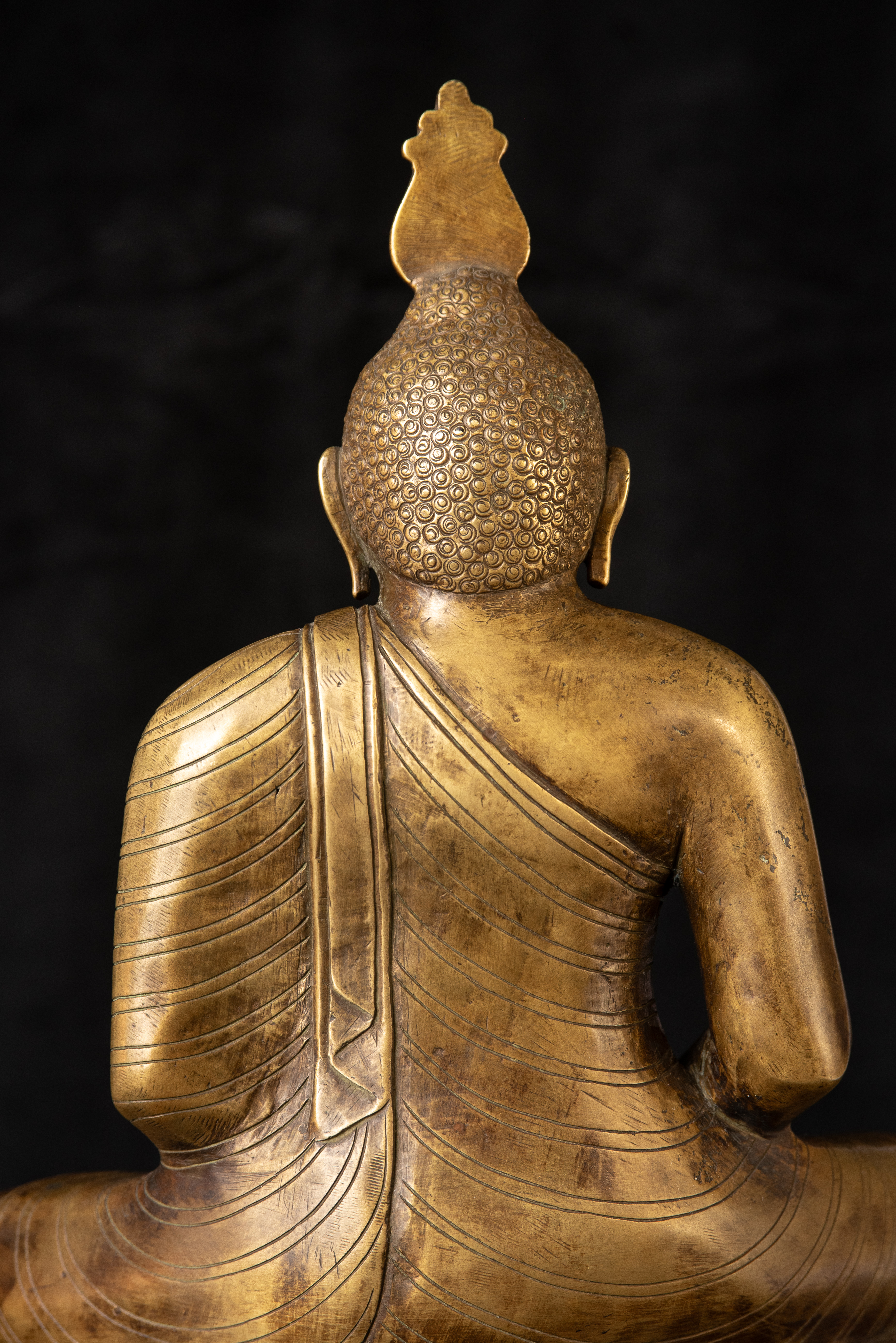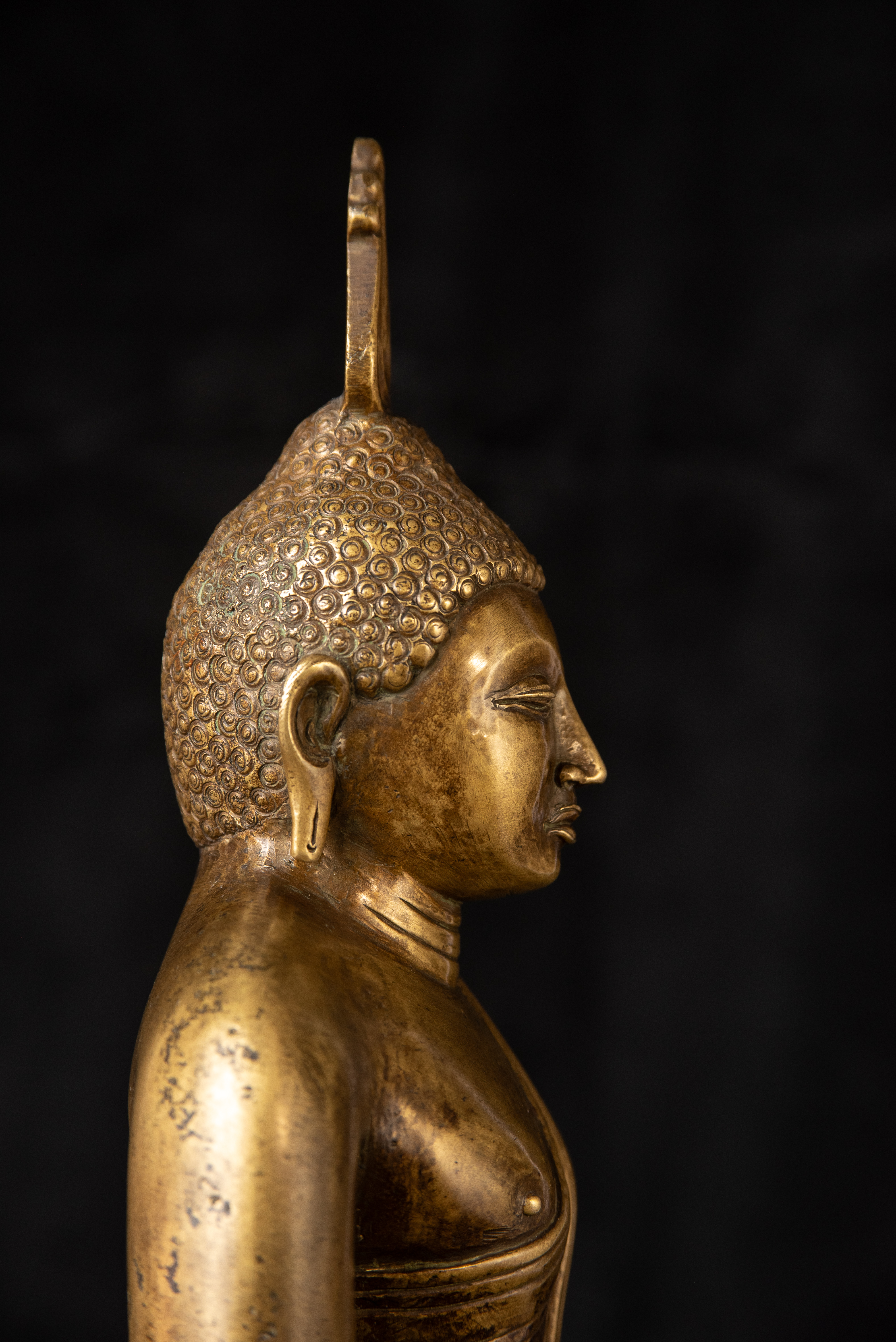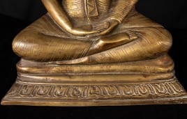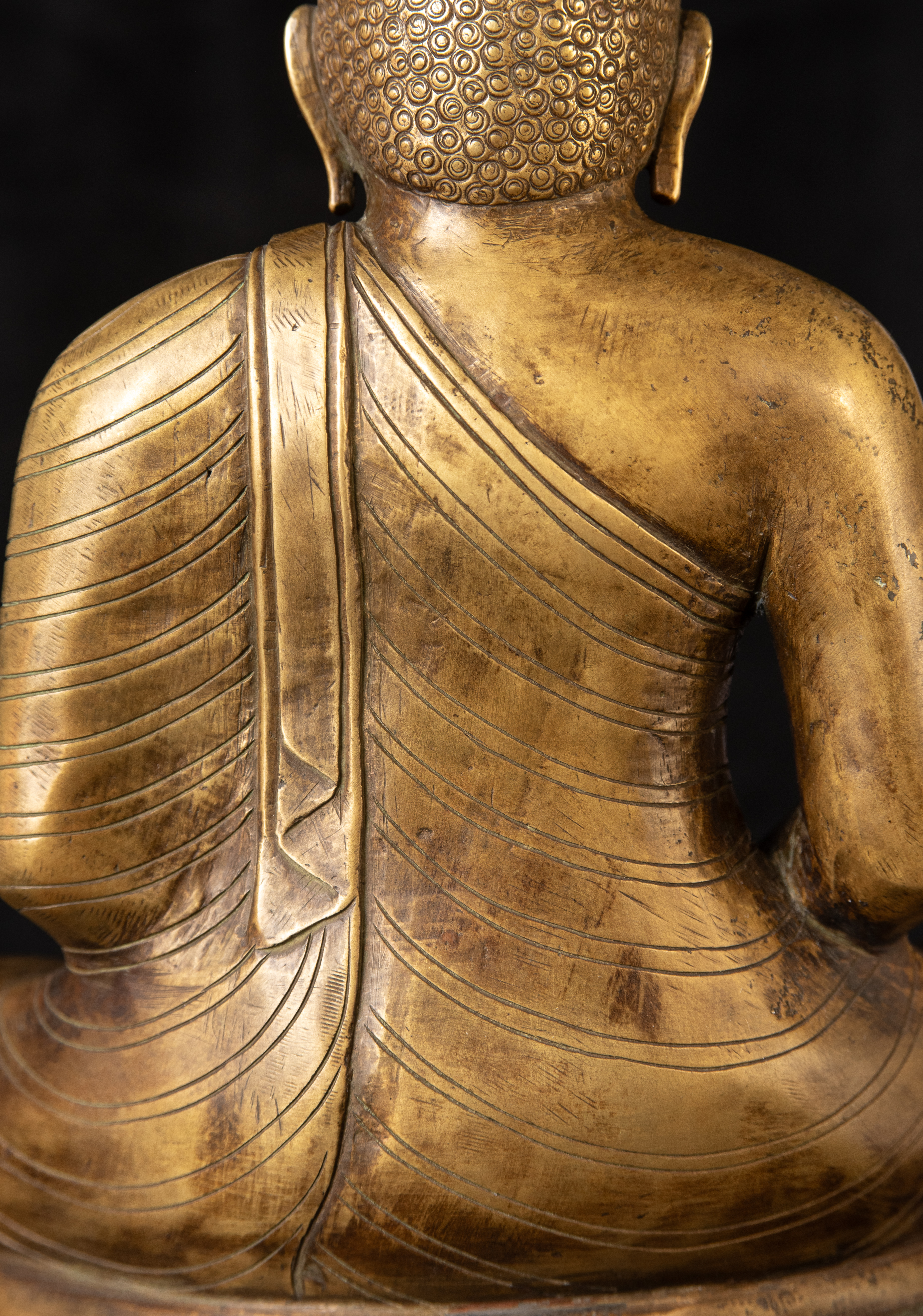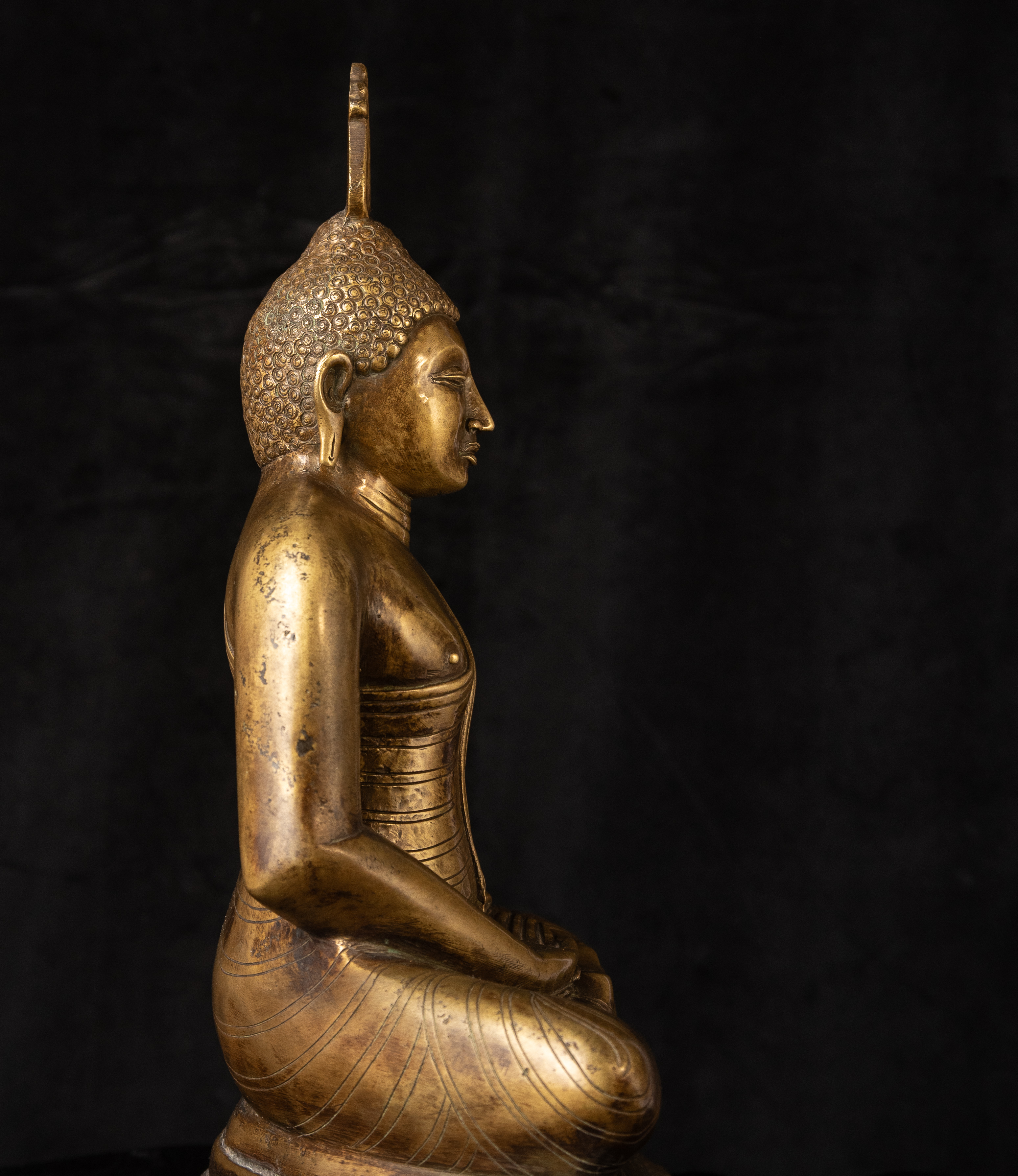 19th century Sri Lankan Buddha. Superb example of its type. On a permanently attached base, though in the 19th century, which was post Kandy, the base and the Buddha were sometimes cast separately and attached after casting, as appears was done in this case.. While it has good weight, I do not believe it is fully solid cast as our 18th century and earlier Sri Lankan Buddhas. It is the best example of its type I have ever seen, the beauty in the face is palpable. The quality of the hand work and detail is exceptional. The detail work on most Sri Lankan Buddha is done after casting which gives it a crispness that is rarely seen on other types of Buddha statues. This one is even better than the vast majority of Sri Lankan Buddhas. Great care, time, and attention were taken in every aspect of the detail work. Note how carefully the rose of hair lineup While I can’t date it precisely, the very high quality of the casting, with the pleasing plump shape and the fine finish support a 19th century dating. It is larger than the height suggests due to the roundness of the body and the significant width and depth of the overall figure. He has a good deal of mass to him. The best 19th century Sri Lankan Buddha, I have offered in 30 years.(11"H x 9.75"W x 6"D)-10.6lbs